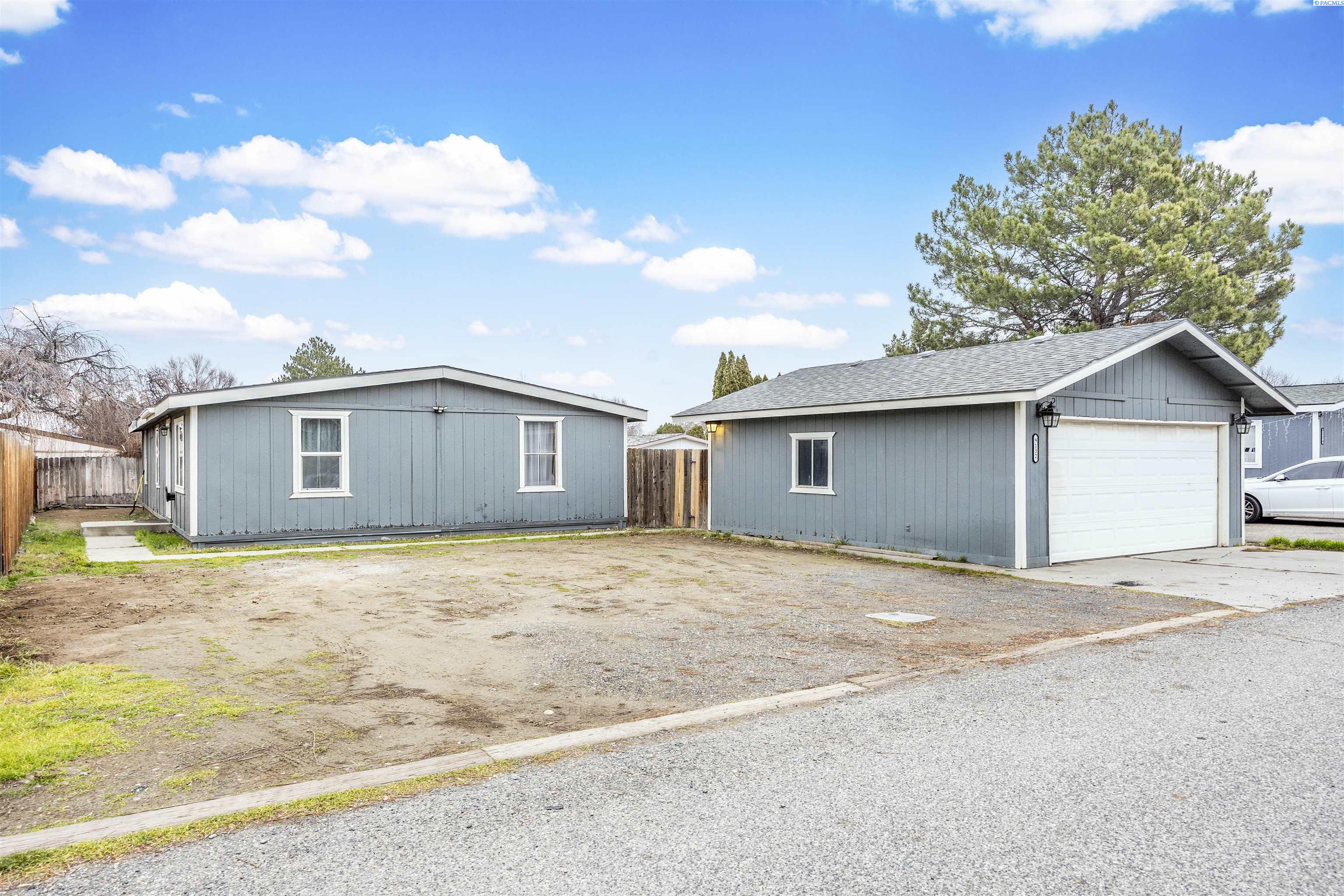 MLS# 289988 Affordable living in a convenient Kennewick neighborhood with the added bonus of a detached 2-car garage! This well-maintained manufactured home offers 1,296 sq. ft. of comfortable living space with 3 bedrooms and 2 bathrooms. Enjoy a nice open floor plan featuring vaulted ceilings, updated flooring, a spacious living room, and a dining area with a built-in buffet.