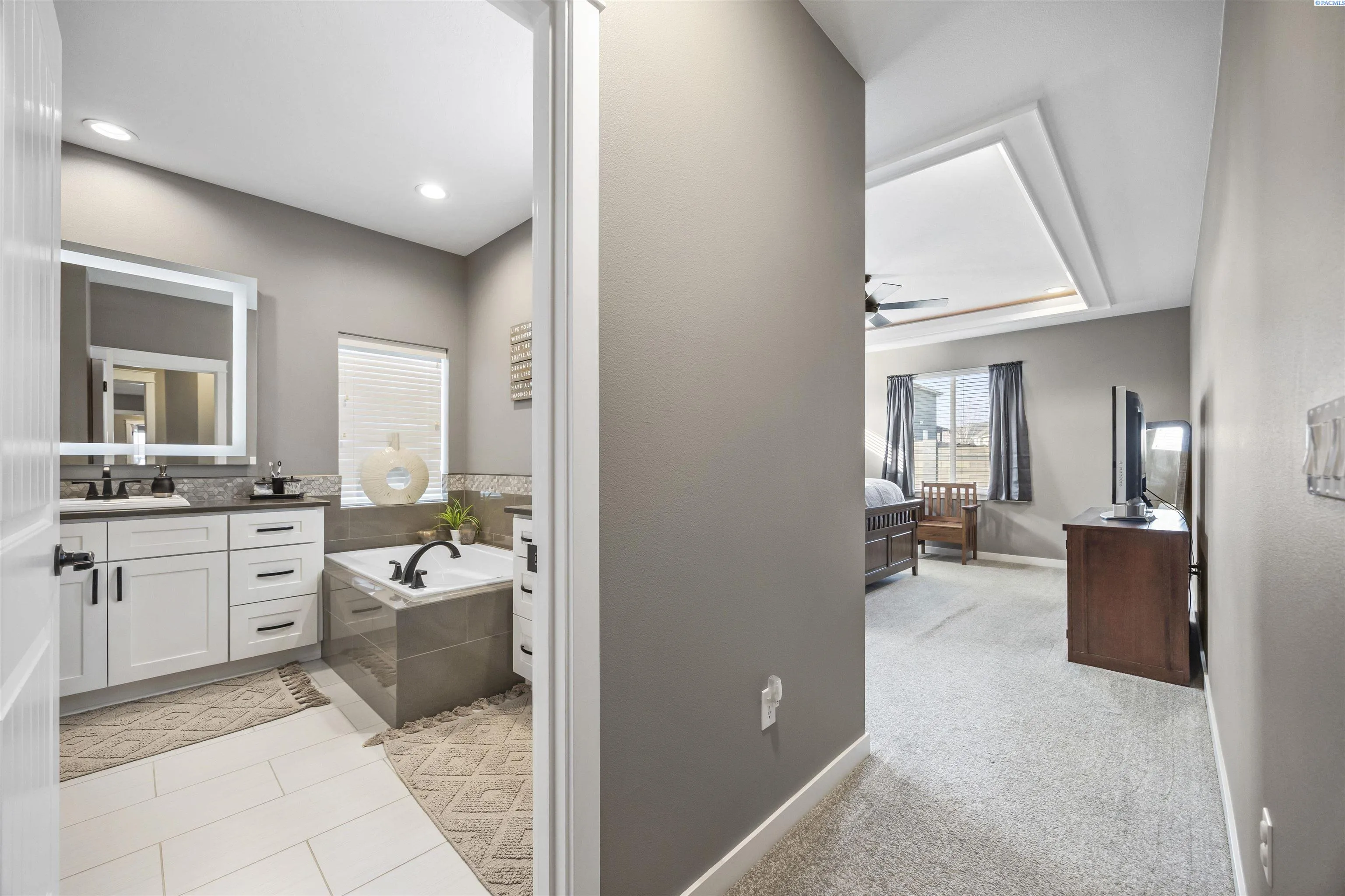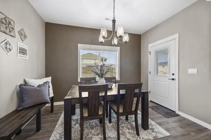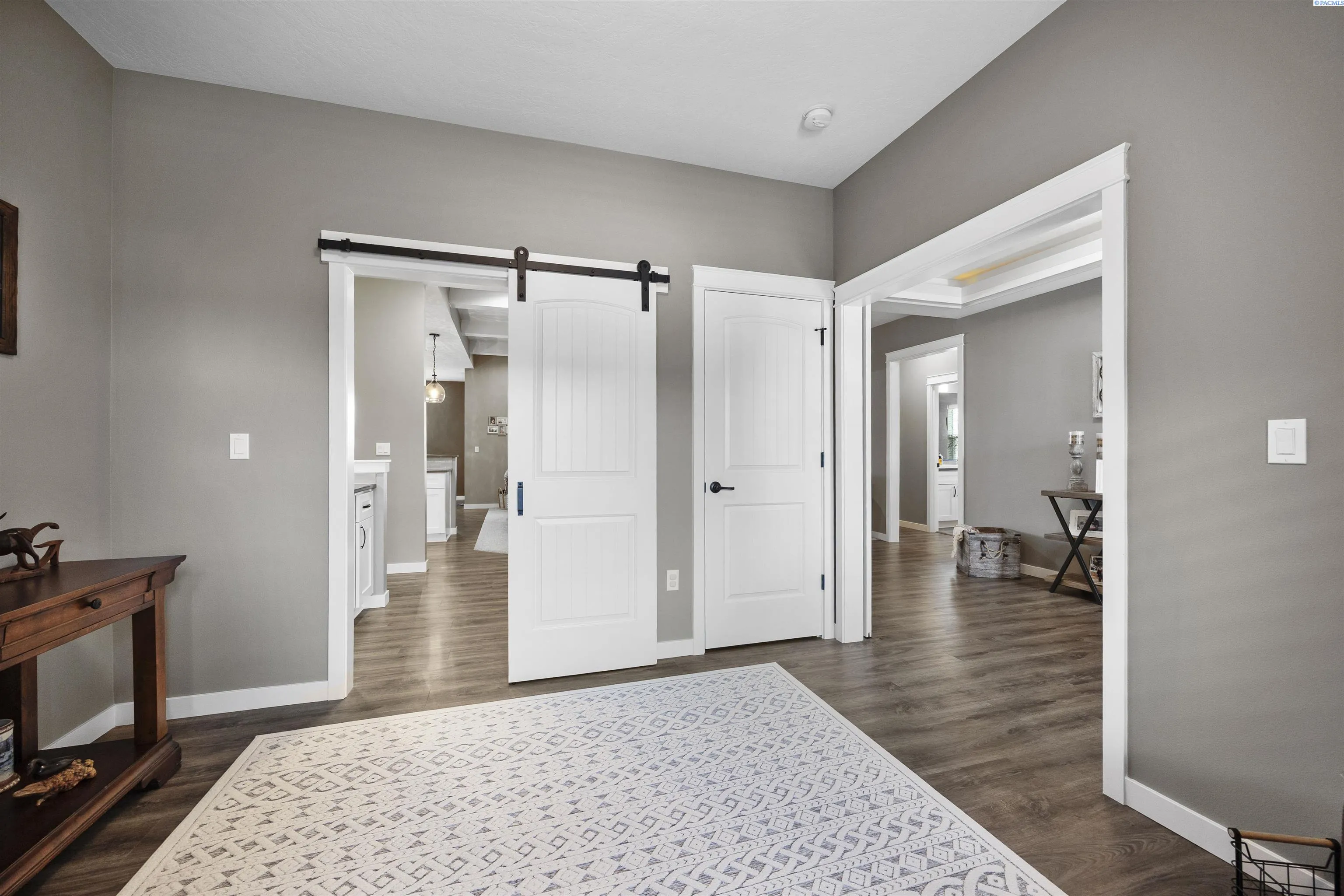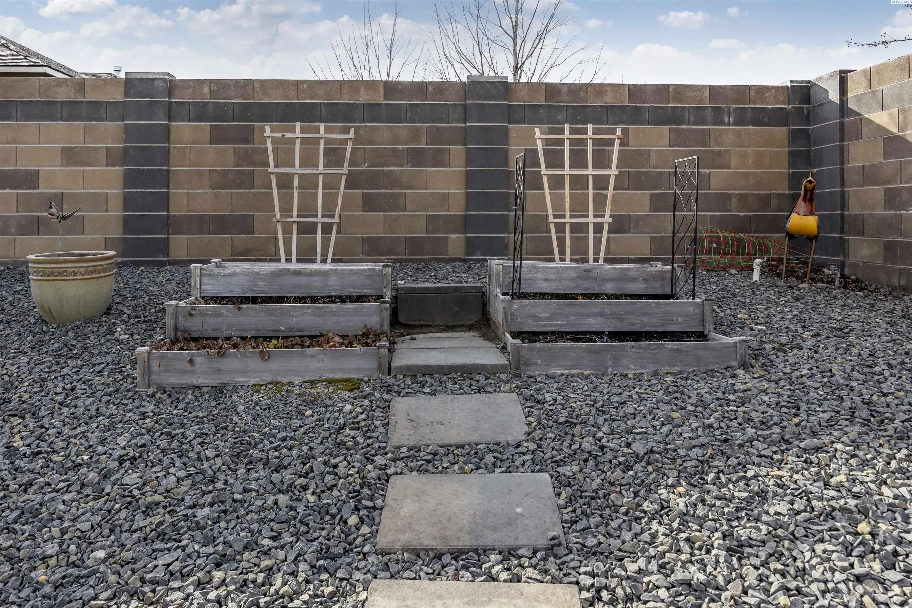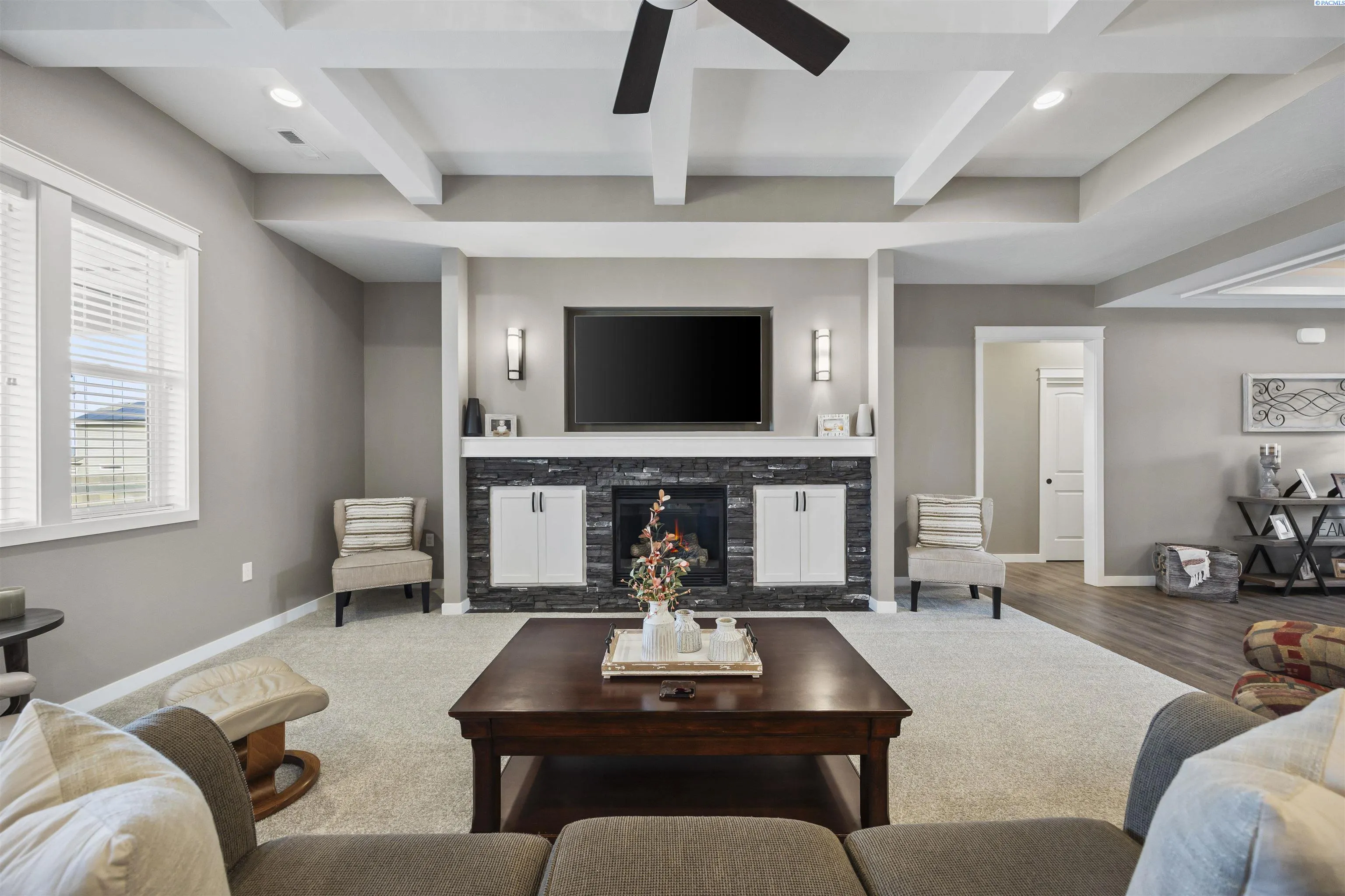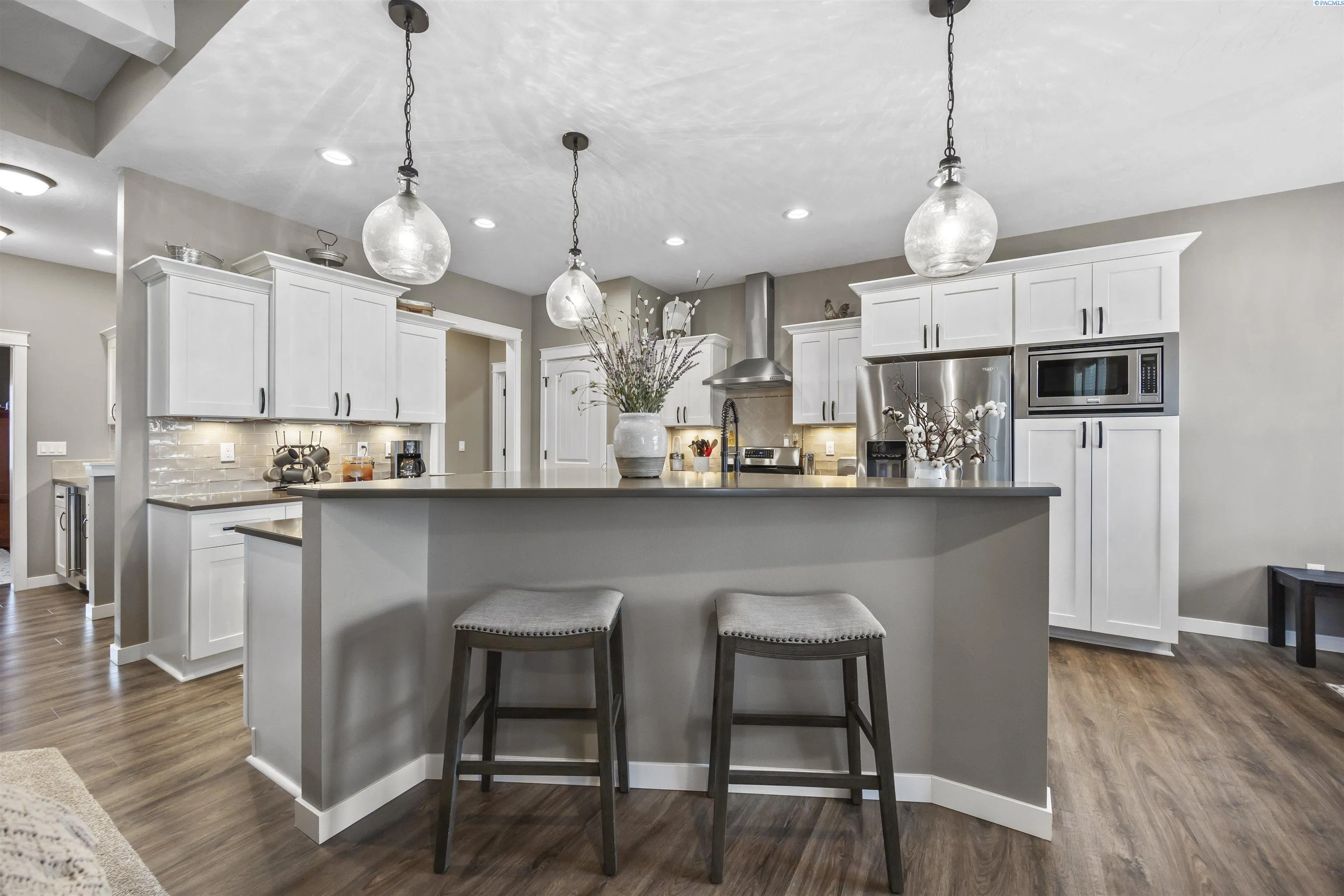 Your West Richland dream home awaits! Nestled in the beautiful Sunset Heights neighborhood, this stunning single-level home offers inviting curb appeal from the moment you arrive. With 2,242 sq ft of thoughtfully designed living space, this home features 4 bedrooms and 2 bathrooms in a spacious open-concept layout. As you step inside, you’re welcomed by a striking coffered ceiling, beautiful laminate wood flooring in the foyer, and a private den/office tucked behind a stylish barn door—perfect for a quiet work-from-home retreat. The great room is truly impressive, showcasing a dramatic detailed ceiling, a gorgeous gas fireplace, and abundant natural light that fills the space. The seamless open design creates an ideal setting for both everyday living and entertaining. The kitchen is a showstopper, complete with a large two-tier island with raised breakfast bar and apron-front sink, quartz countertops, a beautifully tiled backsplash, white cabinetry, stainless steel appliances with a gas range, and a dedicated beverage area featuring a wine chiller and wine rack. Just off the kitchen, the dining area offers lovely backyard views and direct patio access for effortless indoor-outdoor dining. The primary suite is a relaxing retreat with a tray ceiling, a generously sized custom closet, and a spa-inspired bathroom featuring dual vanities, a soaking tub, and an oversized tiled shower. Need space for hobbies, toys, or storage? The extra-large 6+ car garage provides incredible flexibility and room for projects. Situated on a .32-acre lot, the fully fenced backyard offers privacy with block fencing and two gates, a large covered patio, pristine landscaping with curbing, raised garden beds, a graveled area, and plenty of space for pets and play. Located in a wonderful West Richland setting near schools, parks, and fantastic amenities—this home truly checks all the boxes.