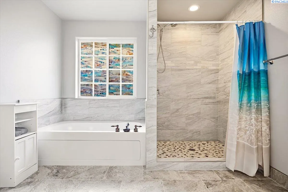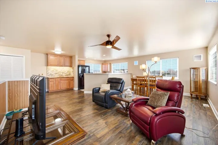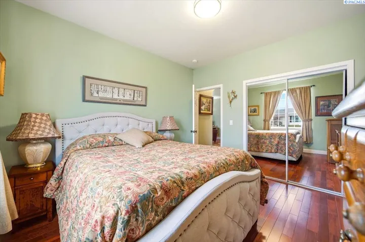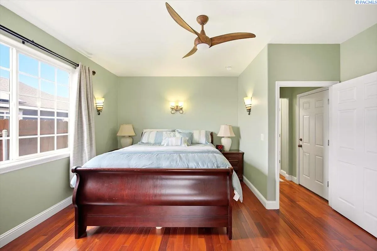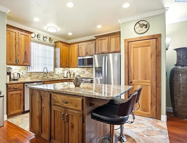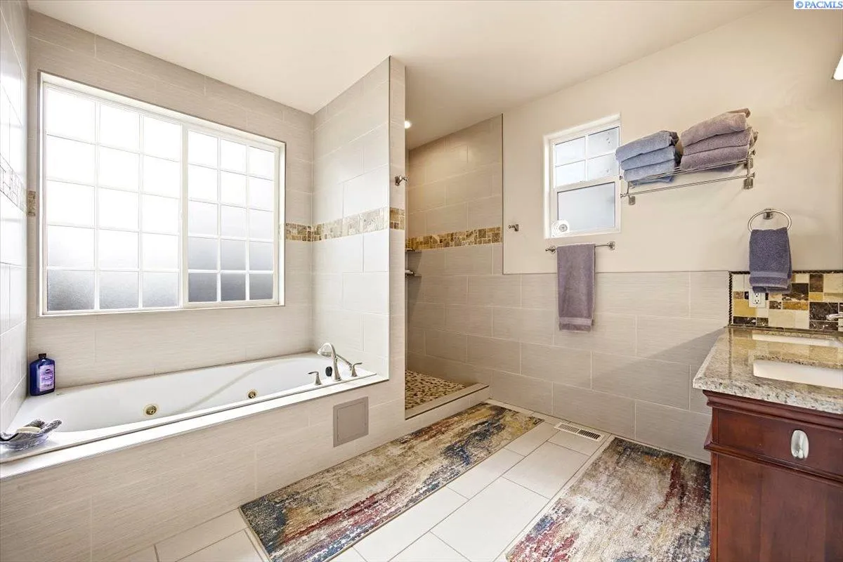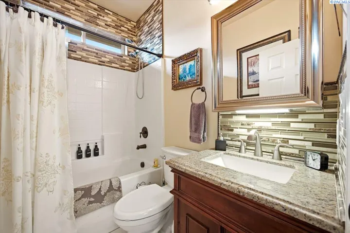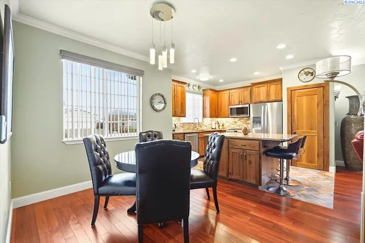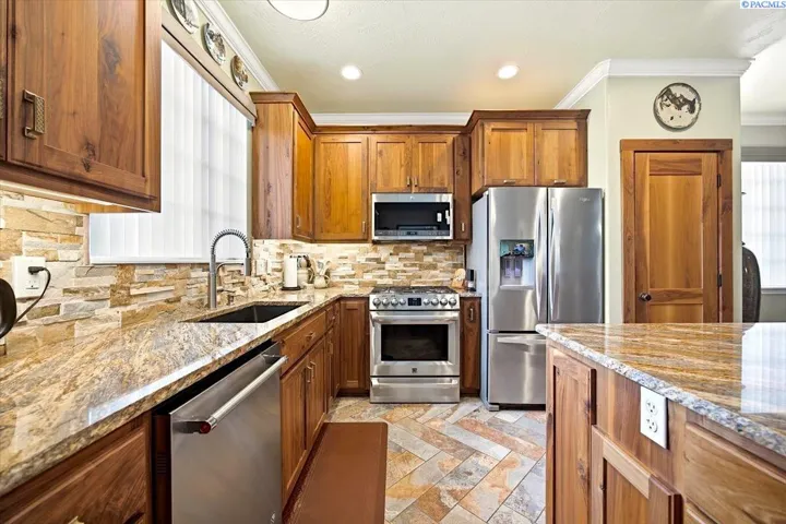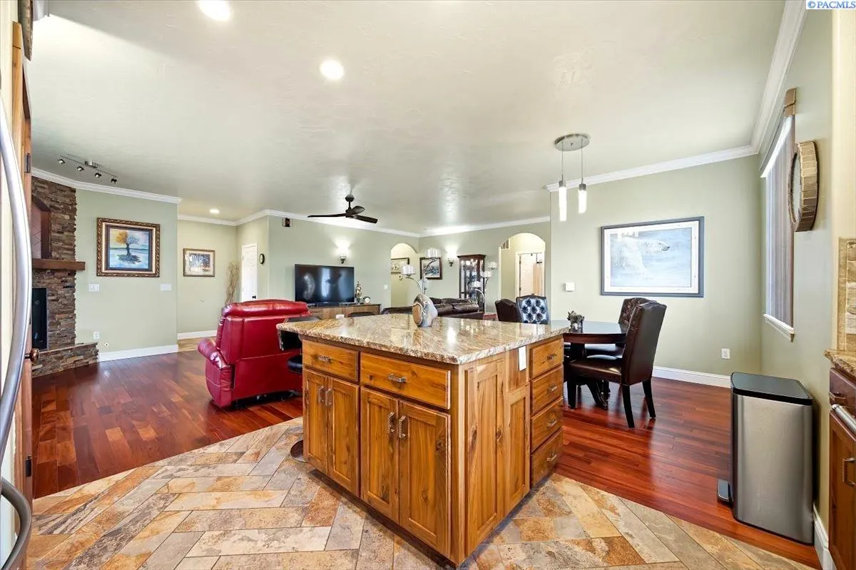 Experience comfortable elegance just minutes from shopping, recreation and easy access to area freeways. Featuring two separate living suites – The main level boasts 9’ ceilings, crown moldings, gorgeous and durable Patagonia Rosewood flooring throughout, custom tile work in the kitchen and bathrooms, beautiful fireplace and great storage options. The chef’s kitchen includes stainless-steel appliances, custom black walnut cabinetry with under-cabinet lighting, designer backsplash and granite countertops. The tranquil primary suite leads to the spa-like bathroom with custom tile work, luxury jetted-tub and separate shower and a large walk-in closet. The two roomy guest suites have generous closets. Matching custom tile adorns the guest bathrooms and laundry room, as well. The finished garage offers soaring 14’ ceilings, with extra storage racks above it all and a second laundry room. The separate entrance from the garage leads upstairs to the second complete approx. 1000 sq ft. living suite! This suite has views, a large great-room, kitchen with adjoining coffee bar, dining area, large bedroom, bathroom and walk-in closet. This second suite is fully updated as well, with custom tile, kitchen cabinets and countertops and luxury LVP flooring – amazing income potential! Upgraded systems and features include custom metalwork for the gate and railings, newer hot water heater, well-maintained high-quality HVAC system and LED lighting throughout the entire property. Contact your Broker today to schedule a private showing – while this unique gem is still available!