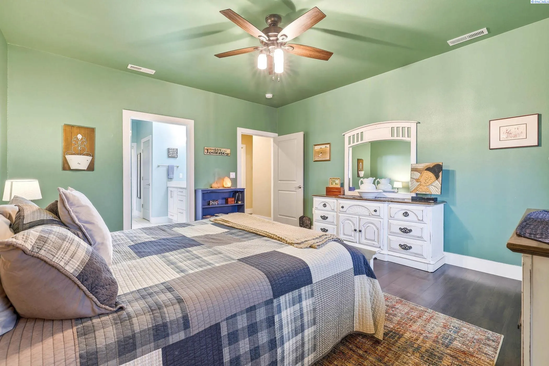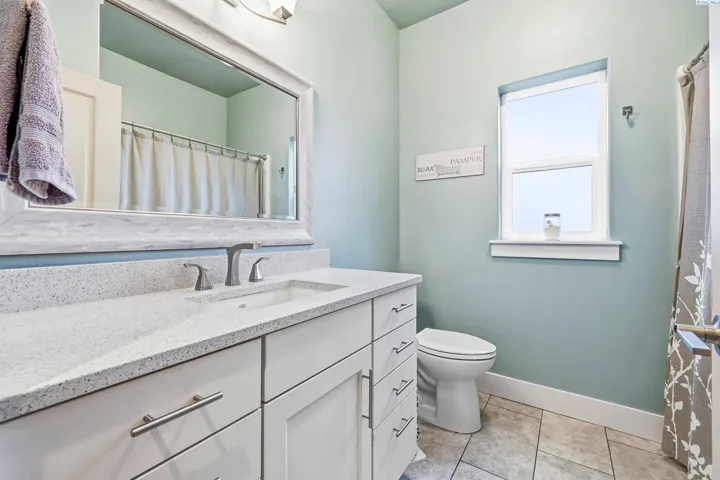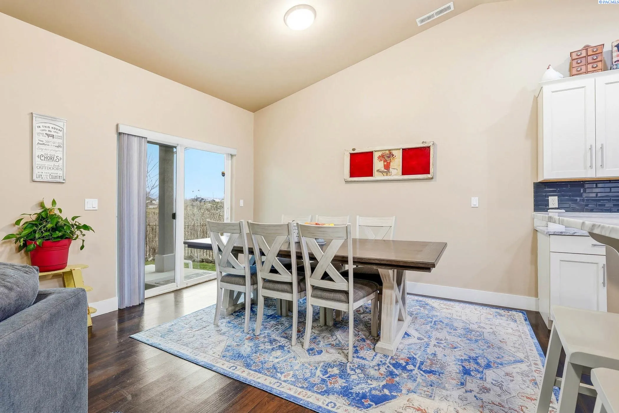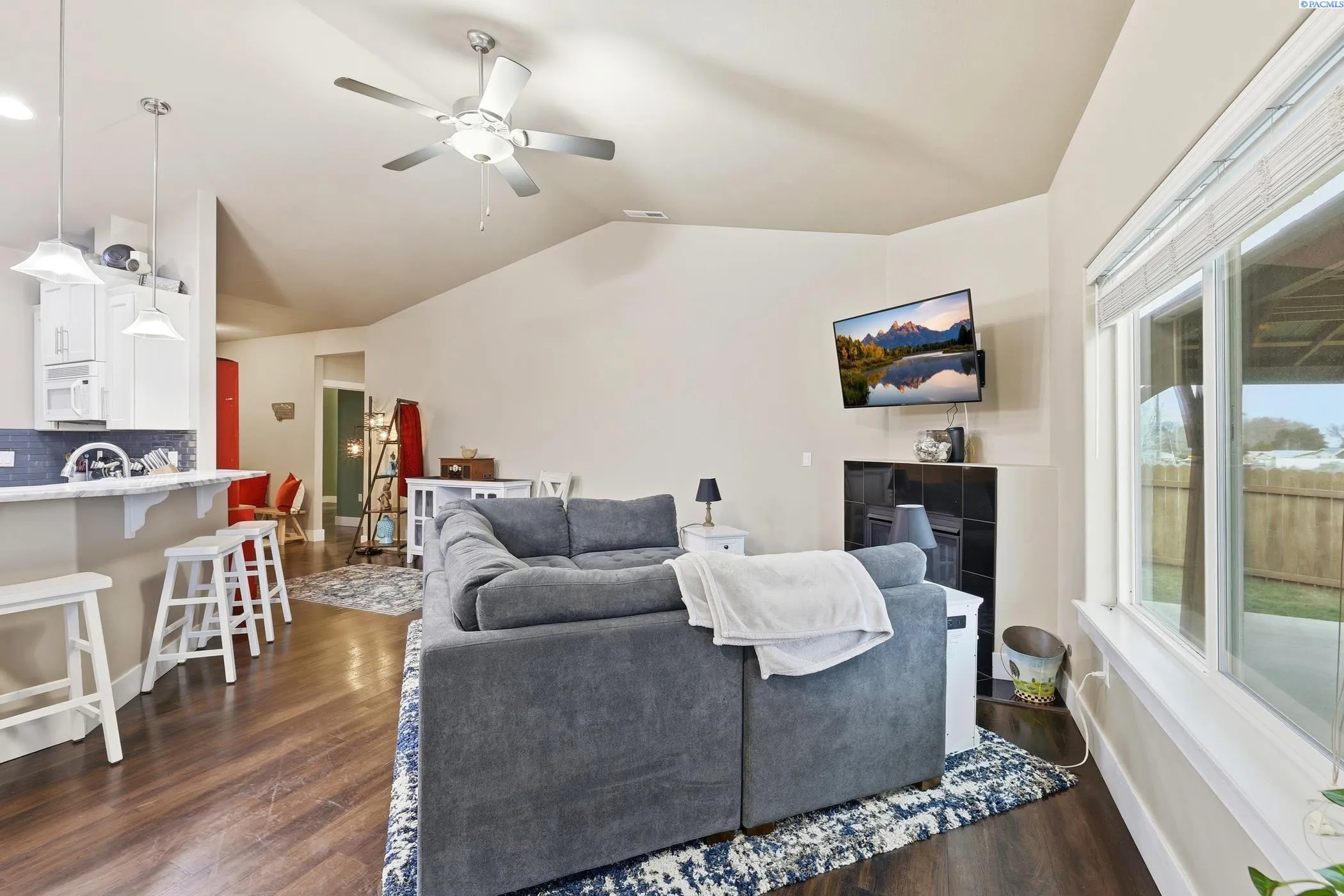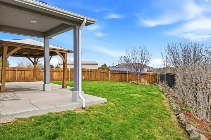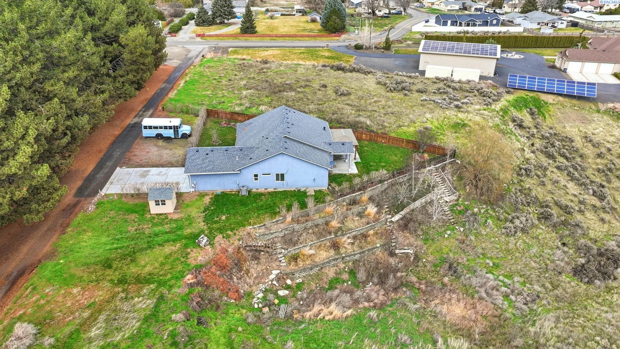 Welcome to this contemporary single-story home in Kennewick, offering the perfect blend of convenience to amenities while still maintaining a comfortable distance from neighbors. This property is situated on a sprawling 1.89-acre lot, providing an exceptional sense of privacy and stunning sunrise views. The residence features three spacious bedrooms, two full bathrooms, and a dedicated den or office area. Inside, you’ll find an inviting atmosphere highlighted by vaulted ceilings and hard-surface flooring that flows throughout the home. The heart of the home is a spacious kitchen equipped with granite countertops and a large pantry. The primary suite features a walk-in closet and an en-suite bathroom with a relaxing soaking tub. Outside, the property is designed for both relaxation and functionality, boasting a covered patio, shaded gazebo, fenced yard, and storage shed. Explore the yard with fruit trees and terraces on a south-facing slope, ideal for gardening. The home also includes a two-car garage and additional open parking areas.