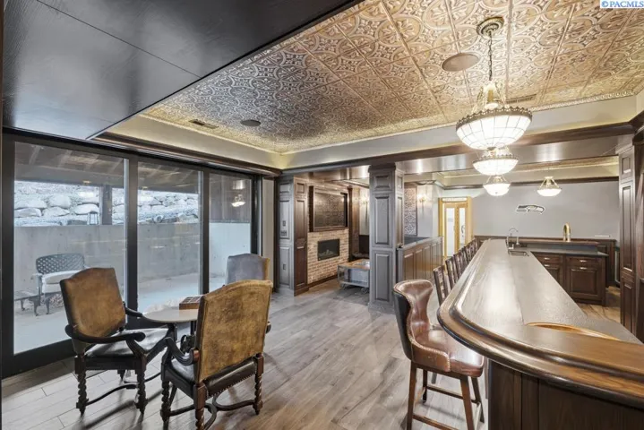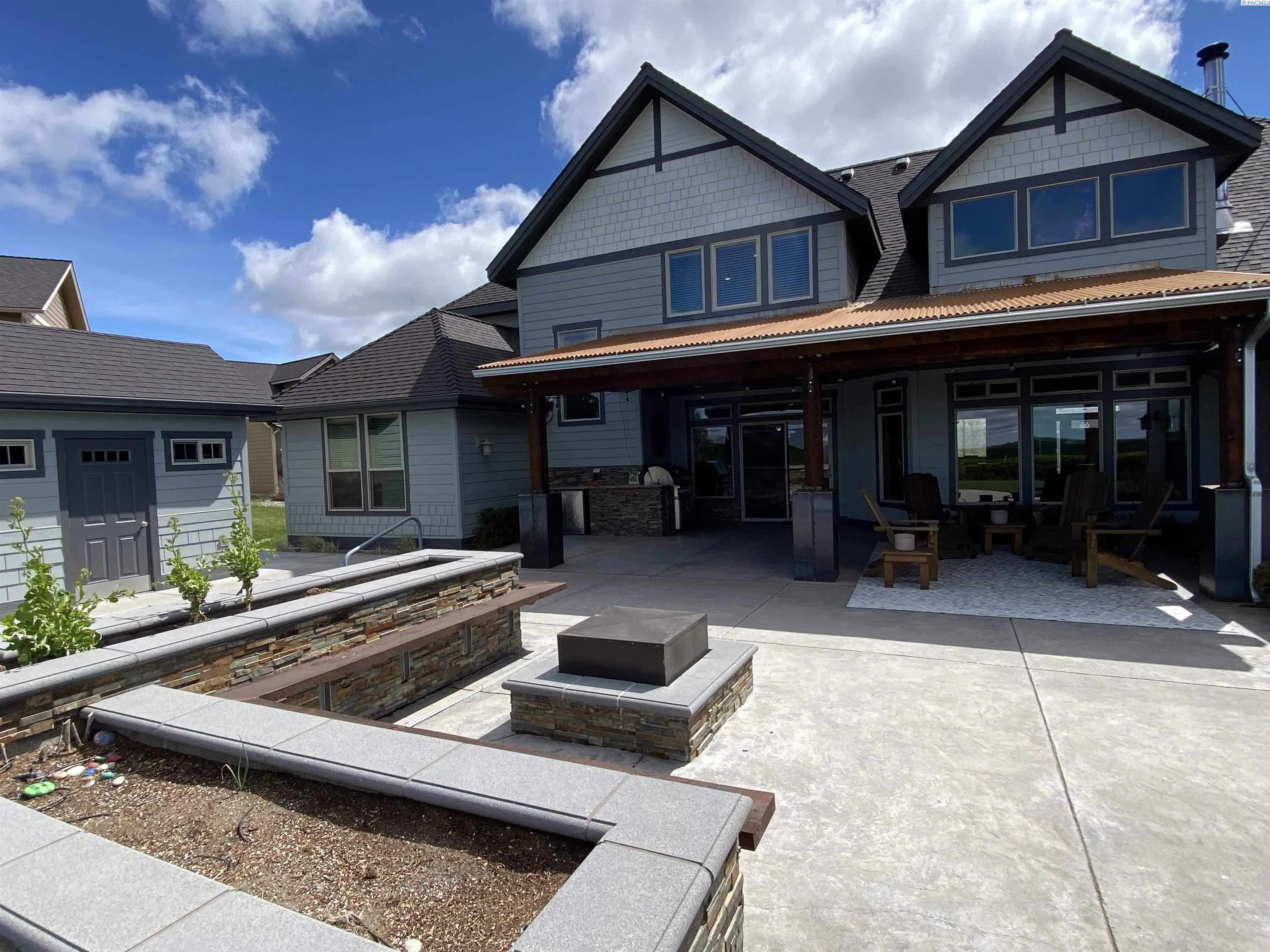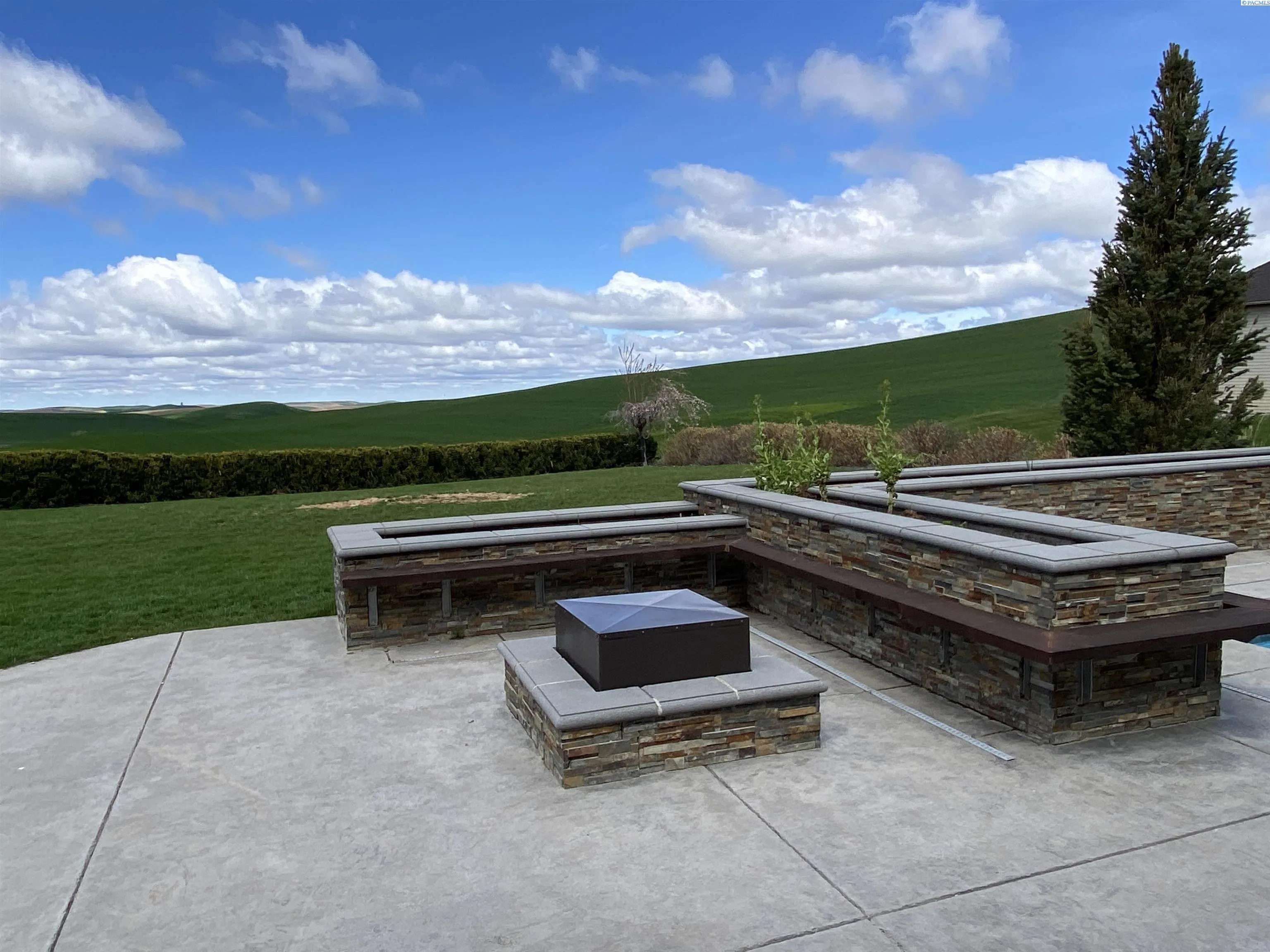MLS# 290559 A rare opportunity to own a truly distinguished custom estate set on a private half-acre lot with breathtaking southwestern views of the Palouse and unforgettable sunsets. Designed with elegance and entertaining in mind, the 3,100 SF main level showcases a dramatic great room with soaring 20-foot vaulted ceilings, a built-in entertainment center, and a stunning floor-to-ceiling imported Tilikivi soapstone fireplace. The slate entry foyer welcomes you to refined living spaces featuring cherry hardwood floors in the formal dining room, kitchen, and breakfast nook.The gourmet kitchen is appointed with granite slab countertops, rich cherry cabinetry, a walk-in pantry, and a convenient workstation. The luxurious main-level primary suite offers a pass-through fireplace and spa-inspired bath. A guest en-suite bedroom with full bath, spacious den, and laundry room complete the main floor. Step outside to an extraordinary covered patio with massive exposed beams and timber overhang, perfect for year-round enjoyment. The outdoor living space includes a built-in BBQ area, gas fire pit, in-ground hot tub pool with pool shed, stone raised garden beds with built-in seating, and an expansive, flat, private yard-all set against sweeping Palouse views. Upstairs, you’ll find two ensuite bedrooms and a bonus room/bedroom. The fully finished basement is an entertainer’s dream. In addition to a bedroom and full bath for guests, the showpiece is a custom, richly appointed bar crafted with red oak and dark espresso finishes. Highlights include a 21-foot solid oak bar top, custom cabinetry with leathered granite countertops, tin ceiling and molding, antique brass bar rail, Waterford sconces, custom lighting, built-in Sonos speakers, True ice maker and twin bar refrigerators, Bosch dishwasher, and dual bar sinks with matching fixtures. The space also features three built-in flat-screen TVs, a gas log fireplace, hidden queen Murphy bed, and built-in seating for intimate gatherings. A vintage 1950s telephone booth from the Pioneer Hotel in Seattle adds a unique conversation piece. Glass sliding doors lead to an additional outdoor patio with a 20×12 custom overhang, extending your entertainment options even further. This exceptional home offers unparalleled indoor and outdoor living, designed for those who love to entertain in style.