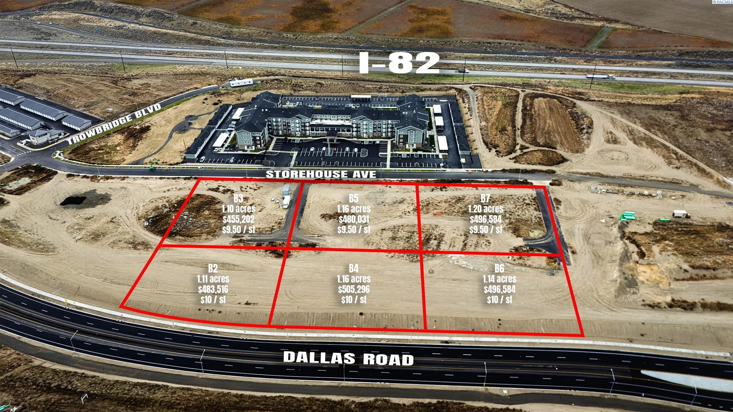 MLS# 289627 This is a great chance to purchase a fully improved commercial lot located within the rapidly expanding Badger Mountain South master-planned community in South Richland. The site is zoned BMS-SD-DR (Destination Retail), allowing for a range of uses including retail, office, service, civic, and related commercial operations. Industrial, light industrial, and storage uses are prohibited. Multi-family use may be considered with developer approval. A Commercial Owners Association is in place to help preserve long-term value and oversees maintenance of private roads and shared landscaping through an ongoing assessment. The community features scenic walking and biking trails throughout. Utilities are already stubbed to the property, and additional commercial lots are available within the development.