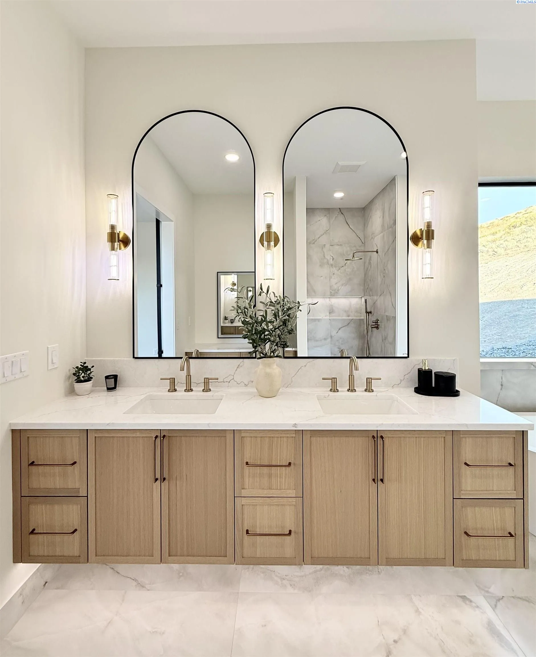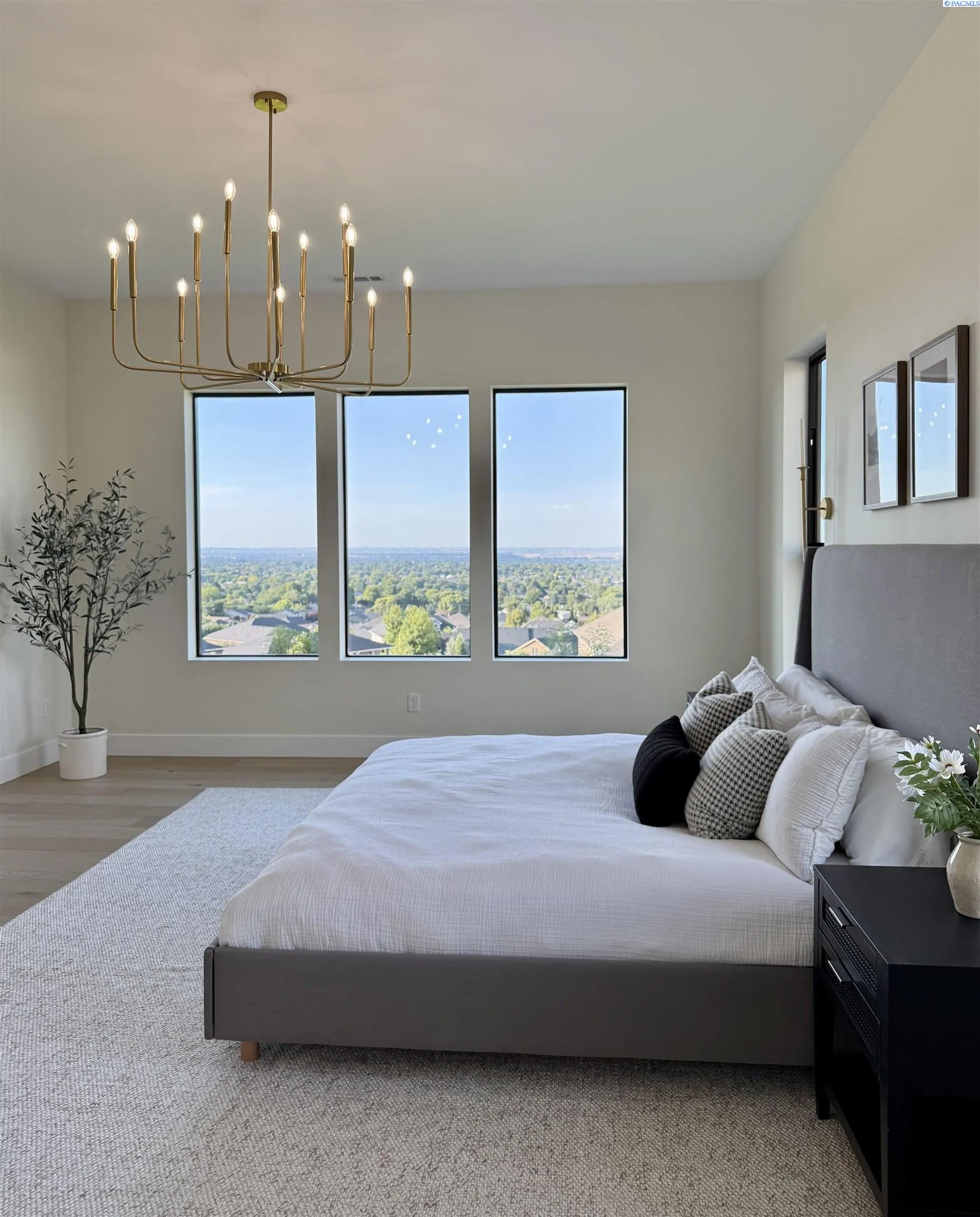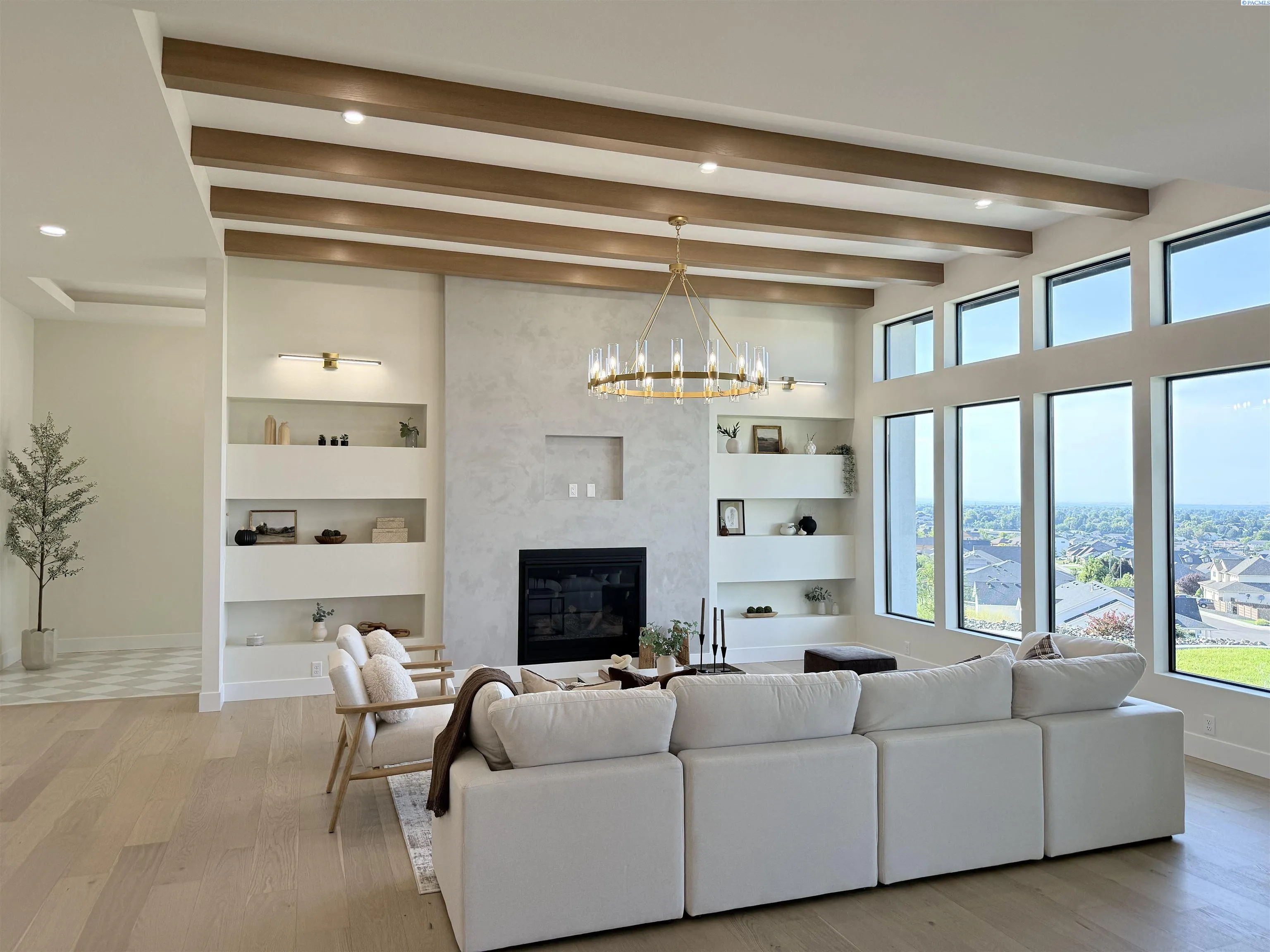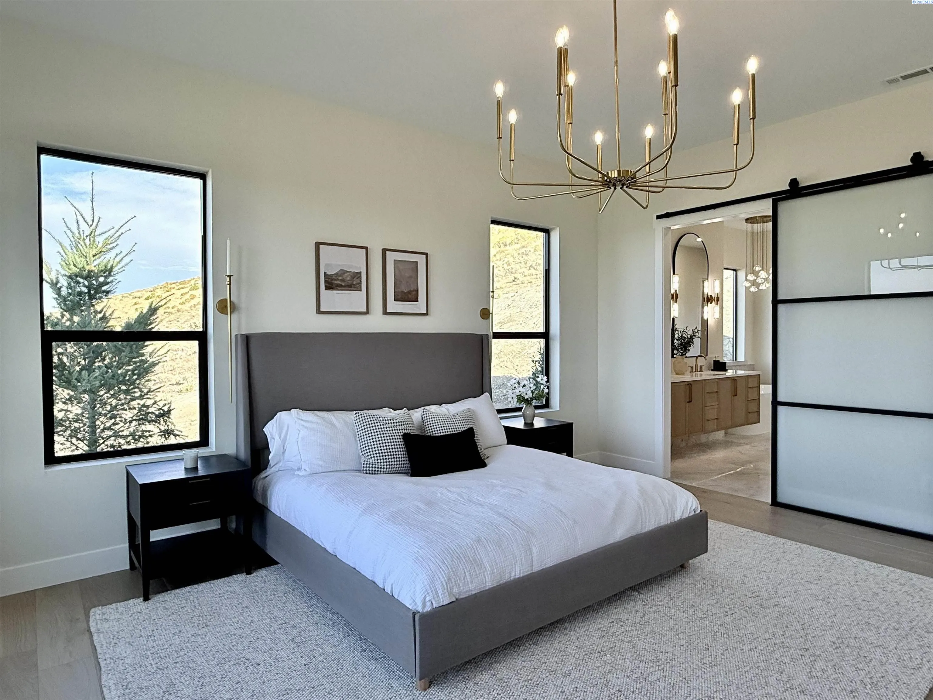MLS# 286327 This exquisite 4-BR + Den, 3.5-BA rambler is situated in the esteemed Inspiration Estates. This home has a linear style, highlighted by black windows for you to enjoy the view sweeping from Badger Mt to the Blue Mountains, making for incredible sunrises and sunsets. The privacy-glassed, oversized garage gives extra space for projects or storage. This home comes fully landscaped with TUGS. This architectural masterpiece features a no-step entry, ensuring convenience and accessibility. The covered patio is perfect to extend your entertainment area and the BBQ stub is ready for your grill or future outdoor kitchen. The solar panels, EV outlet in garage and the tankless water heater increase energy efficiency. The designed flow starts with a grand entry foyer, leading into the Great Room with 12’ ceilings, open concept with the kitchen and dining room. The fireplace is strategically placed in the hand-troweled limestone column in the Great Room with built in shelving that is illuminated by sconces. The ceiling shows off the custom beam work that shares options in an overhead lighting system and a dimmable, gold ring chandelier. Engineered white oak hardwood flooring is in main living areas and Berber carpet in the bedrooms. All bathrooms are tiled –no fiberglass here! There are Quartz countertops throughout the kitchen, bathrooms and Mudroom. Creating in this kitchen will be a total joy with the Z-Line 48” SS Professional Range/Oven with Champagne Bronze Accents. It has an electric Double oven with 6.7 cu ft for larger cooking and a side, baking oven. The 8 auto-re ignition gas burners combine the elegance of a hand-finished porcelain cooktop with an electric convection oven. Sconces are placed on either side of the limestone vent hood for ambiance. Matching Z-Line Drawer Microwave and Dishwasher compliment this impressive look. Custom stained cabinets are showcased with the toe-kick lighting, and under island lighting as well. The 10’ x 4’ quartz waterfall island has full cabinet storage beneath. The pantry has generous shelving. The Main BR is spacious and has breathtaking views. The Owner’s Bath is welcoming and set apart by a privacy-tinted glass sliding door; featuring a makeup bar with lighted mirror, tiled shower with undershelf lighting, free-standing tub with chandelier, built in shelving with dimmable lighting, large closet with custom shelving, and separate area for the Owners Washer/Dryer. 2 yr snow removal included with full price.