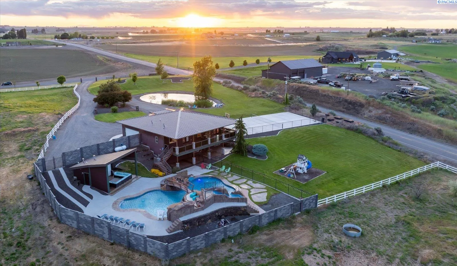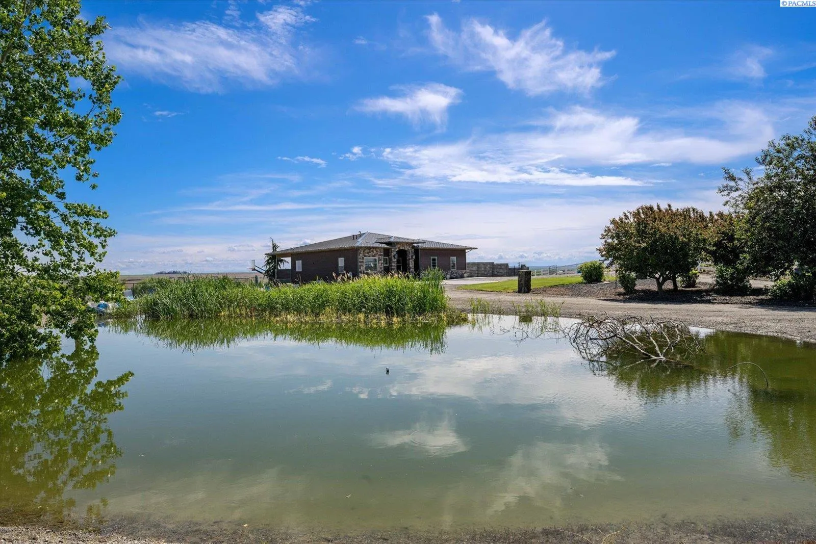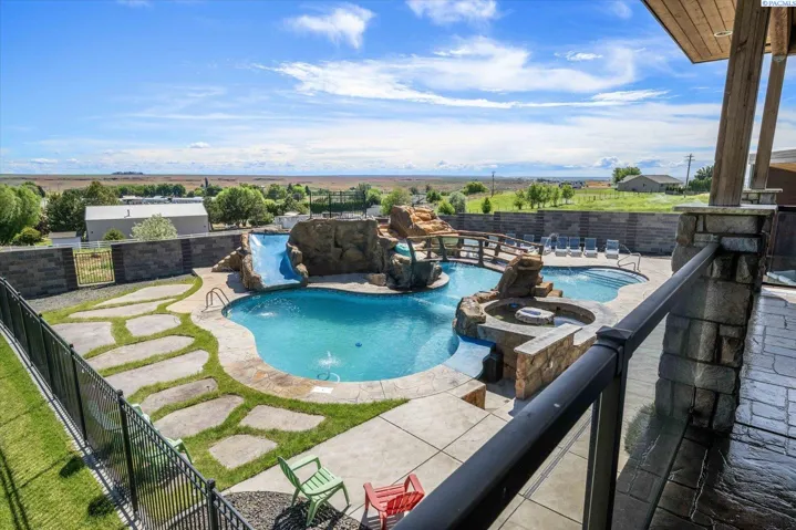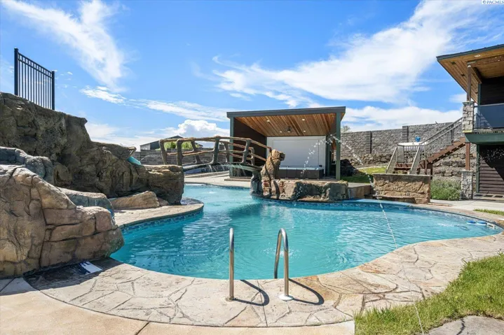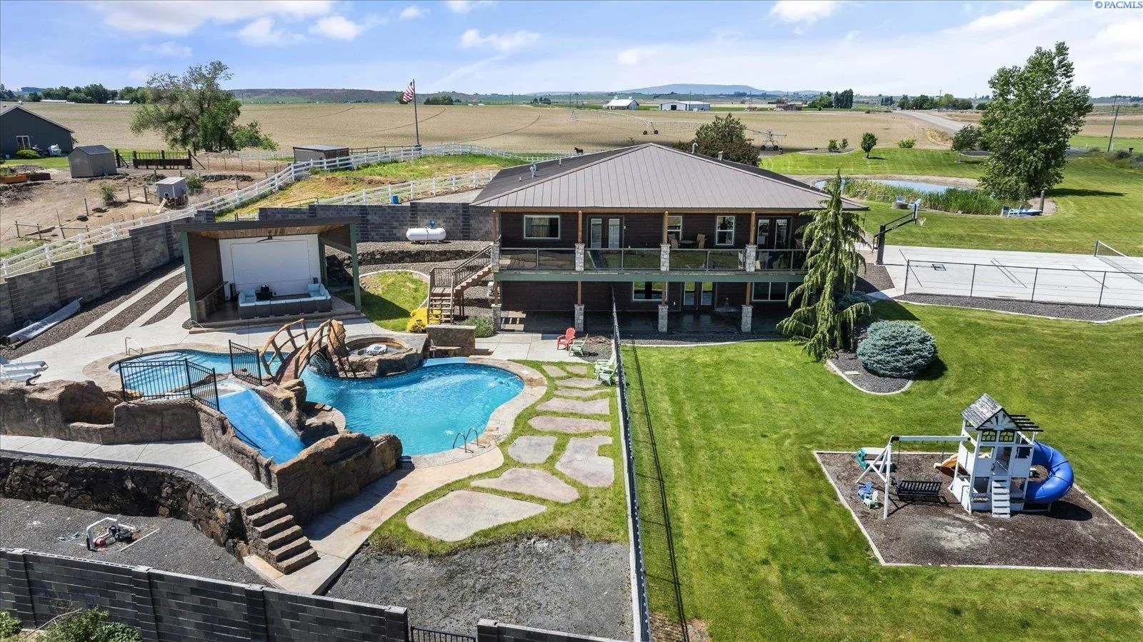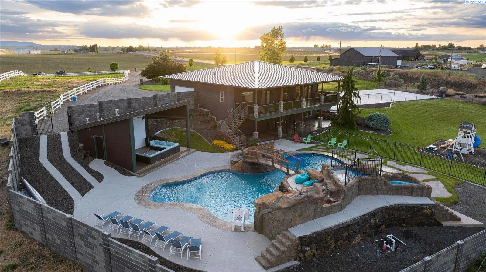 MLS# 284267 Presenting this exclusive premier listing – Discover unparalleled privacy and resort-style living just 12 minutes north of Pasco, Washington. Nestled on 4.34 acres, this extraordinary 4-bedroom, 5-bath estate offers 3,356 sq ft of luxury and functionality, thoughtfully designed for upscale entertaining and everyday comfort. The open-concept kitchen and living area exude modern elegance with an oversized granite island, brand new built-in fridge/freezer, large pantry, Venetian plaster ceiling, custom millwork, and ambient LED up-lighting. The main level features a versatile bedroom or office, full bath, and spacious laundry/mudroom with oversized sink. The massive primary suite is a private retreat with French doors opening to the outdoor oasis and covered patio, a large walk-in closet, and a spa-like en-suite with self-heated two-person Jacuzzi tub, dual showerheads with rain feature, dual vanities, heated towel rack, and smart TV. The daylight basement continues the luxury experience with stamped and stained wood-look concrete floors, two additional bedrooms (one with walk-in closet), full bath, game room with pool table, and a custom wet bar with sink and luxury cabinetry. The professionally designed theater room includes a half bath, no-touch urinal, climate control, and 8” steel-reinforced safe room. Outdoor living is truly unmatched, featuring a 43,000-gallon lagoon-style pool with swim-up bar, grotto rock waterfall, waterslide, two white sand beaches, bridge, 20+ person hot tub with waterfalls, and a gas fire pit. Additional highlights include a miniature lake with sand beach and firepit, an outdoor amphitheater with 200”+ drop-down screen and built-in bar, and an outdoor bathroom with shower for pool guests. The upper stamped concrete deck offers panoramic territorial views of the Basin and Blue Mountains and includes a custom built-in Traeger grill, outdoor kitchen, sink, and refrigerator. The lower covered patio features outdoor speakers and more stamped concrete for seamless entertainment. A newly added sport court with pickleball and a fully fenced, irrigated pasture for horses or livestock make this property both luxurious and functional. With a private drive, low-maintenance pre-stained concrete siding, standing seam metal roof, and proximity to schools, highway access, and Country Mercantile nearby, this one-of-a-kind estate is a rare opportunity in the Tri-Cities.