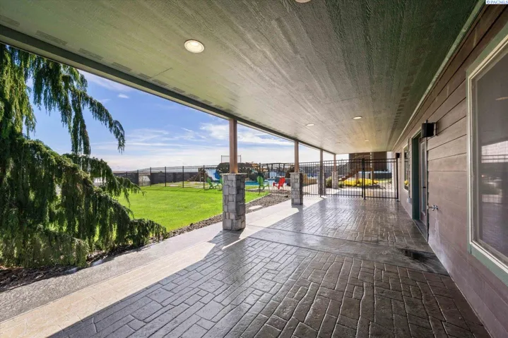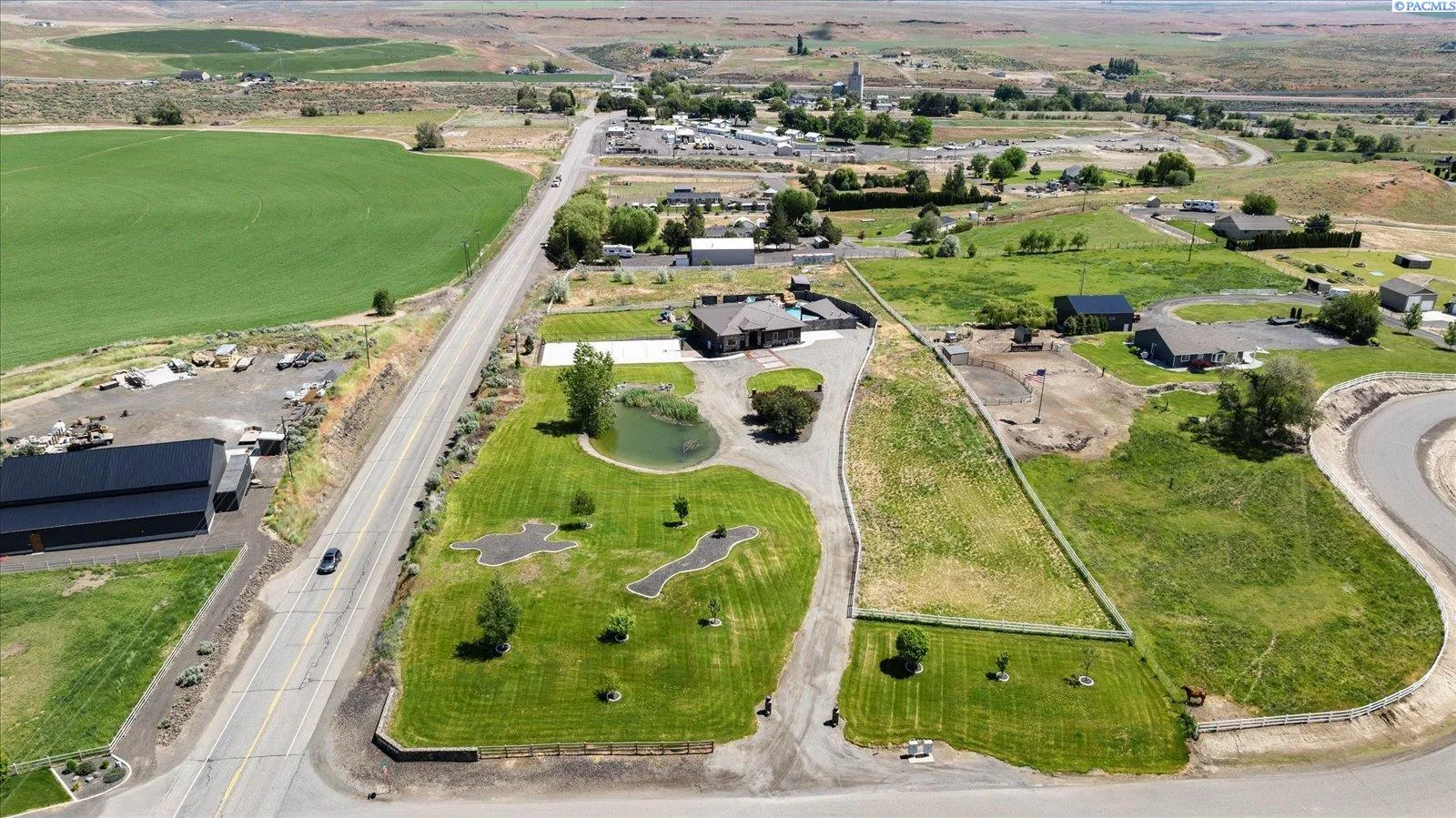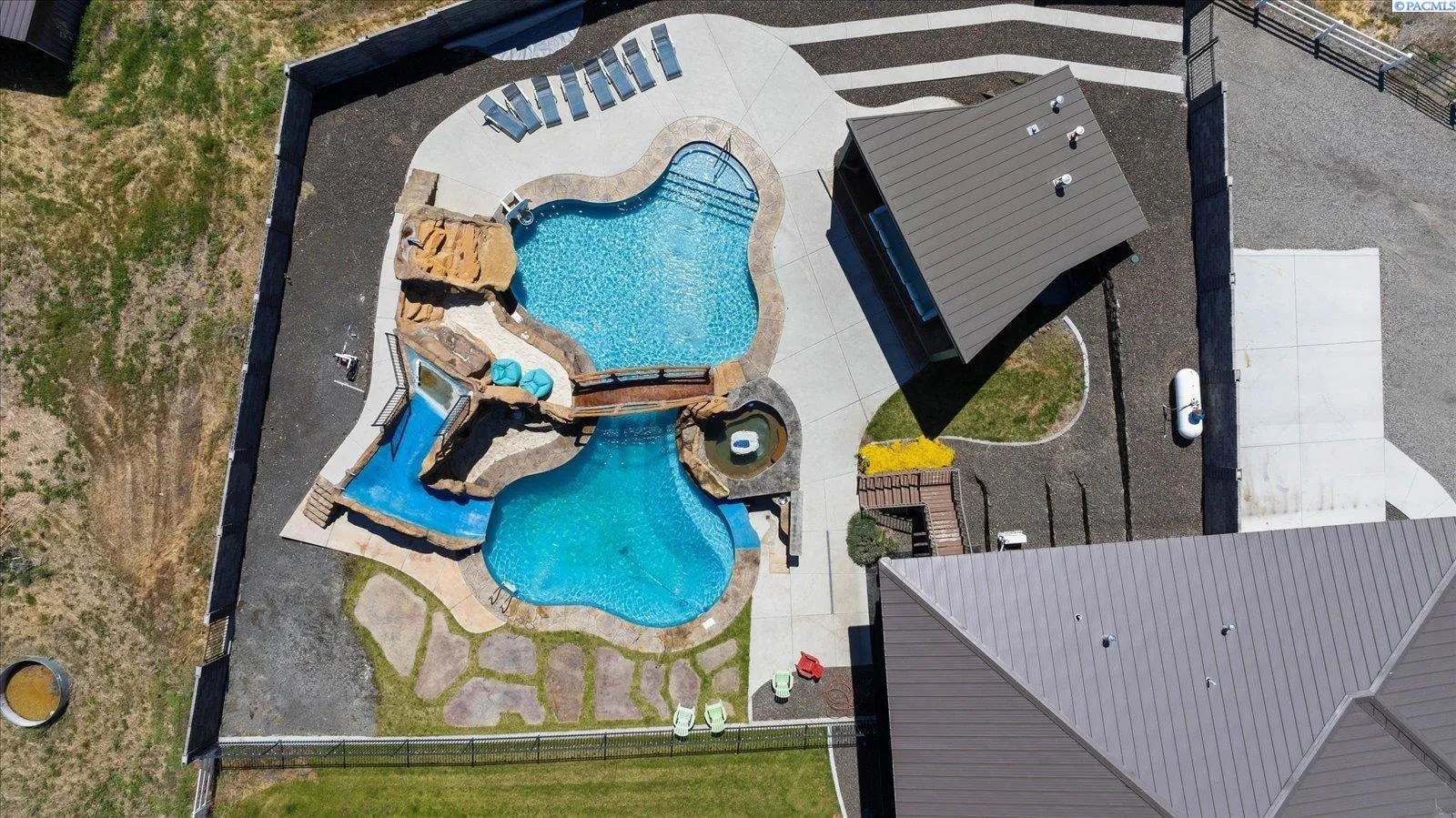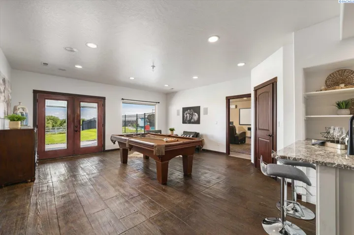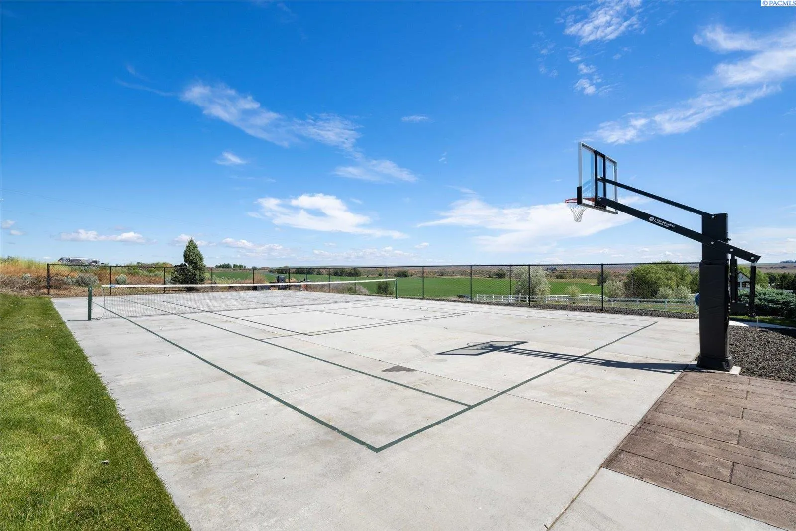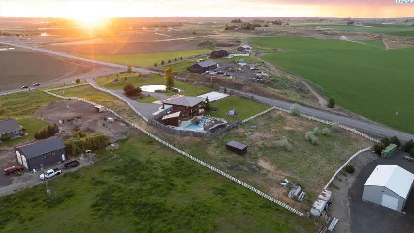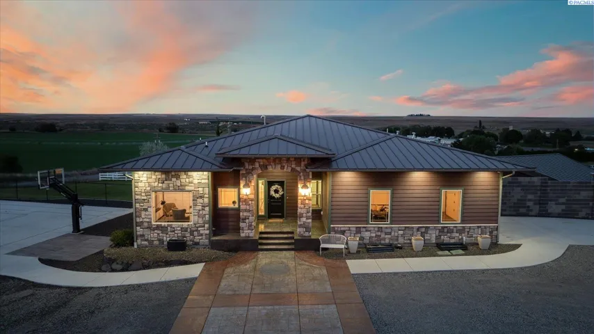 MLS# 284267 Presenting this exclusive premier listing – Discover unparalleled privacy and resort-style living just 12 minutes north of Pasco, Washington. Nestled on 4.34 acres, this extraordinary 4-bedroom, 5-bath estate offers 3,356 sq ft of luxury and functionality, thoughtfully designed for upscale entertaining and everyday comfort. The open-concept kitchen and living area exude modern elegance with an oversized granite island, brand new built-in fridge/freezer, large pantry, Venetian plaster ceiling, custom millwork, and ambient LED up-lighting. The main level features a versatile bedroom or office, full bath, and spacious laundry/mudroom with oversized sink. The massive primary suite is a private retreat with French doors opening to the outdoor oasis and covered patio, a large walk-in closet, and a spa-like en-suite with self-heated two-person Jacuzzi tub, dual showerheads with rain feature, dual vanities, heated towel rack, and smart TV. The daylight basement continues the luxury experience with stamped and stained wood-look concrete floors, two additional bedrooms (one with walk-in closet), full bath, game room with pool table, and a custom wet bar with sink and luxury cabinetry. The professionally designed theater room includes a half bath, no-touch urinal, climate control, and 8” steel-reinforced safe room. Outdoor living is truly unmatched, featuring a 43,000-gallon lagoon-style pool with swim-up bar, grotto rock waterfall, waterslide, two white sand beaches, bridge, 20+ person hot tub with waterfalls, and a gas fire pit. Additional highlights include a miniature lake with sand beach and firepit, an outdoor amphitheater with 200”+ drop-down screen and built-in bar, and an outdoor bathroom with shower for pool guests. The upper stamped concrete deck offers panoramic territorial views of the Basin and Blue Mountains and includes a custom built-in Traeger grill, outdoor kitchen, sink, and refrigerator. The lower covered patio features outdoor speakers and more stamped concrete for seamless entertainment. A newly added sport court with pickleball and a fully fenced, irrigated pasture for horses or livestock make this property both luxurious and functional. With a private drive, low-maintenance pre-stained concrete siding, standing seam metal roof, and proximity to schools, highway access, and Country Mercantile nearby, this one-of-a-kind estate is a rare opportunity in the Tri-Cities.