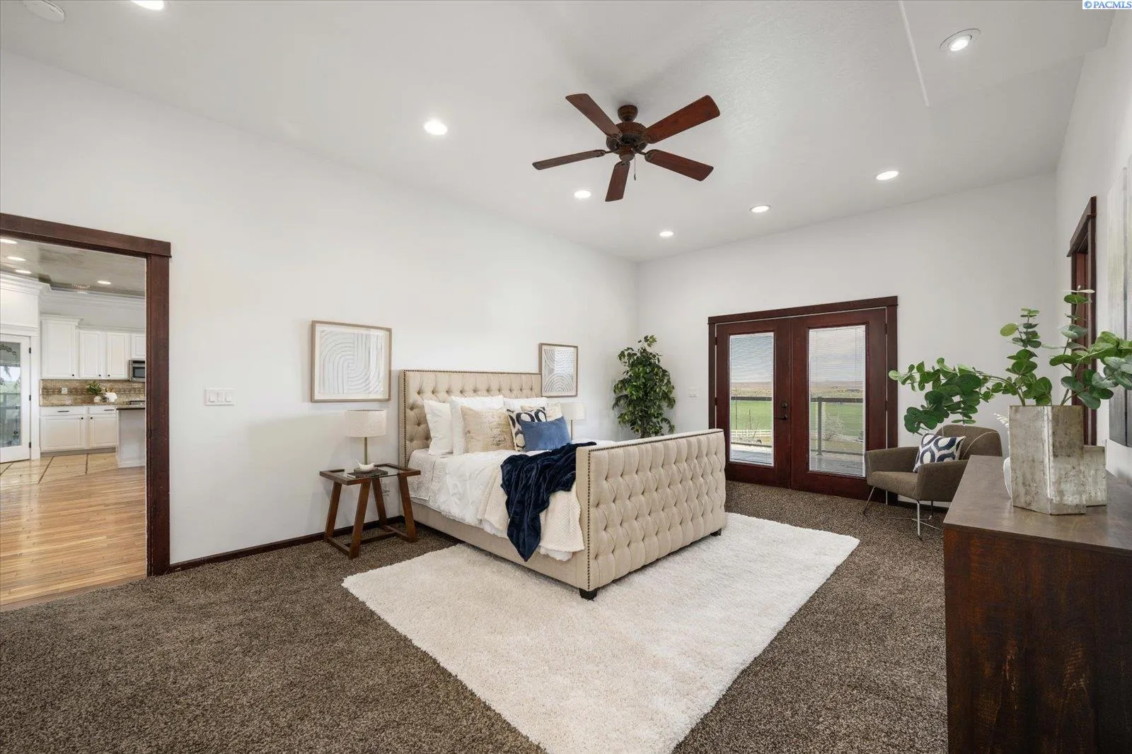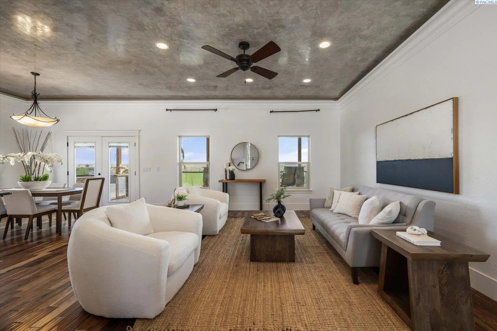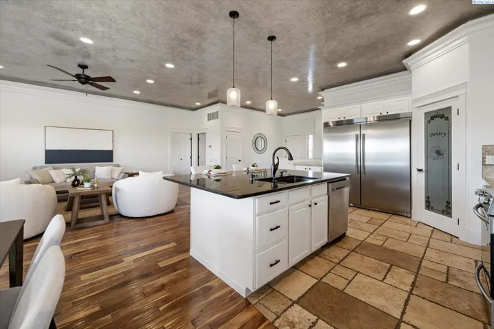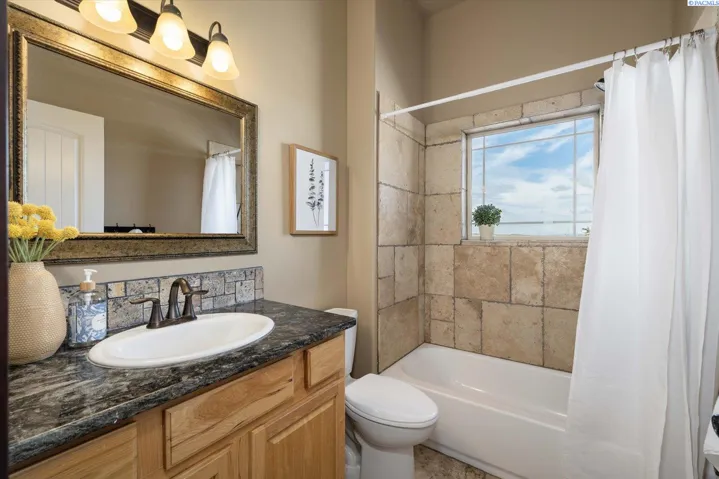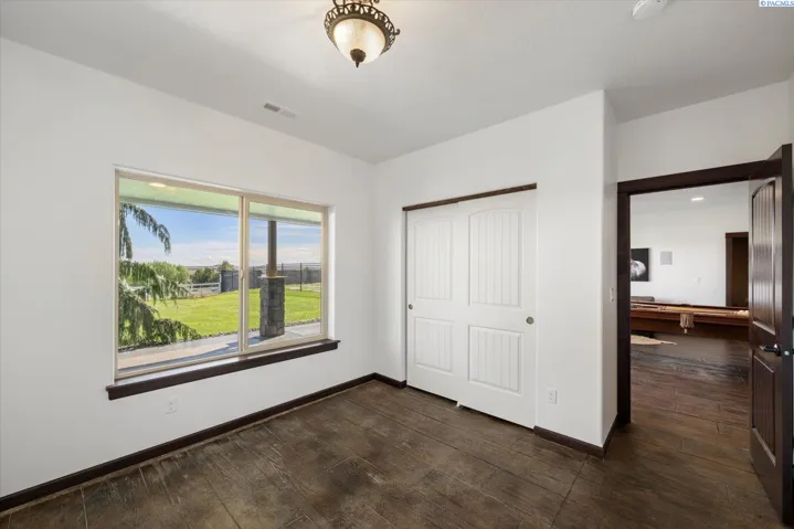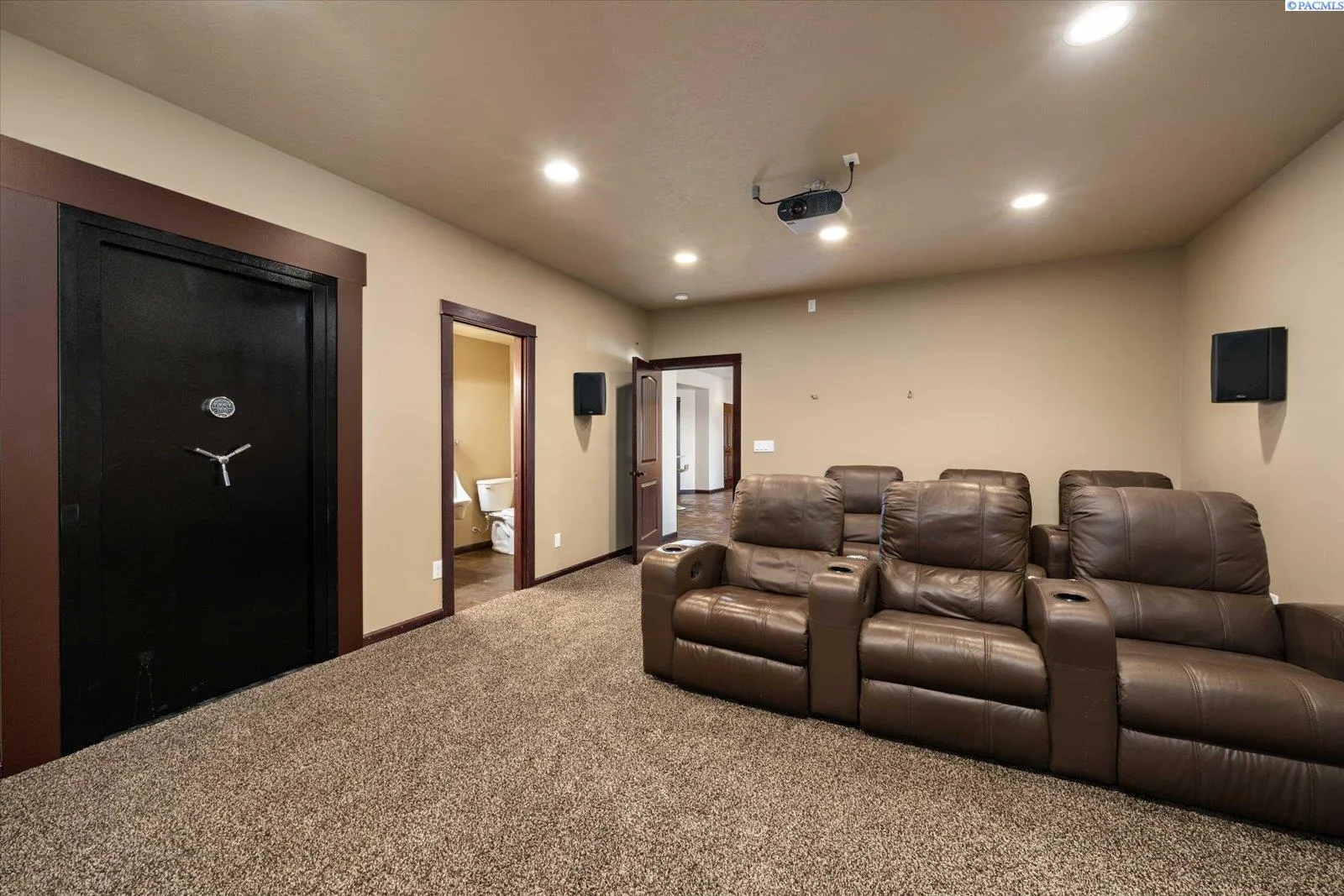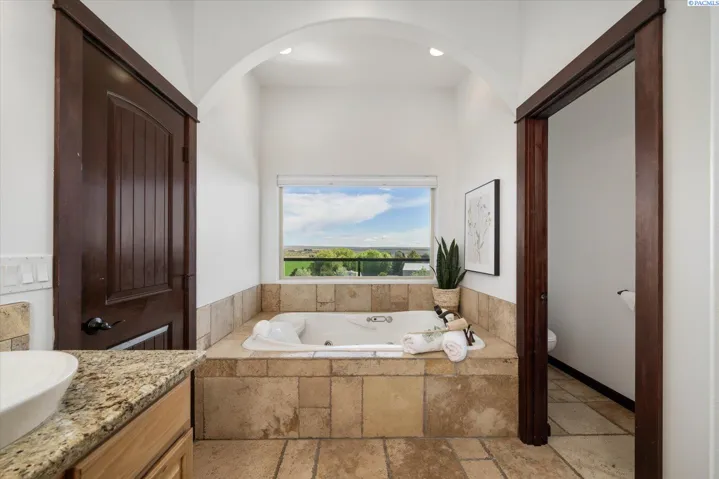 MLS# 284267 Presenting this exclusive premier listing – Discover unparalleled privacy and resort-style living just 12 minutes north of Pasco, Washington. Nestled on 4.34 acres, this extraordinary 4-bedroom, 5-bath estate offers 3,356 sq ft of luxury and functionality, thoughtfully designed for upscale entertaining and everyday comfort. The open-concept kitchen and living area exude modern elegance with an oversized granite island, brand new built-in fridge/freezer, large pantry, Venetian plaster ceiling, custom millwork, and ambient LED up-lighting. The main level features a versatile bedroom or office, full bath, and spacious laundry/mudroom with oversized sink. The massive primary suite is a private retreat with French doors opening to the outdoor oasis and covered patio, a large walk-in closet, and a spa-like en-suite with self-heated two-person Jacuzzi tub, dual showerheads with rain feature, dual vanities, heated towel rack, and smart TV. The daylight basement continues the luxury experience with stamped and stained wood-look concrete floors, two additional bedrooms (one with walk-in closet), full bath, game room with pool table, and a custom wet bar with sink and luxury cabinetry. The professionally designed theater room includes a half bath, no-touch urinal, climate control, and 8” steel-reinforced safe room. Outdoor living is truly unmatched, featuring a 43,000-gallon lagoon-style pool with swim-up bar, grotto rock waterfall, waterslide, two white sand beaches, bridge, 20+ person hot tub with waterfalls, and a gas fire pit. Additional highlights include a miniature lake with sand beach and firepit, an outdoor amphitheater with 200”+ drop-down screen and built-in bar, and an outdoor bathroom with shower for pool guests. The upper stamped concrete deck offers panoramic territorial views of the Basin and Blue Mountains and includes a custom built-in Traeger grill, outdoor kitchen, sink, and refrigerator. The lower covered patio features outdoor speakers and more stamped concrete for seamless entertainment. A newly added sport court with pickleball and a fully fenced, irrigated pasture for horses or livestock make this property both luxurious and functional. With a private drive, low-maintenance pre-stained concrete siding, standing seam metal roof, and proximity to schools, highway access, and Country Mercantile nearby, this one-of-a-kind estate is a rare opportunity in the Tri-Cities.