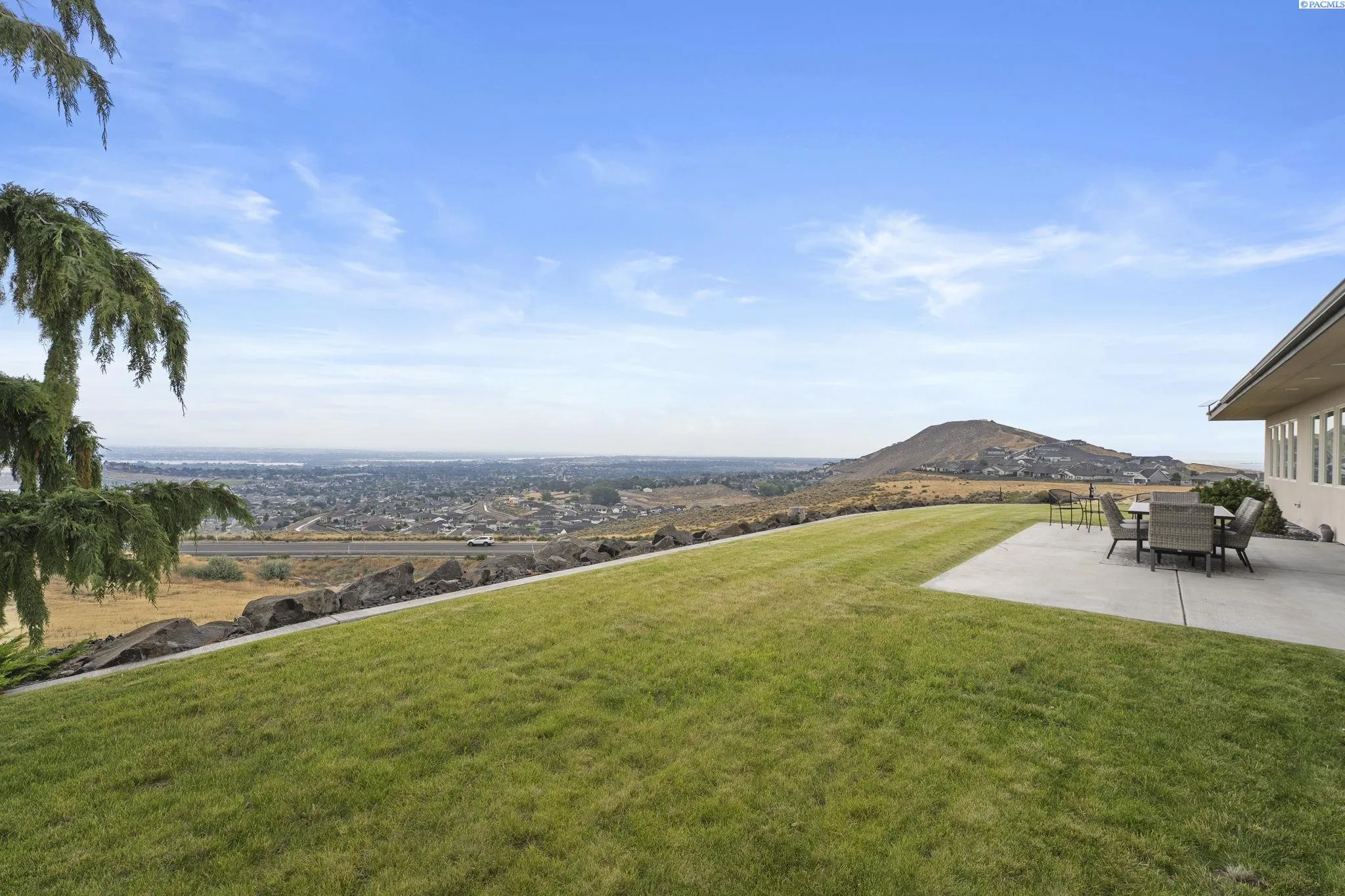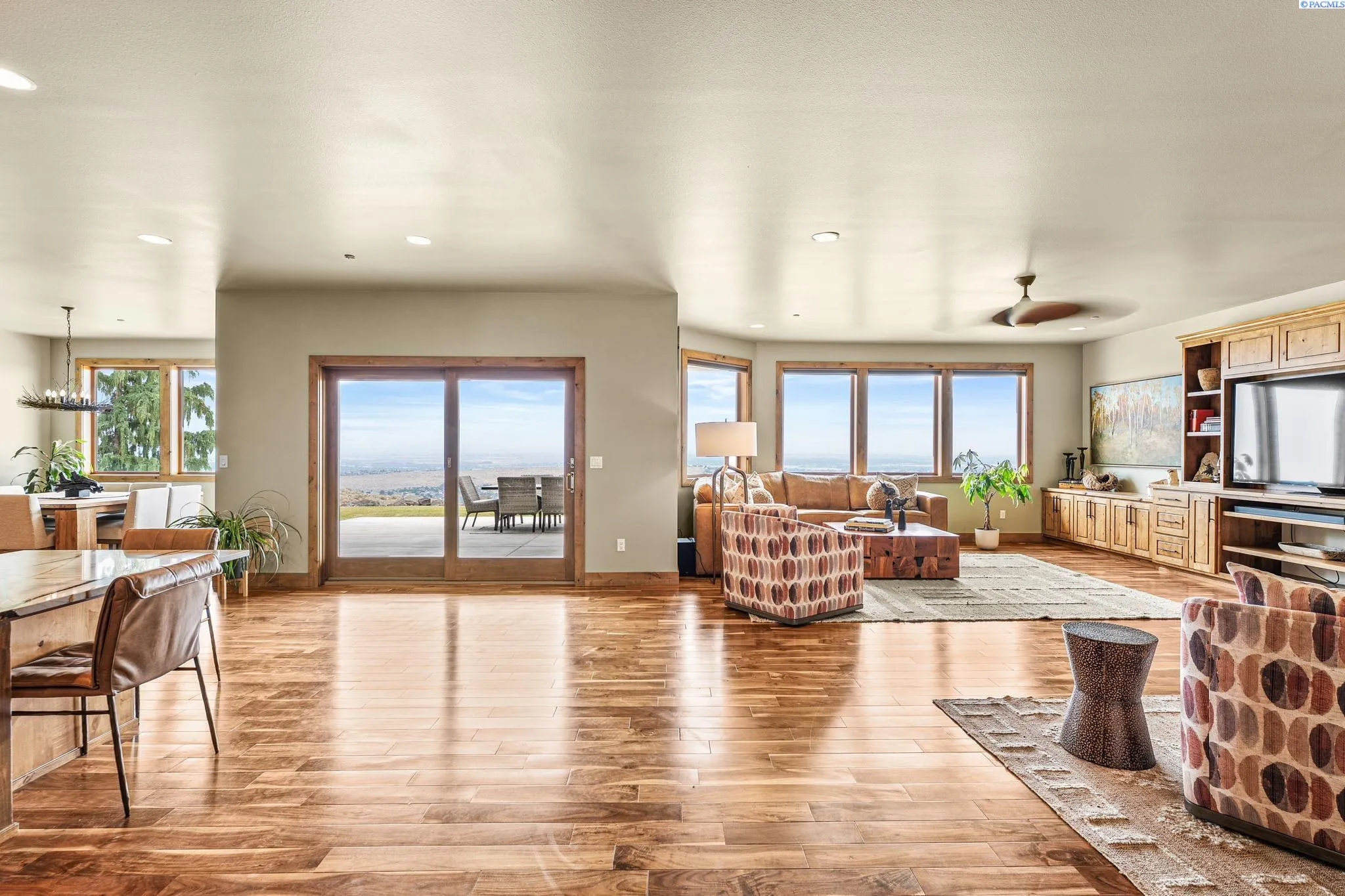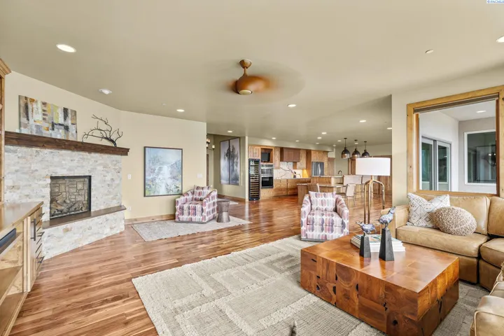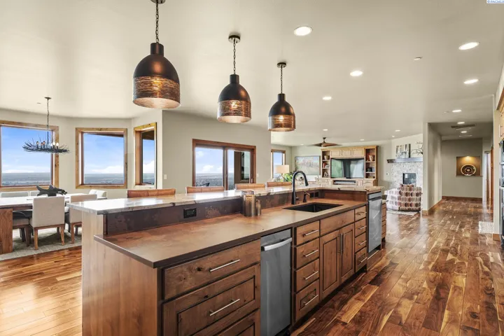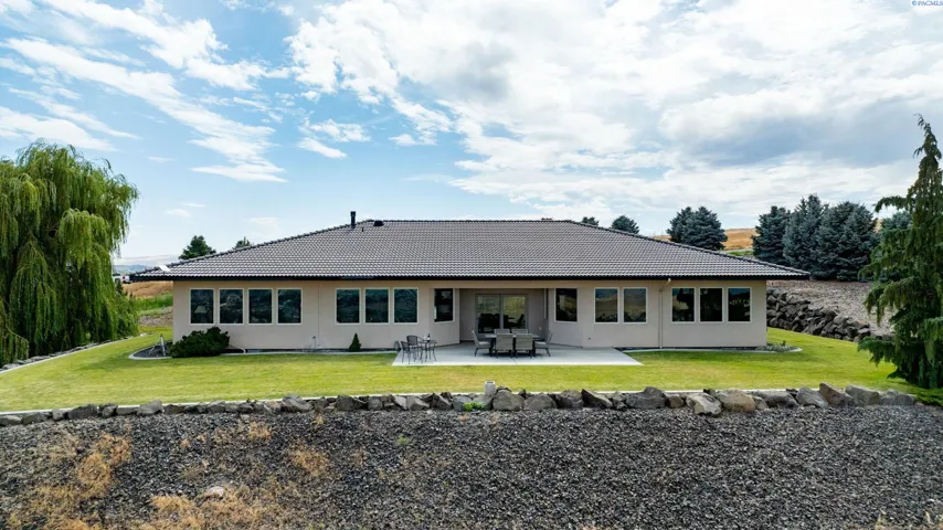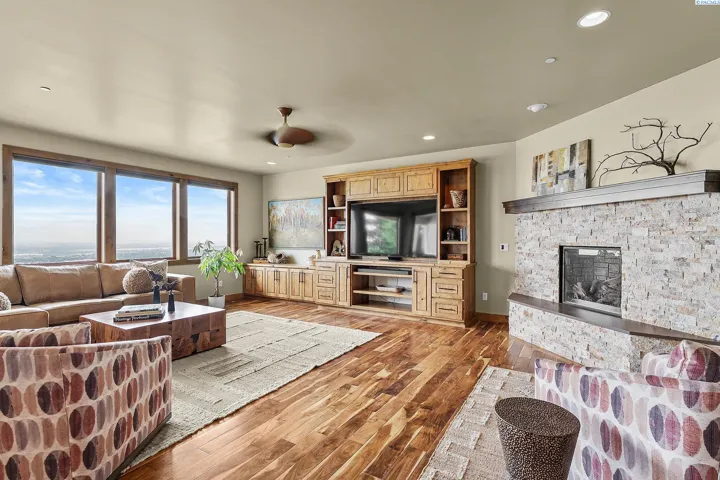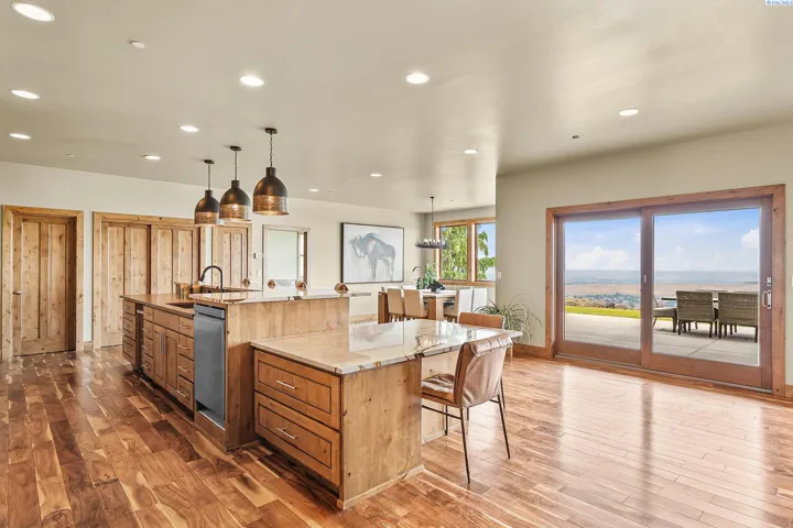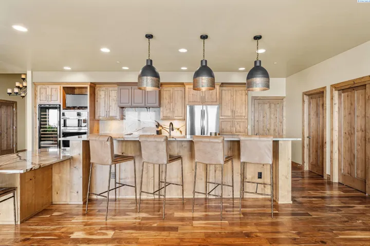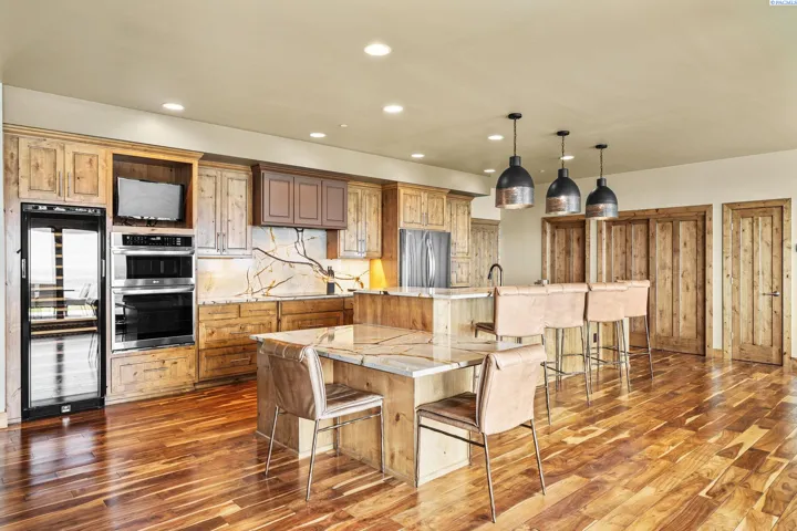 MLS# 286198 Welcome to 1232 N Bermuda Rd in Richland. This private hilltop property combines Tri-Cities views, rustic luxury, and refined living in one of the area’s most coveted locations. From the moment you arrive, you’re welcomed by beautifully landscaped grounds, stone accents, and an inviting covered front porch that sets the tone for what’s to come. Situated on five expansive acres, this stunning home offers views that stretch for miles—an exceptional setting for those seeking both space and scenery. Step inside and be instantly captivated by the living room’s expansive windows that perfectly frame the sweeping skyline. Raised ceilings, rich wood-wrapped windows, and warm knotty wood accents create a sense of rustic elegance throughout. A cozy fireplace anchors the space, flanked by a custom built-in entertainment center with abundant cabinetry—offering both functionality and style. The kitchen is truly the heart of the home—thoughtfully designed for everyday living and effortless entertaining. Featuring an oversized island with an extended breakfast bar that comfortably seats six, a built-in wine fridge, built-in microwave and wall oven, and ample custom cabinetry. The dining room, bathed in natural light from a wall of windows, showcase the home’s elevated setting. A sliding glass door leads to the covered patio, creating seamless indoor-outdoor flow for hosting guests. The spacious laundry room is both practical and stylish, complete with a washer and dryer, utility sink, and extensive cabinetry for storage and organization. Near the laundry room is another secondary bedroom and full guest bath. The primary suite enjoys its own a serene retreat featuring a full wall of windows that bring the outdoors in. The spa-inspired en-suite bath includes a large walk-in shower, an expansive wall mirror with transom windows above, and a generously sized walk-in closet. Step outside to discover a true extension of the home’s luxury—an expansive covered patio surrounded by five acres of pristine grounds. A spacious three-car garage completes this remarkable property, offering ample room for vehicles and storage. Whether you’re hosting sunset dinners or simply taking in the views, the skyline vistas and outdoor living experience is unmatched.