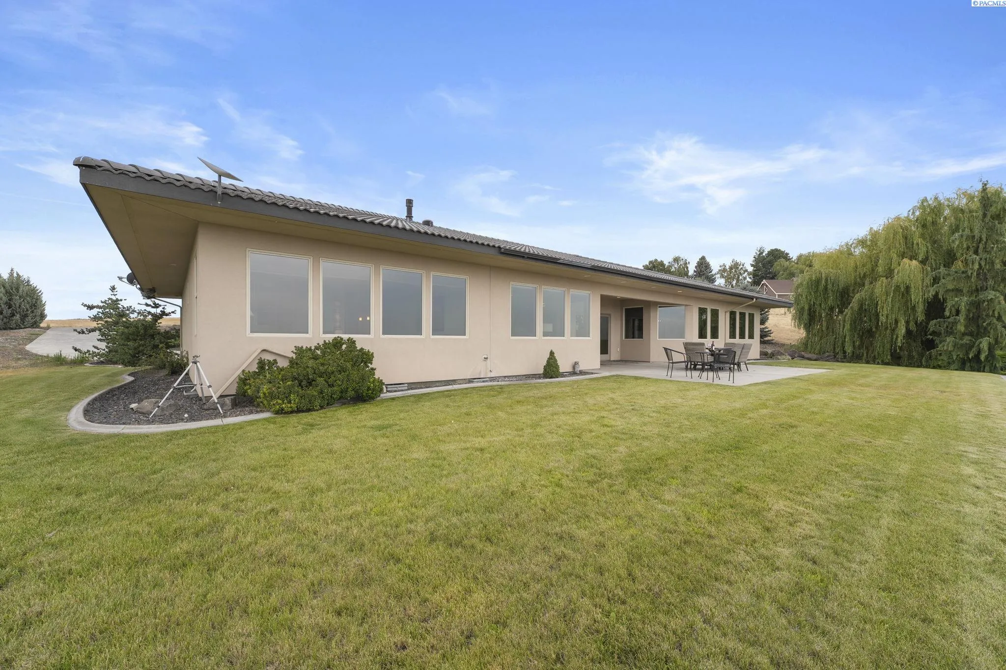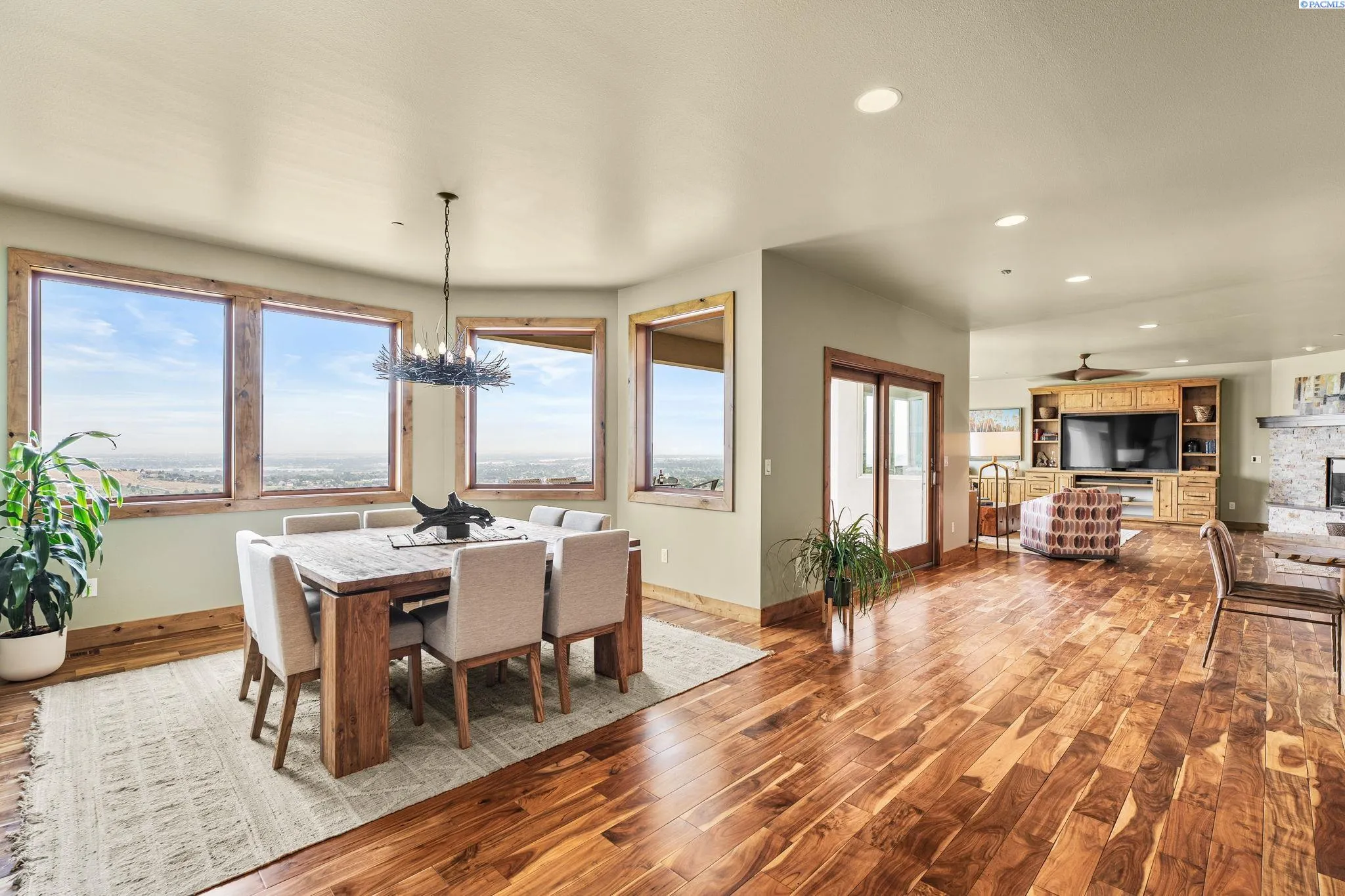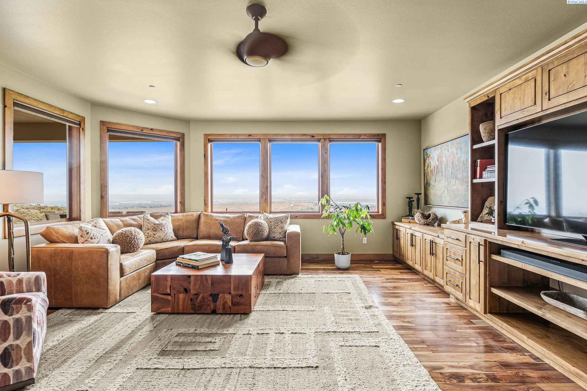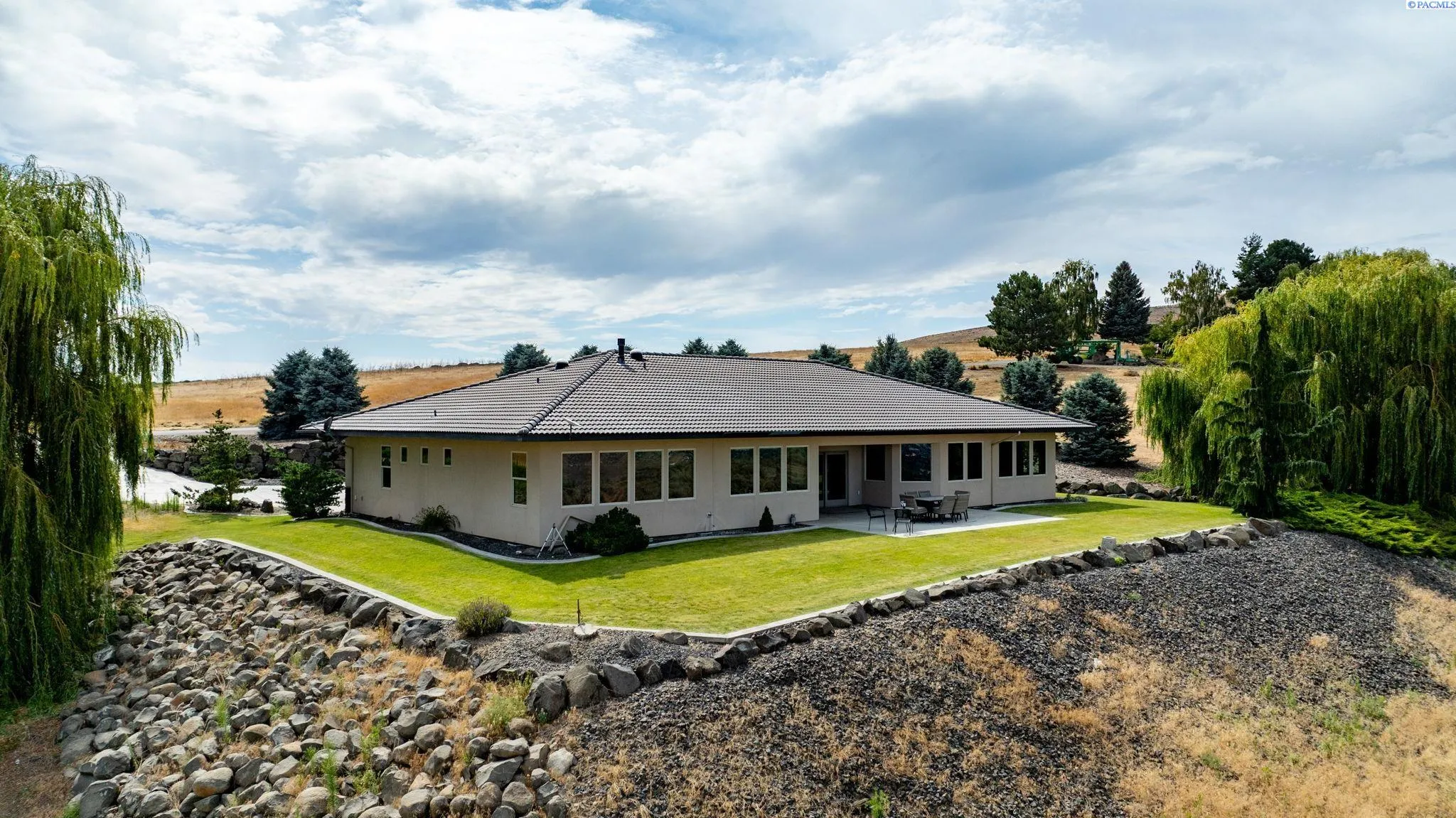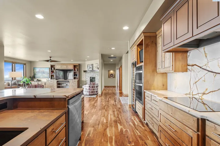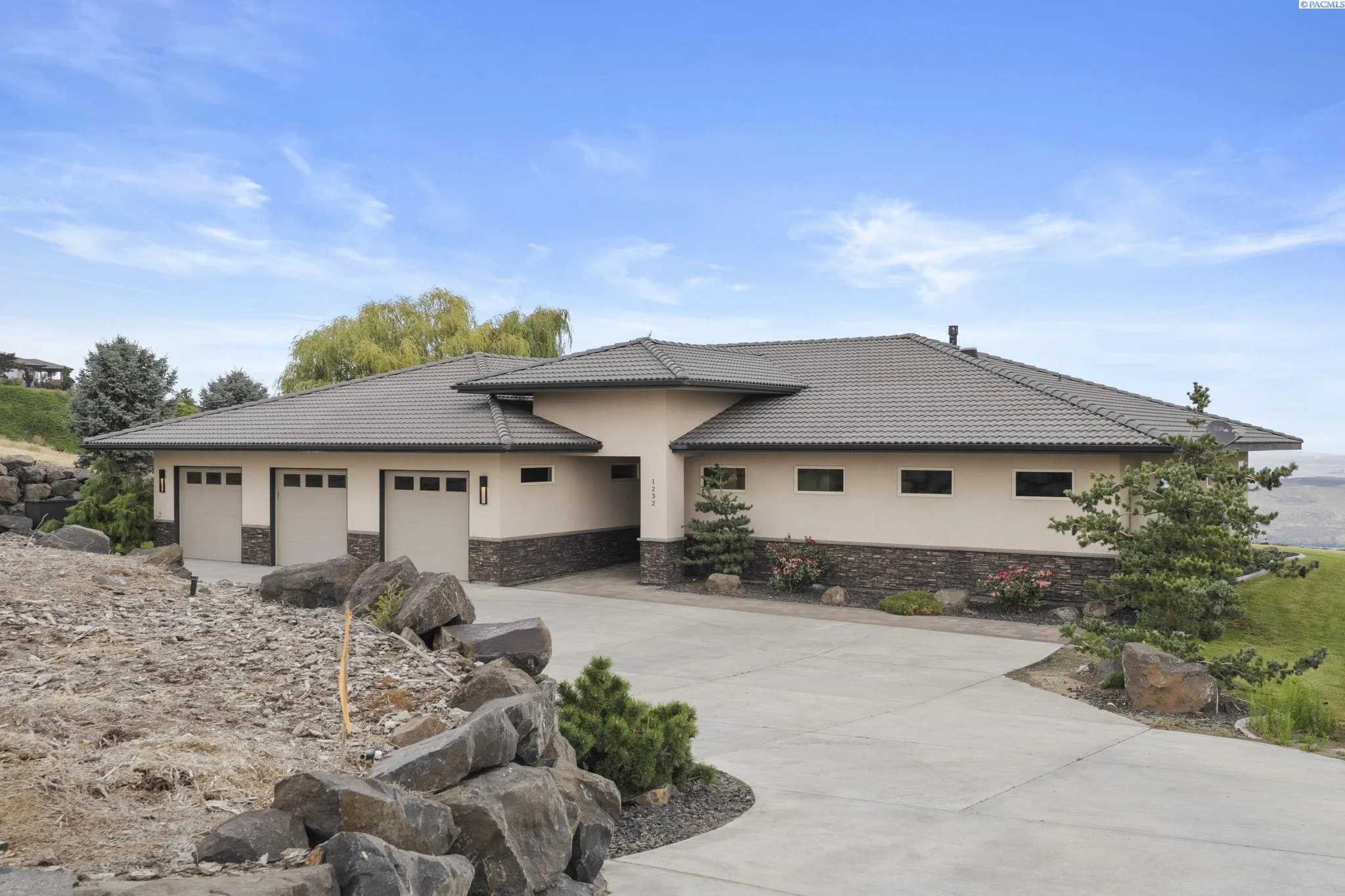 MLS# 286198 Welcome to 1232 N Bermuda Rd in Richland. This private hilltop property combines Tri-Cities views, rustic luxury, and refined living in one of the area’s most coveted locations. From the moment you arrive, you’re welcomed by beautifully landscaped grounds, stone accents, and an inviting covered front porch that sets the tone for what’s to come. Situated on five expansive acres, this stunning home offers views that stretch for miles—an exceptional setting for those seeking both space and scenery. Step inside and be instantly captivated by the living room’s expansive windows that perfectly frame the sweeping skyline. Raised ceilings, rich wood-wrapped windows, and warm knotty wood accents create a sense of rustic elegance throughout. A cozy fireplace anchors the space, flanked by a custom built-in entertainment center with abundant cabinetry—offering both functionality and style. The kitchen is truly the heart of the home—thoughtfully designed for everyday living and effortless entertaining. Featuring an oversized island with an extended breakfast bar that comfortably seats six, a built-in wine fridge, built-in microwave and wall oven, and ample custom cabinetry. The dining room, bathed in natural light from a wall of windows, showcase the home’s elevated setting. A sliding glass door leads to the covered patio, creating seamless indoor-outdoor flow for hosting guests. The spacious laundry room is both practical and stylish, complete with a washer and dryer, utility sink, and extensive cabinetry for storage and organization. Near the laundry room is another secondary bedroom and full guest bath. The primary suite enjoys its own a serene retreat featuring a full wall of windows that bring the outdoors in. The spa-inspired en-suite bath includes a large walk-in shower, an expansive wall mirror with transom windows above, and a generously sized walk-in closet. Step outside to discover a true extension of the home’s luxury—an expansive covered patio surrounded by five acres of pristine grounds. A spacious three-car garage completes this remarkable property, offering ample room for vehicles and storage. Whether you’re hosting sunset dinners or simply taking in the views, the skyline vistas and outdoor living experience is unmatched.