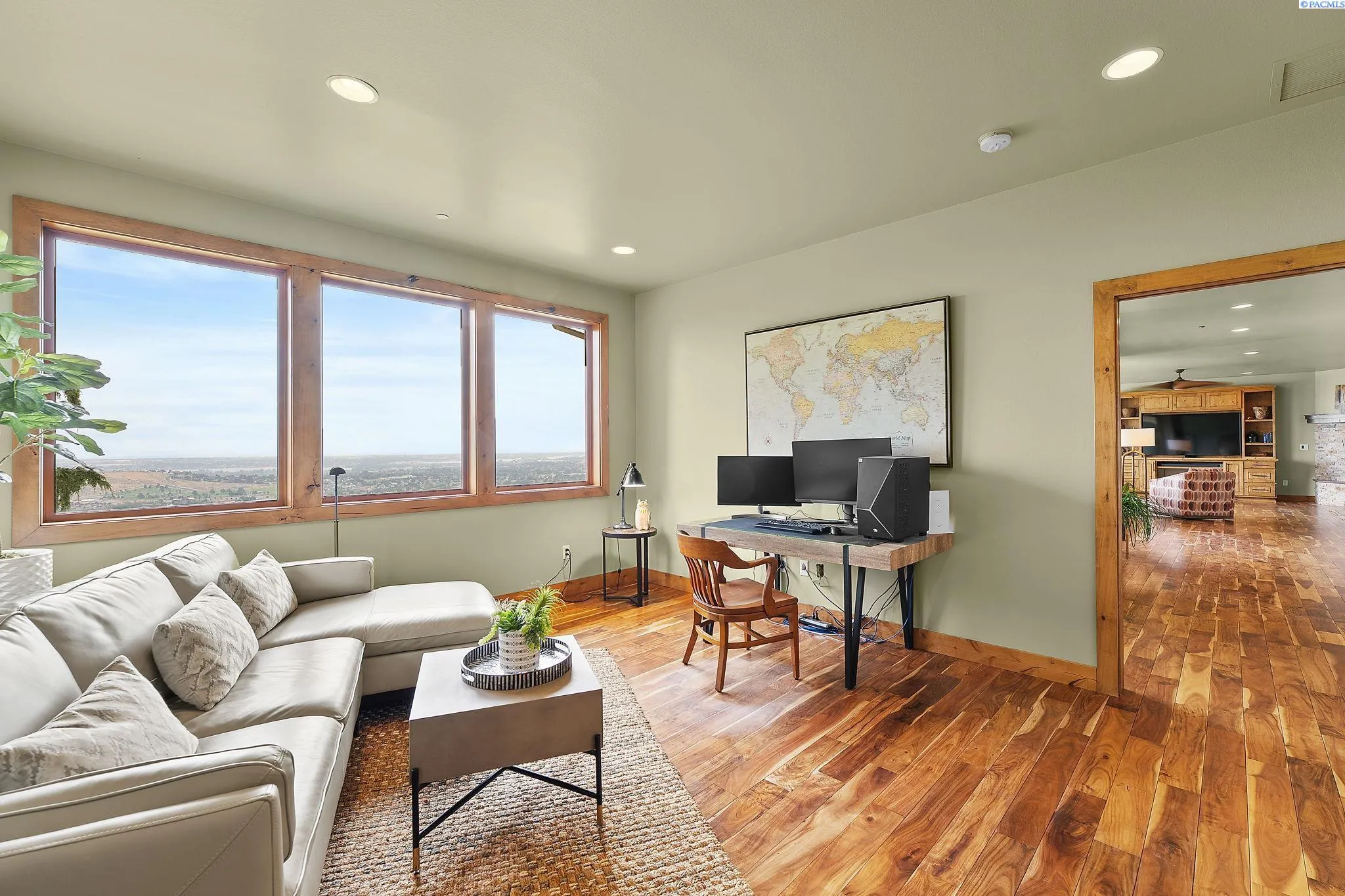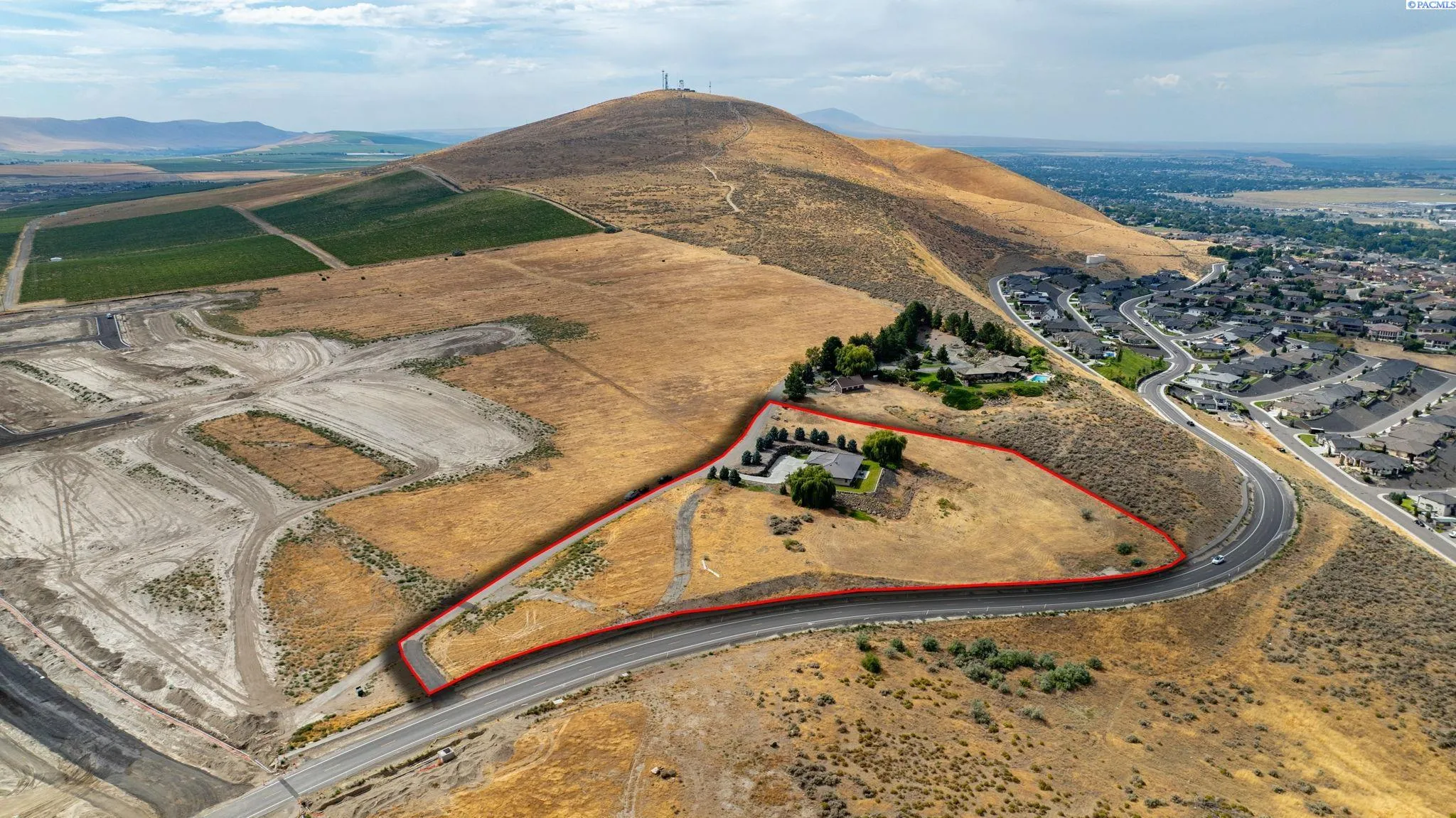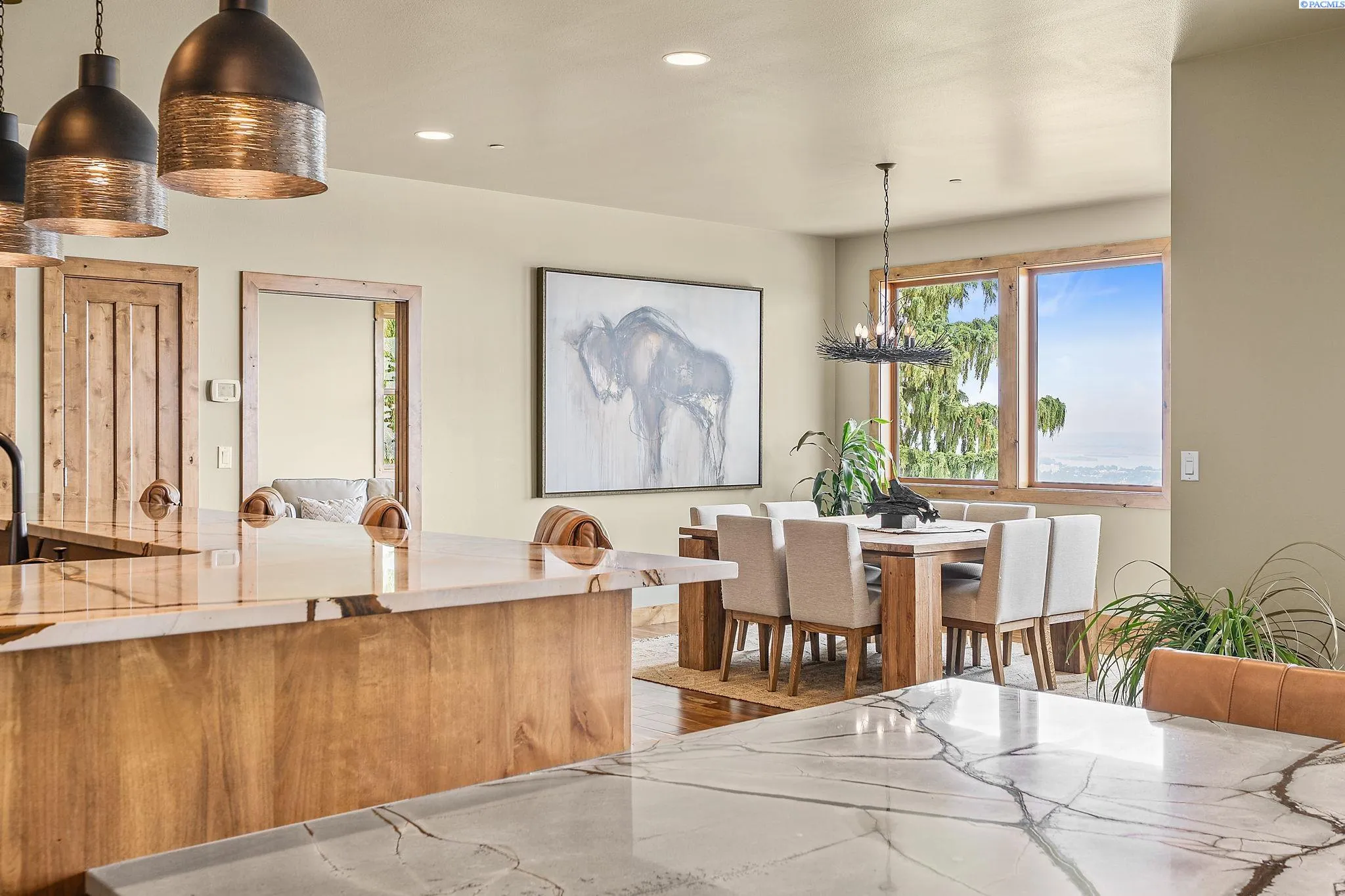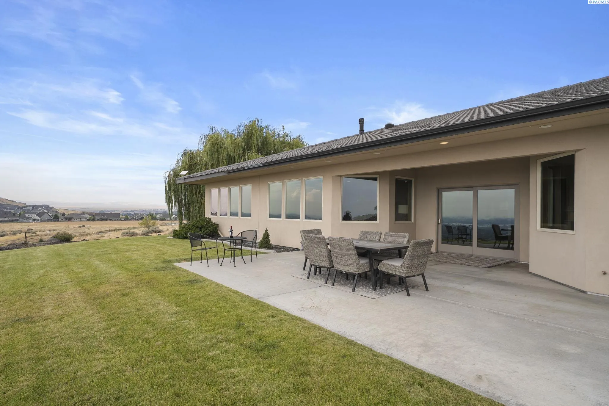 MLS# 286198 Welcome to 1232 N Bermuda Rd in Richland. This private hilltop property combines Tri-Cities views, rustic luxury, and refined living in one of the area’s most coveted locations. From the moment you arrive, you’re welcomed by beautifully landscaped grounds, stone accents, and an inviting covered front porch that sets the tone for what’s to come. Situated on five expansive acres, this stunning home offers views that stretch for miles—an exceptional setting for those seeking both space and scenery. Step inside and be instantly captivated by the living room’s expansive windows that perfectly frame the sweeping skyline. Raised ceilings, rich wood-wrapped windows, and warm knotty wood accents create a sense of rustic elegance throughout. A cozy fireplace anchors the space, flanked by a custom built-in entertainment center with abundant cabinetry—offering both functionality and style. The kitchen is truly the heart of the home—thoughtfully designed for everyday living and effortless entertaining. Featuring an oversized island with an extended breakfast bar that comfortably seats six, a built-in wine fridge, built-in microwave and wall oven, and ample custom cabinetry. The dining room, bathed in natural light from a wall of windows, showcase the home’s elevated setting. A sliding glass door leads to the covered patio, creating seamless indoor-outdoor flow for hosting guests. The spacious laundry room is both practical and stylish, complete with a washer and dryer, utility sink, and extensive cabinetry for storage and organization. Near the laundry room is another secondary bedroom and full guest bath. The primary suite enjoys its own a serene retreat featuring a full wall of windows that bring the outdoors in. The spa-inspired en-suite bath includes a large walk-in shower, an expansive wall mirror with transom windows above, and a generously sized walk-in closet. Step outside to discover a true extension of the home’s luxury—an expansive covered patio surrounded by five acres of pristine grounds. A spacious three-car garage completes this remarkable property, offering ample room for vehicles and storage. Whether you’re hosting sunset dinners or simply taking in the views, the skyline vistas and outdoor living experience is unmatched.