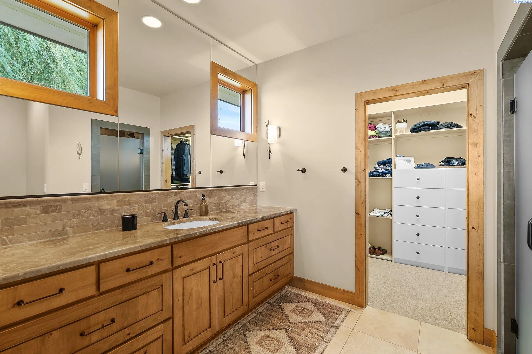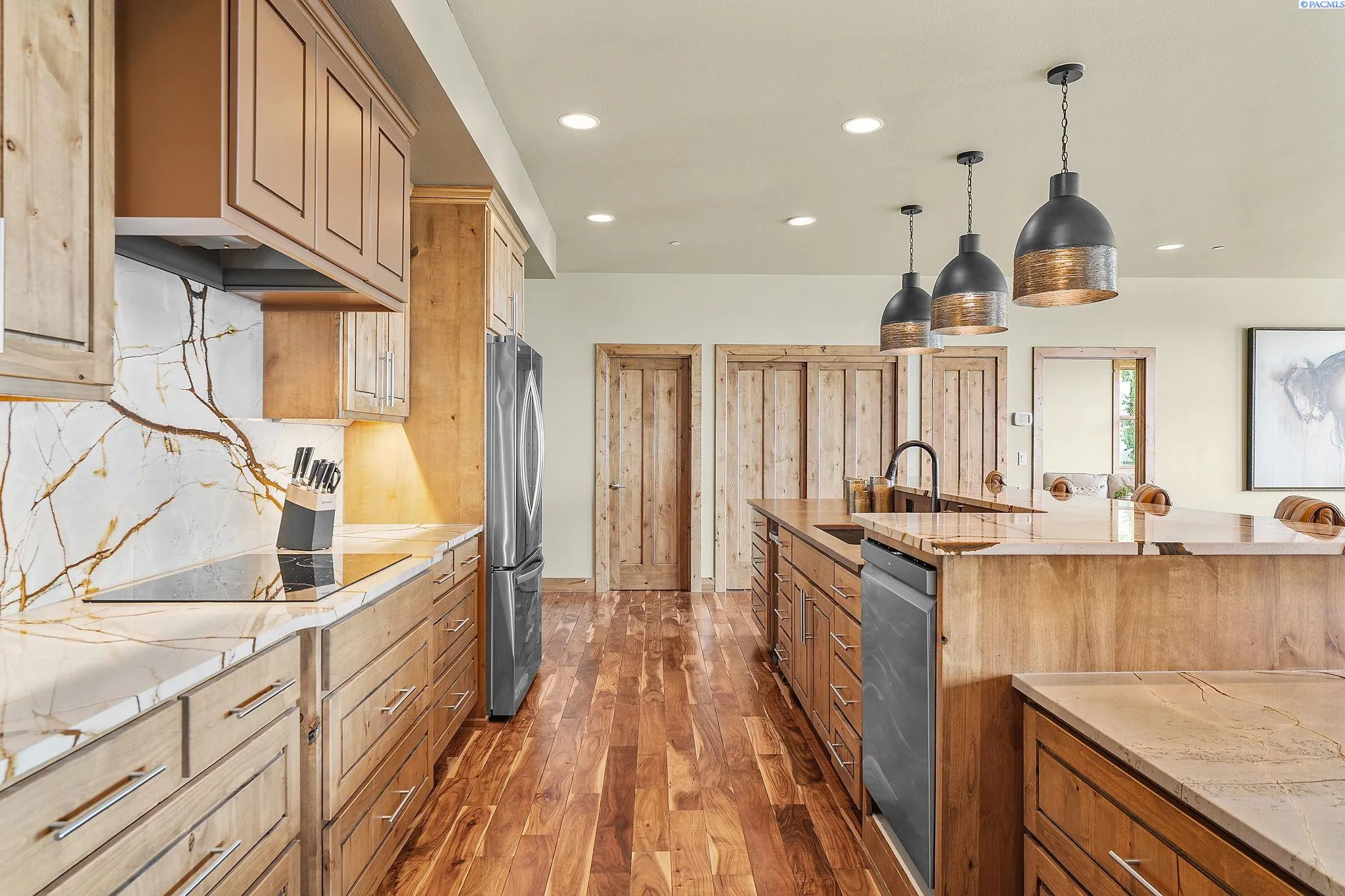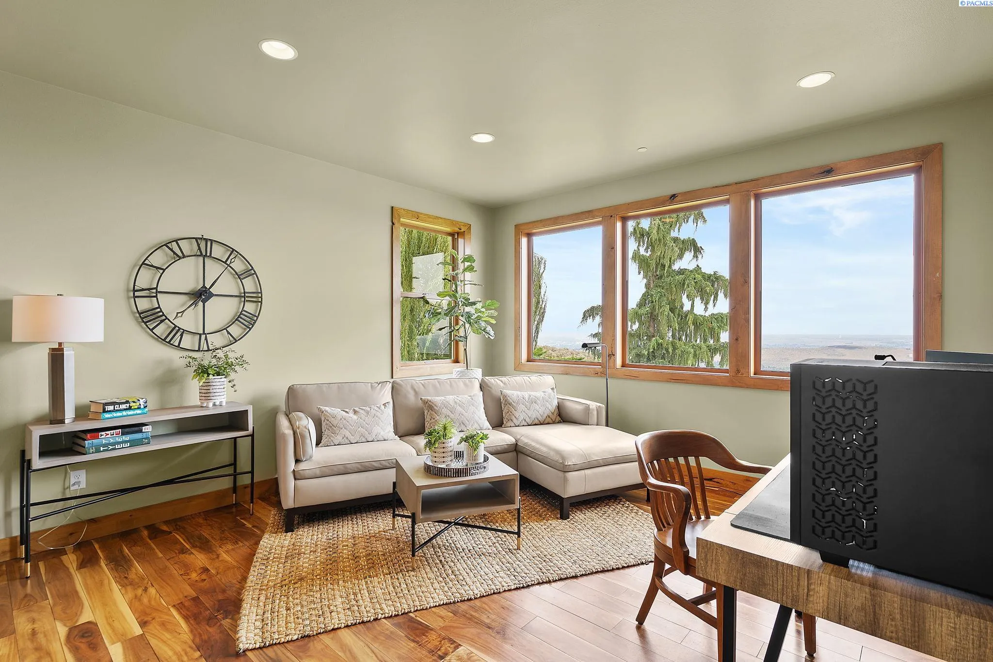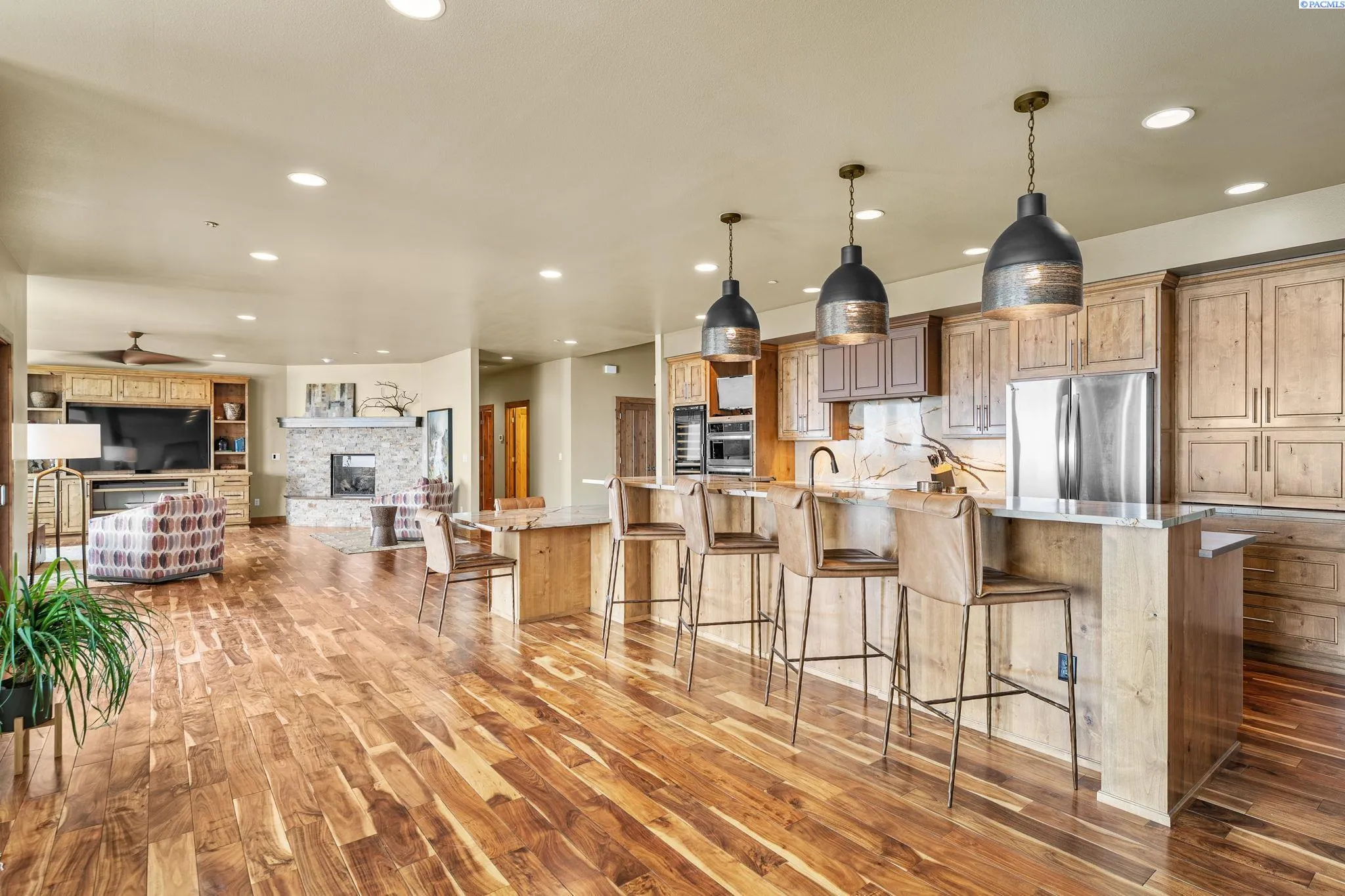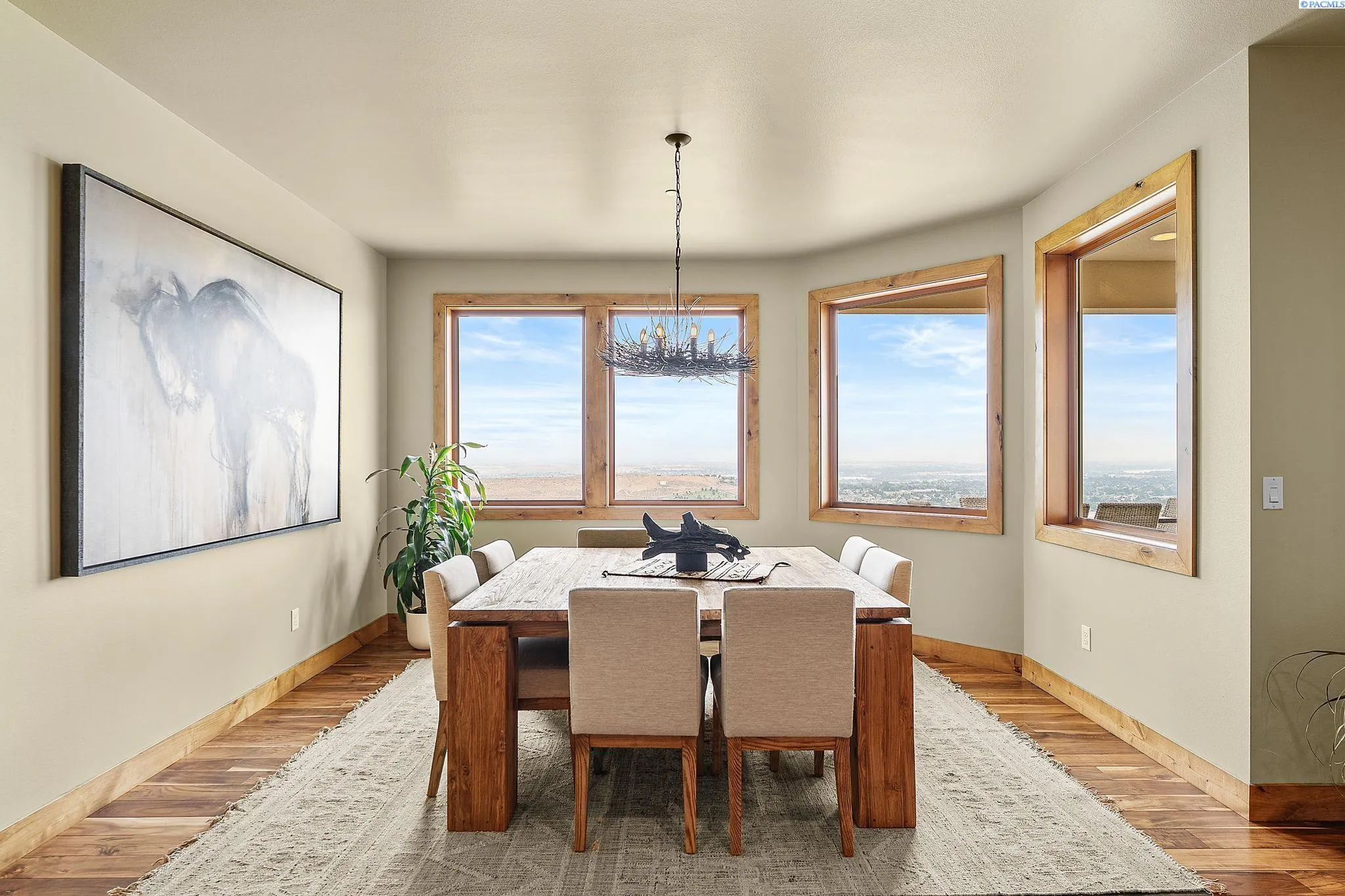 MLS# 286198 Welcome to 1232 N Bermuda Rd in Richland. This private hilltop property combines Tri-Cities views, rustic luxury, and refined living in one of the area’s most coveted locations. From the moment you arrive, you’re welcomed by beautifully landscaped grounds, stone accents, and an inviting covered front porch that sets the tone for what’s to come. Situated on five expansive acres, this stunning home offers views that stretch for miles—an exceptional setting for those seeking both space and scenery. Step inside and be instantly captivated by the living room’s expansive windows that perfectly frame the sweeping skyline. Raised ceilings, rich wood-wrapped windows, and warm knotty wood accents create a sense of rustic elegance throughout. A cozy fireplace anchors the space, flanked by a custom built-in entertainment center with abundant cabinetry—offering both functionality and style. The kitchen is truly the heart of the home—thoughtfully designed for everyday living and effortless entertaining. Featuring an oversized island with an extended breakfast bar that comfortably seats six, a built-in wine fridge, built-in microwave and wall oven, and ample custom cabinetry. The dining room, bathed in natural light from a wall of windows, showcase the home’s elevated setting. A sliding glass door leads to the covered patio, creating seamless indoor-outdoor flow for hosting guests. The spacious laundry room is both practical and stylish, complete with a washer and dryer, utility sink, and extensive cabinetry for storage and organization. Near the laundry room is another secondary bedroom and full guest bath. The primary suite enjoys its own a serene retreat featuring a full wall of windows that bring the outdoors in. The spa-inspired en-suite bath includes a large walk-in shower, an expansive wall mirror with transom windows above, and a generously sized walk-in closet. Step outside to discover a true extension of the home’s luxury—an expansive covered patio surrounded by five acres of pristine grounds. A spacious three-car garage completes this remarkable property, offering ample room for vehicles and storage. Whether you’re hosting sunset dinners or simply taking in the views, the skyline vistas and outdoor living experience is unmatched.