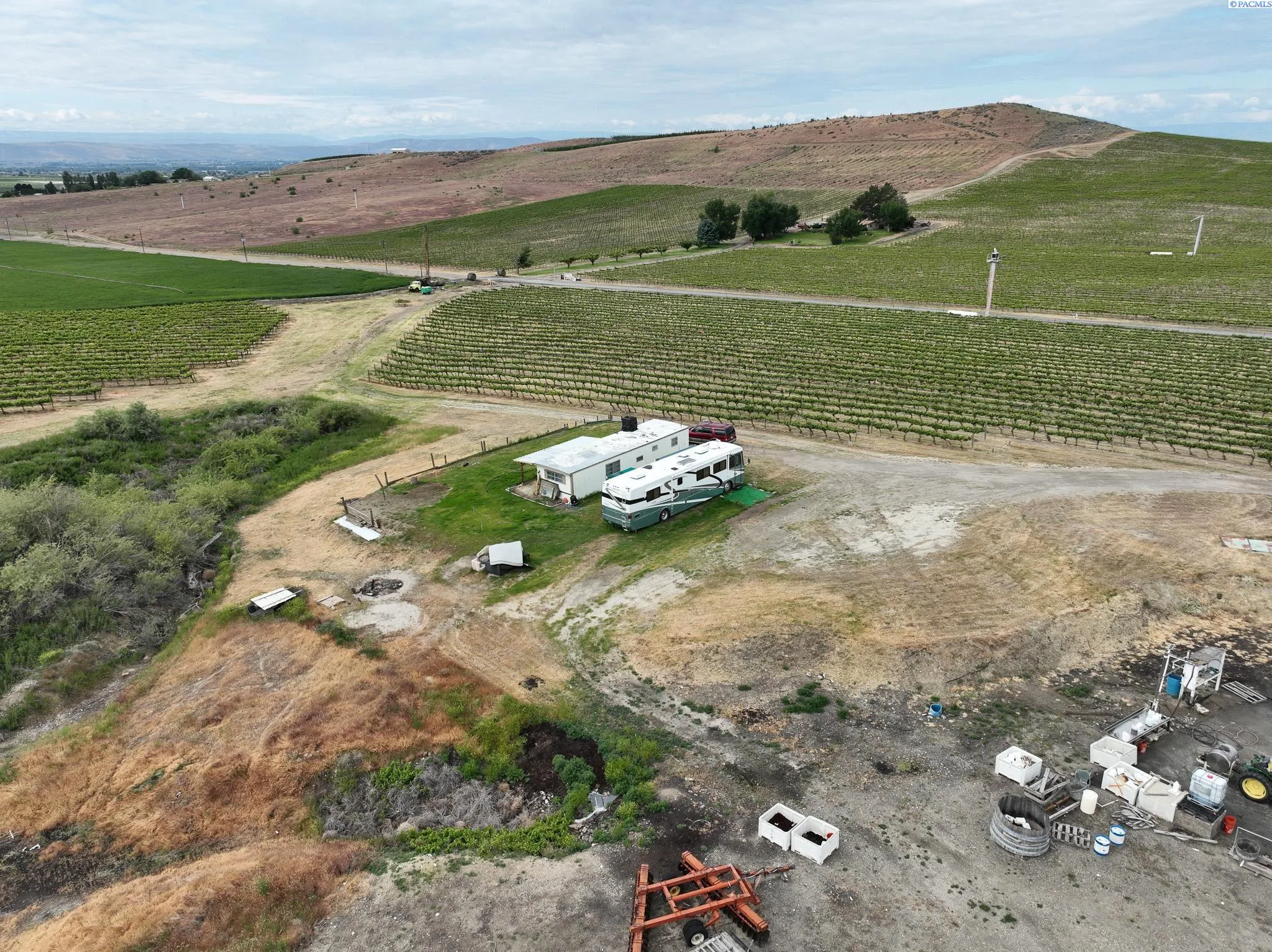 MLS# 288241 LUXURY PROPERTY AUCTION: 20–31 March.Accepting starting bids through 19 March.Starting bids expected between $875K–$1.375M.Earn an incentive by 19 March.An expansive wine country holding unfolds across 664.39± deeded acres in the rolling landscape of Zillah, bordering the open dryland hills of the Rattlesnake Hills for panoramic vistas and remarkable privacy. This producing vineyard is supported by a diverse varietal mix under drip irrigation, established water rights, two irrigation ponds, four drilled wells, and approximately two hundred fifty acres of well water drawn from the Wanapum Aquifer. Operational infrastructure includes one versatile shop for equipment and storage and an 8,000 square foot manufacturing building, currently licensed as a winery and a distillery, along with two manufactured residences offering on-site living or rental flexibility. The secluded setting enhances agricultural integrity and peace of mind, while scale and proven farming performance position the property for expanded acreage, estate fruit production, or the launch of a distinguished private label within the acclaimed Yakima Valley.