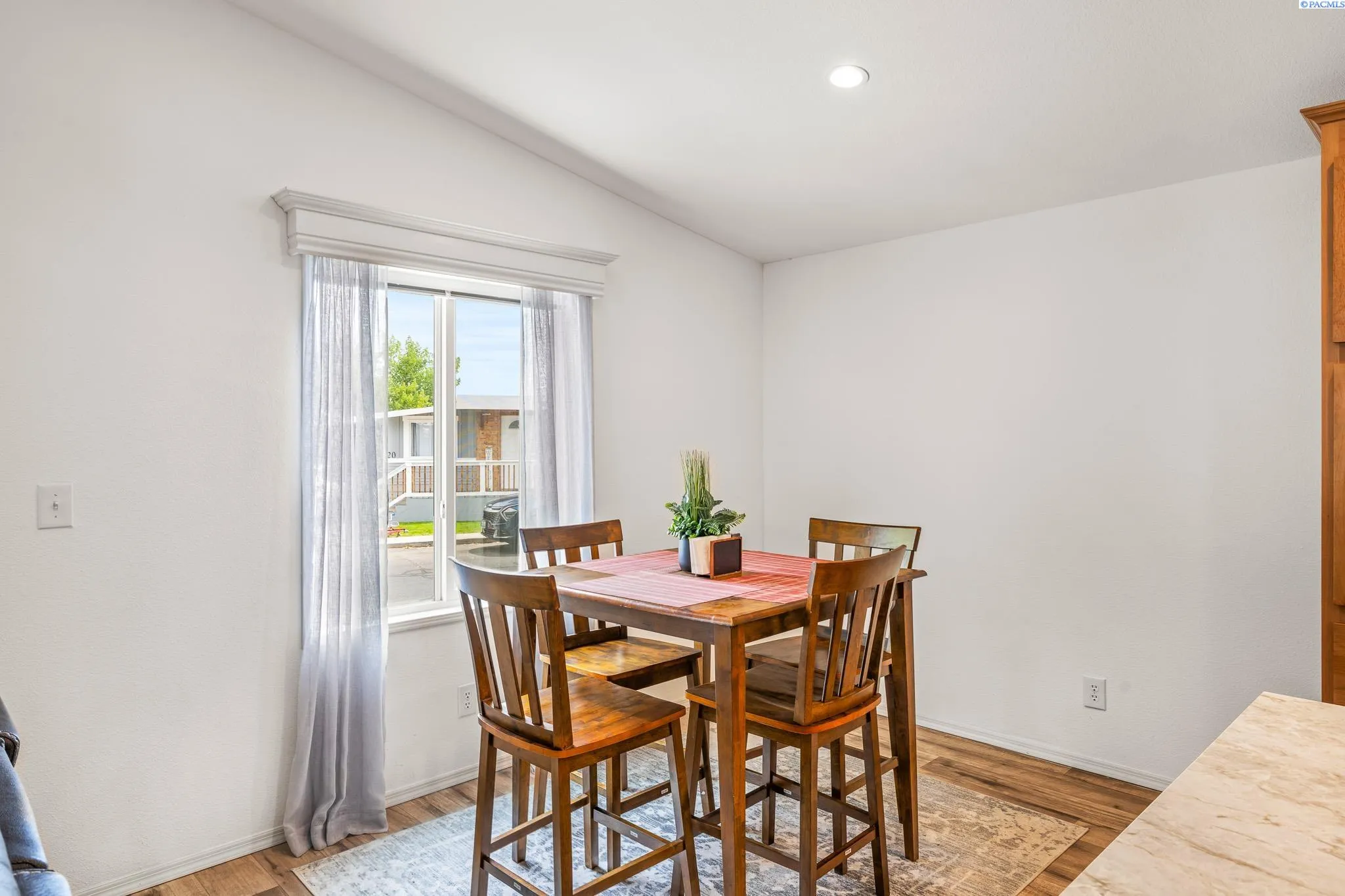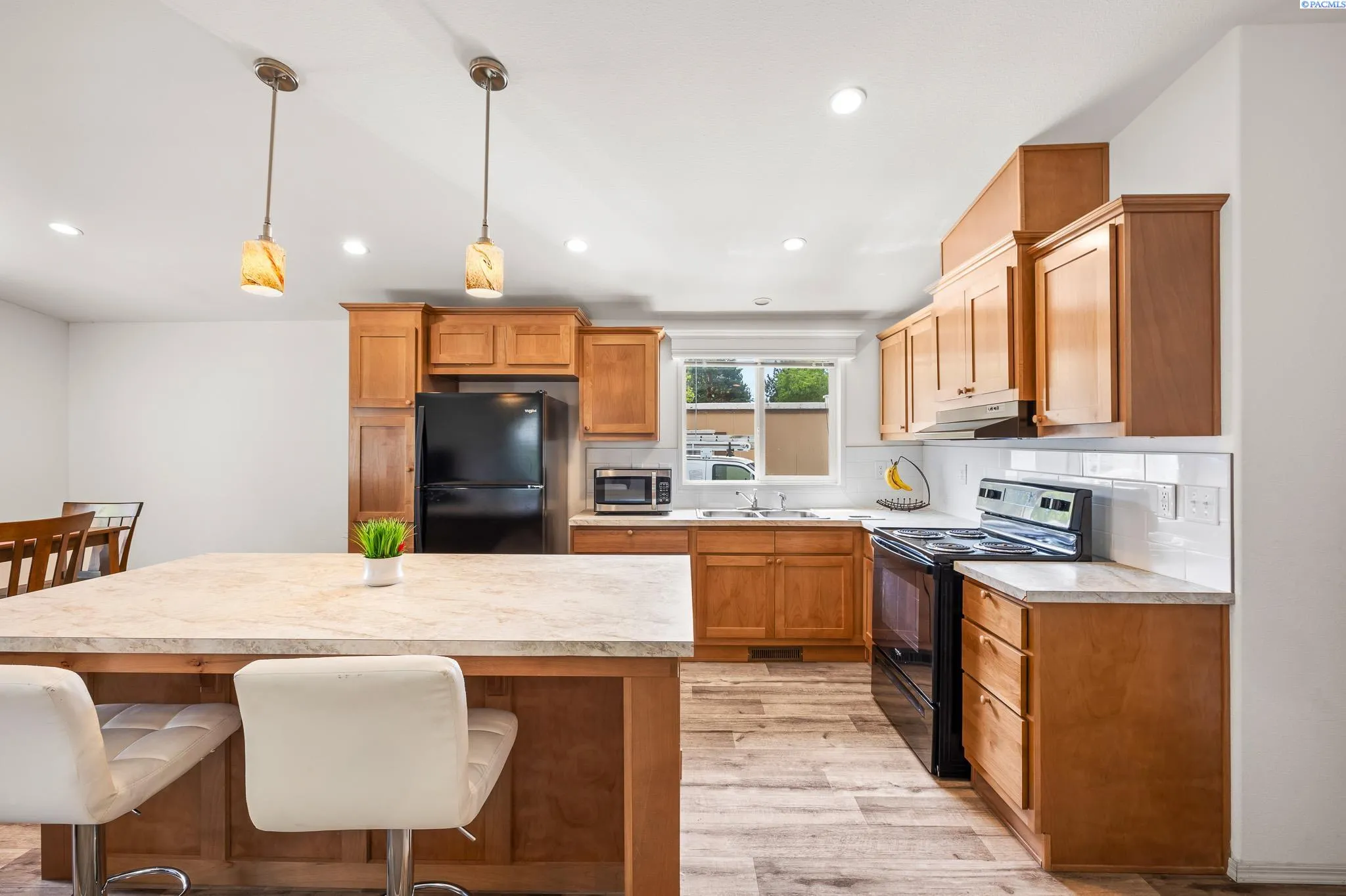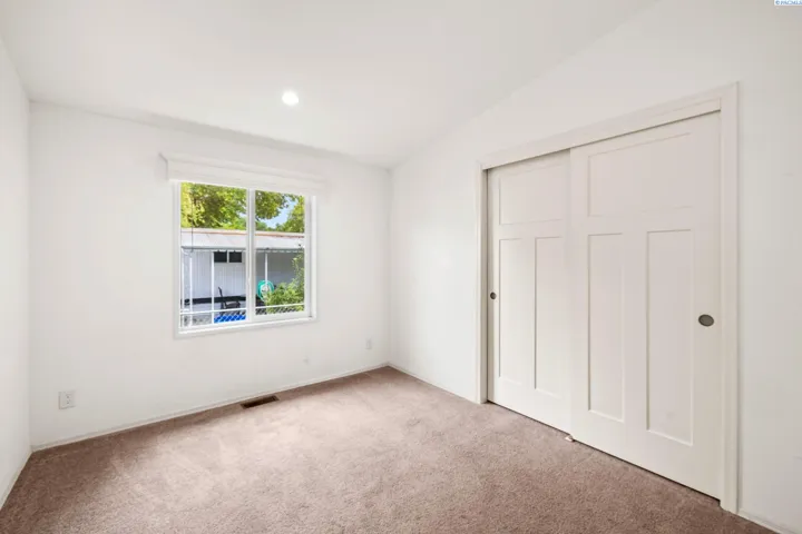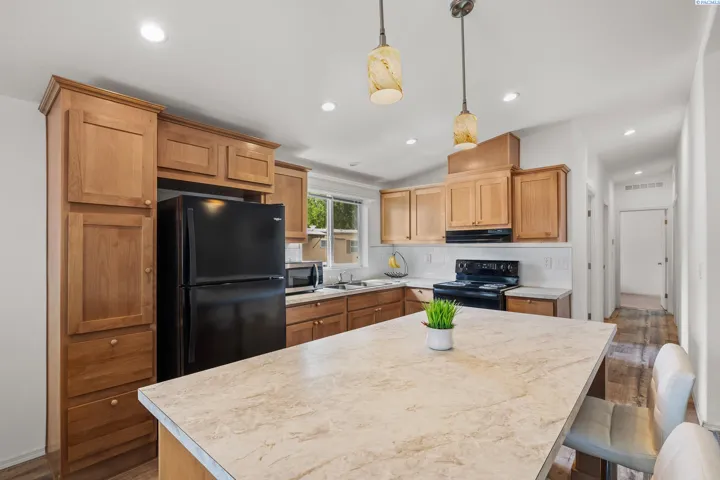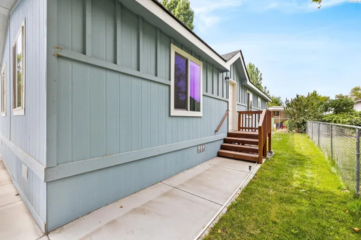 MLS# 286374 Welcome to 21 Nuclear Ln in Richland, WA! Built in 2021, this newer double-wide manufactured home offers comfortable, modern living on a rented lot in a highly convenient Richland location. Just minutes from Lynnwood Park, the Columbia River, and with quick access to the highway, this home is an excellent choice, especially for Hanford workers seeking an easy commute.Inside, you’ll find an open-concept floor plan with vaulted ceilings and a ceiling fan, creating a spacious and welcoming atmosphere. The kitchen is a standout feature, boasting a center island with barstool seating, recessed and pendant lighting, and a practical layout ideal for cooking and entertaining. The fully fenced yard offers a safe and private outdoor space that’s perfect for watching kids or pets play. The interior features a combination of laminate and carpet flooring for both durability and comfort. There are three bedrooms, one full bathroom, and a ¾ ensuite bathroom in the primary suite, complete with a convenient sit-down shower. A separate utility room adds functionality with extra storage and laundry space. The range and refrigerator are included, making this home move-in ready. Don’t miss your chance to own a well-maintained, newer home in a quiet and accessible area of Richland. Whether you’re commuting to Hanford or enjoying the nearby parks and river, 21 Nuclear Ln offers excellent value and easy living.