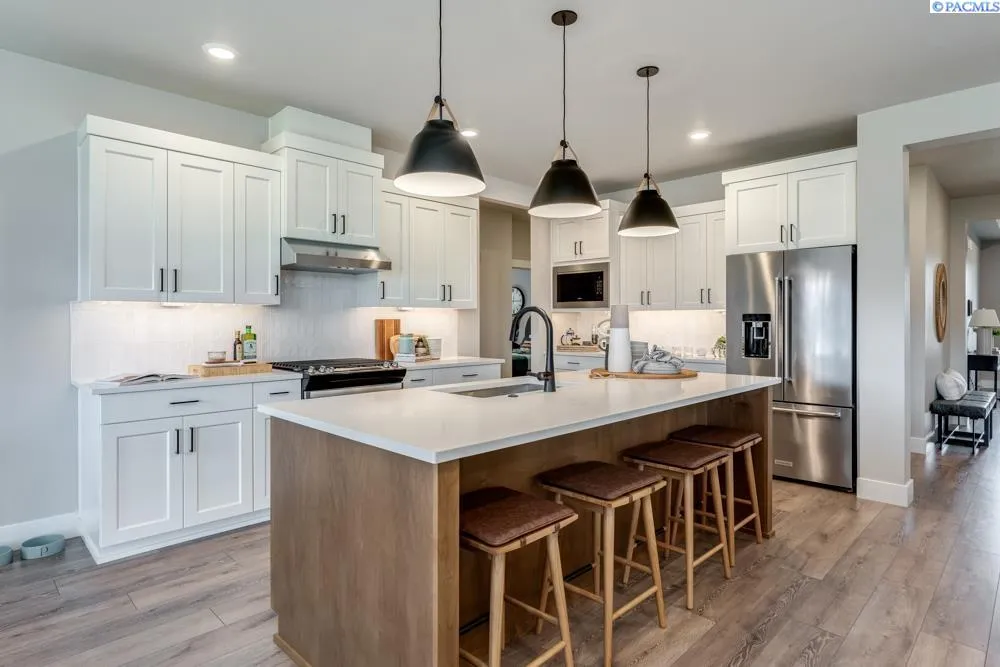 MLS# 290353 Sophisticated Rambler Living in Quail Ridge at Horn RapidsWelcome to Lot 04, Phase 4 in the sought-after Quail Ridge community by Pahlisch Homes, where resort-style amenities—including a pool, clubhouse, and private fitness center—enhance everyday living. This thoughtfully designed Hillmont floor plan offers 4 bedrooms, 2 bathrooms, and a spacious 3-car garage, perfectly blending comfort, functionality, and style.Step inside and experience the signature craftsmanship and attention to detail of this award-winning builder. The heart of the home is the gourmet kitchen, featuring stainless steel appliances, quartz slab countertops, an oversized island, custom soft-close cabinetry with hardware, LED under-cabinet lighting, and a walk-in pantry—ideal for both daily living and entertaining.The open-concept great room is filled with natural light and showcases coffered ceilings, expansive windows, and a cozy gas fireplace with built-in floating base cabinets, creating a warm and inviting atmosphere for gatherings or quiet evenings at home.Additional highlights include modern Smart Home features such as a smart thermostat, smart deadbolt, and garage door opener for added convenience. Professionally installed front and rear yard landscaping and full fencing provide immediate curb appeal and true move-in-ready ease.Experience refined rambler living where timeless design meets modern luxury in one of Horn Rapids’ most desirable communities. * Lot 04, Phase 04 of Quail Ridge at Horn Rapids. * Open for tours Friday–Tuesday, Please contact to schedule a private tour. * Photos are of a previously built home and are virtually staged