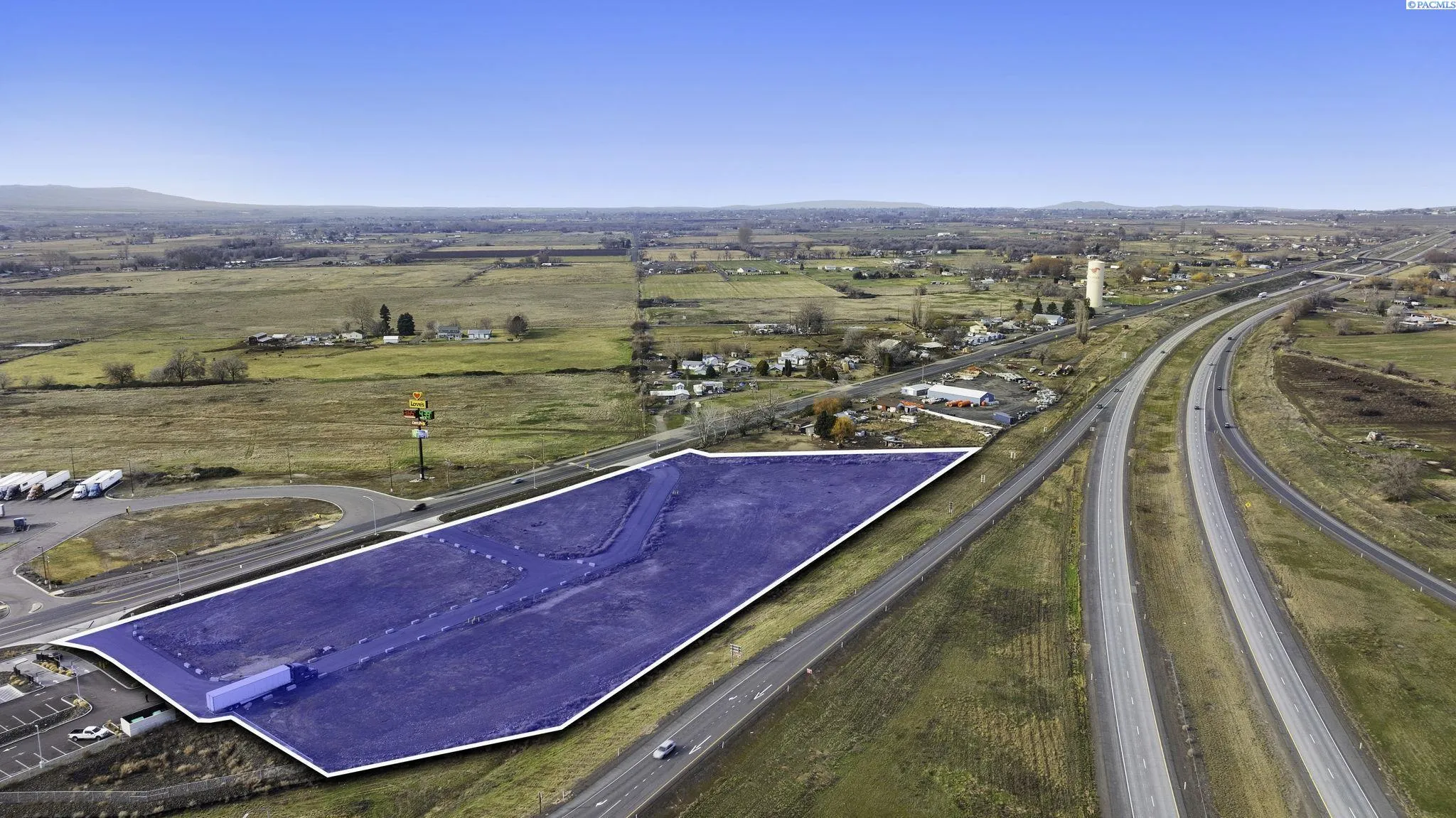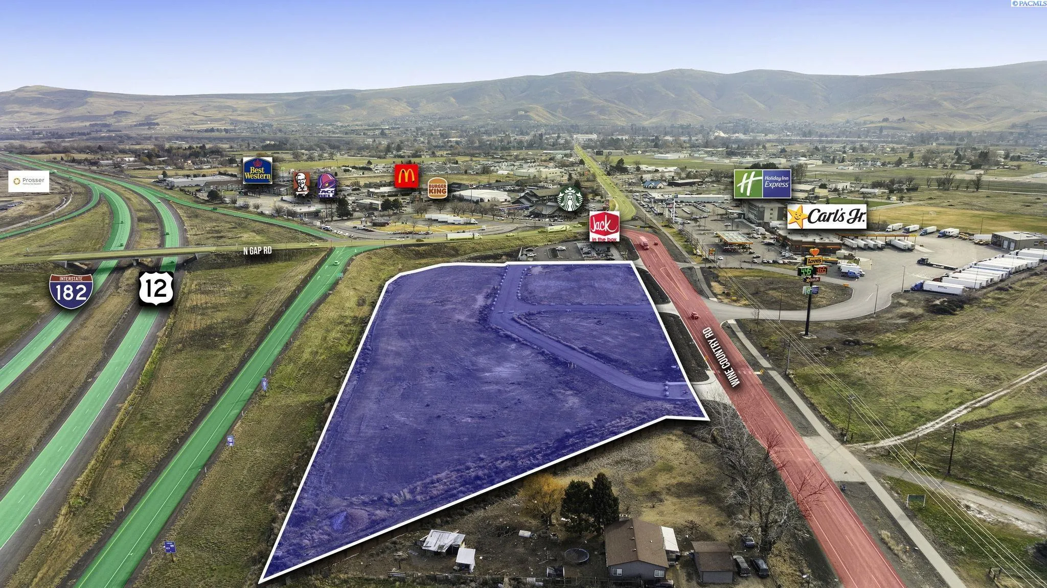 MLS# 281843 This premier parcel of land offers exceptional freeway access, strategically positioned to attract both commuters and travelers. Located at the intersection of Highway 82 and the Gap Road exit, it is in close proximity to key truck stop locations, providing a vital rest point for passing drivers. The surrounding area is home to several well-established establishments, including a Starbucks for convenient coffee breaks, a Jack-in-the-Box for quick meals, and the reputable Love’s Truck Stop, offering essential services for long-distance travelers.Located in the fast-growing town of Prosser, the heart of Washington’s wine country, this property benefits from a dynamic and expanding local economy. Notably, the $125 million Prosser Memorial Hospital, which just opened in February 2025, further underscores the area’s growth and development. This is a binding site plan, and lot lines can be moved to make the lots bigger or smaller depending on the business use, offering a unique opportunity for businesses to invest in this thriving region. With its prime location, proximity to essential services, and a rapidly developing community, this land offers unmatched potential for commercial development.
