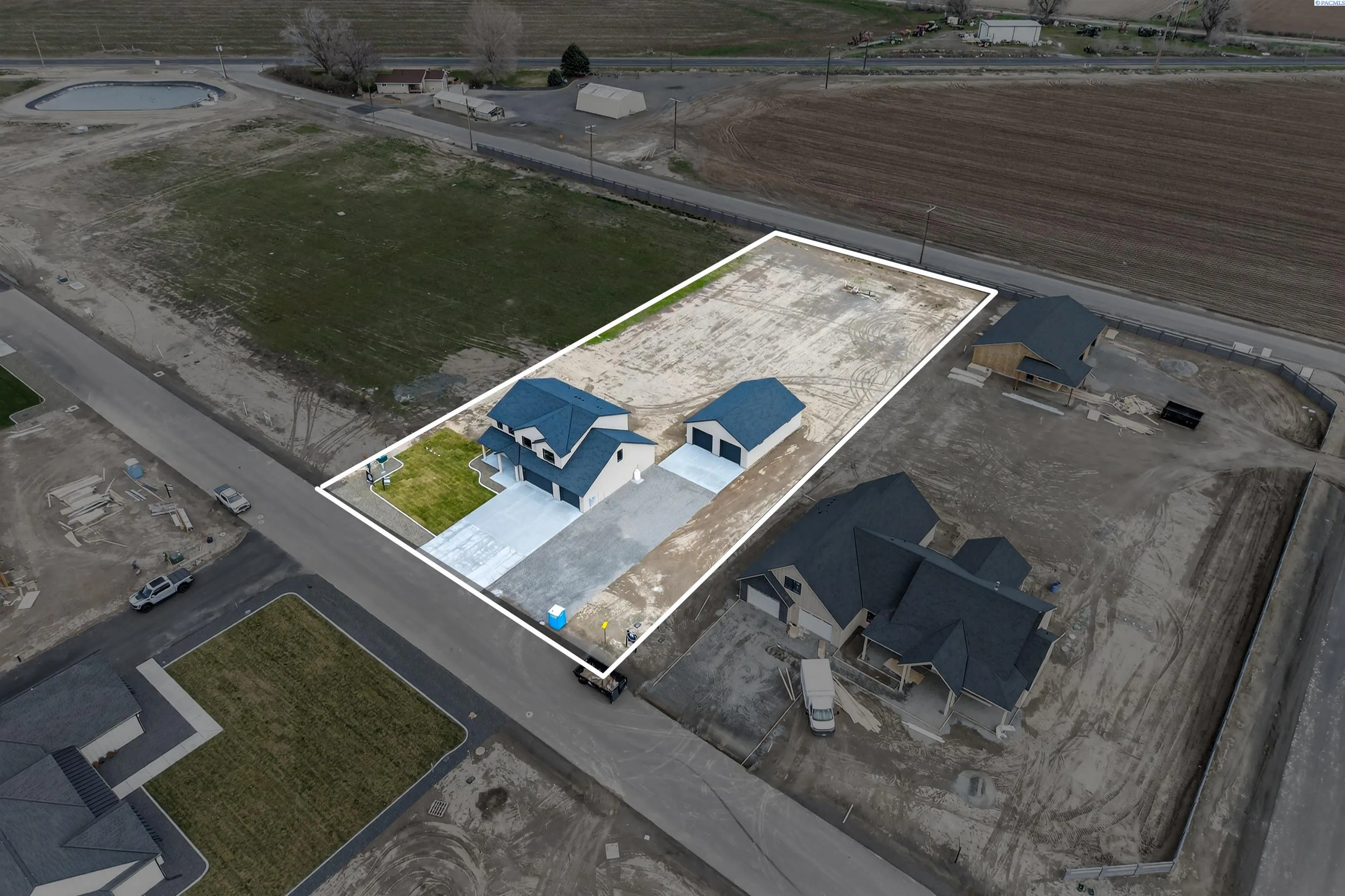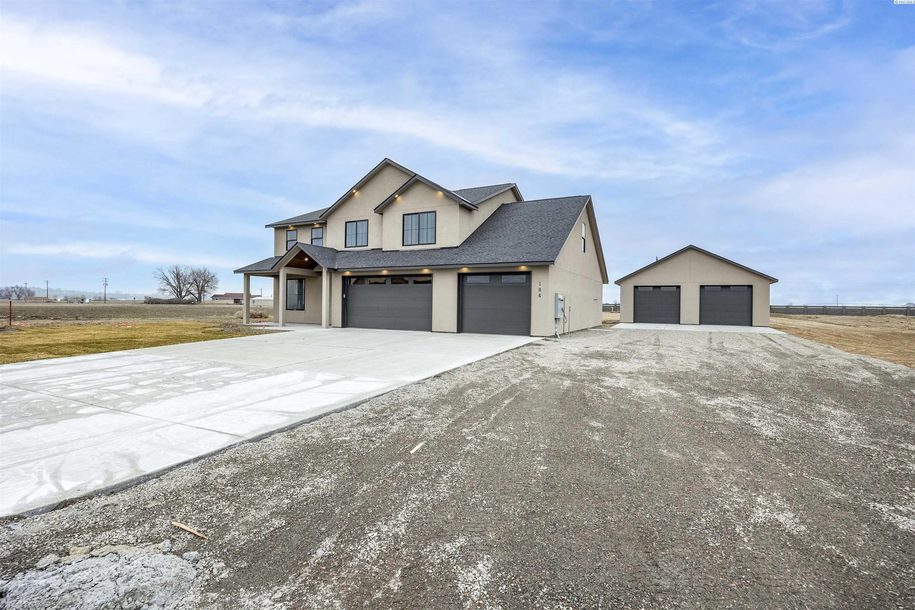 MLS# 290183 Welcome to this stunning new construction home featuring the Duluth floor plan & detached SHOP!. Nestled on 1.02 acres and spanning 2,712 square feet with an impressive 1,090 square foot tandem 3 car garage & detached 30×40 Shop. This 2-story gem offers 4 spacious bedrooms PLUS home office downstairs and a play room upstairs, 2.5 bathrooms, designed for modern living. The heart of the home is the open-concept kitchen, complete with a generous center island, elegant quartz countertops, a stylish tile backsplash, and a large pantry for ample storage. The inviting living and dining areas flow seamlessly, perfect for entertaining or relaxing. Upstairs, the primary suite provides a serene retreat, complemented by 3 additional bedrooms to suit your needs. Enjoy outdoor living in the expansive one acre backyard with a patio area, ideal for gatherings and play. The impressive detached shop (30 x 40 feet) features 10-foot walls, matching stucco exterior, garage bay, & man door for easy access to store vehicles, tools, or a work space. Located in Underwood Estates community in Pasco, this home combines quality craftsmanship with modern convenience!