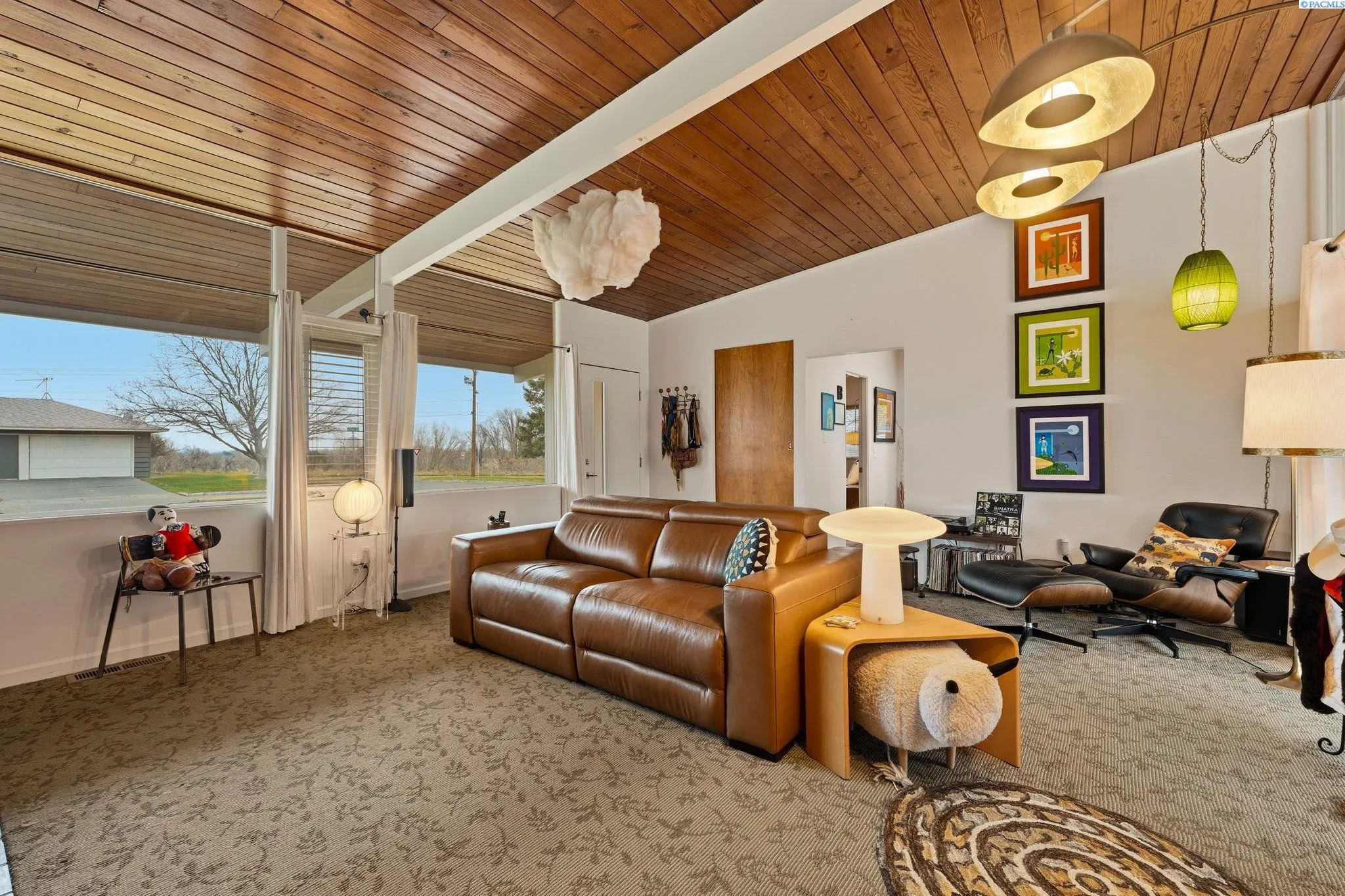 MLS# 290003 Built in 1951 and beautifully preserved, this standout mid-century modern gem delivers clean lines, architectural character, and effortless cool. From the moment you arrive, the flat roofline, crisp white exterior, and bold front doors make a statement that says this is not your average house. Inside, walls of windows flood the home with natural light while warm cedar ceilings, exposed beams, and a striking brick fireplace anchor the open living space. The layout flows seamlessly, balancing vintage charm with modern comfort, perfect for entertaining or simply soaking up the vibe. Thoughtful design details, timeless finishes, and an unmistakable sense of style are found at every turn. Featuring 1,585 sq. ft, 3 bedrooms, 2 bathrooms, and a 2-car garage, this home offers both form and function. The indoor-outdoor connection is on point, with a covered porch and covered patios that are ideal for morning coffee or evening hangs. Set on a clean, low-maintenance lot, that is fully fenced with a fire pit. This is a rare opportunity to own a true architectural classic that still feels fresh. Mid-century lovers, this one’s the real deal. Homes like this don’t come around often, and when they do, they don’t stay long.