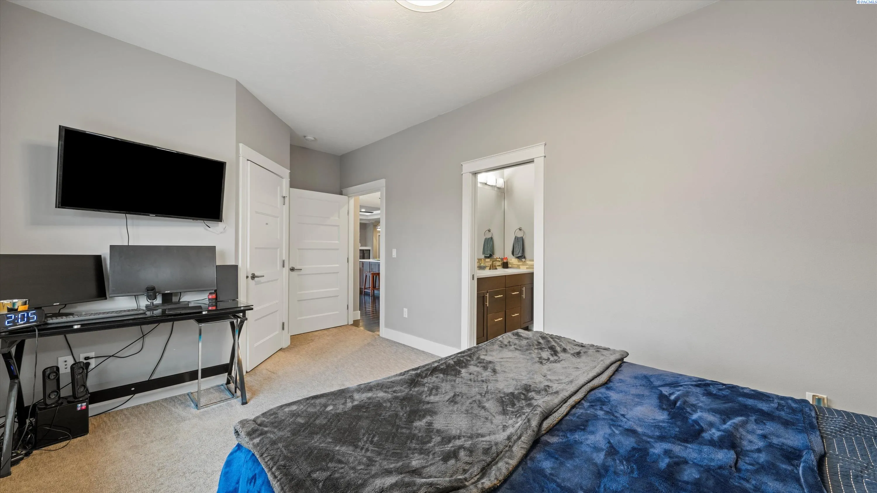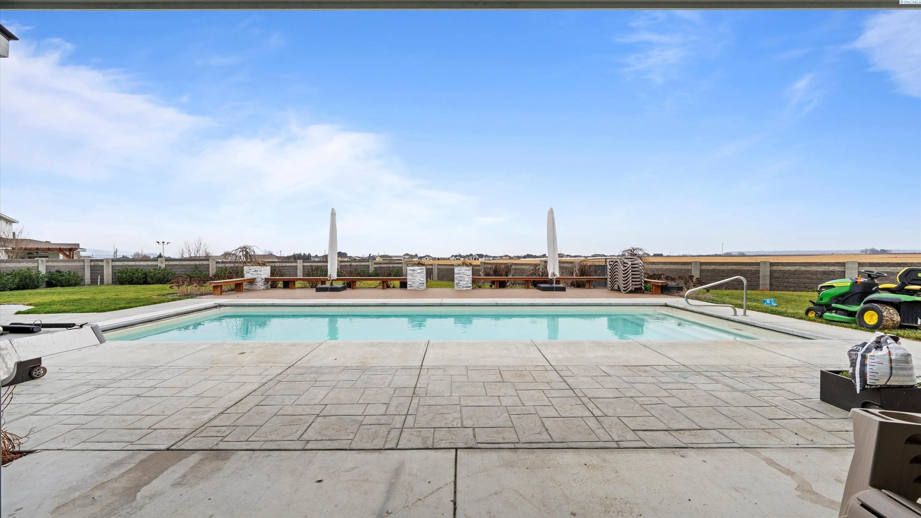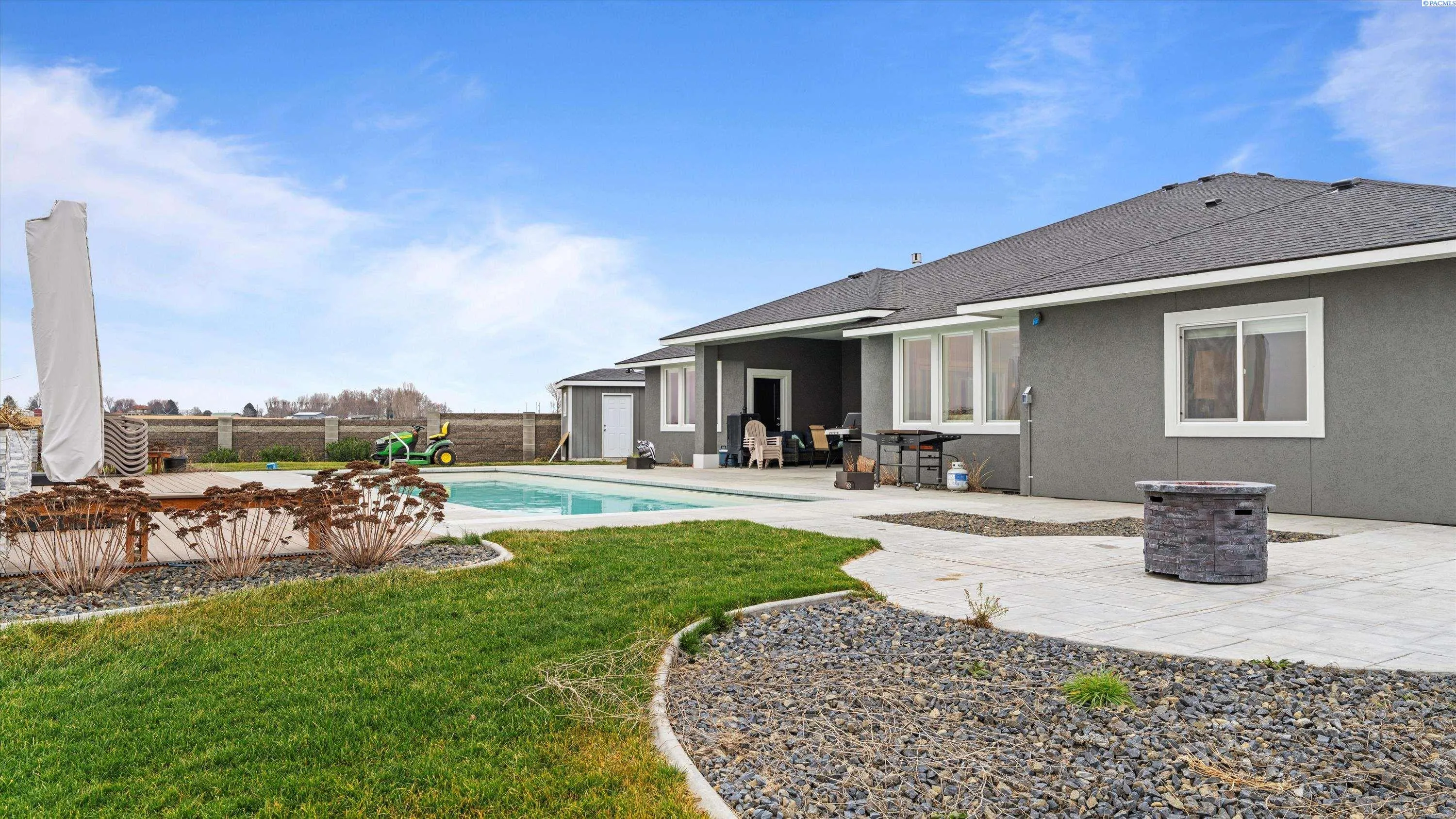 MLS# 289916 Welcome to your dream home! This stunning 2668 SQF rambler, featuring the highly desirable Encore split bedroom floor-plan by Prodigy Builder, a true gem nestled in a peaceful cul-de-sac on a 0.54-acre lot. NO HOA. With 4 bedrooms and 3 bathrooms, this modern and contemporary residence offers spacious living designed for comfort and style.Step inside to discover a beautiful kitchen that is truly the heart of the home, boasting a huge island perfect along with plenty of cabinets for ample storage. You will love spacious walk in pantry. The expansive living room is a highlight of this home, featuring large picture windows that flood the space with natural light.Imagine cozy evenings by the fireplace, where you can enjoy the warmth and ambiance while taking in views of your stunning heated pool right from your living area. The open concept layout enhances the feeling of spaciousness and connection The home is equipped with a built-in surround sound system, enhancing your entertainment experience. Each bedroom has its own walk-in closet, providing ample storage.The master suite is a private oasis featuring walk-in shower and tub combo, dual vanity & generously sized walk in closet.You will love floor to ceiling tiled enormous shower with double shower heads, elegantly tiled to create a spa-like experience. Also, private master suite offers direct access to patio.Large laundry room has a sink & counter working space leading into huge walk in storage room. Outdoor living is just as impressive with a backyard that resembles a serene oasis.The heated fiberglass pool (16 x 40 ft) is complemented by an automatic cover for safety and energy efficiency, ideal for year-round enjoyment.Enjoy evenings around the outdoor fire-pit, with a built-in propane line dedicated for your convenience. The covered patio offers an ideal spot for relaxation or entertaining guests, all while taking in the breathtaking sunrises and sunsets this home offers.The property is fully fenced for privacy, enhanced by custom powder-coated gates.The 3-car garage and open RV parking space, combined with a huge and long driveway, provide plenty of room for vehicles and guests. A fully owned 11kW SOLAR system ensures net-zero living, offsetting your energy consumption and providing significant savings on utility bills. Conveniently located close to everything you need, this home perfectly blends luxury, convenience,& sustainability.Don’t miss the opportunity to make it yours.