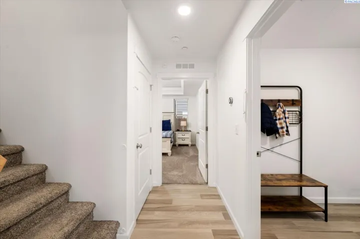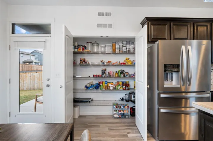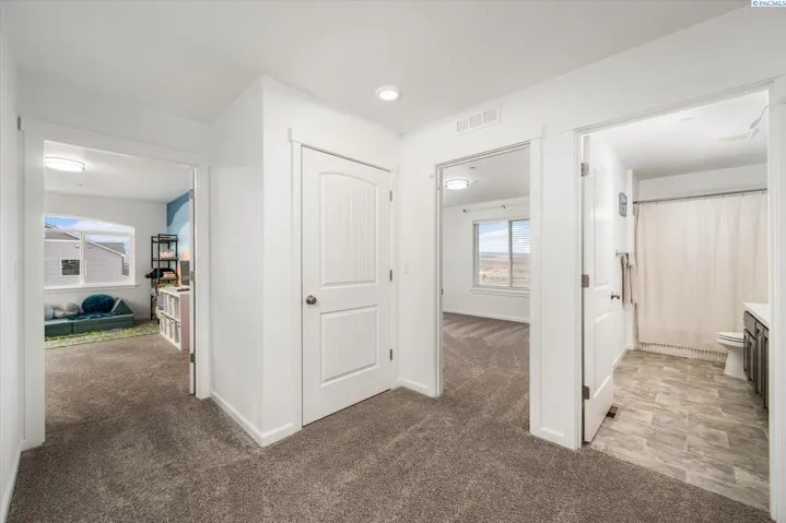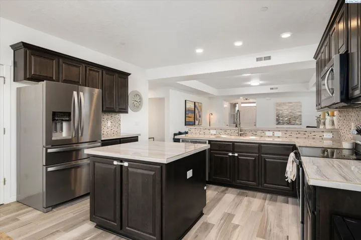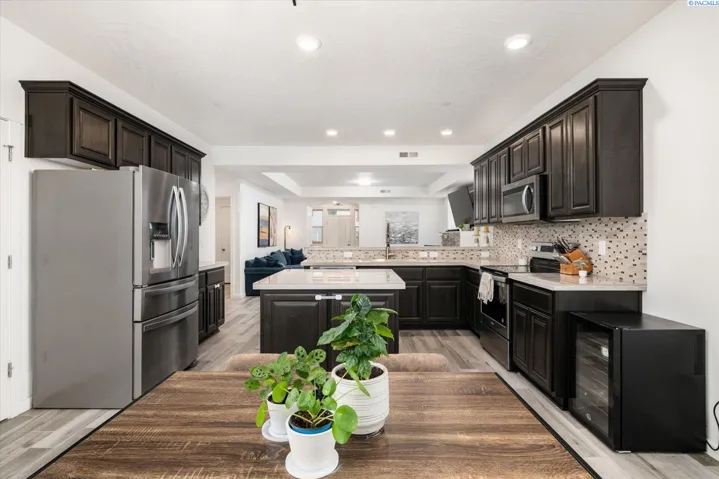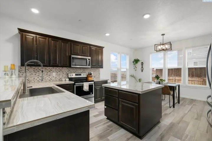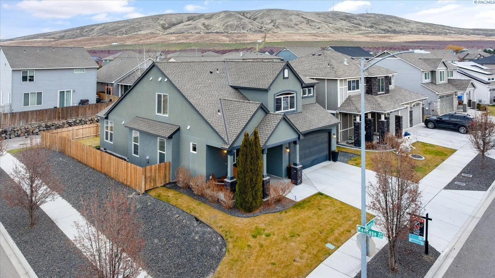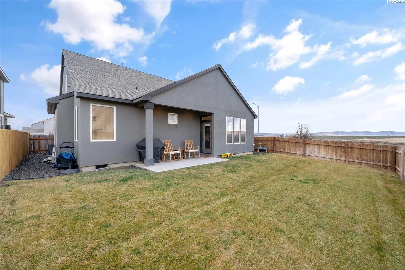 MLS# 289705 Located in Badger Mountain South, this well-maintained 2018 home offers a flexible layout, scenic views, and a peaceful corner-lot setting with quick access to parks and commuting routes. Thoughtfully designed with four bedrooms and three bathrooms, the home includes an oversized bedroom upstairs that works beautifully as a bonus living space, media room or home office. It is configured so it could be divided into two bedrooms making this a 5 bedroom home. The main level features a spacious living room with a gas firelplace, along with a kitchen offering an island, breakfast bar and a dedicated dining area. The primary suite is conveniently located on the main floor and includes a soaking tub, separate shower, a large walk-in closet, and a private laundry setup. Upstairs you’ll find two additional bedrooms, a full bathroom, and a large bonus room/4th bedroom wired for surround sound. There is a second laundry area upstairs for added ease. With living spaces on both levels the layout provides room to spread out while still feeling connected. Enjoy evenings on the covered back patio, taking in sunset views of Candy Mountain and Rattlesnake Ridge. Close to neighborhood parks, the Country Mercantile, and Goose Ridge Winery, this home blends scenic surroundings with everyday convenience.