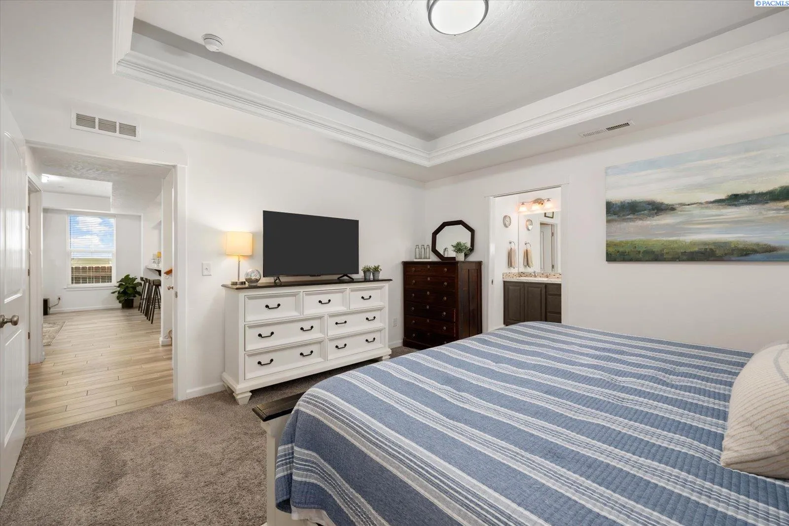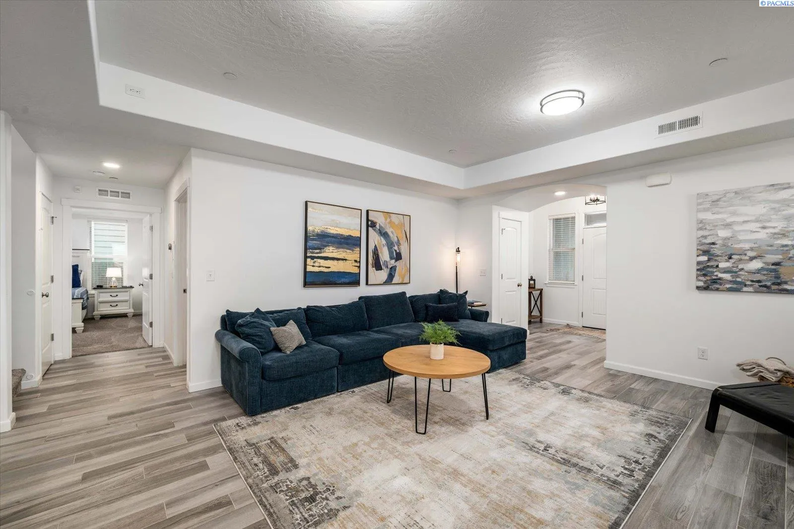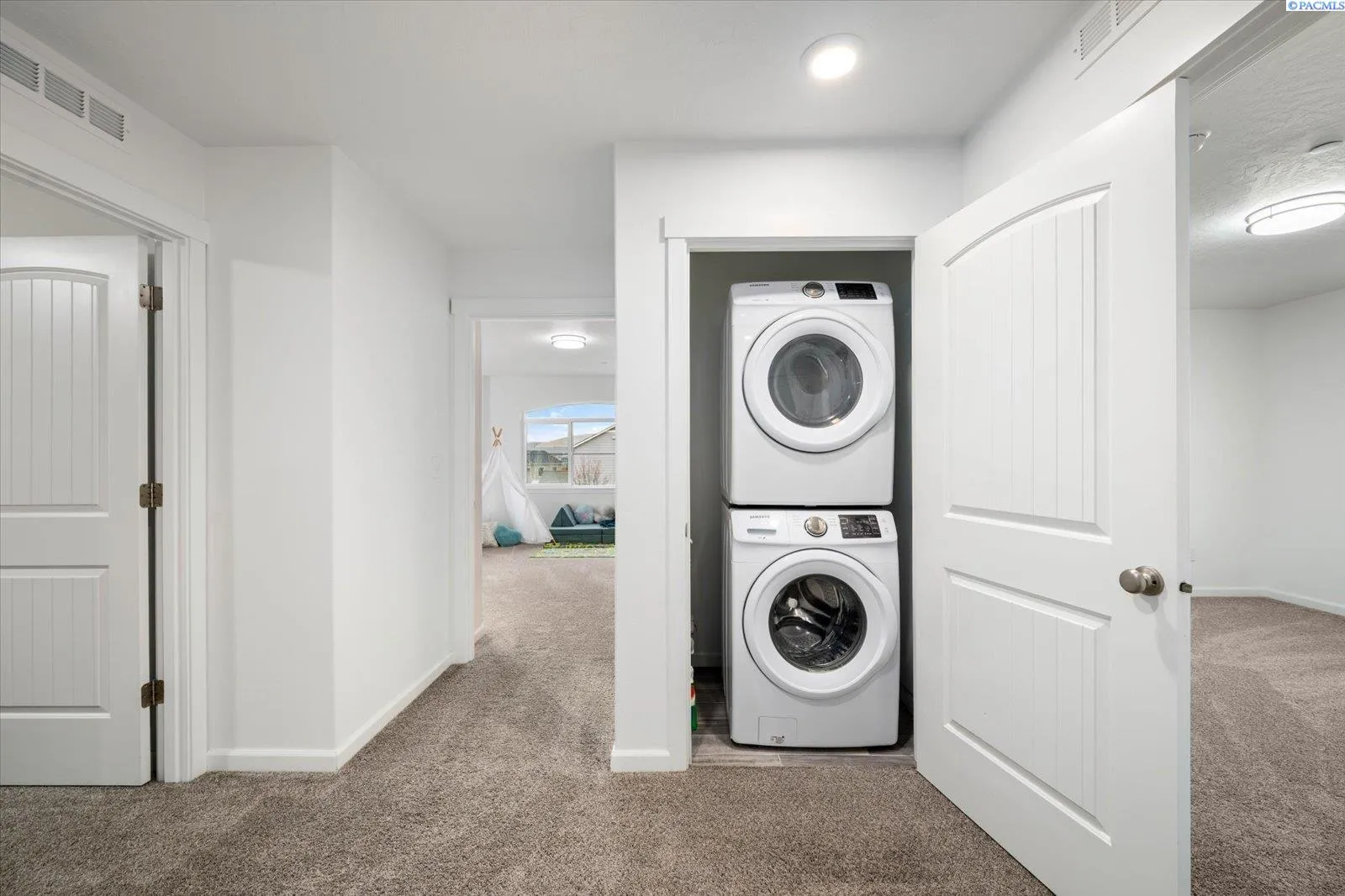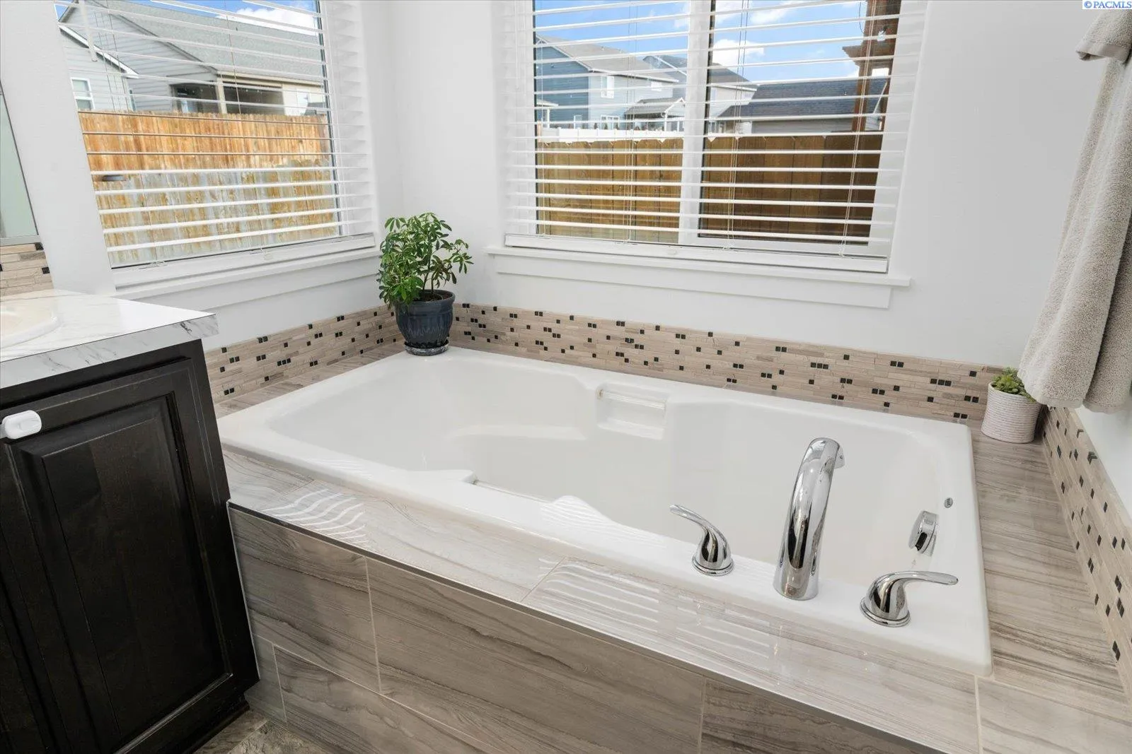 MLS# 289705 Located in Badger Mountain South, this well-maintained 2018 home offers a flexible layout, scenic views, and a peaceful corner-lot setting with quick access to parks and commuting routes. Thoughtfully designed with four bedrooms and three bathrooms, the home includes an oversized bedroom upstairs that works beautifully as a bonus living space, media room or home office. It is configured so it could be divided into two bedrooms making this a 5 bedroom home. The main level features a spacious living room with a gas firelplace, along with a kitchen offering an island, breakfast bar and a dedicated dining area. The primary suite is conveniently located on the main floor and includes a soaking tub, separate shower, a large walk-in closet, and a private laundry setup. Upstairs you’ll find two additional bedrooms, a full bathroom, and a large bonus room/4th bedroom wired for surround sound. There is a second laundry area upstairs for added ease. With living spaces on both levels the layout provides room to spread out while still feeling connected. Enjoy evenings on the covered back patio, taking in sunset views of Candy Mountain and Rattlesnake Ridge. Close to neighborhood parks, the Country Mercantile, and Goose Ridge Winery, this home blends scenic surroundings with everyday convenience.