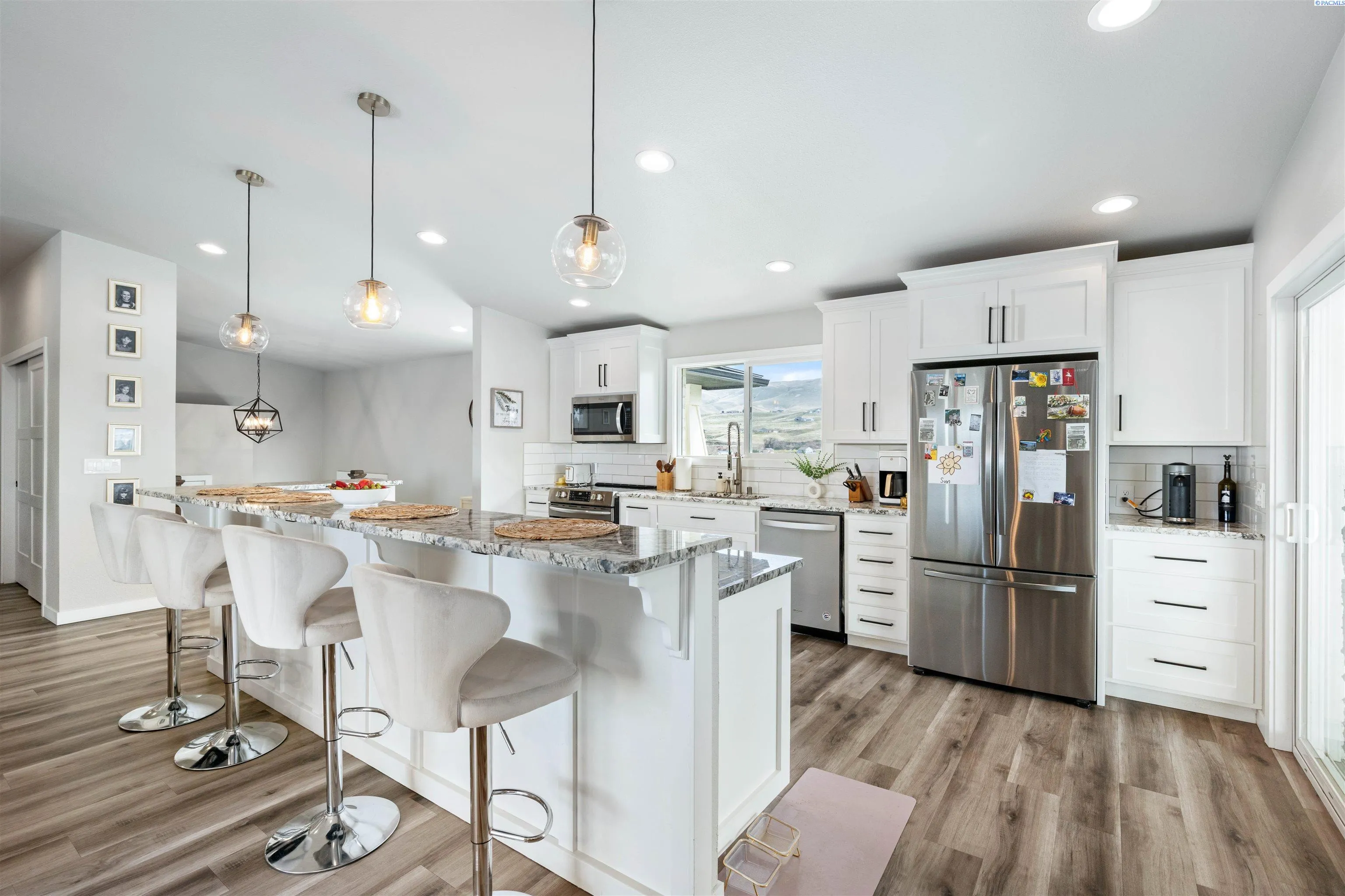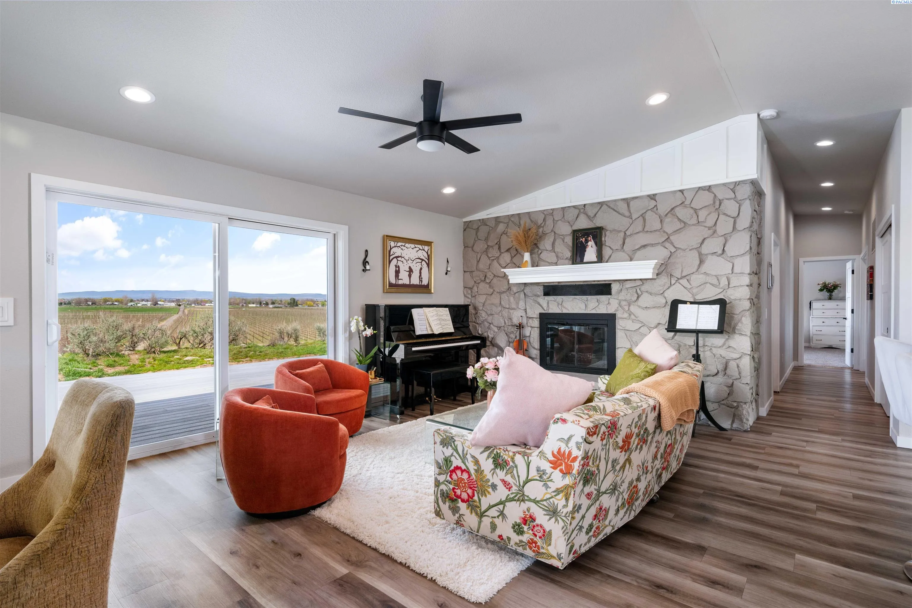MLS# 289673 Imagine waking up each day surrounded by sweeping views of the Yakima River, Mount Rainier, Mount Adams, and the Horse Heaven Hills. Set on just over 3 acres, this beautifully updated home offers a front row seat to some of the most breathtaking scenery in the area and a lifestyle that’s hard to replicate.Mornings begin with coffee on the covered patio, watching the light change over the hills. Evenings invite you out onto the wraparound Trex deck, where sunsets stretch across the river and mountains and the world feels a little quieter. From nearly every angle, the views remind you just how special this setting is.Inside, the main level is bright, open, and welcoming. The kitchen has been thoughtfully updated with stainless steel appliances, a spacious island, and soft close cabinetry, and even everyday moments like standing at the kitchen sink come with a view of the Horse Heaven Hills. The living and dining spaces flow together effortlessly, centered around a cozy wood burning fireplace that makes the home feel warm and inviting year round.The primary suite on the main level is a true retreat. With a large walk-in closet featuring built-ins, a private deck entrance, and an en-suite bath with a walk-in tile shower and dual vanities. A hot tub hookup on the deck makes it easy to unwind under the stars at the end of the day. The office, located just off the primary bedroom, offers a beautiful view, turning everyday work into something a little more enjoyable.Downstairs, the lower level is filled with natural light and offers a spacious family room with a Blaze King fireplace, two large bedrooms, a full bathroom, and a convenient laundry room. One of the bedrooms includes a private entrance, adding flexibility for guests, multi-generational living, or a home office setup. Plenty of storage throughout the home ensures everything has its place.With a two-car garage, a brand new 50-year roof installed in 2024, and a location that’s just 10 minutes to the new Prosser Memorial Hospital and 8 minutes to downtown Prosser, this home offers the rare balance of peaceful privacy and everyday convenience.This isn’t just a home—it’s a place to slow down, take in the views, and truly enjoy where you live. Come see it for yourself.