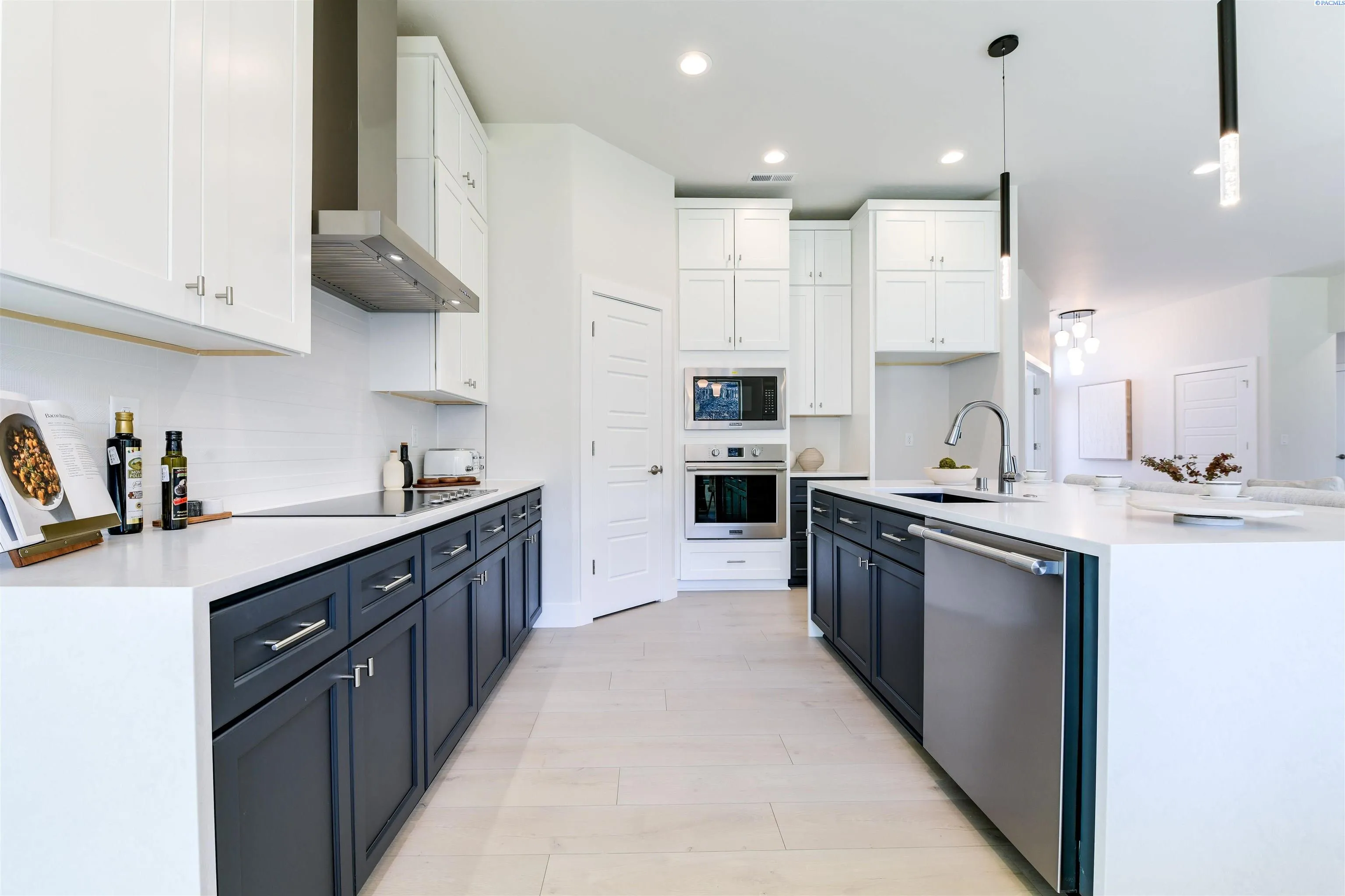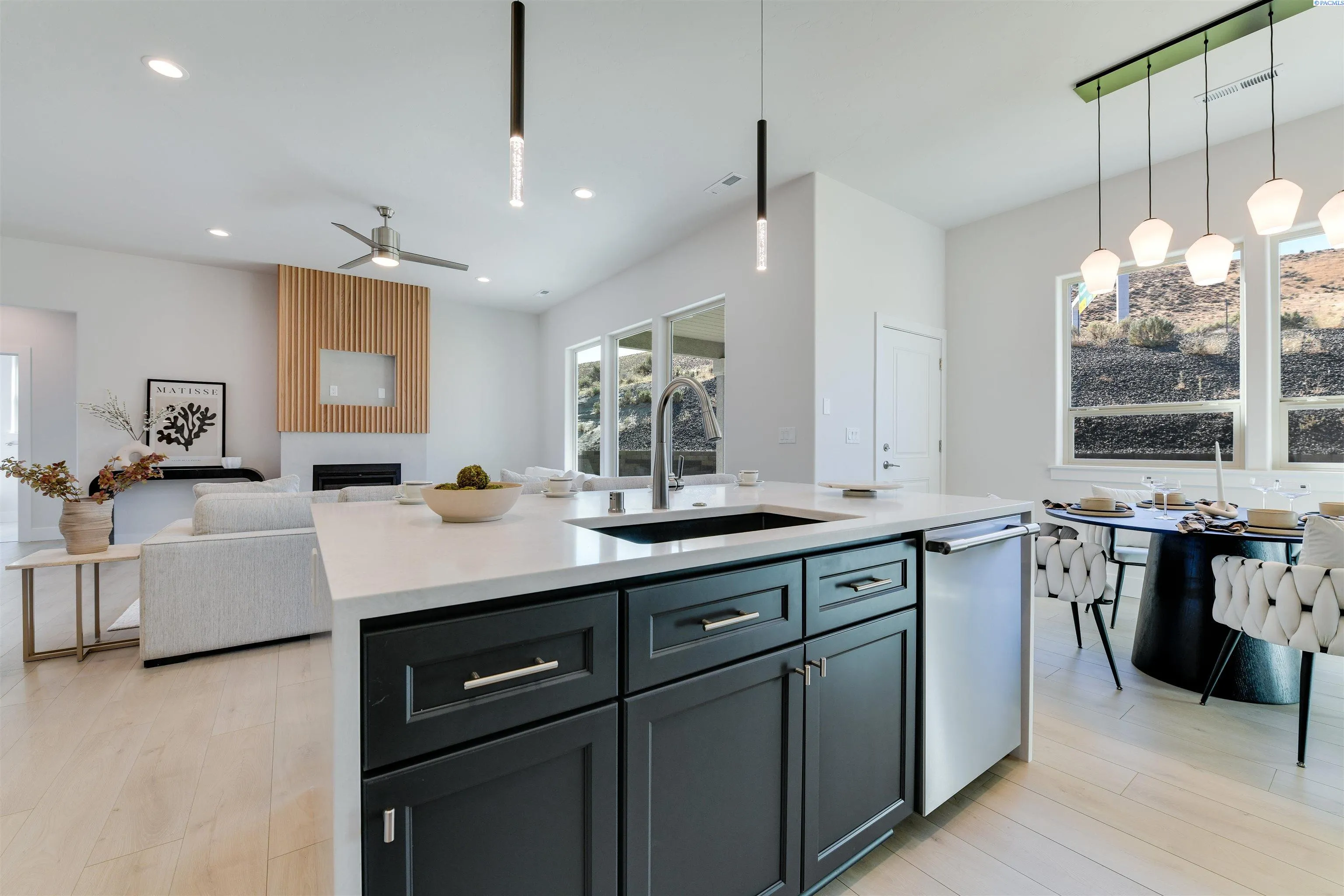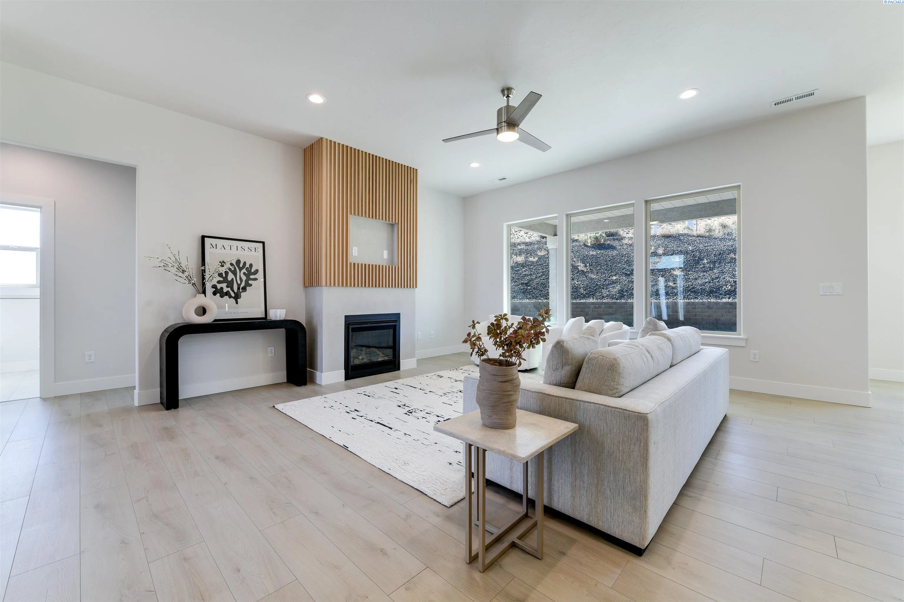 MLS# 289406 Welcome home to your stunning Infinity Home located in the final phase of White Bluffs. This beautifully designed residence features 3 bedrooms plus a den, a full stucco exterior with rock accents, and an exposed aggregate driveway and walkway leading to an elegant front entry with a transom and side light window for added natural light. Inside, luxury vinyl plank/SPC flooring flows throughout the entry, great room, kitchen, dining, den, and hallways. The spacious great room offers a gas fireplace with a custom wood detail finish, a recessed area for TV mounting, and a smurf tube for clean cable management. The home is pre-wired for a 5.1 surround sound system in the great room, plus ambient speakers for the patio and primary suite. The gourmet kitchen showcases stacked cabinetry, quartz countertops with a waterfall island, full tile backsplash, professional stainless-steel appliances, and a corner pantry. All bathrooms and the laundry room feature slab quartz counters and tile flooring. The luxurious primary suite boasts crown molding, a coffered ceiling with accent rope lighting, a soaking tub, tiled walk-in shower, double vanity, and a spacious walk-in closet. Enjoy outdoor living with a covered patio, gas BBQ hookup, full landscaping, underground sprinklers, and full fencing. Thoughtfully designed with high-end finishes and functional details throughout, this home is a must-see!