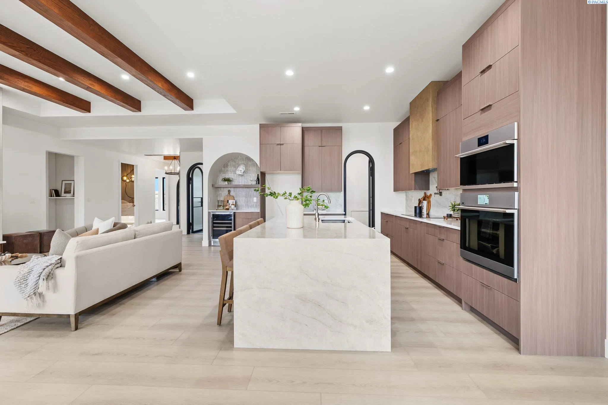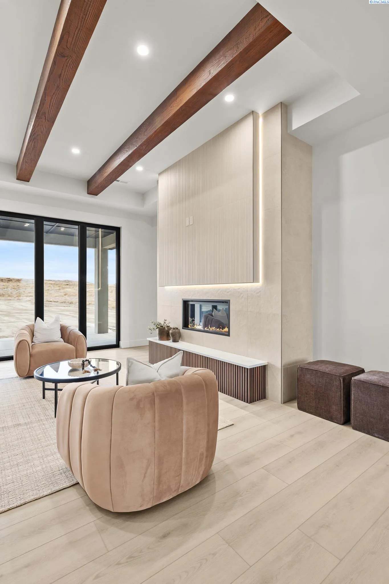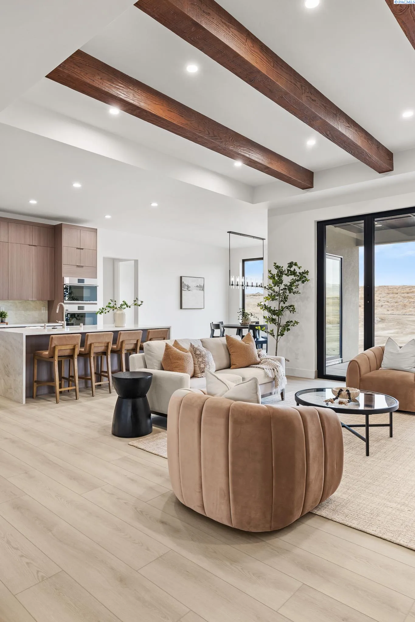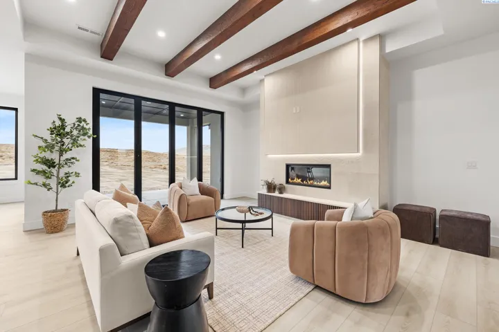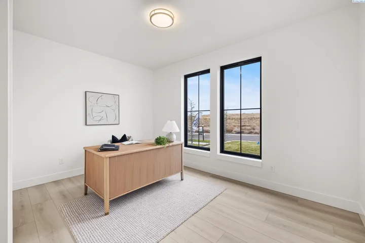 MLS# 289188 Designed with a modern organic style, this beautifully crafted 3-bedroom home with a dedicated office sits on a spacious 1/3-acre lot and offers just under 2,500 sq. ft. of thoughtfully designed living space. The office includes a large closet and can serve as a 4th bedroom, providing excellent flexibility. The home features 2.5 bathrooms, including a full en suite in the primary suite, a shared full bath for the guest bedrooms, and a half bath near the entry. Interior details include arched hallways and doors, rock accent walls, layered LED lighting, and black Andersen window frames. The living room offers exposed ceiling beams and black-framed accordion doors that connect the indoor and outdoor spaces. The kitchen includes modern soft-close cabinetry, a coffee bar with a wine fridge, tile backsplash, and an expansive chef’s pantry with built-in cabinetry, shelving, and countertop workspace. The laundry room provides additional built-in storage and a utility sink. The primary suite includes a fully tiled walk-in shower, freestanding soaking tub, and floor-to-ceiling tile. The guest bath also features full tile and upgraded finishes. The primary closet is equipped with custom shelving and built-ins. Additional features include clear-glass garage doors, a “Costco-style” pantry door for easy grocery access from the garage, exposed beams, designer accent walls, upgraded fixtures, and warm LED lighting throughout. This home showcases intentional design and quality craftsmanship throughout.