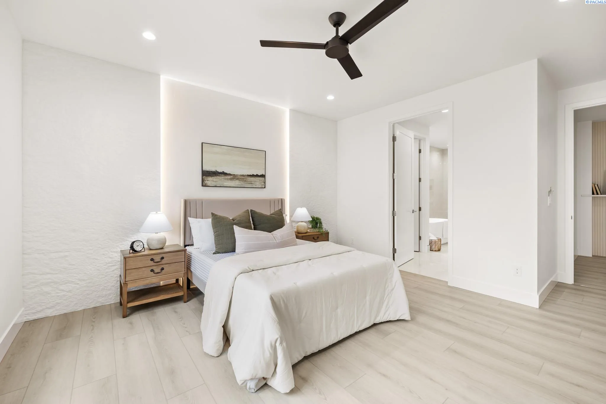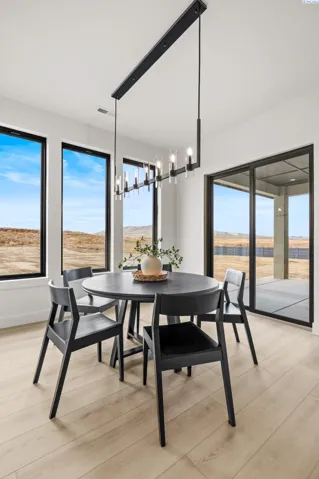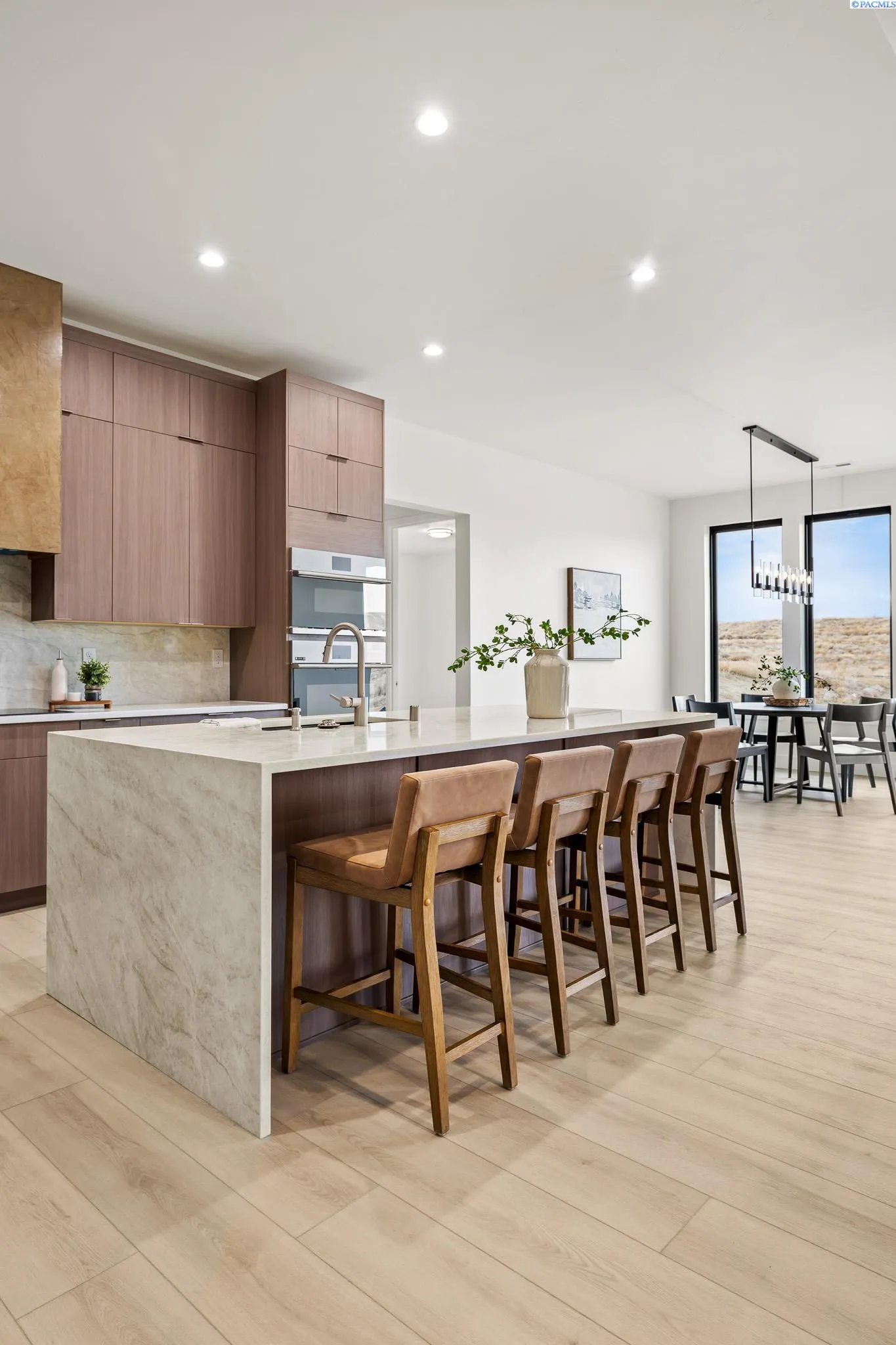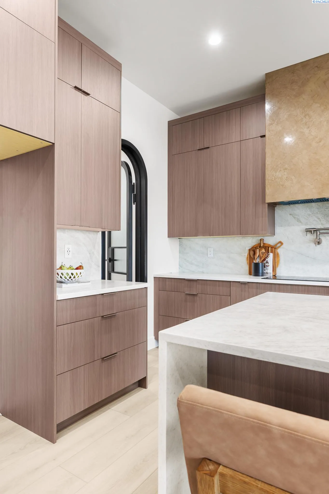 MLS# 289188 Designed with a modern organic style, this beautifully crafted 3-bedroom home with a dedicated office sits on a spacious 1/3-acre lot and offers just under 2,500 sq. ft. of thoughtfully designed living space. The office includes a large closet and can serve as a 4th bedroom, providing excellent flexibility. The home features 2.5 bathrooms, including a full en suite in the primary suite, a shared full bath for the guest bedrooms, and a half bath near the entry. Interior details include arched hallways and doors, rock accent walls, layered LED lighting, and black Andersen window frames. The living room offers exposed ceiling beams and black-framed accordion doors that connect the indoor and outdoor spaces. The kitchen includes modern soft-close cabinetry, a coffee bar with a wine fridge, tile backsplash, and an expansive chef’s pantry with built-in cabinetry, shelving, and countertop workspace. The laundry room provides additional built-in storage and a utility sink. The primary suite includes a fully tiled walk-in shower, freestanding soaking tub, and floor-to-ceiling tile. The guest bath also features full tile and upgraded finishes. The primary closet is equipped with custom shelving and built-ins. Additional features include clear-glass garage doors, a “Costco-style” pantry door for easy grocery access from the garage, exposed beams, designer accent walls, upgraded fixtures, and warm LED lighting throughout. This home showcases intentional design and quality craftsmanship throughout.