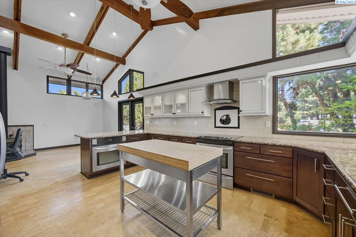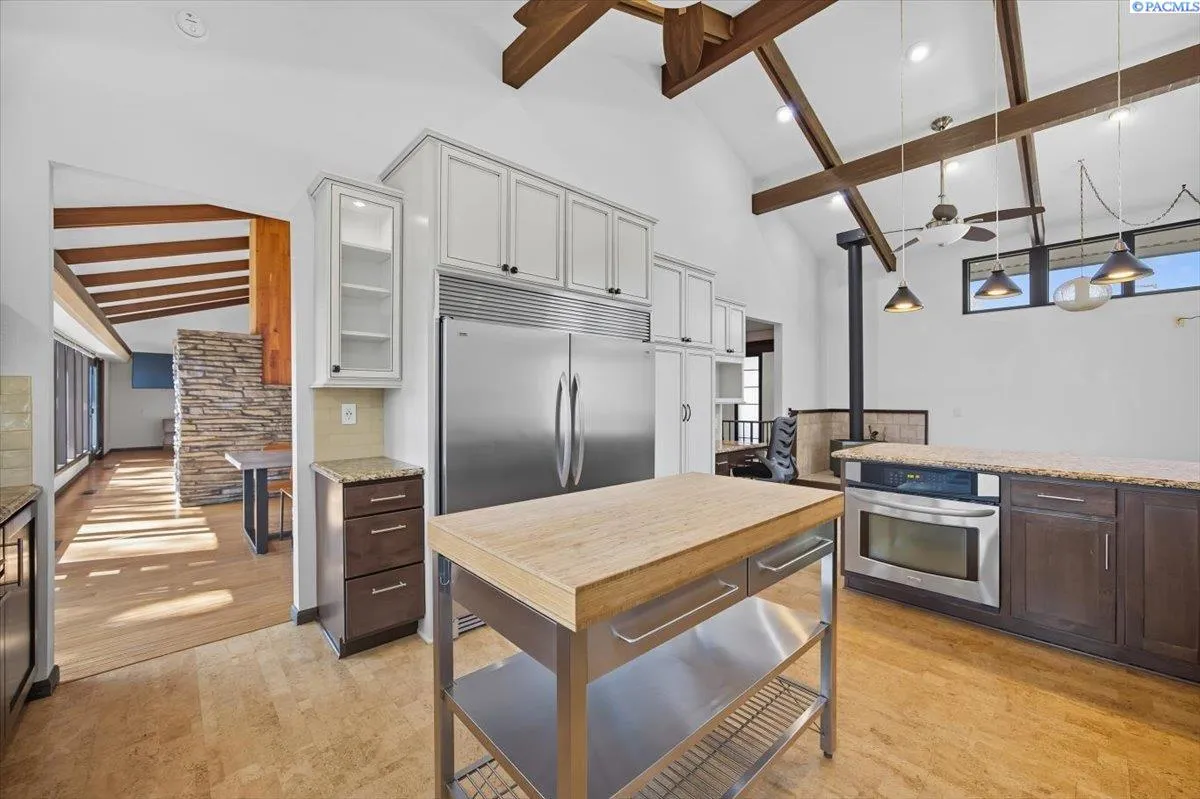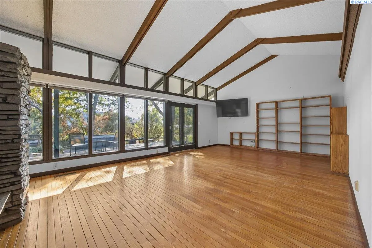 MLS# 288020 Retreat-Style Home in North RichlandDiscover your private retreat in North Richland with this stunning rambler with a full basement, offering nearly 4,000 square feet of beautifully updated living space on a one-acre lot. Most of the living areas, including the laundry room, are conveniently located on the main level. The home showcases a stylish mid-century modern design with a beautifully updated kitchen ,featuring granite counters, newer cabinets, double ovens, a commercial-size refrigerator, stainless steel appliances, tile backsplash, and abundant storage. This is a chef’s dream kitchen. The kitchen eat in dining area includes a cozy wood-burning stove, great for those cold mornings to enjoy your coffee. The open formal dining room features built in bar shelving and opens into the spacious living room which boasts soaring ceilings with wood beams and is also enhanced by a wood-burning stove. Step out to the deck which is perfect for entertaining. Very private setting with so much greenery. Soak in the hot tub then warm up by the fire pit. The perfect private retreat. Enjoy the bright solarium with floor-to-ceiling glass windows, your plants will love this area! The main level offers four bedrooms, and 3 bathrooms, including a beautifully updated primary suite with dual professionally installed closets and anupdated bathroom, featuring dual sinks, a walk-in tile shower, and abundant cabinet space. The main bathroom includes a lovely walk in tile shower, dual sinks, and modern finishes. Third bathroom is updated with vanity and tub and tile surround. Throughout the home, you’ll find newer wood flooring, custom paint, and thoughtful upgrades at every turn.The lower level provides endless possibilities—ideal for a theater room, game area, or potential fifth bedroom. It also includes a washer and dryer hookup, tons of storage, and easy access to the oversized three-car garage, complete with a newer soft-close garage door opener and updated entry door.Outside, there’s room for everything—ample RV parking, a fenced yard, and chicken coop. Splash in the beautiful gunite pool and soak up the sun under the gazebo Also included is a pool house with all the supplies. There is a professional-sized tennis court to practice or play tournaments. This property offers a rare combination of space, comfort, and privacy—perfect for a family, multi-generational living. The tennis court area is zoned for 2 additional up to 1000 sq feet homes.