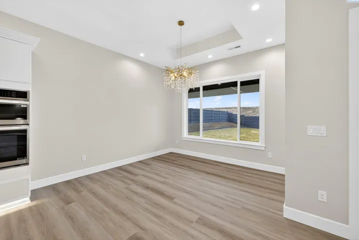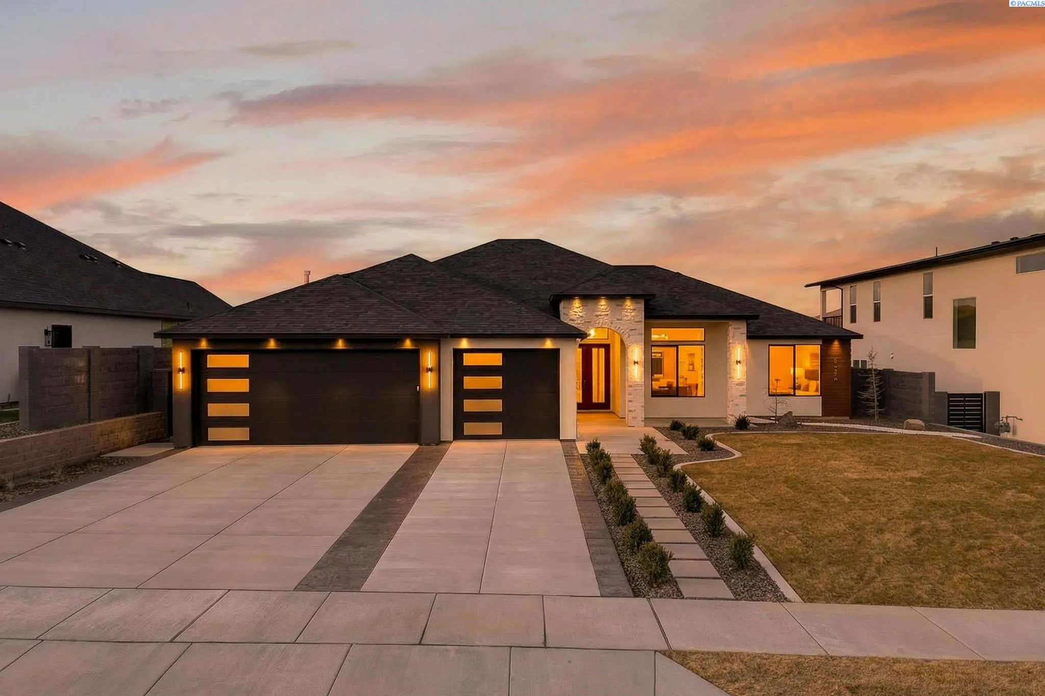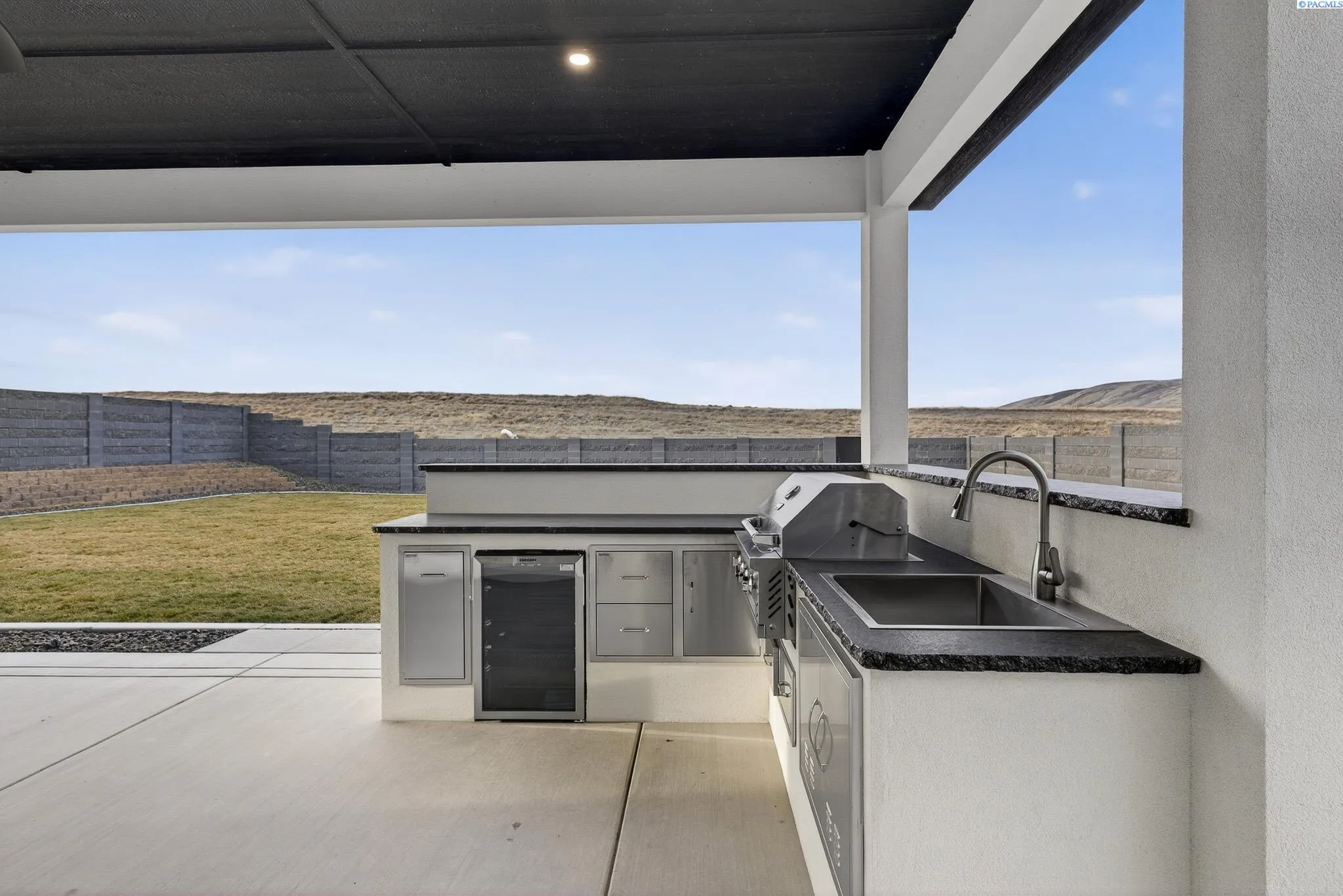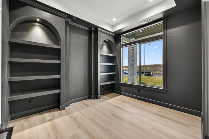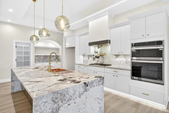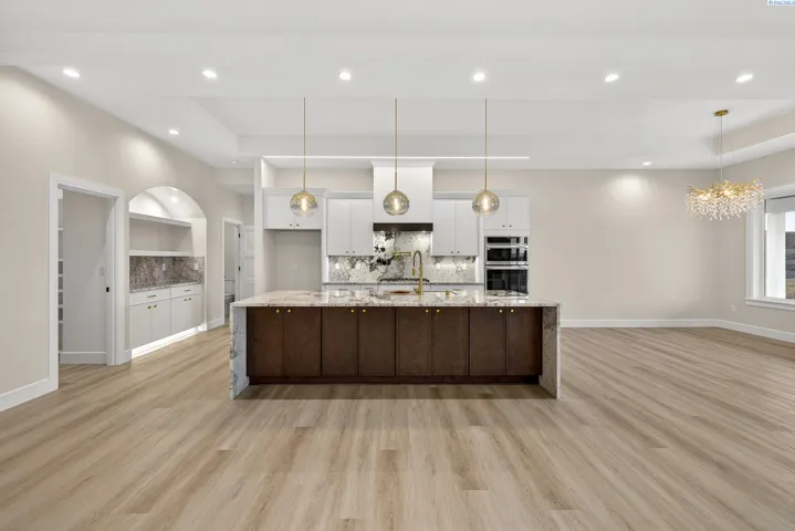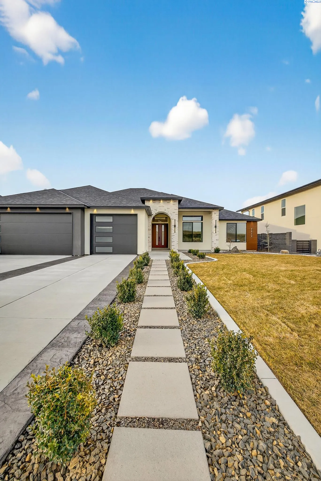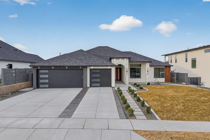 MLS# 288216 This single-story home in the South Orchard community of Richland blends modern architecture, intentional design, and high-end craftsmanship. Set on over a third of an acre, it offers three bedrooms, 3 bathrooms, a dedicated office, a spacious recreation room, and a three-car garage. Step into the foyer and you’re welcomed by eleven-foot ceilings that carry throughout the home. Oversized windows flood the space with natural light, while coffered ceilings with LED lighting in the living room and primary bedroom add a modern, elevated touch. A cozy fireplace anchors the great room, and a large sliding glass door opens to the covered back patio. The chef-inspired kitchen features a striking fourteen-foot waterfall island, a large double-sided sink, stainless steel appliances, a double oven, under-cabinet lighting, and a walk-in pantry. A built-in arched beverage center with display shelving, cabinetry, and accent lighting adds a custom touch. The primary suite includes a walk-in closet designed to impress, featuring built-in shelving on every wall, integrated LED lighting, and a built-in mirror. The spa-like en-suite offers a beautifully tiled walk-in shower with a full-length bench and recessed shelves, a soaking tub, double sinks, and a linen closet. The two additional bedrooms each include their own walk-in closet. The laundry room is thoughtfully designed with a built-in bench and folding table. Step out to the covered back patio, complete with a ceiling fan and built-in lighting, and take in the fully landscaped backyard surrounded by a block wall. Built for entertaining, the outdoor space includes a custom outdoor kitchen with a fridge, sink, and gas grill. Every detail has been thoughtfully selected to blend quality, comfort, and beauty, creating a home that feels both luxurious and welcoming.