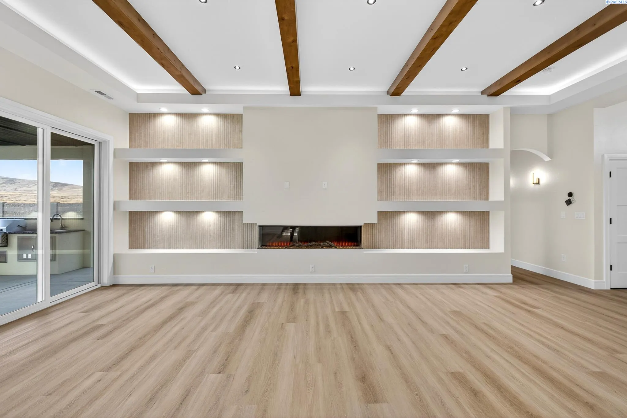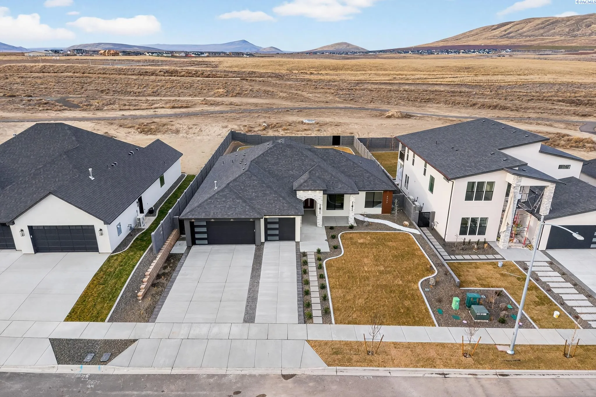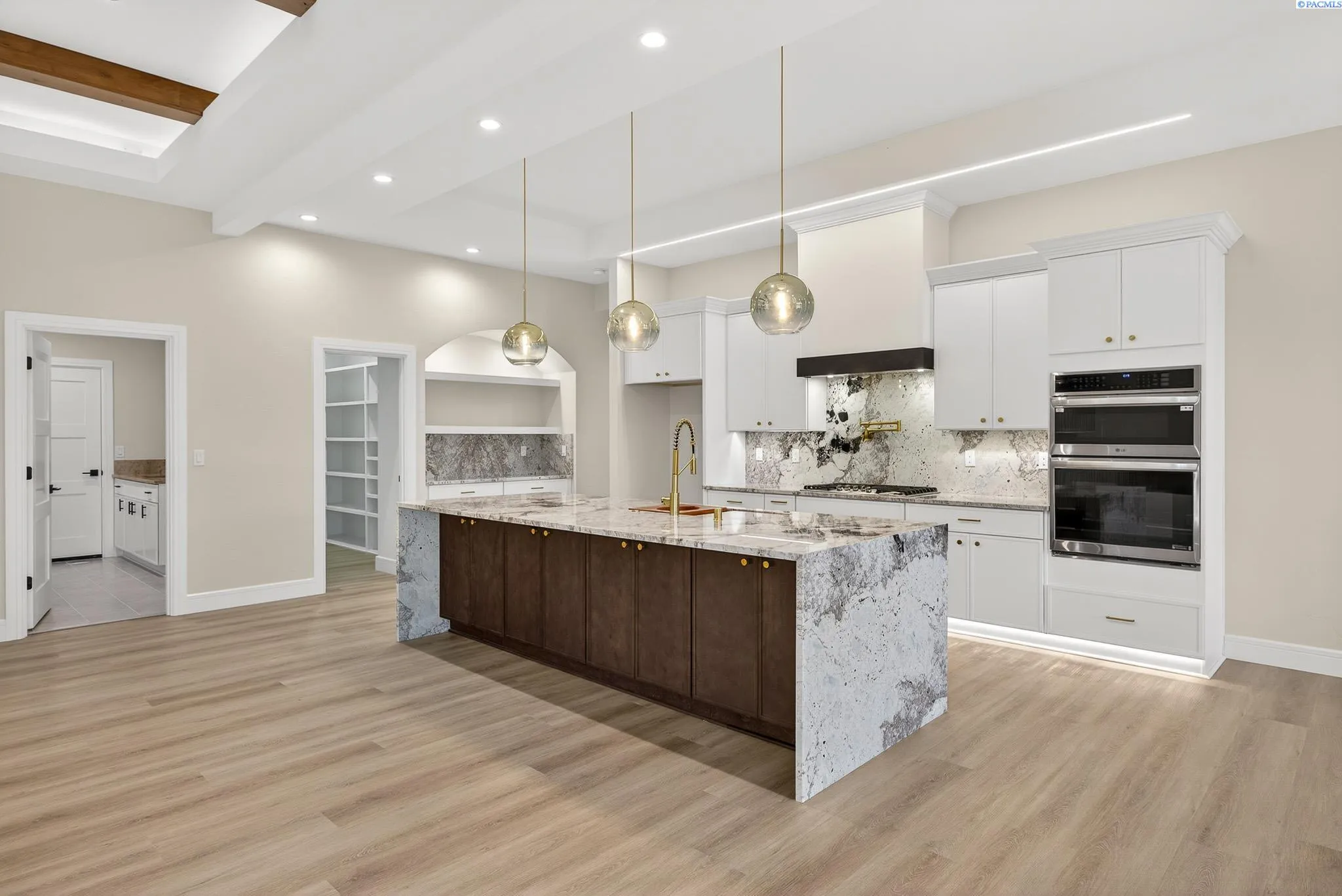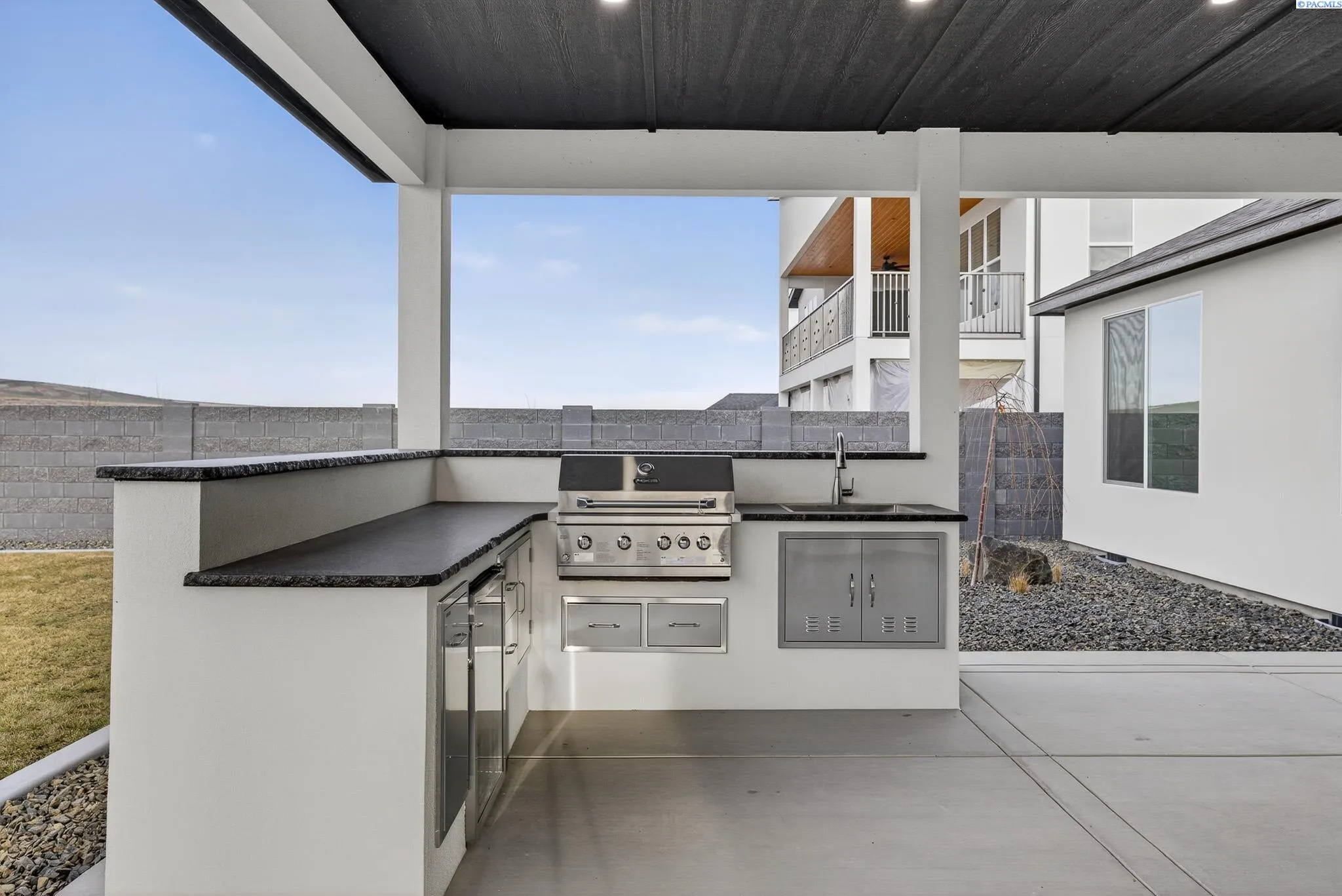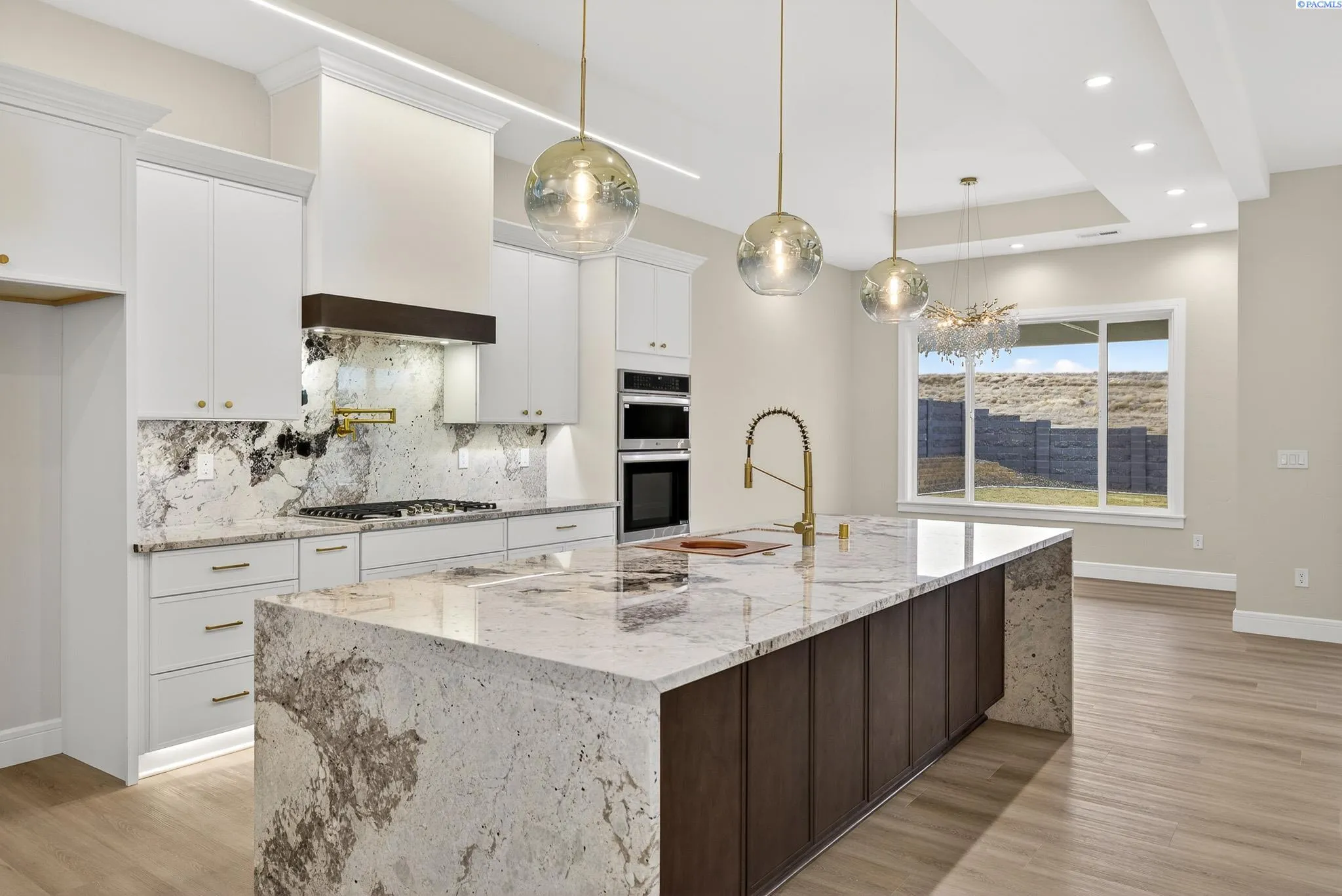 MLS# 288216 This single-story home in the South Orchard community of Richland blends modern architecture, intentional design, and high-end craftsmanship. Set on over a third of an acre, it offers three bedrooms, 3 bathrooms, a dedicated office, a spacious recreation room, and a three-car garage. Step into the foyer and you’re welcomed by eleven-foot ceilings that carry throughout the home. Oversized windows flood the space with natural light, while coffered ceilings with LED lighting in the living room and primary bedroom add a modern, elevated touch. A cozy fireplace anchors the great room, and a large sliding glass door opens to the covered back patio. The chef-inspired kitchen features a striking fourteen-foot waterfall island, a large double-sided sink, stainless steel appliances, a double oven, under-cabinet lighting, and a walk-in pantry. A built-in arched beverage center with display shelving, cabinetry, and accent lighting adds a custom touch. The primary suite includes a walk-in closet designed to impress, featuring built-in shelving on every wall, integrated LED lighting, and a built-in mirror. The spa-like en-suite offers a beautifully tiled walk-in shower with a full-length bench and recessed shelves, a soaking tub, double sinks, and a linen closet. The two additional bedrooms each include their own walk-in closet. The laundry room is thoughtfully designed with a built-in bench and folding table. Step out to the covered back patio, complete with a ceiling fan and built-in lighting, and take in the fully landscaped backyard surrounded by a block wall. Built for entertaining, the outdoor space includes a custom outdoor kitchen with a fridge, sink, and gas grill. Every detail has been thoughtfully selected to blend quality, comfort, and beauty, creating a home that feels both luxurious and welcoming.