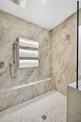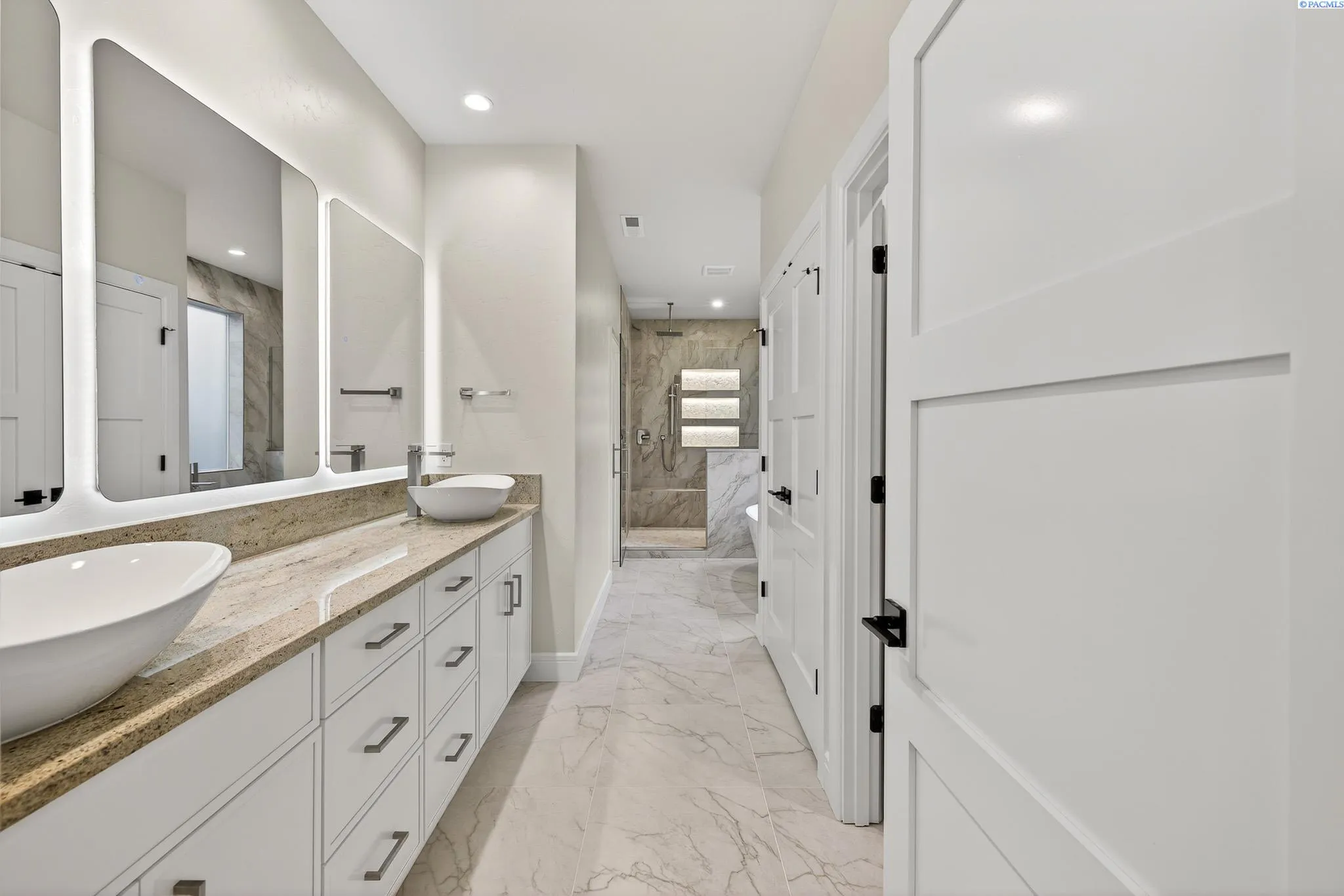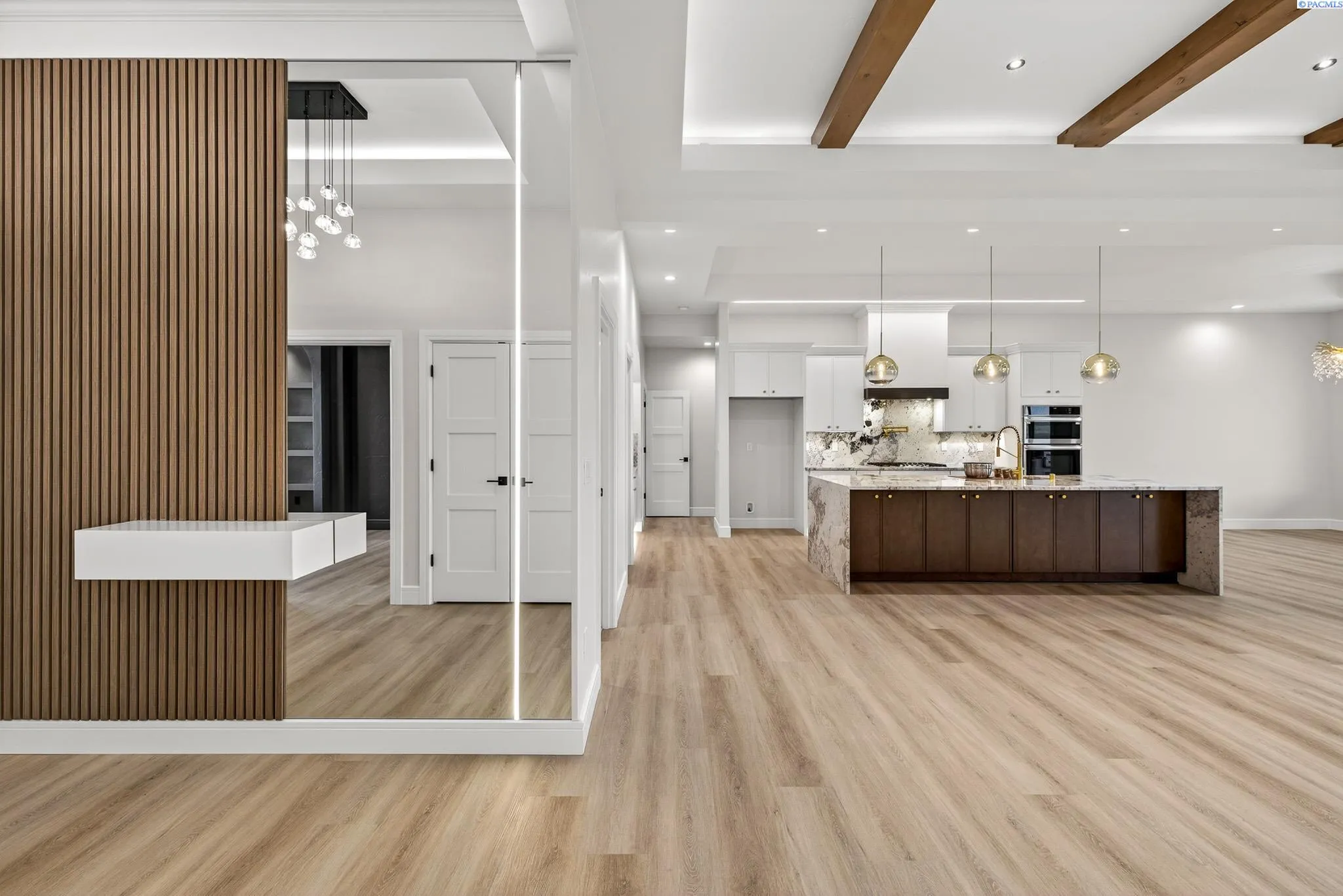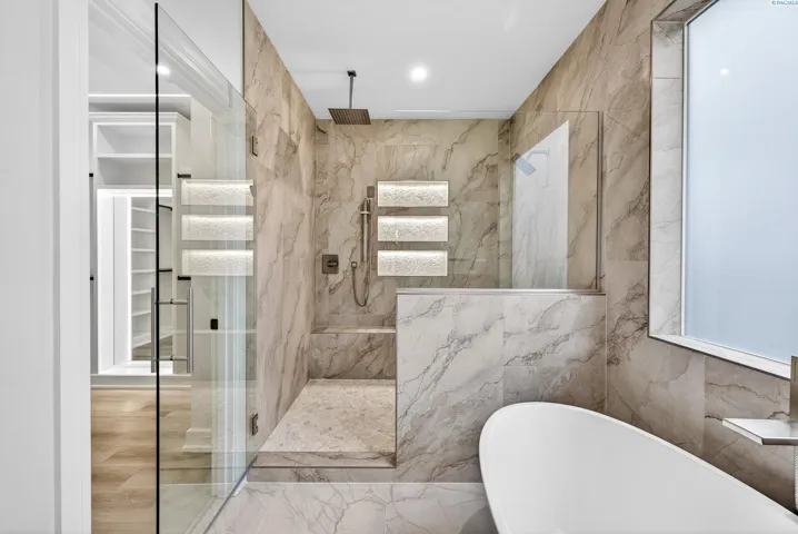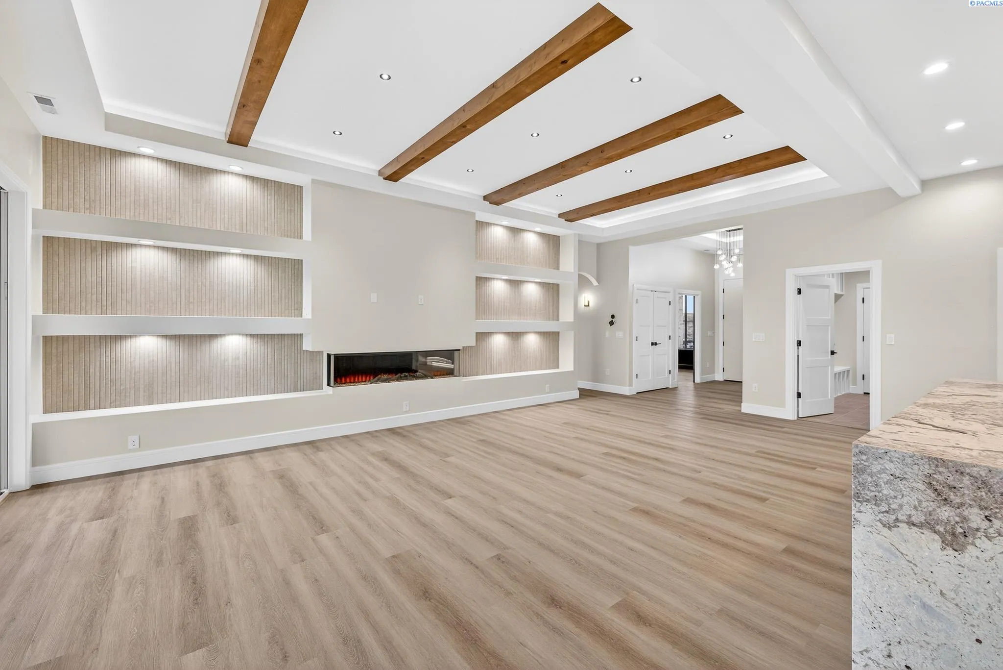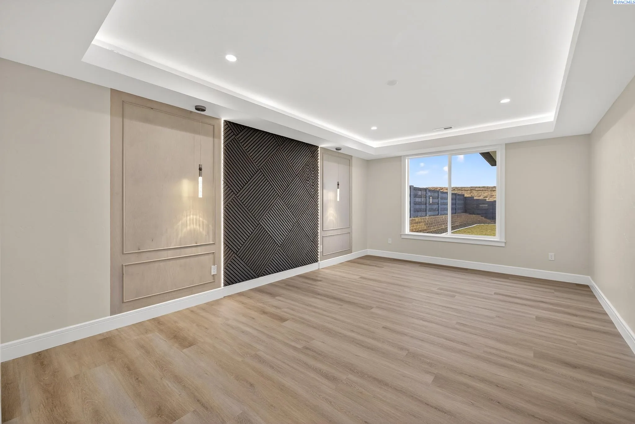 MLS# 288216 This single-story home in the South Orchard community of Richland blends modern architecture, intentional design, and high-end craftsmanship. Set on over a third of an acre, it offers three bedrooms, 3 bathrooms, a dedicated office, a spacious recreation room, and a three-car garage. Step into the foyer and you’re welcomed by eleven-foot ceilings that carry throughout the home. Oversized windows flood the space with natural light, while coffered ceilings with LED lighting in the living room and primary bedroom add a modern, elevated touch. A cozy fireplace anchors the great room, and a large sliding glass door opens to the covered back patio. The chef-inspired kitchen features a striking fourteen-foot waterfall island, a large double-sided sink, stainless steel appliances, a double oven, under-cabinet lighting, and a walk-in pantry. A built-in arched beverage center with display shelving, cabinetry, and accent lighting adds a custom touch. The primary suite includes a walk-in closet designed to impress, featuring built-in shelving on every wall, integrated LED lighting, and a built-in mirror. The spa-like en-suite offers a beautifully tiled walk-in shower with a full-length bench and recessed shelves, a soaking tub, double sinks, and a linen closet. The two additional bedrooms each include their own walk-in closet. The laundry room is thoughtfully designed with a built-in bench and folding table. Step out to the covered back patio, complete with a ceiling fan and built-in lighting, and take in the fully landscaped backyard surrounded by a block wall. Built for entertaining, the outdoor space includes a custom outdoor kitchen with a fridge, sink, and gas grill. Every detail has been thoughtfully selected to blend quality, comfort, and beauty, creating a home that feels both luxurious and welcoming.