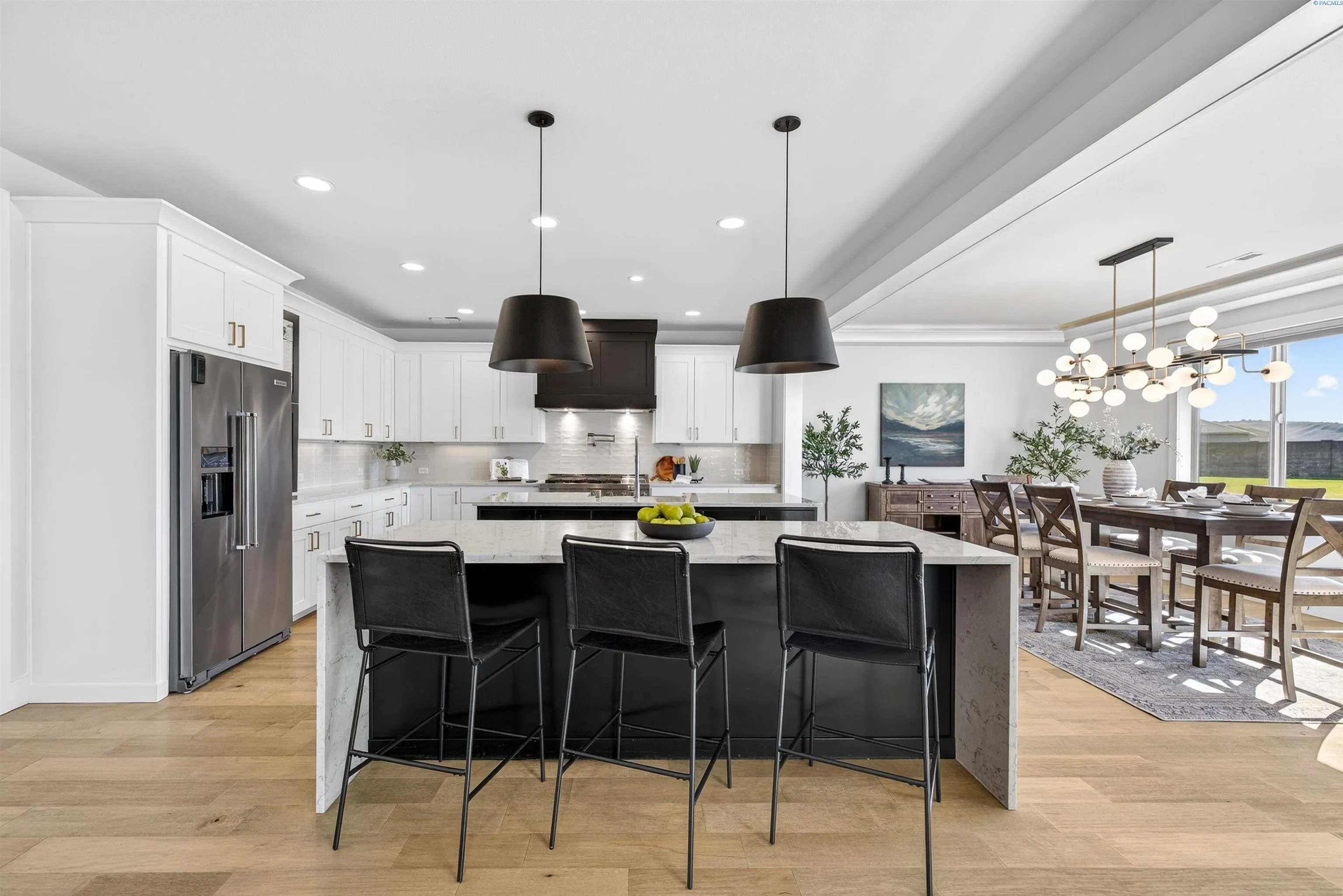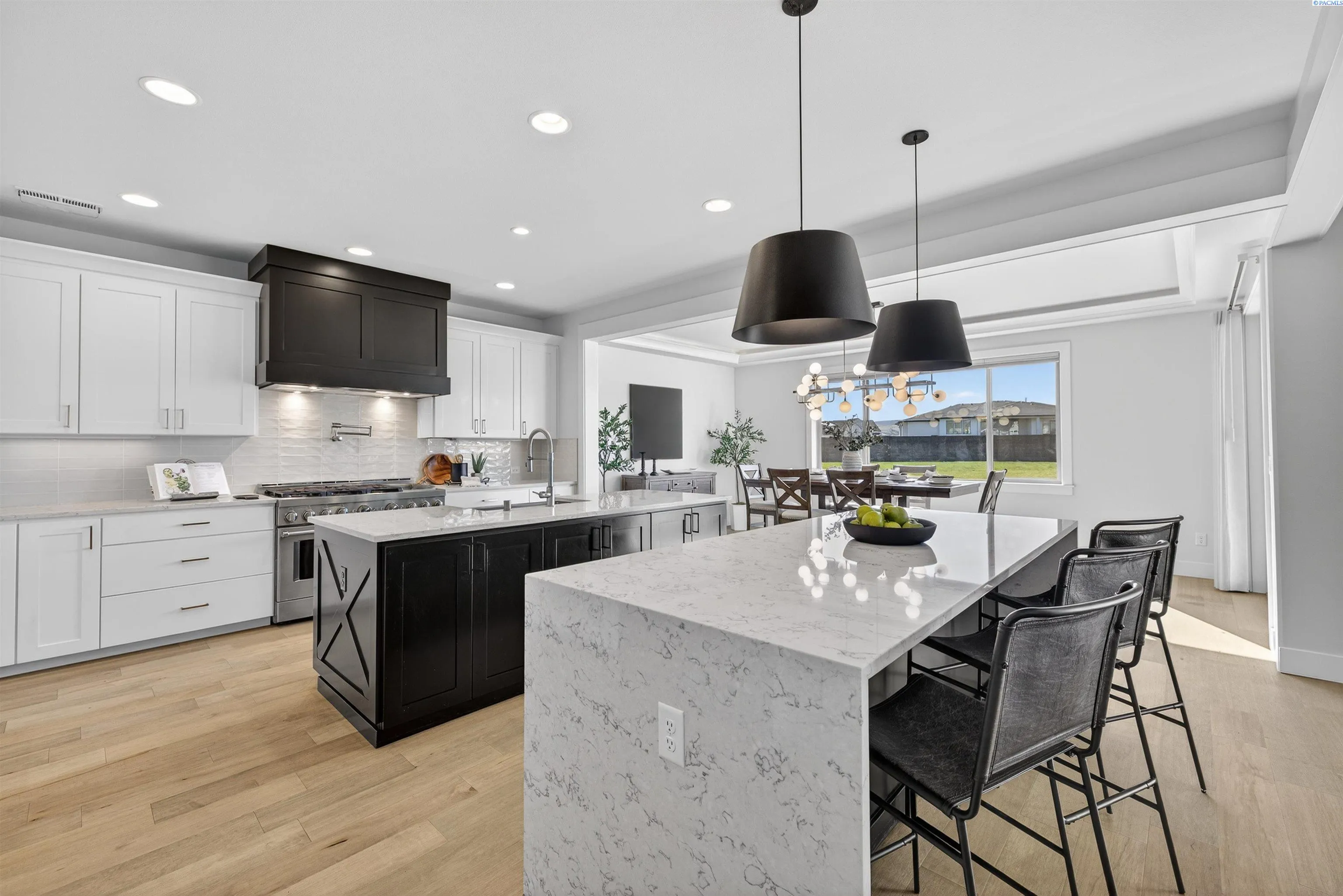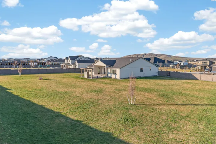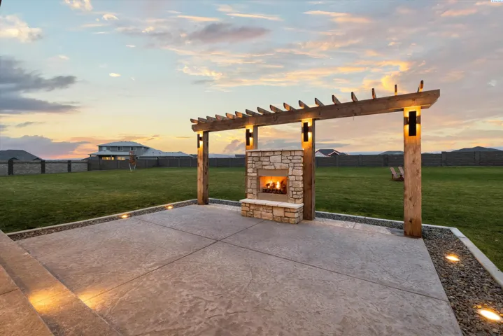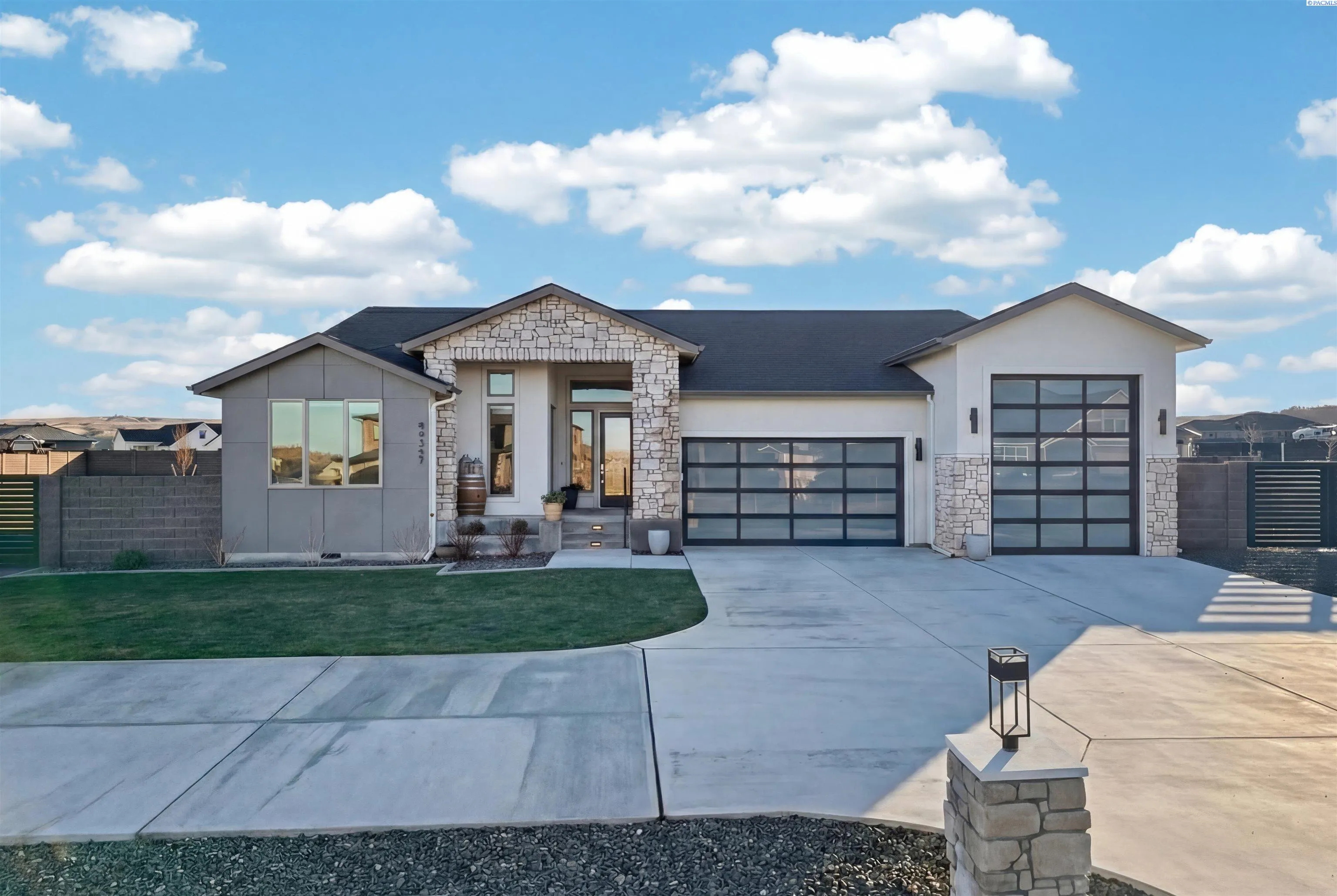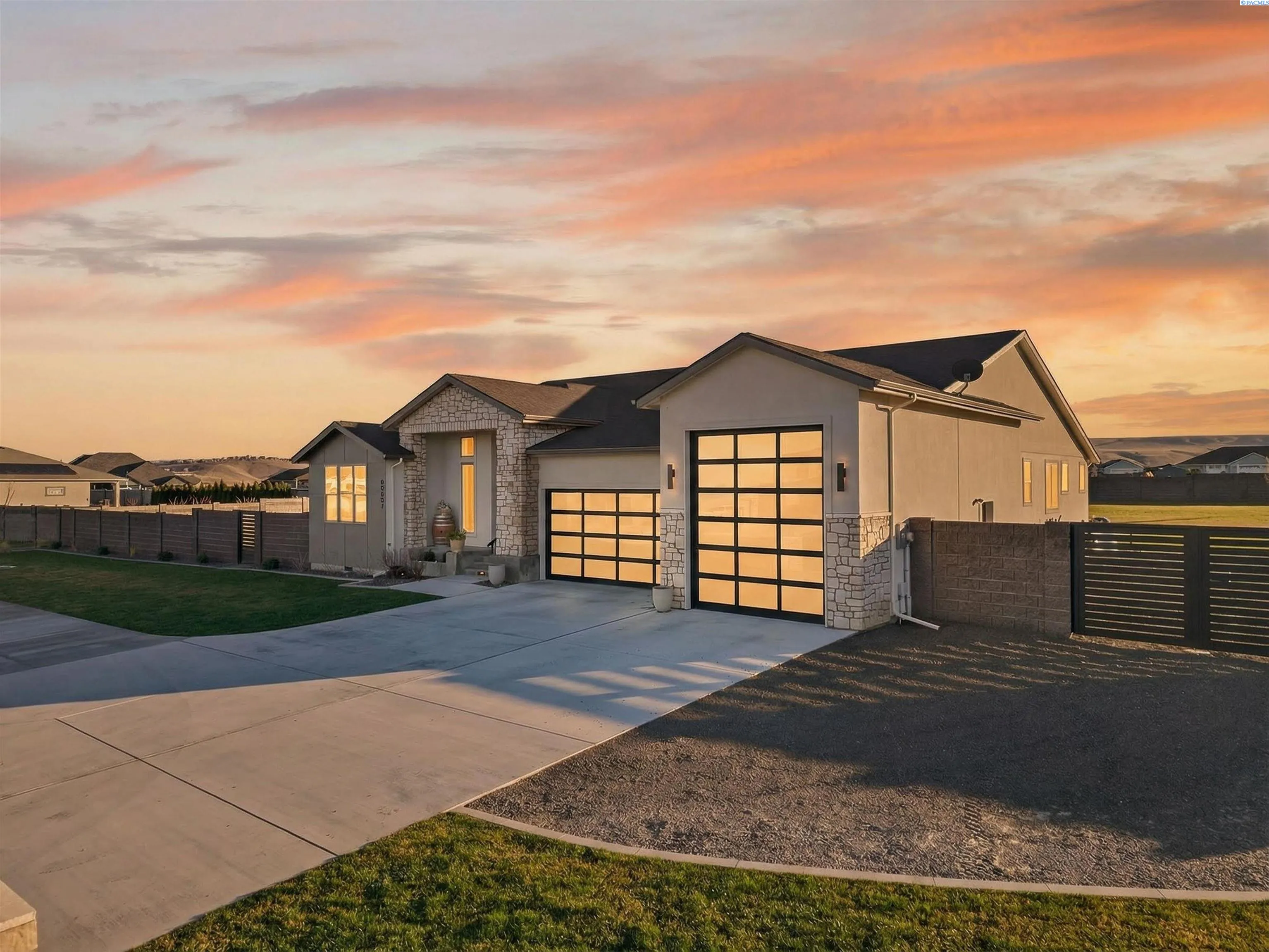 MLS# 290784 Parade of Homes™ Award Winner located in the prestigious Steeplechase neighborhood of SW Kennewick. This 2022-built single-level luxury home offers refined living on a fully fenced one-acre lot with sweeping skyline views. Designed for both everyday comfort and elevated entertaining, the home features a grand entry, 3 bedrooms, 2.5 bathrooms, office space, and a 4-car garage with integrated RV bay and pull-through driveway – ideal for RV owners, car enthusiasts, or those needing additional storage and flexibility. The striking stucco and stone exterior, expansive driveway, and manicured landscaping create impressive curb appeal, while inside soaring wood-beamed ceilings, a dramatic floor-to-ceiling fireplace, and expansive windows fill the open-concept living space with natural light. Large sliding glass doors extend seamlessly to a covered patio with outdoor fireplace, creating true indoor-outdoor living. The kitchen is thoughtfully designed with dual oversized islands for seamless hosting, quartz countertops with waterfall edge, gas range with pot filler, custom hood, double ovens, walk-in pantry, and extensive cabinetry, while a dedicated wine and beverage alcove with French glass doors, prep sink, and beverage cooler enhances entertaining. The private primary suite offers a spa-like retreat with an award-winning en-suite bath featuring a soaking tub, walk-in tiled shower, dual vanities, water closet, and spacious walk-in closet. Two additional bedrooms share a well-appointed ensuite, and the versatile office area provides space for remote work, fitness, study, or creative use. High-end window coverings, premium appliances, new gutters, and updated fascia add to the home’s quality and care. The expansive one-acre lot provides room to build a detached shop, add a custom pool, or simply enjoy the privacy and open space that is increasingly rare in Tri-Cities real estate. This is luxury single-story living with acreage, RV parking, modern design, and award-winning craftsmanship in SW Kennewick.