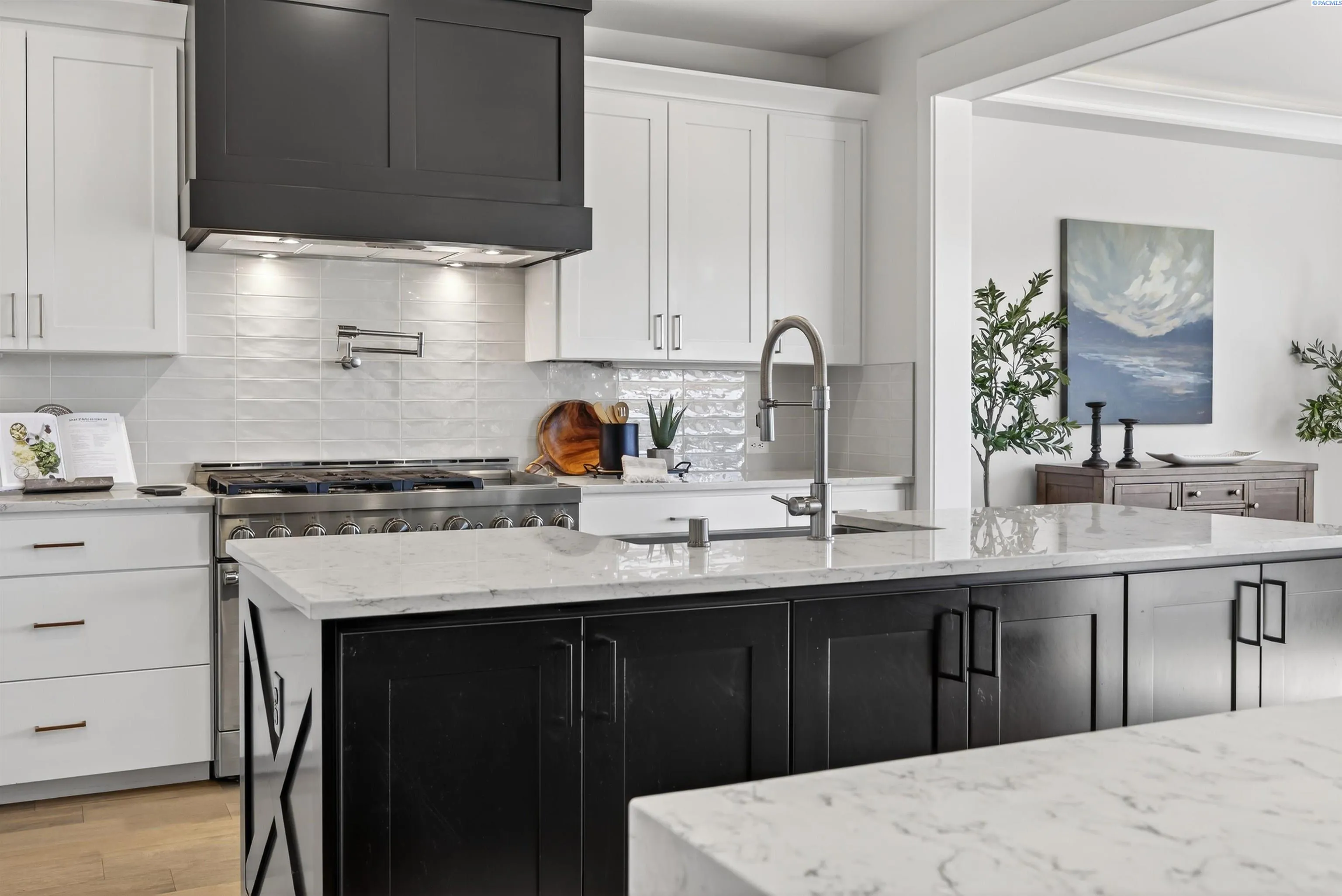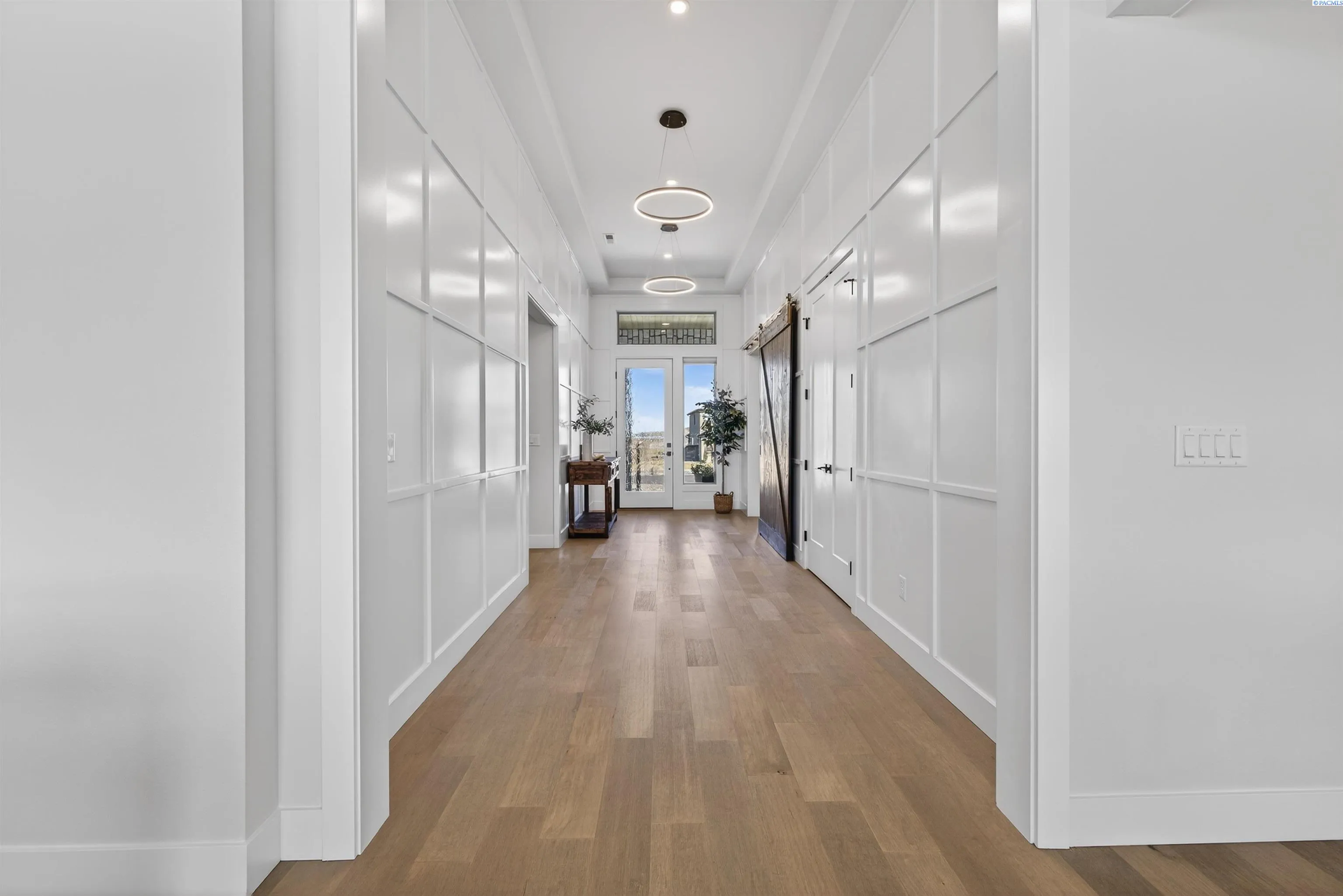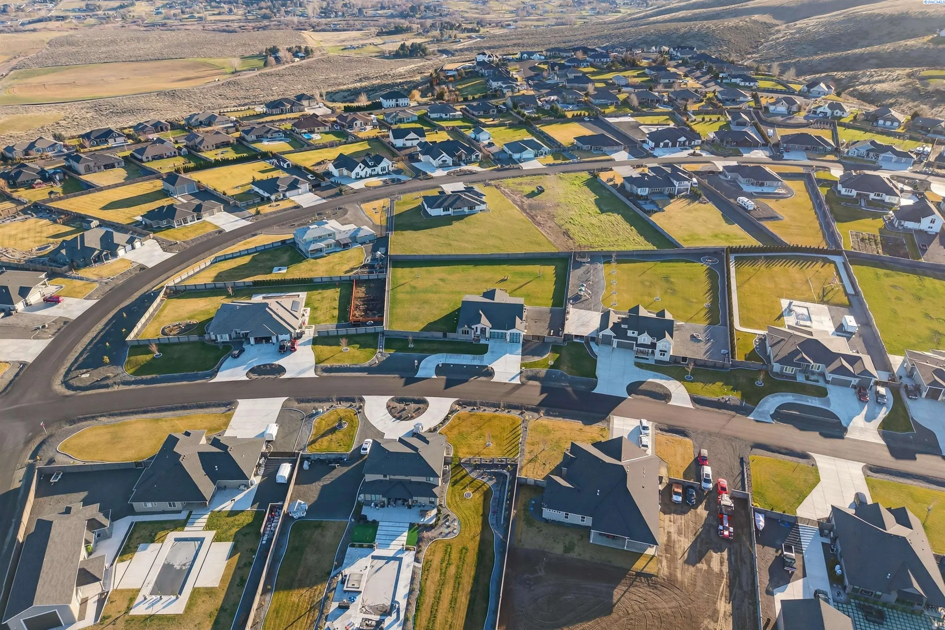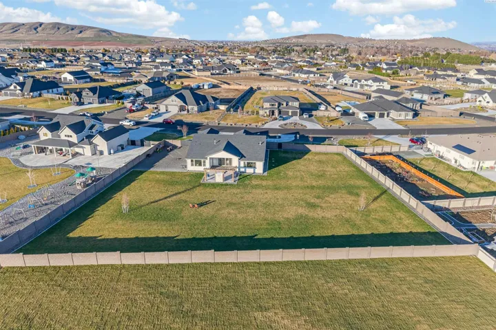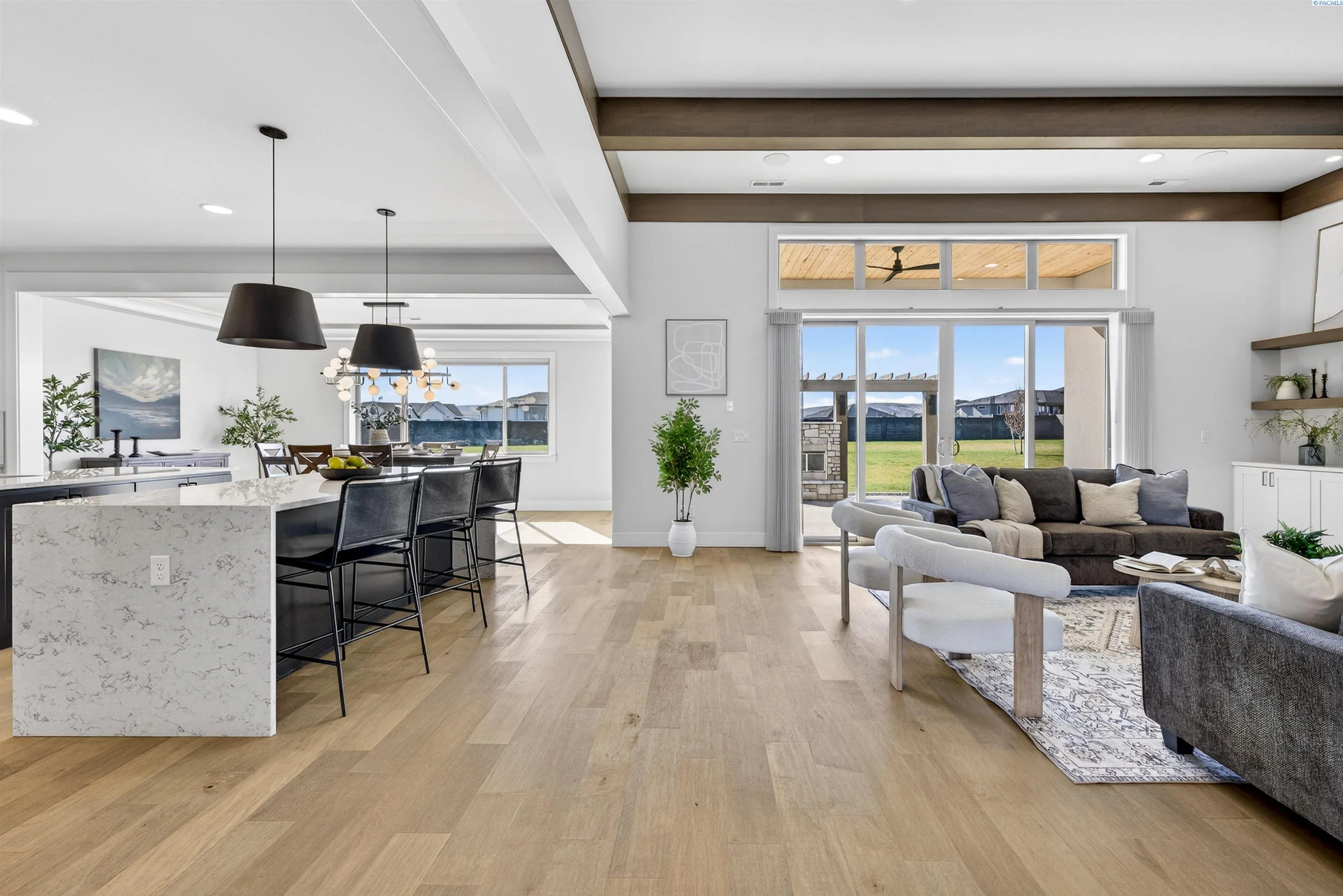 MLS# 290784 Parade of Homes™ Award Winner located in the prestigious Steeplechase neighborhood of SW Kennewick. This 2022-built single-level luxury home offers refined living on a fully fenced one-acre lot with sweeping skyline views. Designed for both everyday comfort and elevated entertaining, the home features a grand entry, 3 bedrooms, 2.5 bathrooms, office space, and a 4-car garage with integrated RV bay and pull-through driveway – ideal for RV owners, car enthusiasts, or those needing additional storage and flexibility. The striking stucco and stone exterior, expansive driveway, and manicured landscaping create impressive curb appeal, while inside soaring wood-beamed ceilings, a dramatic floor-to-ceiling fireplace, and expansive windows fill the open-concept living space with natural light. Large sliding glass doors extend seamlessly to a covered patio with outdoor fireplace, creating true indoor-outdoor living. The kitchen is thoughtfully designed with dual oversized islands for seamless hosting, quartz countertops with waterfall edge, gas range with pot filler, custom hood, double ovens, walk-in pantry, and extensive cabinetry, while a dedicated wine and beverage alcove with French glass doors, prep sink, and beverage cooler enhances entertaining. The private primary suite offers a spa-like retreat with an award-winning en-suite bath featuring a soaking tub, walk-in tiled shower, dual vanities, water closet, and spacious walk-in closet. Two additional bedrooms share a well-appointed ensuite, and the versatile office area provides space for remote work, fitness, study, or creative use. High-end window coverings, premium appliances, new gutters, and updated fascia add to the home’s quality and care. The expansive one-acre lot provides room to build a detached shop, add a custom pool, or simply enjoy the privacy and open space that is increasingly rare in Tri-Cities real estate. This is luxury single-story living with acreage, RV parking, modern design, and award-winning craftsmanship in SW Kennewick.