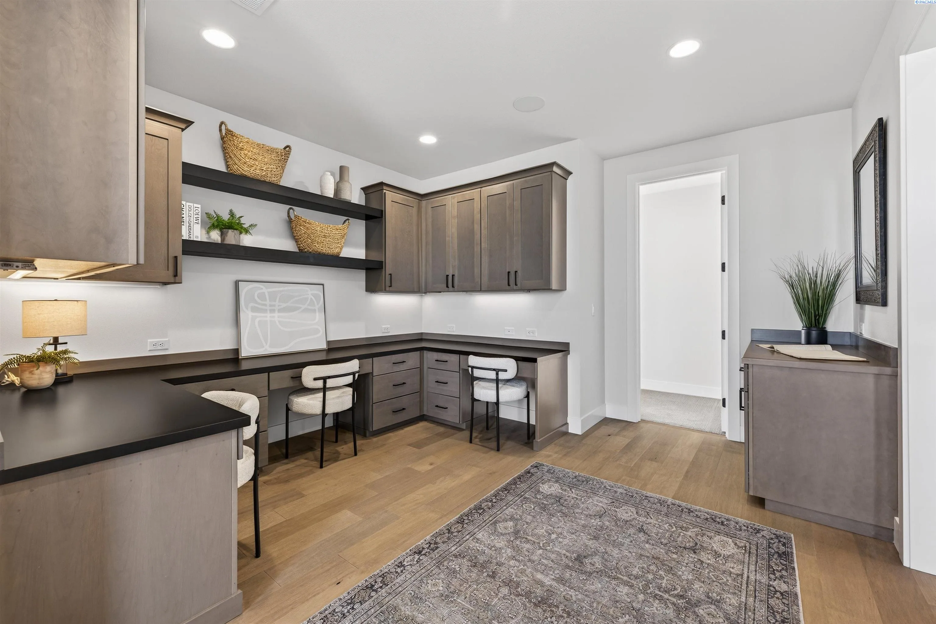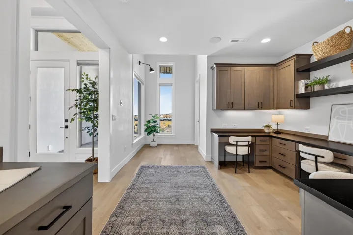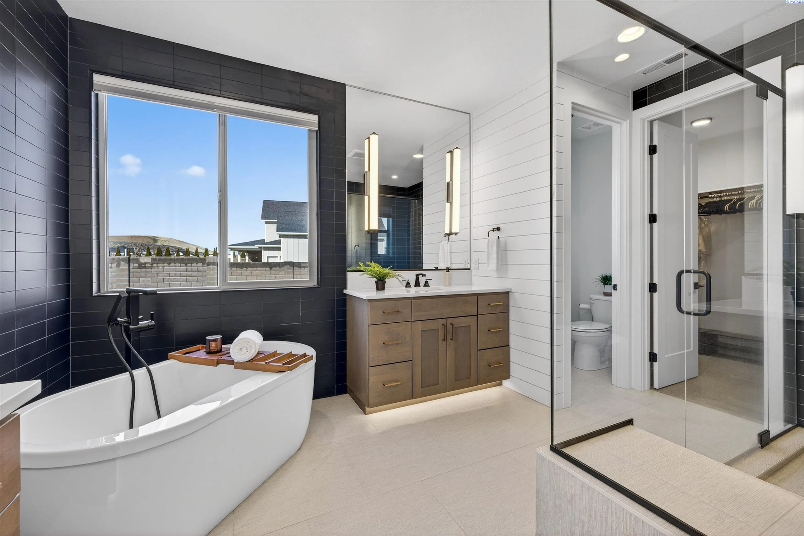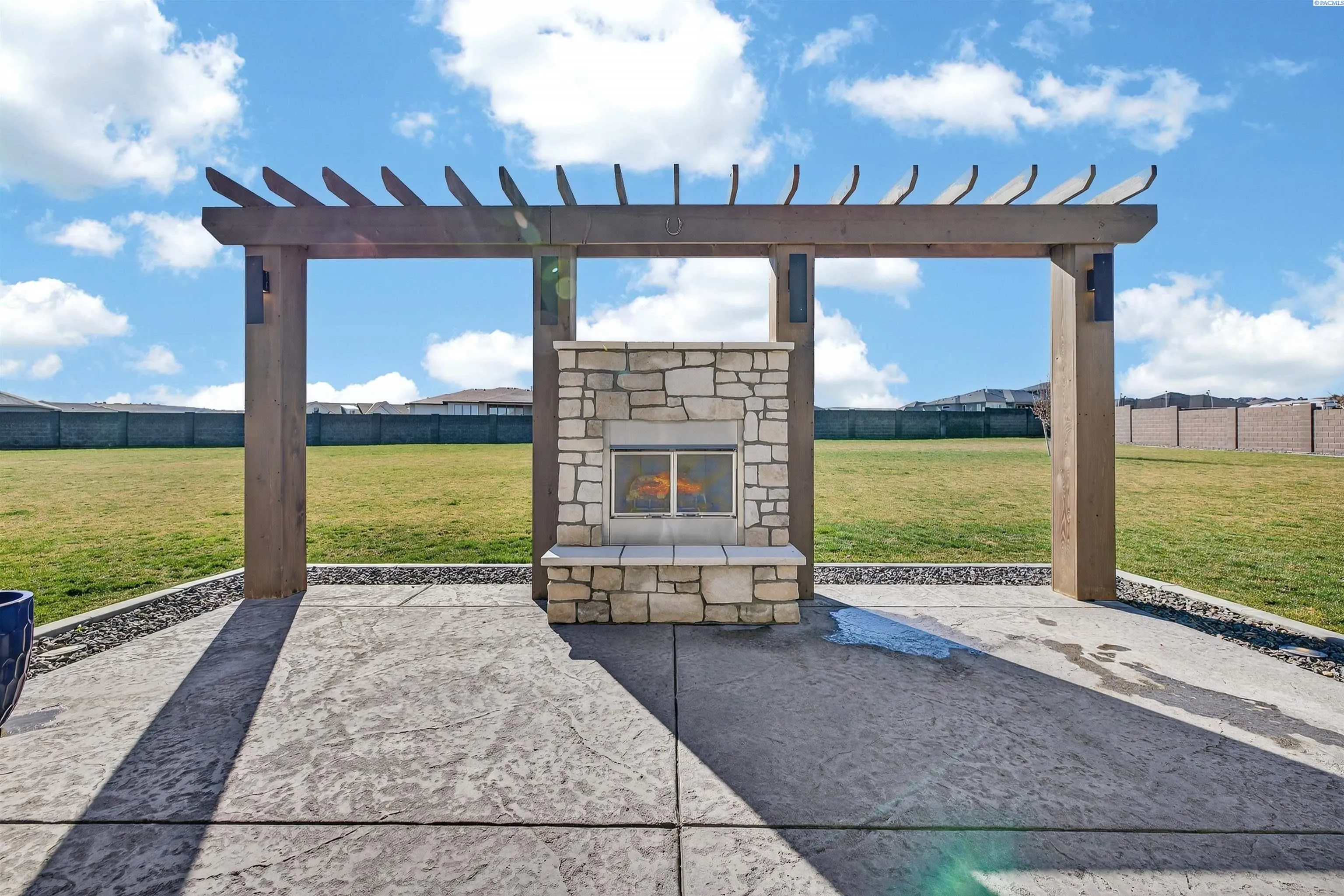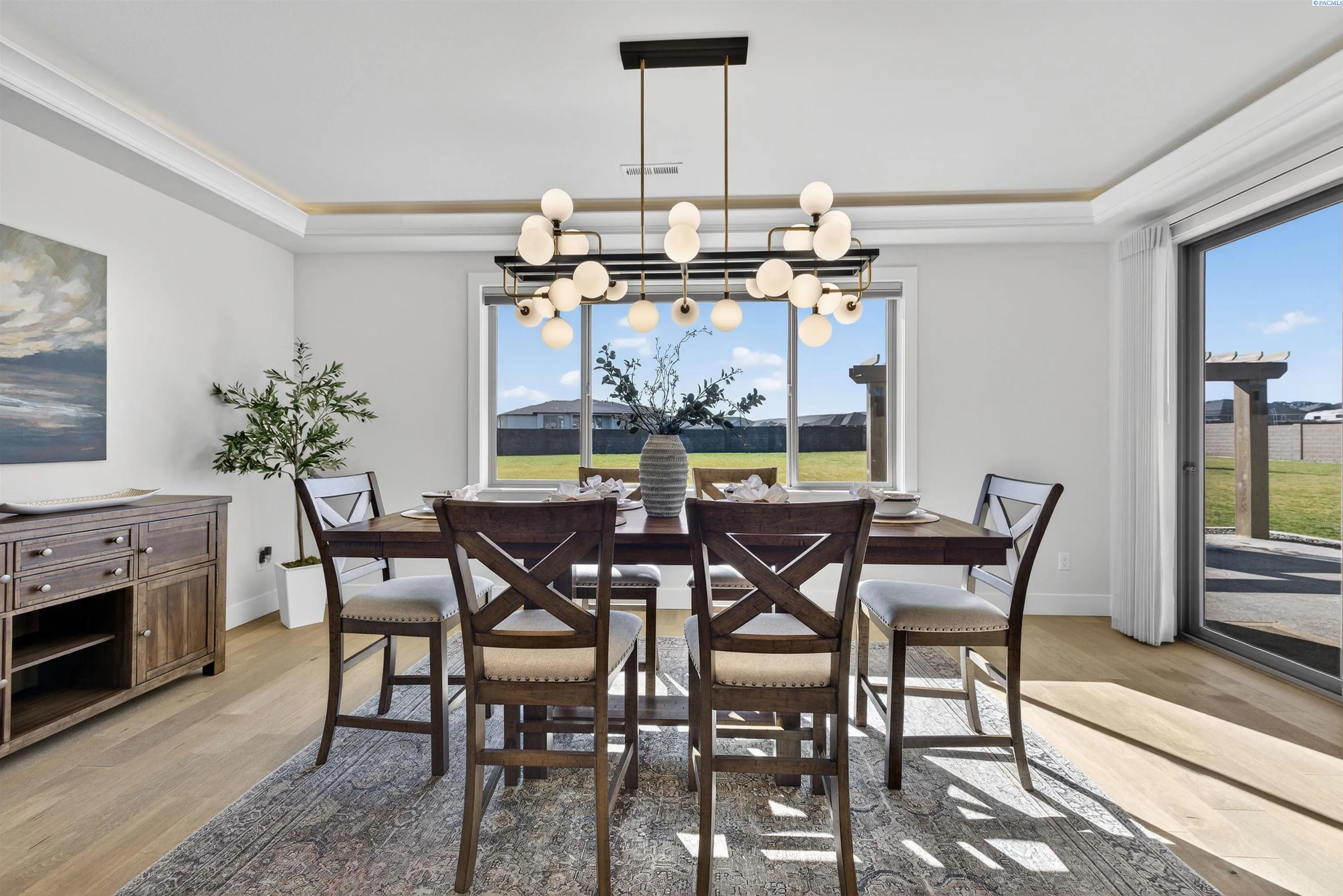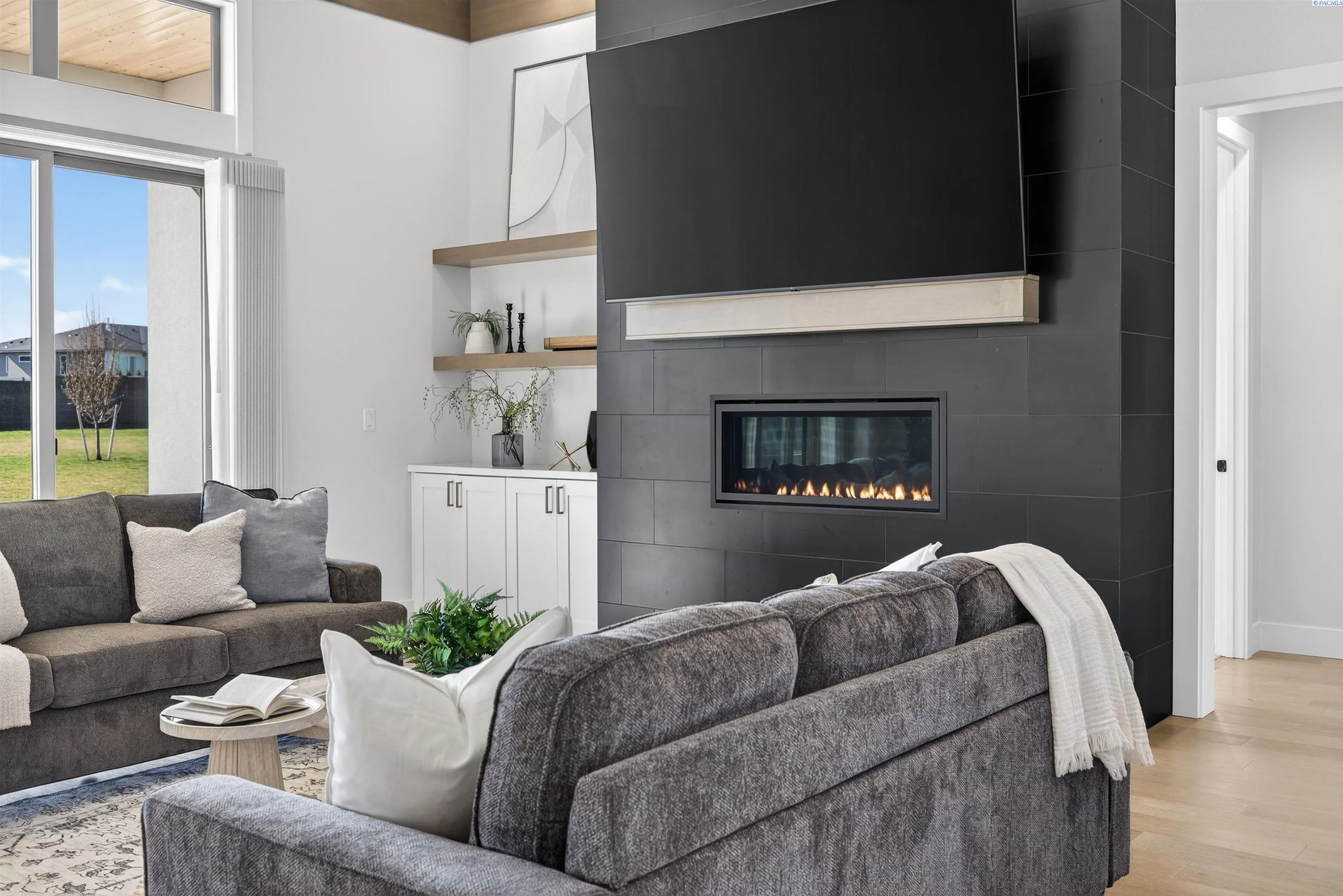 MLS# 290784 Parade of Homes™ Award Winner located in the prestigious Steeplechase neighborhood of SW Kennewick. This 2022-built single-level luxury home offers refined living on a fully fenced one-acre lot with sweeping skyline views. Designed for both everyday comfort and elevated entertaining, the home features a grand entry, 3 bedrooms, 2.5 bathrooms, office space, and a 4-car garage with integrated RV bay and pull-through driveway – ideal for RV owners, car enthusiasts, or those needing additional storage and flexibility. The striking stucco and stone exterior, expansive driveway, and manicured landscaping create impressive curb appeal, while inside soaring wood-beamed ceilings, a dramatic floor-to-ceiling fireplace, and expansive windows fill the open-concept living space with natural light. Large sliding glass doors extend seamlessly to a covered patio with outdoor fireplace, creating true indoor-outdoor living. The kitchen is thoughtfully designed with dual oversized islands for seamless hosting, quartz countertops with waterfall edge, gas range with pot filler, custom hood, double ovens, walk-in pantry, and extensive cabinetry, while a dedicated wine and beverage alcove with French glass doors, prep sink, and beverage cooler enhances entertaining. The private primary suite offers a spa-like retreat with an award-winning en-suite bath featuring a soaking tub, walk-in tiled shower, dual vanities, water closet, and spacious walk-in closet. Two additional bedrooms share a well-appointed ensuite, and the versatile office area provides space for remote work, fitness, study, or creative use. High-end window coverings, premium appliances, new gutters, and updated fascia add to the home’s quality and care. The expansive one-acre lot provides room to build a detached shop, add a custom pool, or simply enjoy the privacy and open space that is increasingly rare in Tri-Cities real estate. This is luxury single-story living with acreage, RV parking, modern design, and award-winning craftsmanship in SW Kennewick.