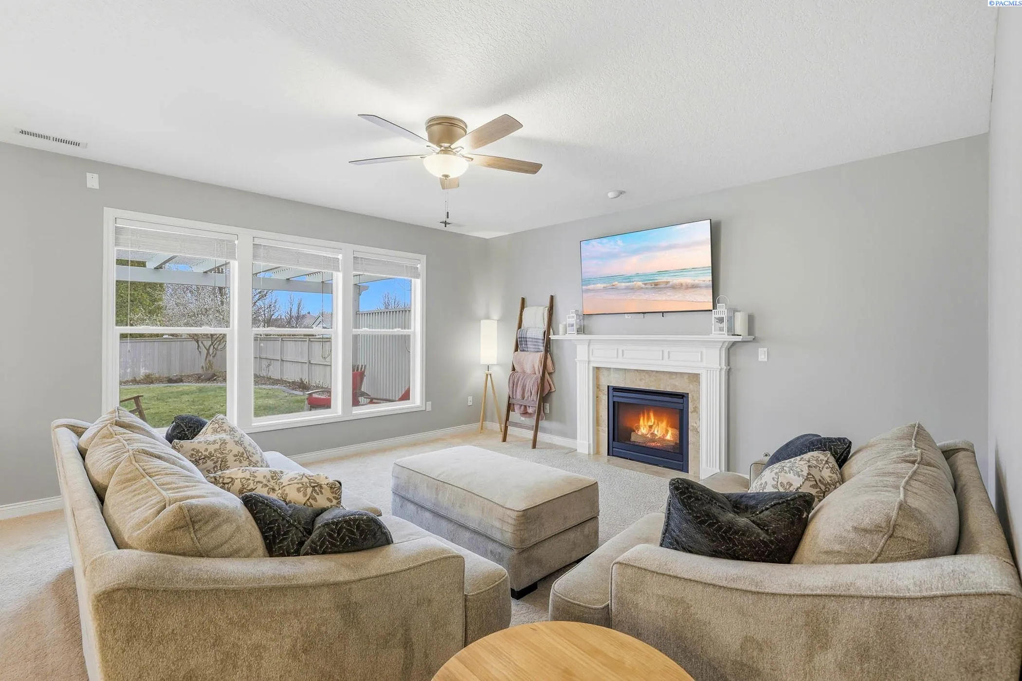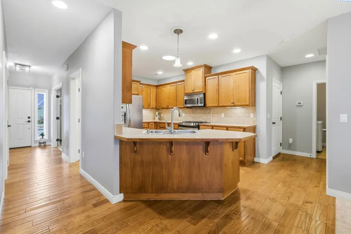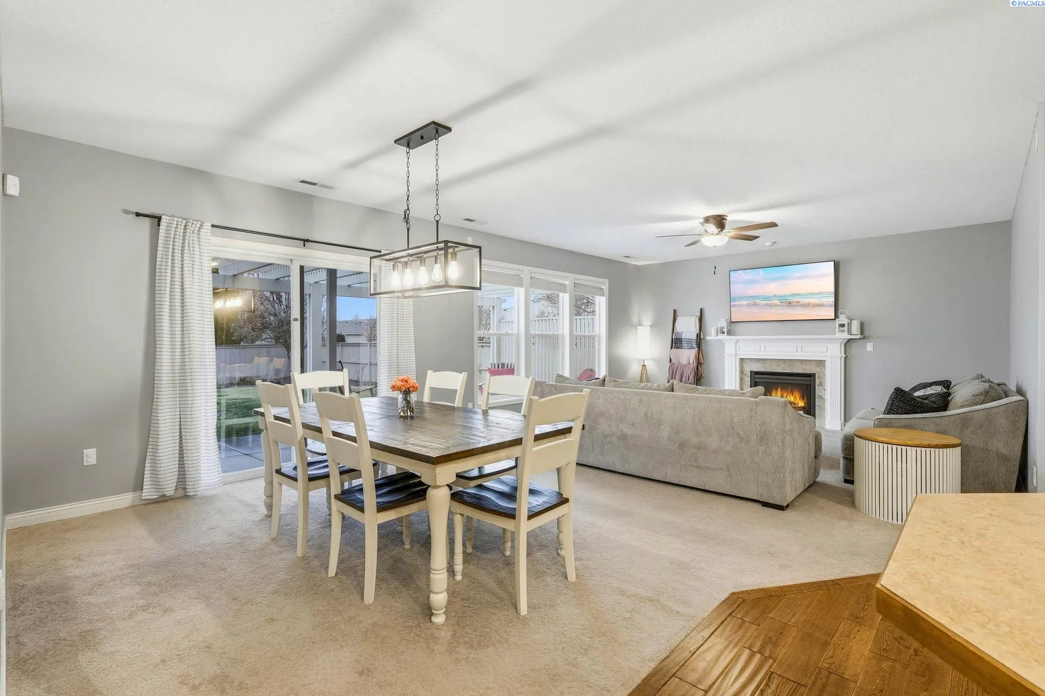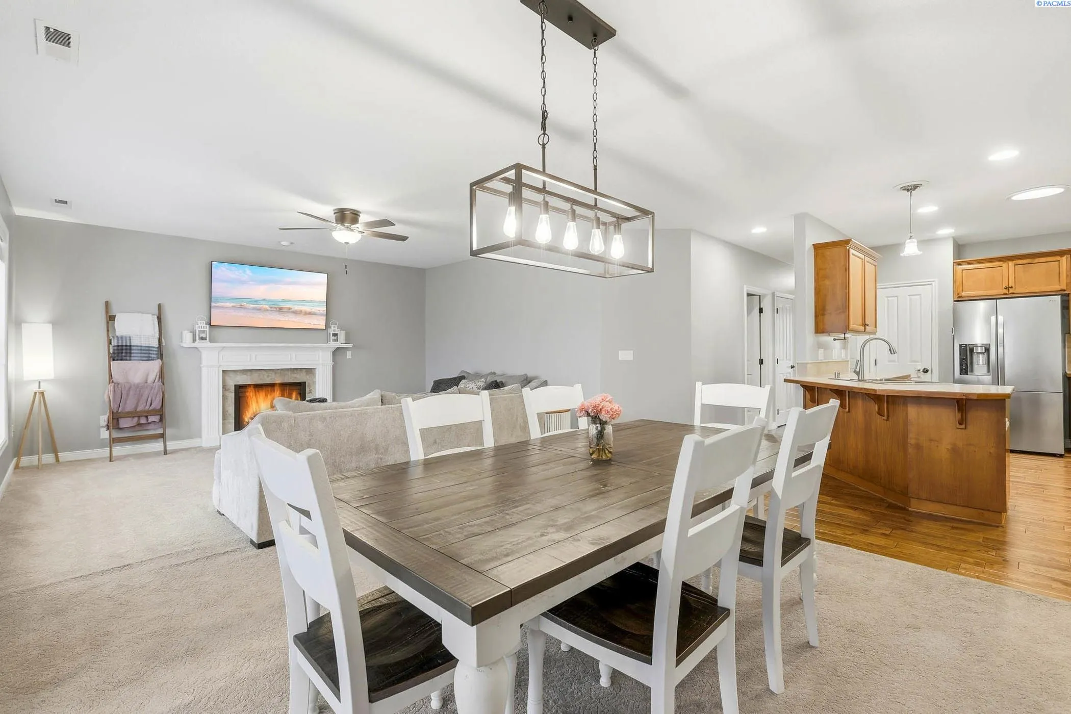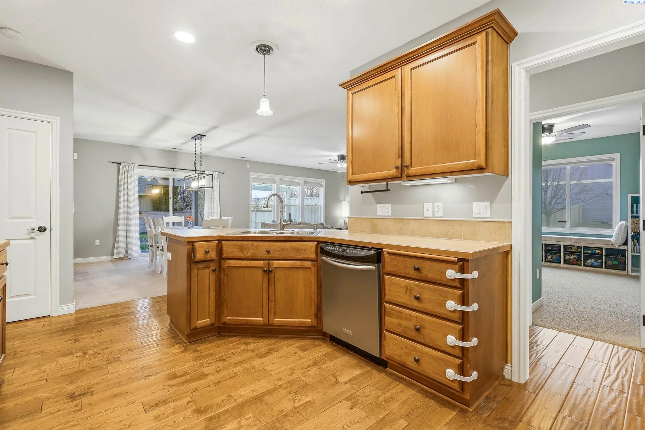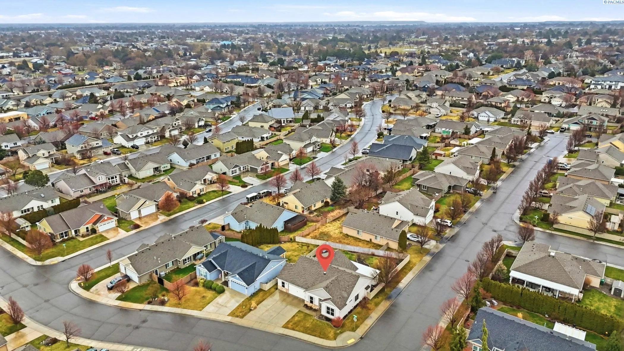 Located in the highly sought-after Creekstone community of Kennewick, this lovely one-level home offers 1822 SF with 3 bedrooms, 2 bathrooms and a versatile flex room. The open-concept great room features a custom mantel and flows seamlessly into the dining nook and kitchen. The kitchen includes a convenient breakfast bar, stainless steel appliances, abundant cabinetry, pantry and an additional storage closet for everyday organization. Hardwood flooring highlights the entry, hallway and breakfast nook, adding warmth and durability to high-traffic areas. Set on a .21 acre fully irrigated and fenced corner lot, the back yard is designed for year-round enjoyment with a covered patio ideal for gatherings and outdoor dining. The oversized 2-car garage includes an additional 7′ of width, providing extra space for storage, hobbies or larger vehicles. A new water heater was installed in 2025 for added efficiency and peace of mind. Creekstone residents enjoy neighborhood walking trails, parks and access to gated RV storage. Conveniently positioned in Kennewick near schools, shopping and dining, this property combines functional design, storage flexibility and outdoor space in a well-established community. Contact your favorite realtor to schedule a private tour soon!