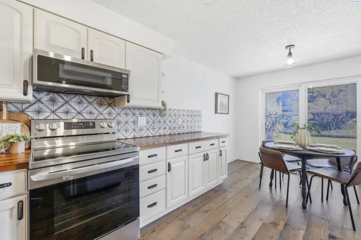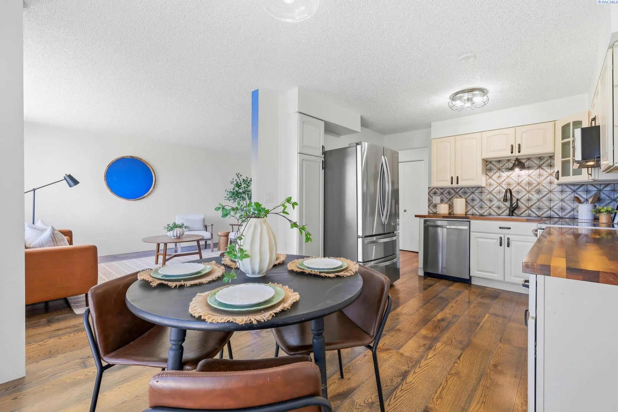 MLS# 290804 Welcome to an easy-care option for buyers who want condo living in a convenient location. Step inside and you’ll notice how the remodeled kitchen anchors the home. Butcher block countertops pair with a tile backsplash, added cabinetry, updated pulls and light fixtures, and newer appliances creating a space that’s ready for weeknight meals or weekend hosting. The living room feels open and comfortable, with a large window that brings in natural light. Outside, enjoy a private patio bordered by a rose bush hedge ideal for morning coffee or a small container garden. When you want to cool off, the community pool is close by and easy to enjoy in the warmer months. A combined washer/dryer unit is included, adding everyday convenience. New HVAC in 2025. This home is a strong fit for first-time buyers, downsizers, or a couple looking for a simple layout and a central Kennewick location near churches, stores, hospitals, and schools. Neighbors are known to be friendly, and the community setting offers a connected feeling.