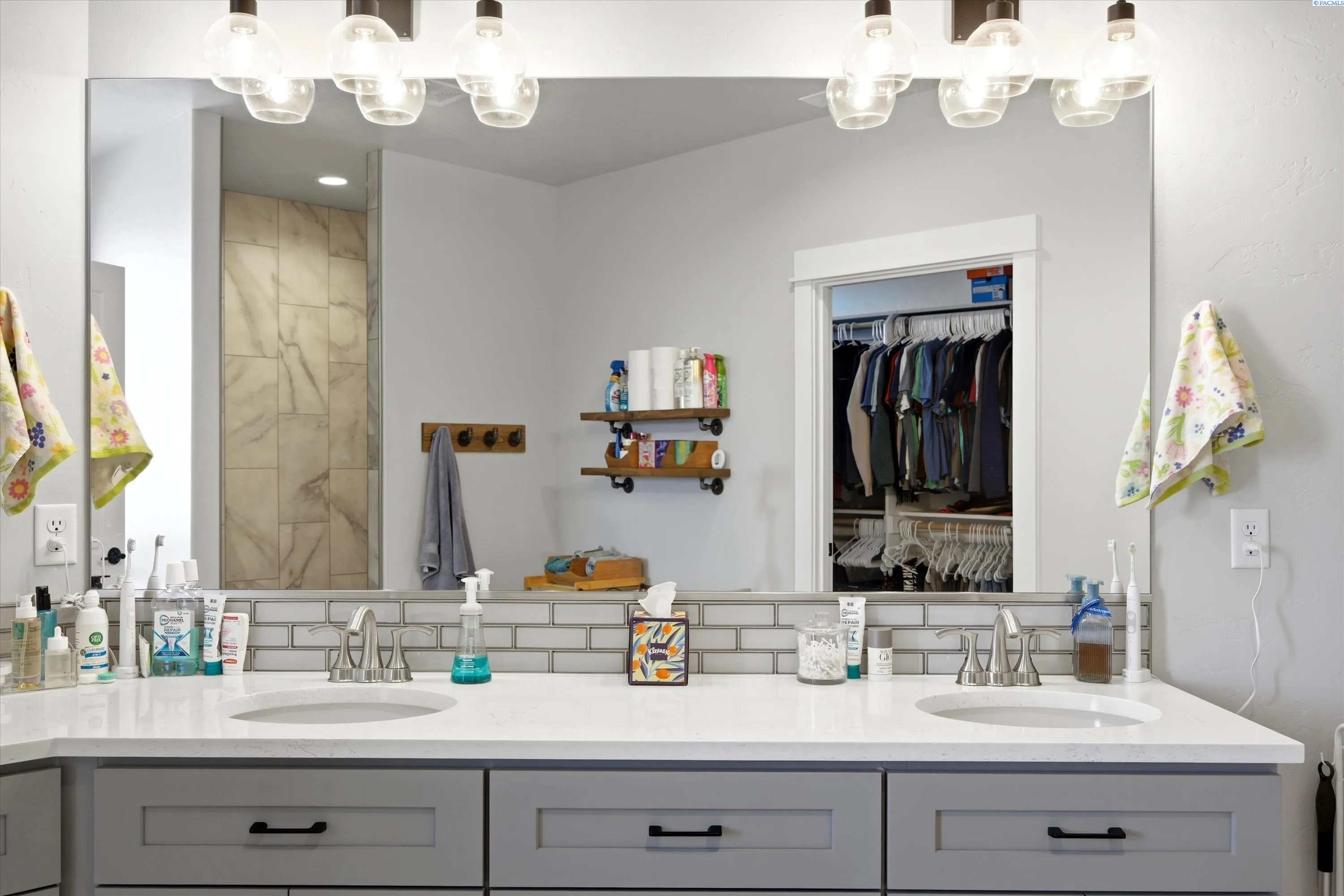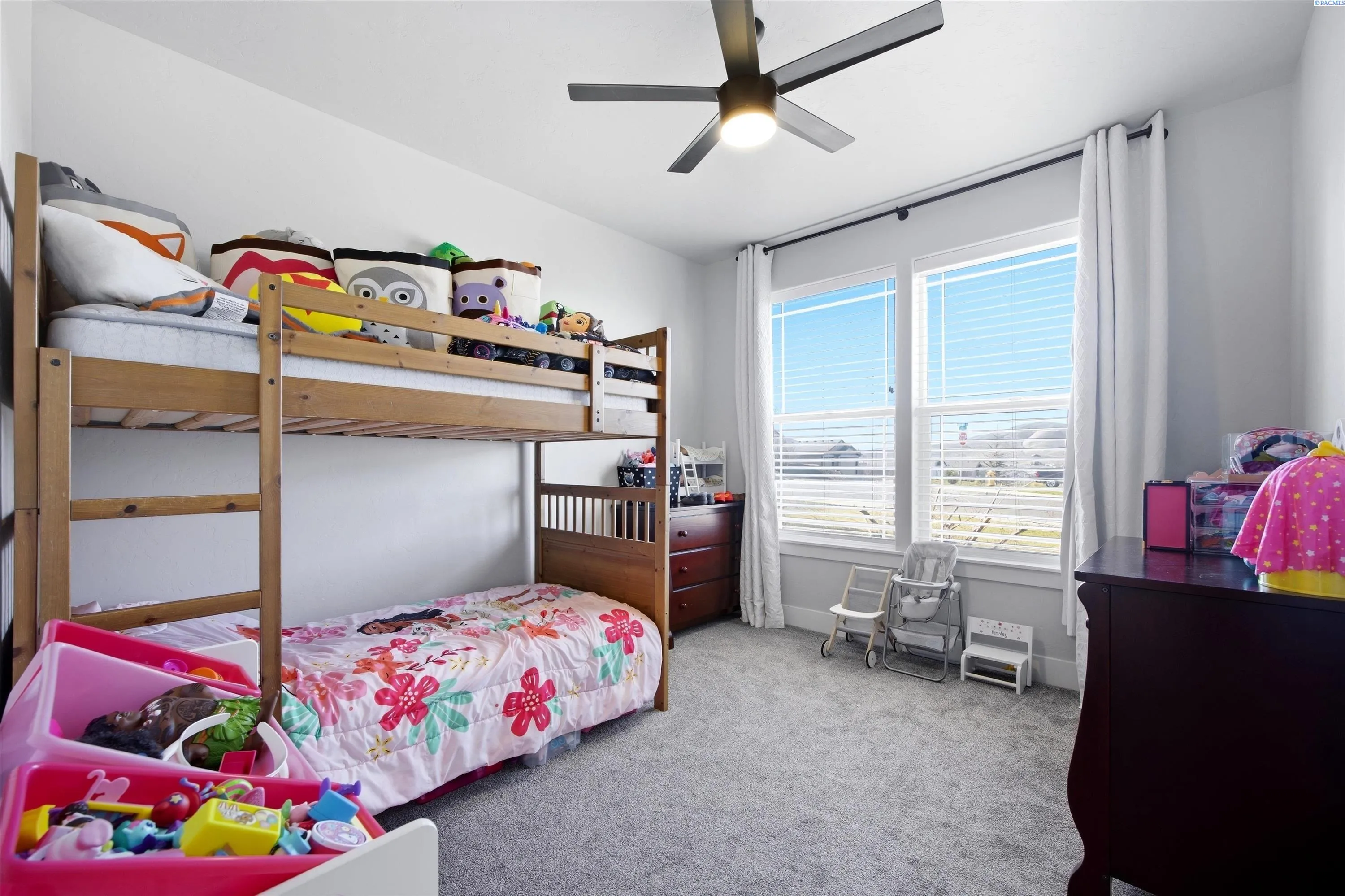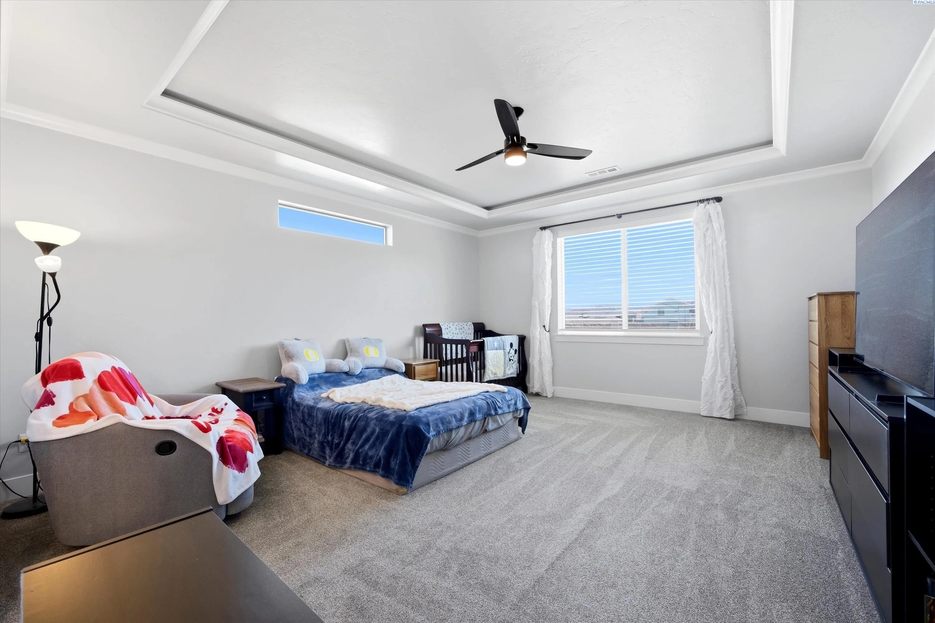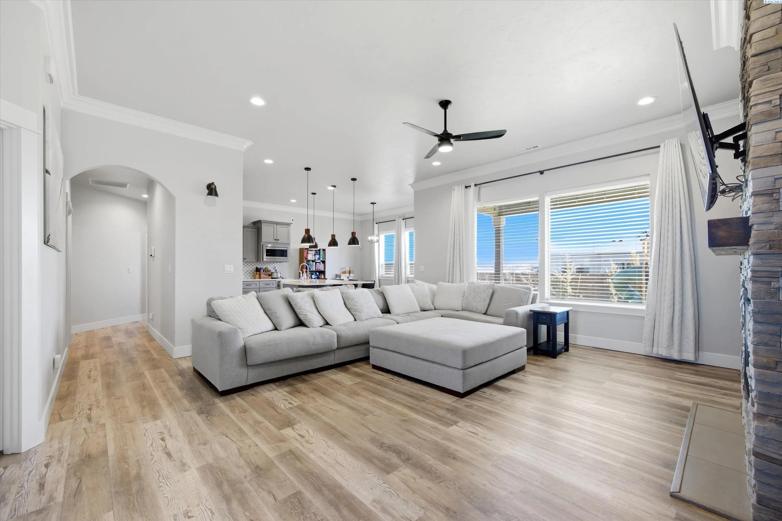Immaculate and extensively upgraded, this exceptional home offers refined open-concept living, elevated designer finishes—all in a location close to schools, parks, and shopping. This property delivers the space, quality, and lifestyle today’s buyers are searching for. From the moment you enter, you’re welcomed by light-filled interiors, custom trim detail, and durable wood-look flooring throughout the main living areas. The great room is anchored by a dramatic floor-to-ceiling stone fireplace with custom floating shelves—creating a stunning architectural focal point that feels both sophisticated and inviting. The kitchen is truly the heart of the home, thoughtfully designed for both everyday living and entertaining. Highlights include quartz countertops, an oversized island with seating, farmhouse sink, stainless steel appliances, custom cabinetry, a spacious pantry, pendant lighting, and a designer backsplash extending to the ceiling for a polished, upscale finish. The dining area flows seamlessly to the covered patio and fully fenced backyard, where extended concrete provides generous space for gatherings. Outdoors, unwind in the oversized hot tub while enjoying territorial views—your own private retreat at the end of the day. All bedrooms are conveniently located on the main level, including a luxurious primary suite featuring tray ceilings, expansive windows, and an oversized walk-in closet. The spa-inspired en-suite bath offers dual quartz vanities, abundant storage, and a beautifully tiled walk-in shower designed for comfort and relaxation. Upstairs, a generous bonus room provides flexible space ideal for a fifth bedroom, media room, office, gym, or playroom—offering separation without sacrificing main-level functionality. Additional highlights include a three-car garage with extra side parking (and a double gate for security), providing ample room for vehicles, toys, or guests. Meticulously maintained and thoughtfully designed, this home combines timeless style, functional space, and exceptional outdoor living—an outstanding opportunity in a highly desirable location.