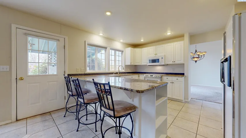 MLS# 290970 Tucked at the end of a cul-de-sac in the quiet Singing Woods neighborhood of SE Kennewick, this 3 BD 3 BA home offers a perfect blend of character, comfort, and privacy. With inviting curb appeal, a masonry brick front porch, and charming bay windows throughout, this home welcomes you with warmth and charm. Inside, the formal living and dining rooms provide gracious entertaining spaces, while the kitchen shines with granite counters, a breakfast bar, and a window overlooking the tranquil backyard. The adjacent family room features a cozy fireplace and a bay window framing views of the covered wooden deck—ideal for relaxing or entertaining. The primary suite is a peaceful retreat with vaulted ceilings, an ensuite featuring a corner jetted tub, separate shower, dual sink vanity, and a walk-in closet. The main hall bath includes a skylight, filling the space with natural light. A convenient laundry area with half bath is located off the garage entrance. Outside, the fully fenced backyard backs up to the schoolyard, ensuring no future neighbors and providing an extended area for play. Mature landscaping, garden space, a side yard, and the covered deck create a serene setting for outdoor enjoyment. Additional features include an attached oversized 2-car garage with workshop space and RV parking. This home offers a calm, relaxing lifestyle in a prime Kennewick location.
