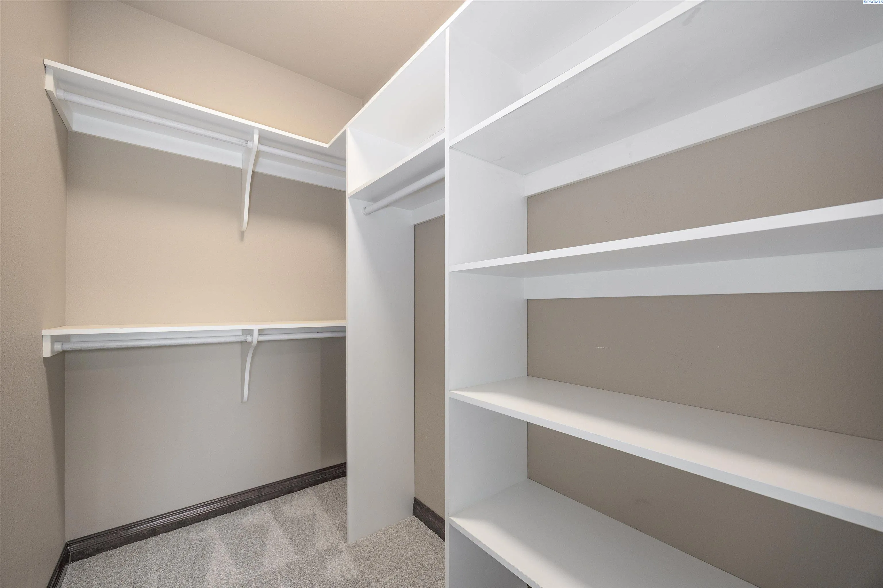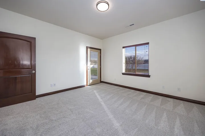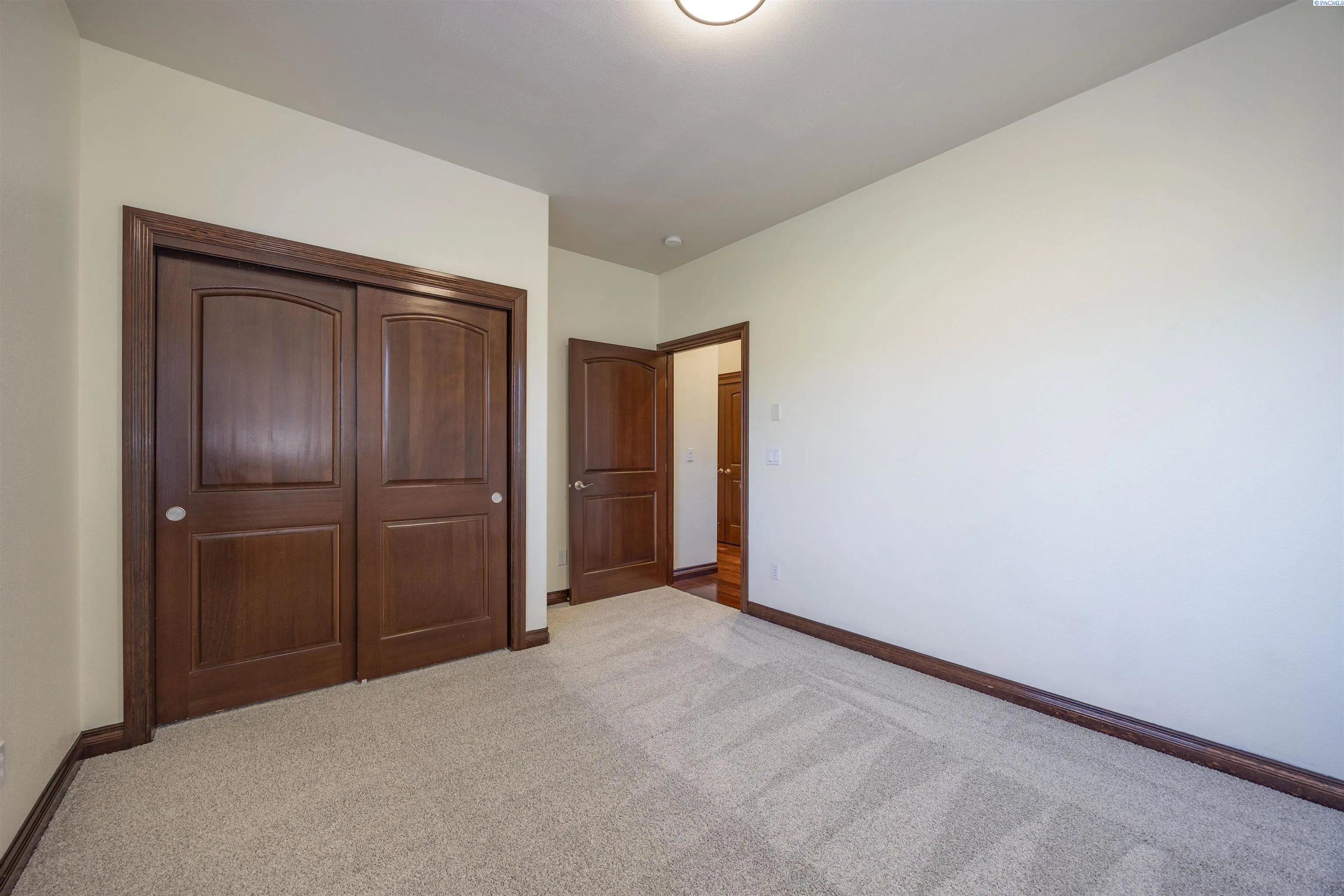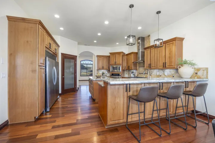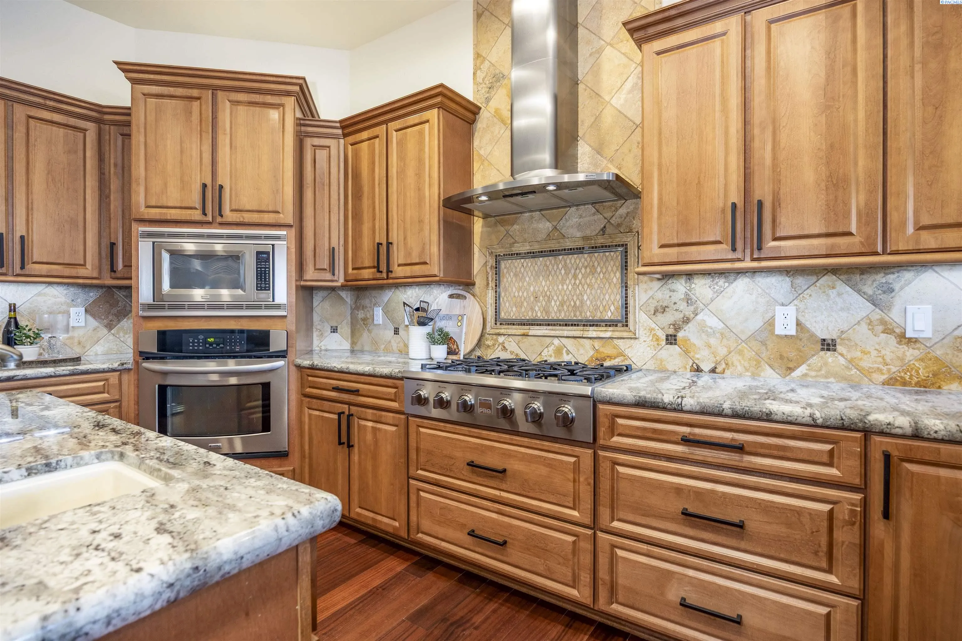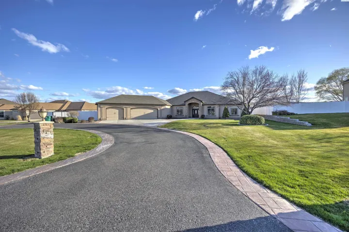 Nestled in the beautiful Cottonwood Creek neighborhood of Kennewick, this stunning single-level home sits on a picturesque .72-acre lot with exceptional curb appeal. A circular driveway and pristine landscaping welcome you to the property and set the tone for the quality found throughout. Step inside to a tiled entry that leads into gorgeous wood flooring with detailed inlay, art niches, and raised ceilings that create a bright and elegant atmosphere. The custom-designed interior showcases stained wood trim, solid-core doors, wood-wrapped windows, and beautiful Brazilian hardwoods that add warmth and character throughout the home. The spacious living room is both comfortable and inviting, centered around a striking stone gas fireplace with hearth and mantle. The kitchen is designed to impress, featuring custom wood cabinetry, granite countertops, a tiled backsplash, large island, stainless steel appliances including an extra-large refrigerator, and a gas range with hood. A large pantry with glass door, breakfast bar, and adjacent dining area with access to the covered patio make this space perfect for both everyday living and entertaining. The laundry room offers abundant cabinetry, generous granite counter space, and a convenient utility sink. The expansive primary suite provides a private retreat with a cozy gas fireplace, tray ceiling, a large custom closet, and a luxurious spa-like bathroom with soaking tub, oversized double-headed tiled shower, and dual vanities. A guest suite is thoughtfully positioned on the opposite end of the home for added privacy, while a dedicated office/den provides a quiet space for working from home. Designed with accessibility in mind, the home features wide hallways and 3-foot doorways throughout. Step outside to a serene, fully fenced and gated backyard with plenty of space for outdoor enjoyment and RV parking behind the gate. The massive covered patio overlooks the spacious yard and offers the perfect setting for relaxing or hosting gatherings. An oversized attached 3-car garage provides ample storage and room for hobbies or projects. Located in the peaceful Cottonwood Creek community, this exceptional home offers a quiet neighborhood setting with convenient access to schools, parks, and nearby highway access for commuters.