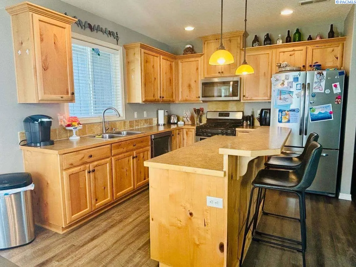 This Turn key home is centrally located in a very quiet subdivision in south Kennewick. Located on a street with virtually zero traffic . Beautiful 6 ft decorative Block wall with custom oversized metal gate surrounds the entire property giving it full privacy. Shade trees and multiple raised garden beds for gardening in the back yard. 9 ft ceilings with an open concept layout. New LVP flooring throughout entire home with new carpet in bedrooms. Many fixture updates including new dishwasher, and microwave. Entire home has been recently repainted inside and out. Large master bedroom with extra room for furniture, while still leaving room for a king size bed. Two car garage that comes with heavy duty metal shelving from floor to ceiling included with the sale. Paved paths throughout entire neighborhood with two community parks with basketball courts and playgrounds. Entire community maintained including large common areas. Large maintained grass fields for activities. Private gated parking for boats/trailers/RV’s for members of the community.