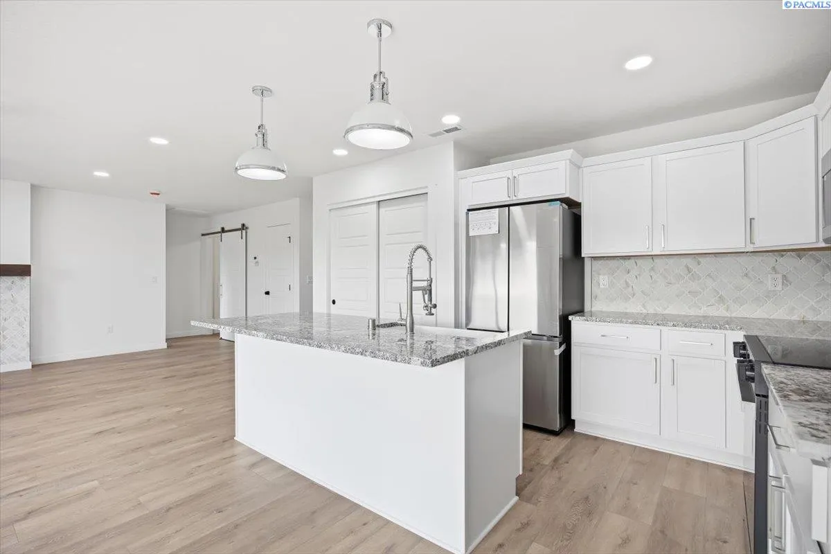 MLS# 291125 Welcome to your brand-new home in West Kennewick, built with pride by Muzzy Construction. This home is perfectly located directly across the street from the Desert Hills Middle School playfields, giving you a wonderful sense of open space and easy access to outdoor fun. Inside, you will find a great layout with 3 bedrooms and 2 bathrooms. The kitchen features gorgeous quartz countertops and custom cabinets that give plenty of storage. High-quality LVP flooring runs through the main living areas, providing a modern look that is also very easy to clean. The home includes a large 3-car garage, for those cars and extra gear (or just a lot of storage and leave the cars outside). When you want to head out back, you can relax on the covered back patio that stays shaded and comfortable throughout the day. This home is currently under construction (pictures are of another home completed recently in the same neighborhood – shows what great finishes are put into this home), which means you get to be the very first person to live in it. It combines a great location with high-end finishes that make it stand out from the rest. Don’t miss your chance to own a quality home in a fantastic neighborhood.Welcome home to Talon Heights!