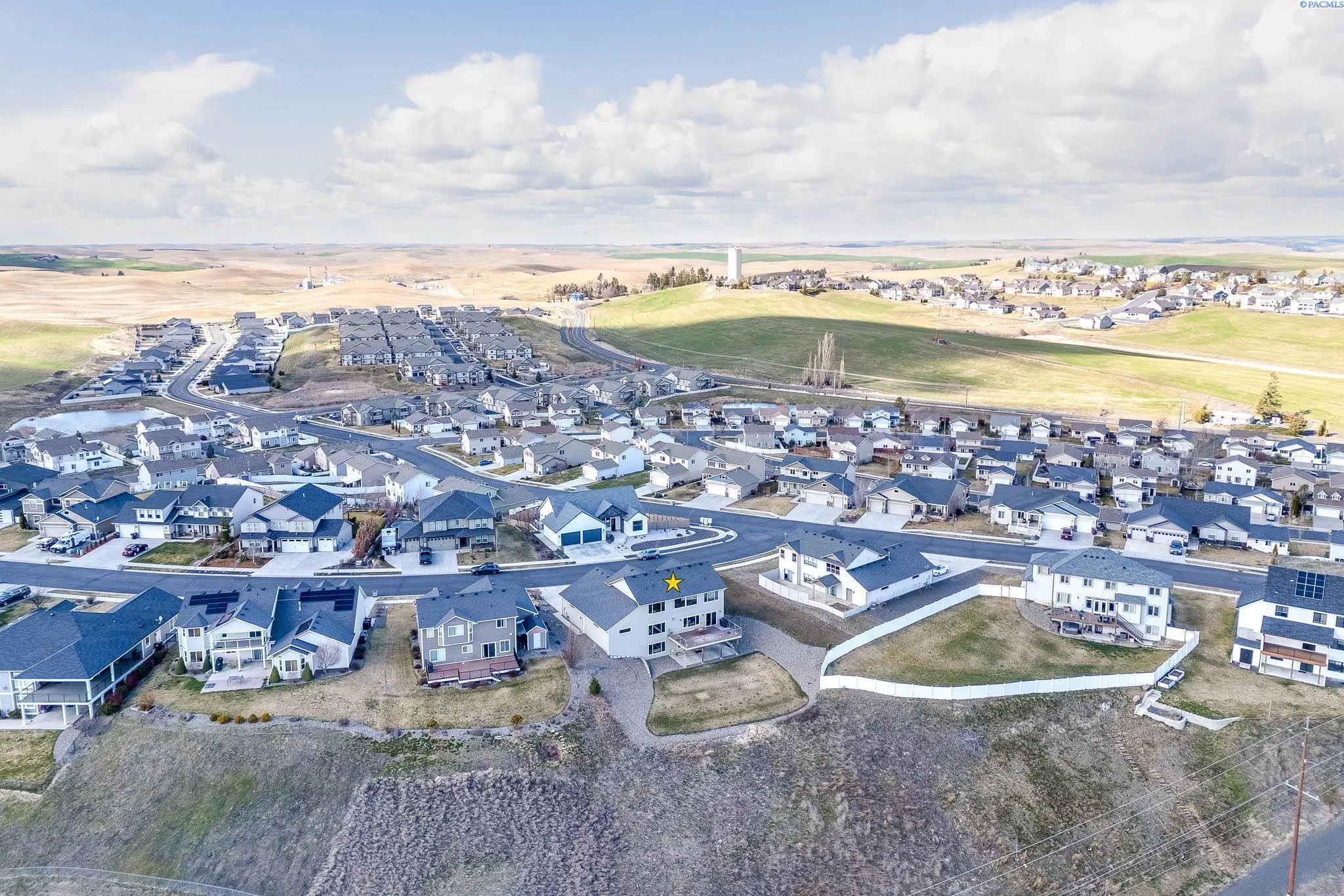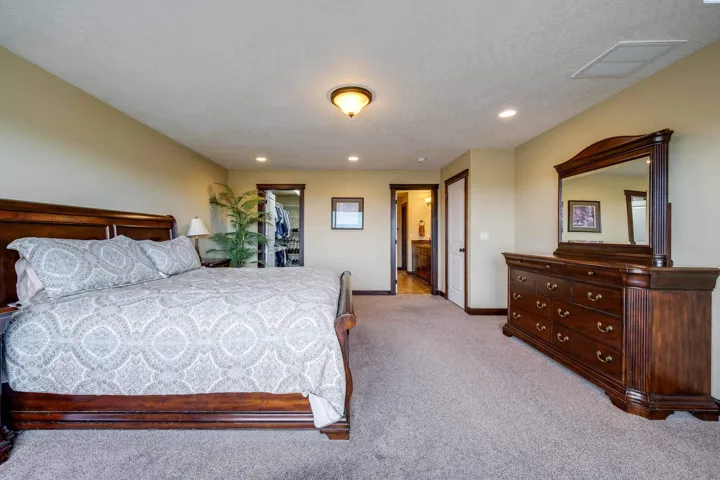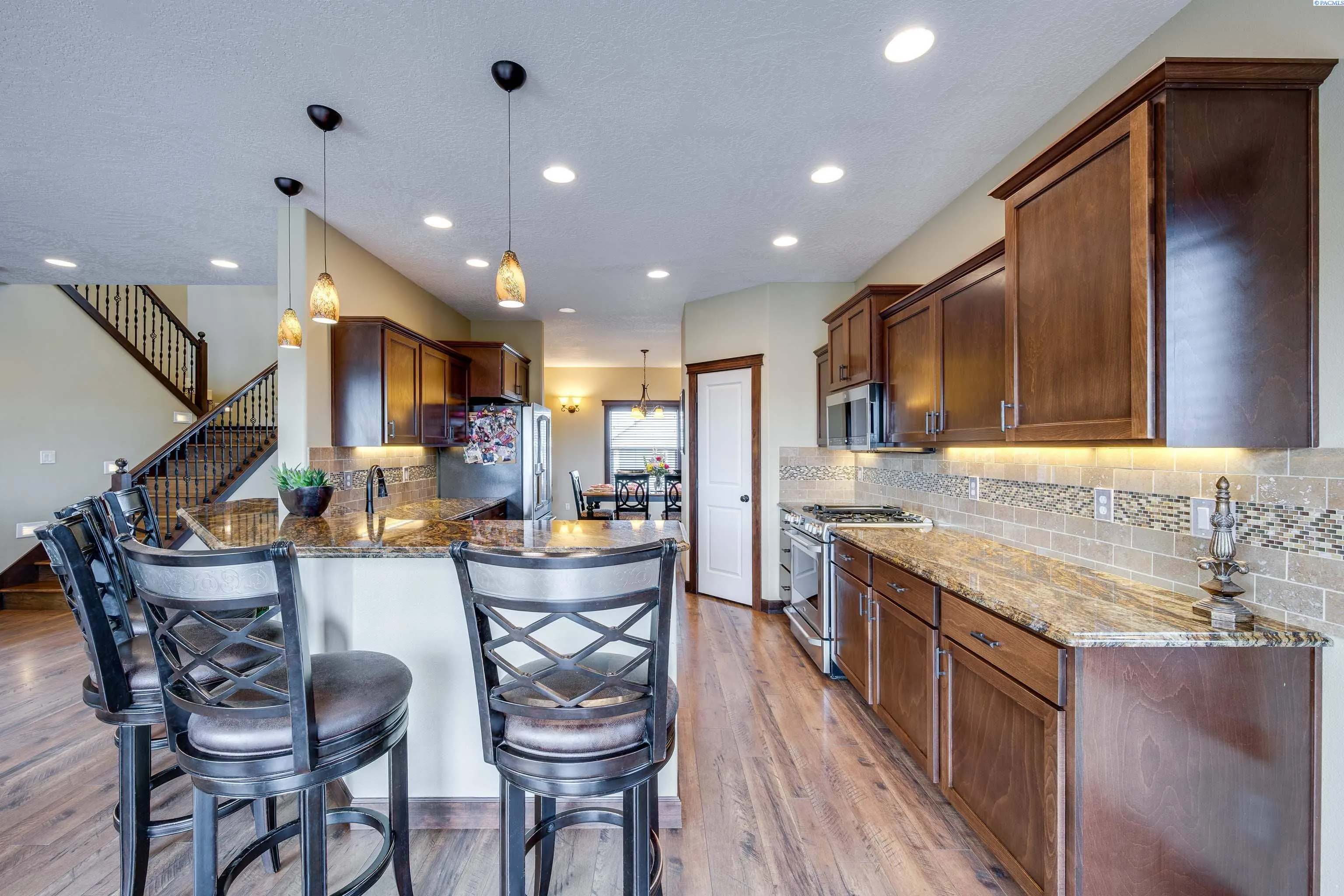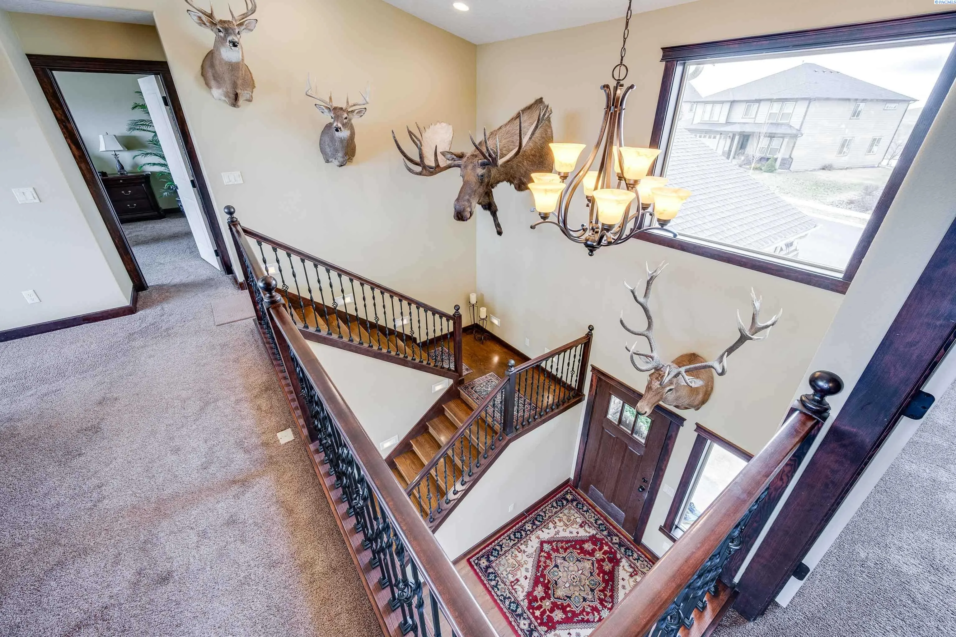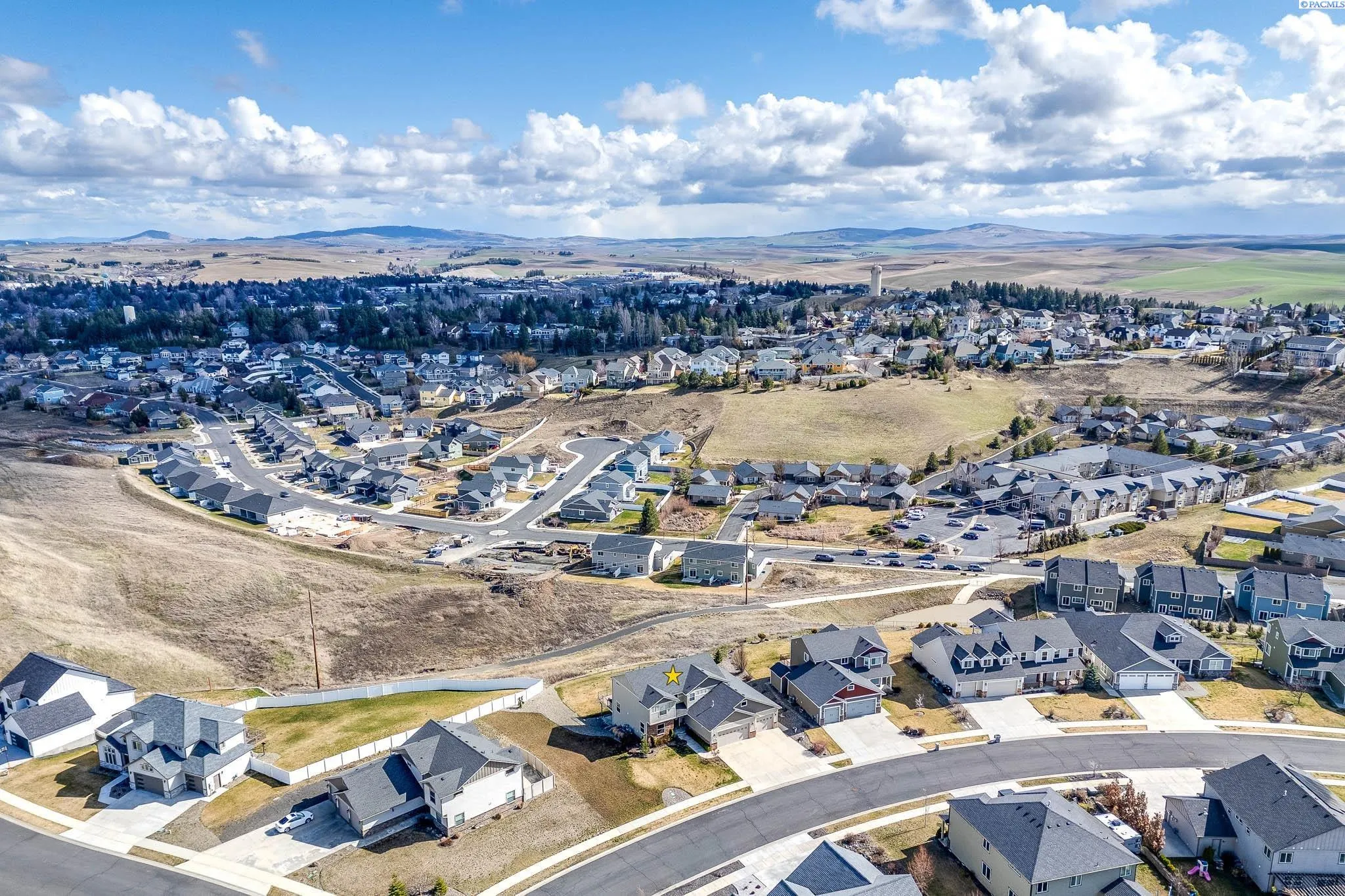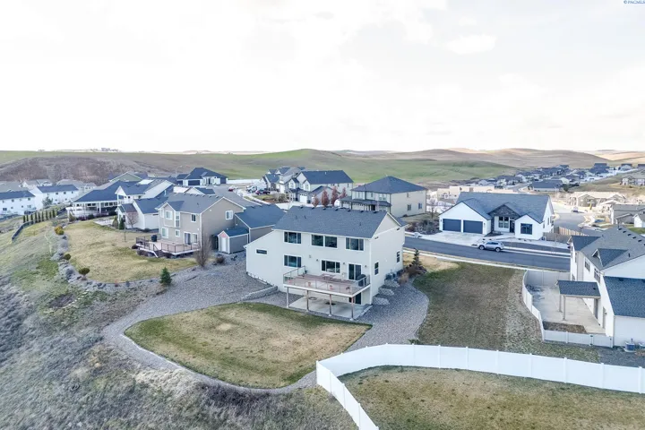 Perched above the city on a spacious 28,000 sq ft lot, this home offers beautiful, unobstructed views of the WSU campus, Moscow Mountain, and the lights of Pullman below. Located in a quiet cul-de-sac, the property provides a sense of privacy while still being close to town. The home features quality finishes throughout, including granite countertops in the kitchen and all bathrooms, tiled flooring, and thoughtful architectural details. Living spaces are arranged across three levels, many positioned to take advantage of the surrounding views and natural light. Designed with flexibility in mind, the home includes two primary suites, each with walk-in closets and ensuite bathrooms featuring soaking tubs and separate showers. The top-floor family room offers vaulted ceilings and large windows that create a bright and comfortable gathering space. Outdoor living is highlighted by a large view deck, ideal for enjoying sunsets, morning coffee, or entertaining guests. The property also includes an oversized four-car garage, with a 51-foot-deep third bay that provides excellent space for storage, a workshop, or recreational vehicles. Additional features include dual HVAC systems for efficient climate control and a private lower-level office, well suited for working from home. With four full bathrooms and one half bath, the home offers both comfort and convenience for everyday living.