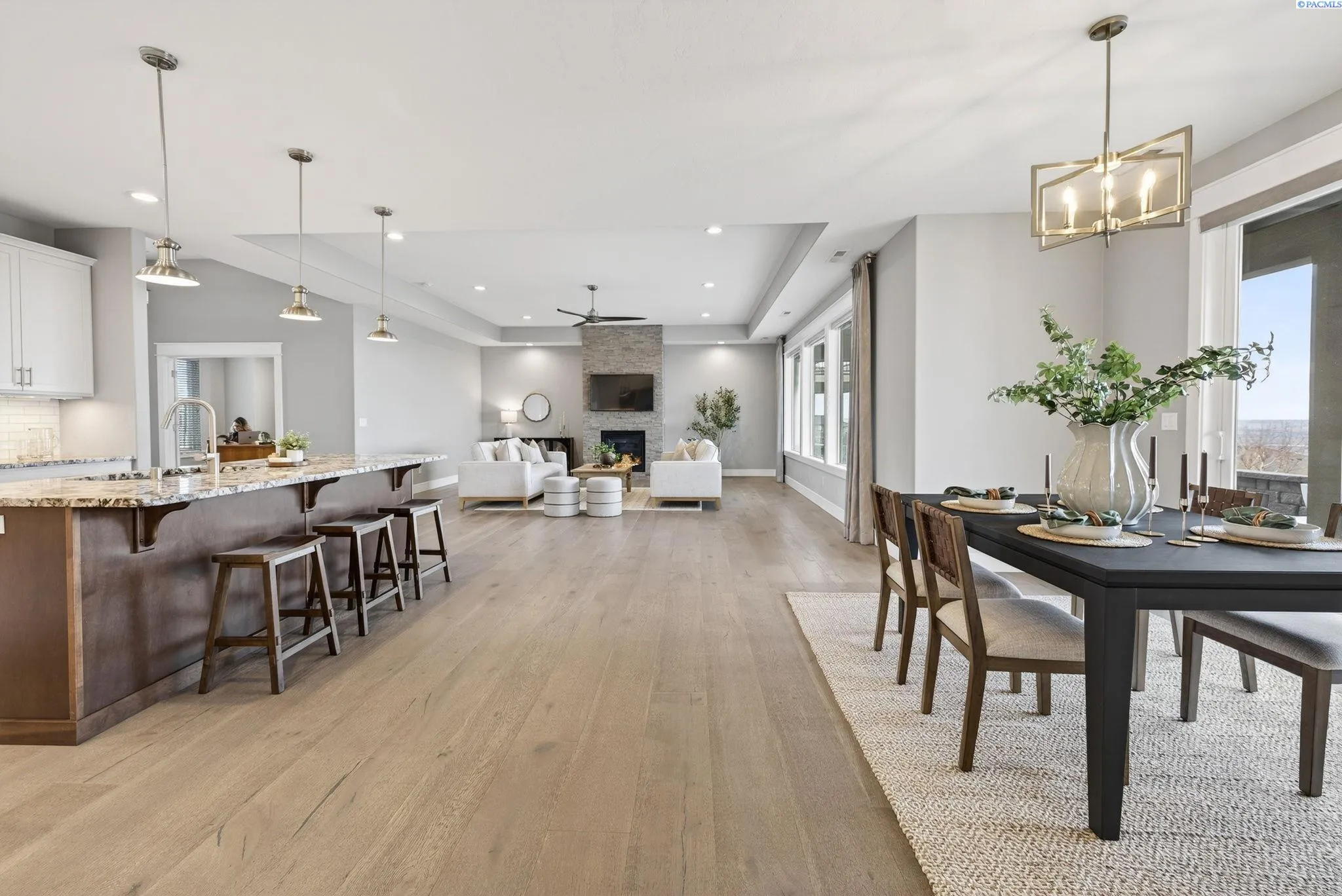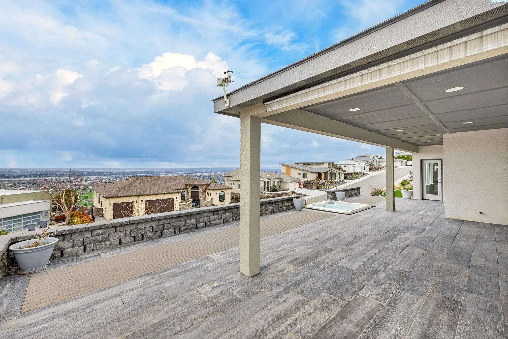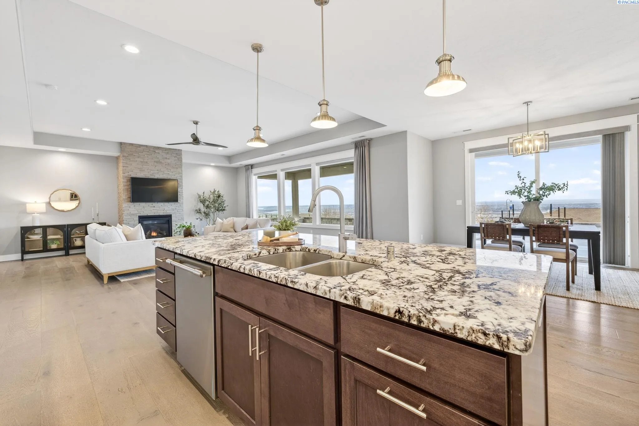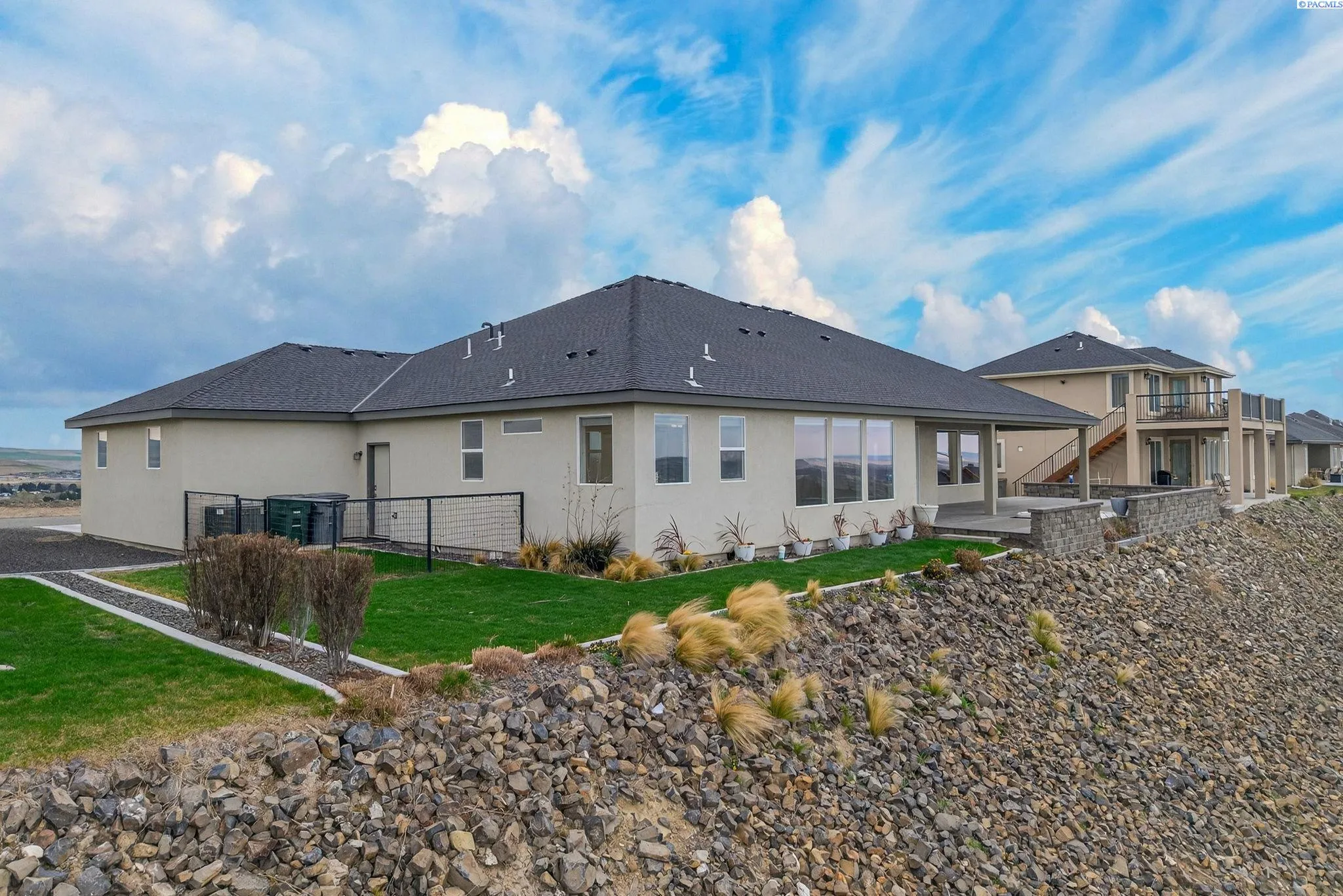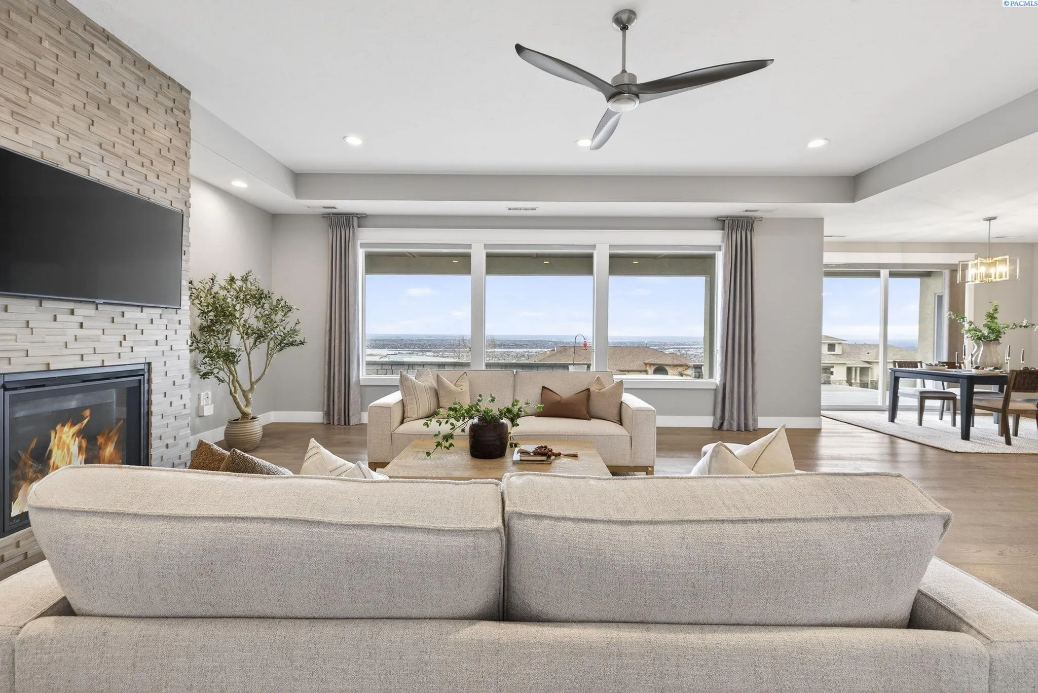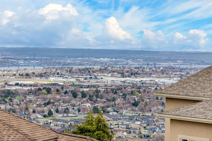 MLS# 291412 Experience the best views in the Tri-Cities from Falconcrest, South Richland, WA’s highest-elevation hilltop community, celebrated for panoramic vistas, breathtaking sunsets, and some of the area’s most limited turnover. This beautifully maintained 3-bedroom + office, single-level home with zero-step living captures sweeping views from every room, creating a rare combination of comfort, convenience, and elevated scenery. Inside, natural light fills the open-concept living spaces. A striking floor-to-ceiling tiled gas fireplace anchors the living room, complementing the raised ceilings and creating a warm architectural focal point. The space flows seamlessly into a well-appointed kitchen featuring quartz countertops, a center island with seating, pantry, stainless steel appliances, and a dining area. The split-bedroom layout provides meaningful privacy throughout, with a large dedicated office ideal for remote work, a second living space, or an optional fourth bedroom. The private, generously sized primary suite offers a true retreat, complete with double vanities, soaking tub, step-in tiled shower, walk-in closet, and direct access to the covered patio for quiet mornings or golden evenings. Two additional well-appointed bedrooms occupy their own separate quarters and share an updated full bathroom with double sinks and a tiled walk-in shower plus tub. Step outside to an expansive custom covered patio designed for year-round entertaining and relaxation, complete with an integrated hot tub overlooking the Tri-Cities. The low-maintenance yard is intentionally designed to maximize enjoyment while minimizing upkeep, leaving more time to take in the spectacular sunrises, sunsets, and front-row views of the annual fireworks and air show. Quality upgrades include Andersen windows for enhanced energy efficiency, a tankless water heater, and a gas range. The large laundry and mud room connects to an oversized three-car finished garage with built-in storage racks for vehicles, recreational equipment, and projects. Falconcrest has earned a prestigious reputation among Tri-Cities neighborhoods, and it’s easy to see why. Located in South Richland, just 7 minutes to the Badger Mountain Trailhead and 11 minutes to Costco and Target, this single story home offers convenient access to dining, professional services, and outdoor recreation, while maintaining the peaceful atmosphere of one of the area’s most coveted communities.