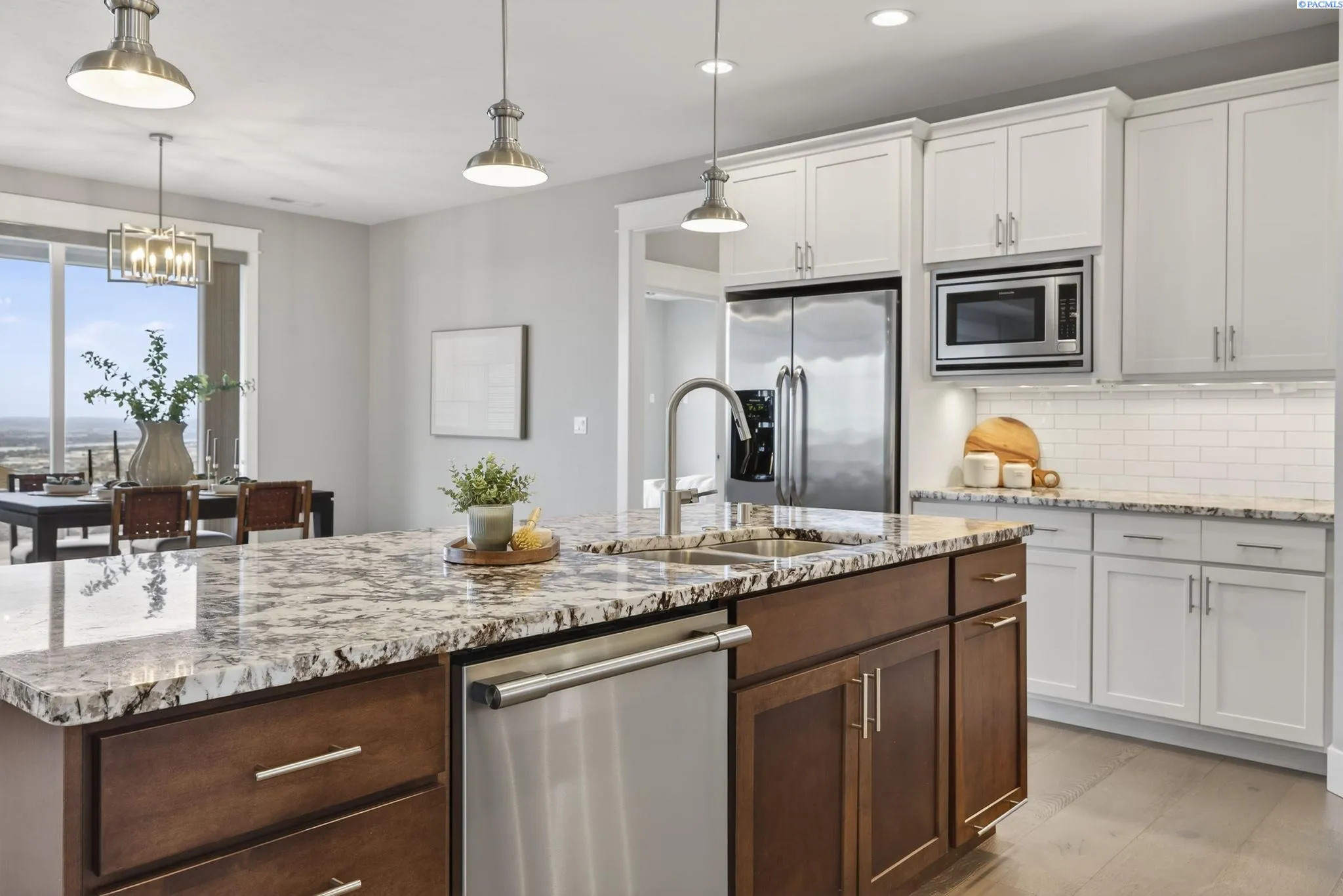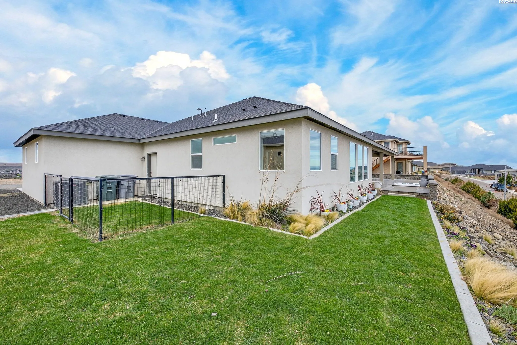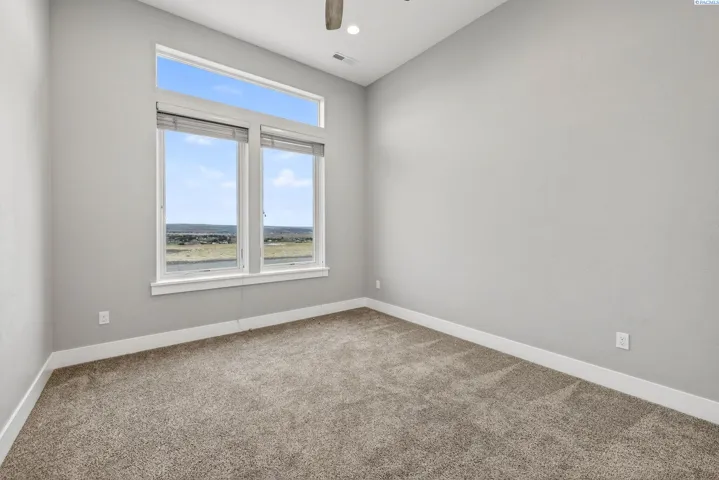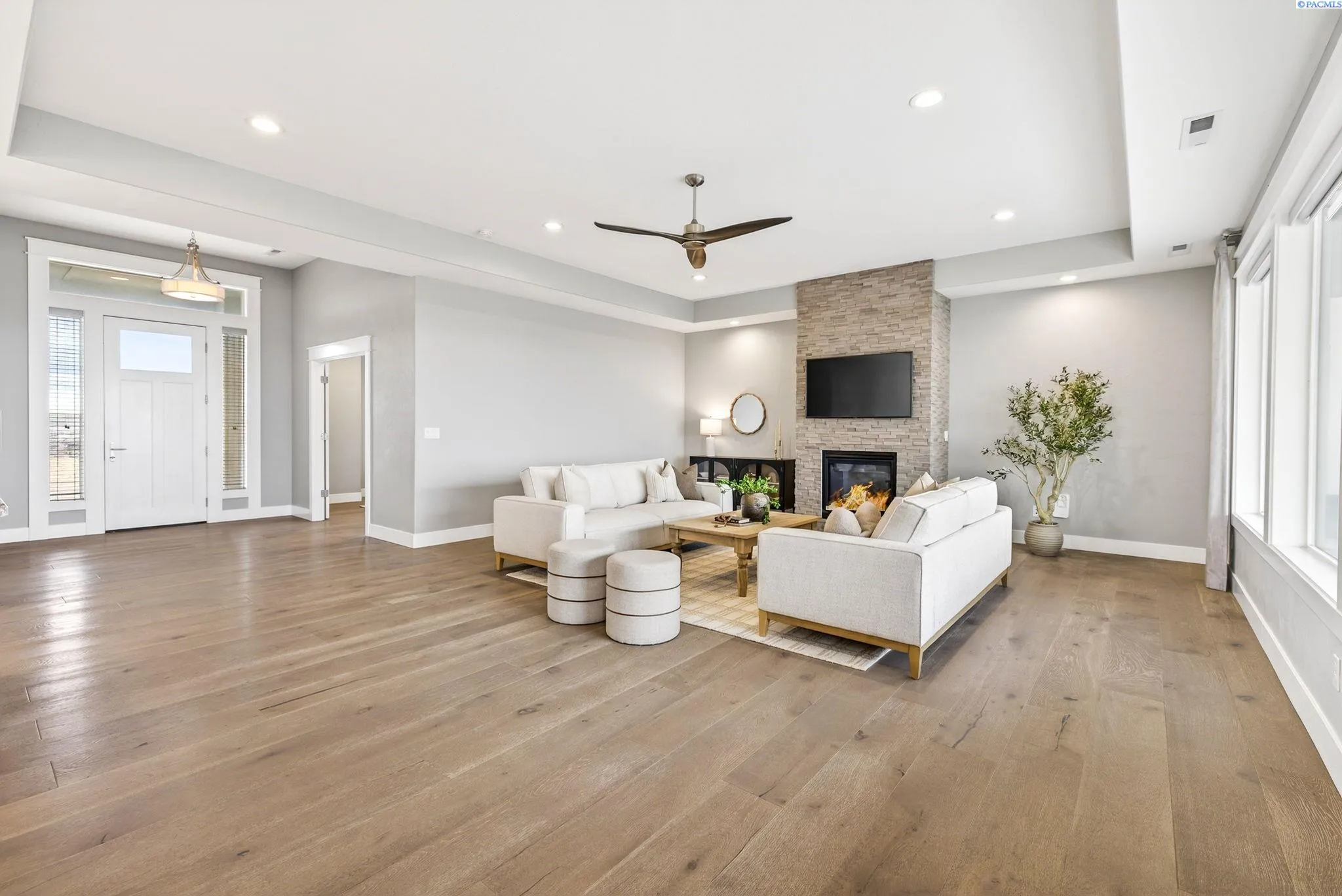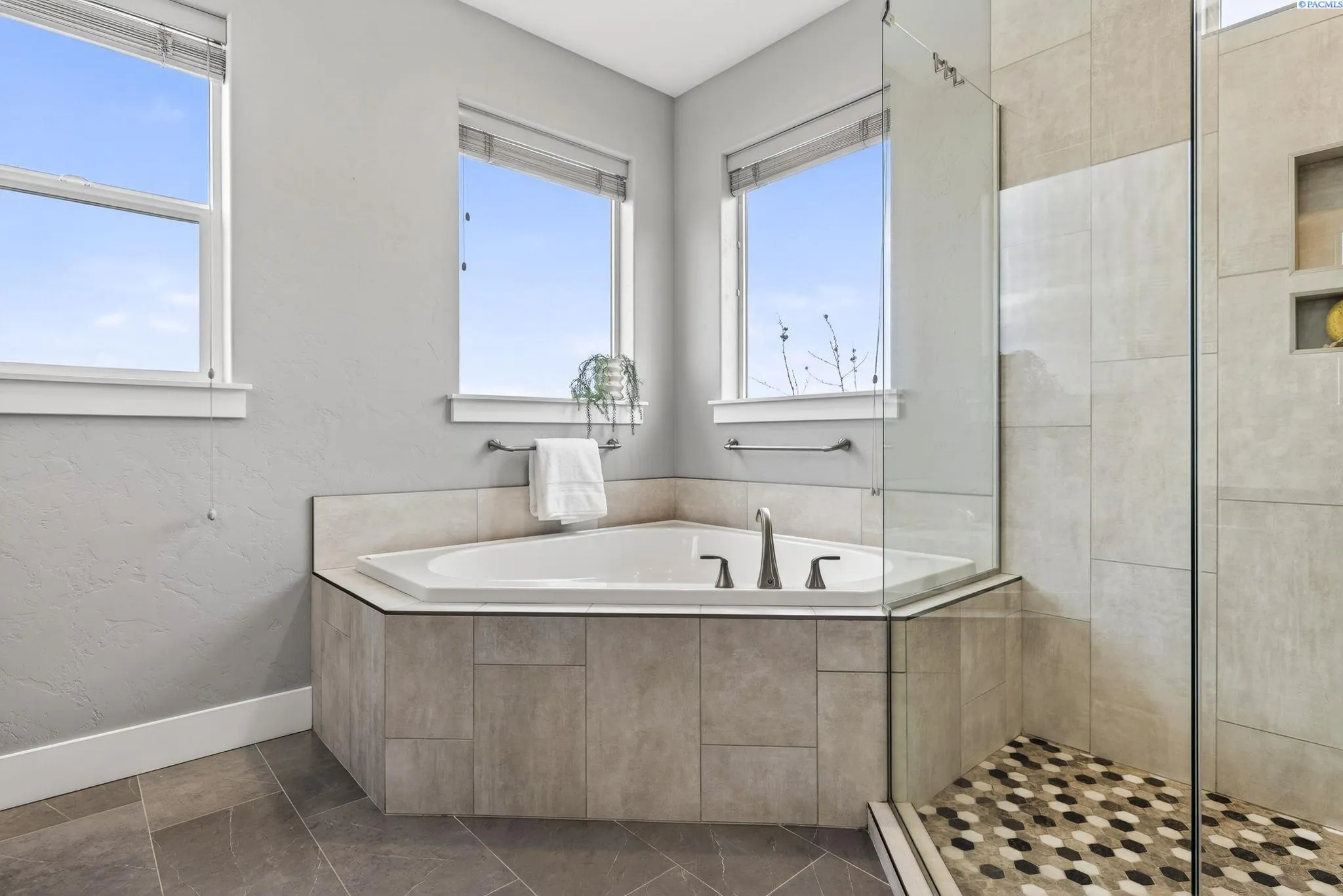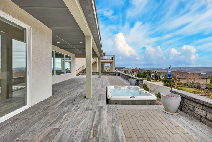 MLS# 291412 Experience the best views in the Tri-Cities from Falconcrest, South Richland, WA’s highest-elevation hilltop community, celebrated for panoramic vistas, breathtaking sunsets, and some of the area’s most limited turnover. This beautifully maintained 3-bedroom + office, single-level home with zero-step living captures sweeping views from every room, creating a rare combination of comfort, convenience, and elevated scenery. Inside, natural light fills the open-concept living spaces. A striking floor-to-ceiling tiled gas fireplace anchors the living room, complementing the raised ceilings and creating a warm architectural focal point. The space flows seamlessly into a well-appointed kitchen featuring quartz countertops, a center island with seating, pantry, stainless steel appliances, and a dining area. The split-bedroom layout provides meaningful privacy throughout, with a large dedicated office ideal for remote work, a second living space, or an optional fourth bedroom. The private, generously sized primary suite offers a true retreat, complete with double vanities, soaking tub, step-in tiled shower, walk-in closet, and direct access to the covered patio for quiet mornings or golden evenings. Two additional well-appointed bedrooms occupy their own separate quarters and share an updated full bathroom with double sinks and a tiled walk-in shower plus tub. Step outside to an expansive custom covered patio designed for year-round entertaining and relaxation, complete with an integrated hot tub overlooking the Tri-Cities. The low-maintenance yard is intentionally designed to maximize enjoyment while minimizing upkeep, leaving more time to take in the spectacular sunrises, sunsets, and front-row views of the annual fireworks and air show. Quality upgrades include Andersen windows for enhanced energy efficiency, a tankless water heater, and a gas range. The large laundry and mud room connects to an oversized three-car finished garage with built-in storage racks for vehicles, recreational equipment, and projects. Falconcrest has earned a prestigious reputation among Tri-Cities neighborhoods, and it’s easy to see why. Located in South Richland, just 7 minutes to the Badger Mountain Trailhead and 11 minutes to Costco and Target, this single story home offers convenient access to dining, professional services, and outdoor recreation, while maintaining the peaceful atmosphere of one of the area’s most coveted communities.