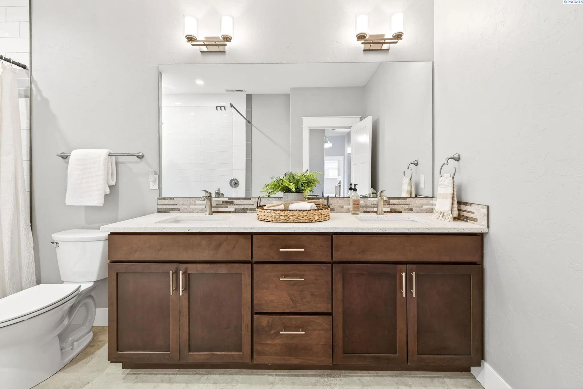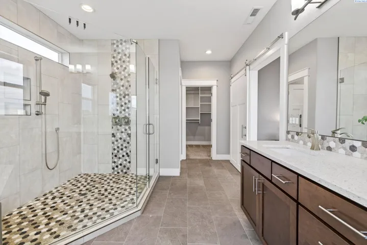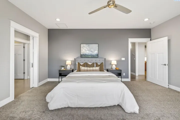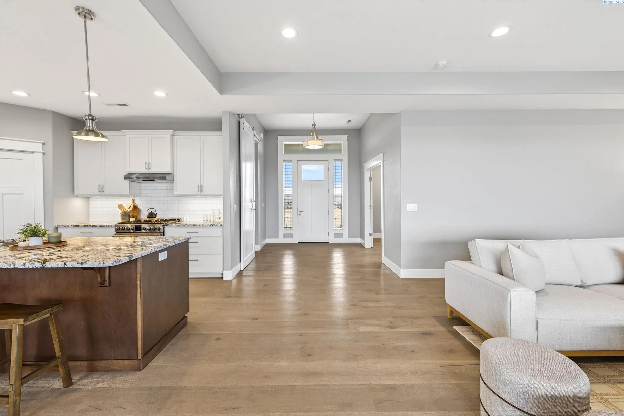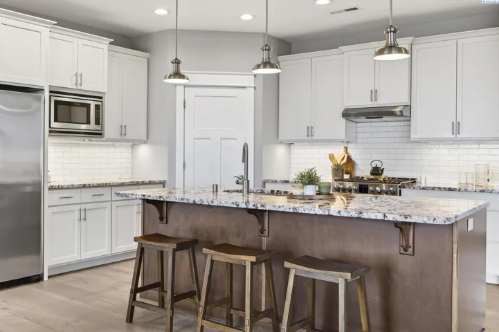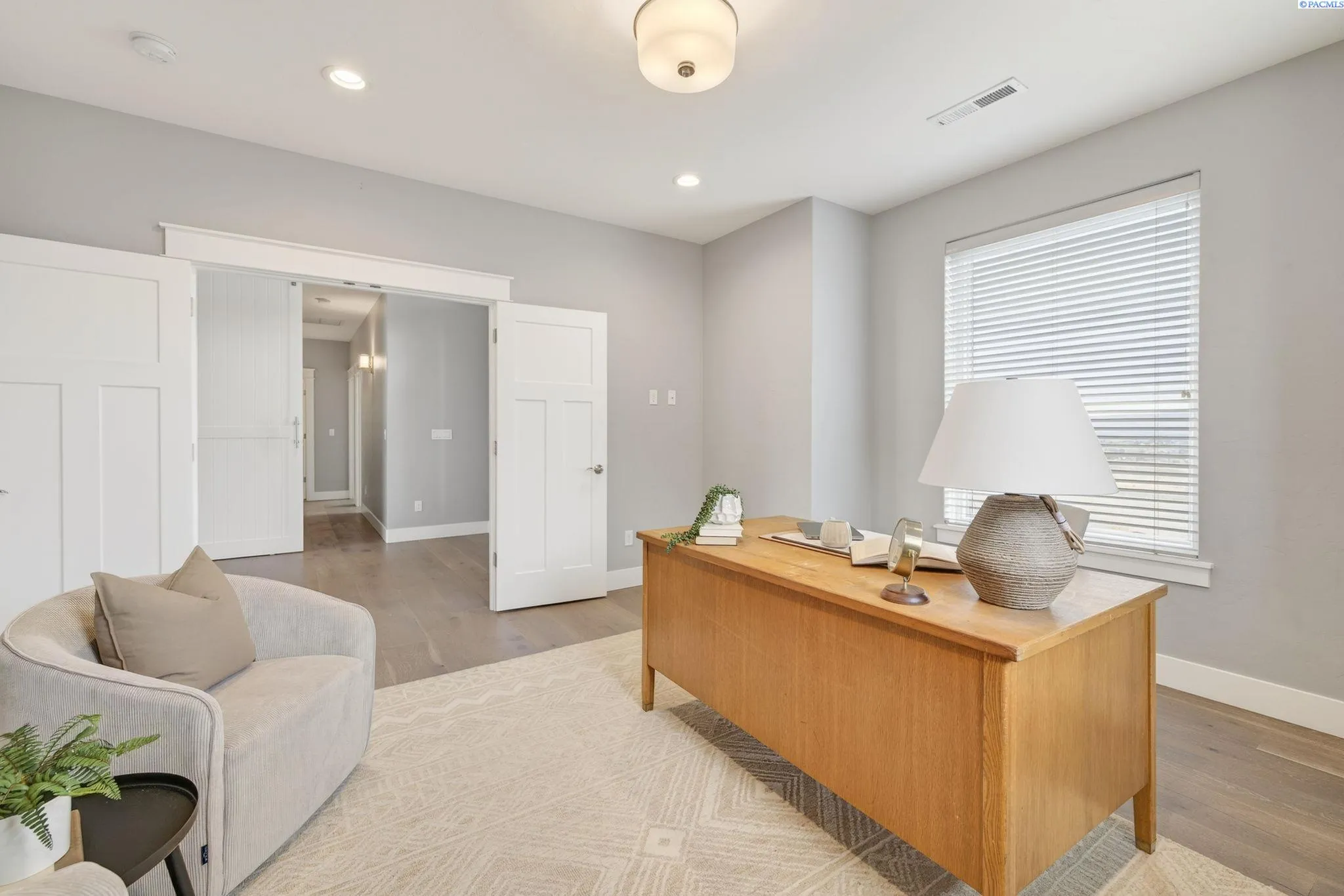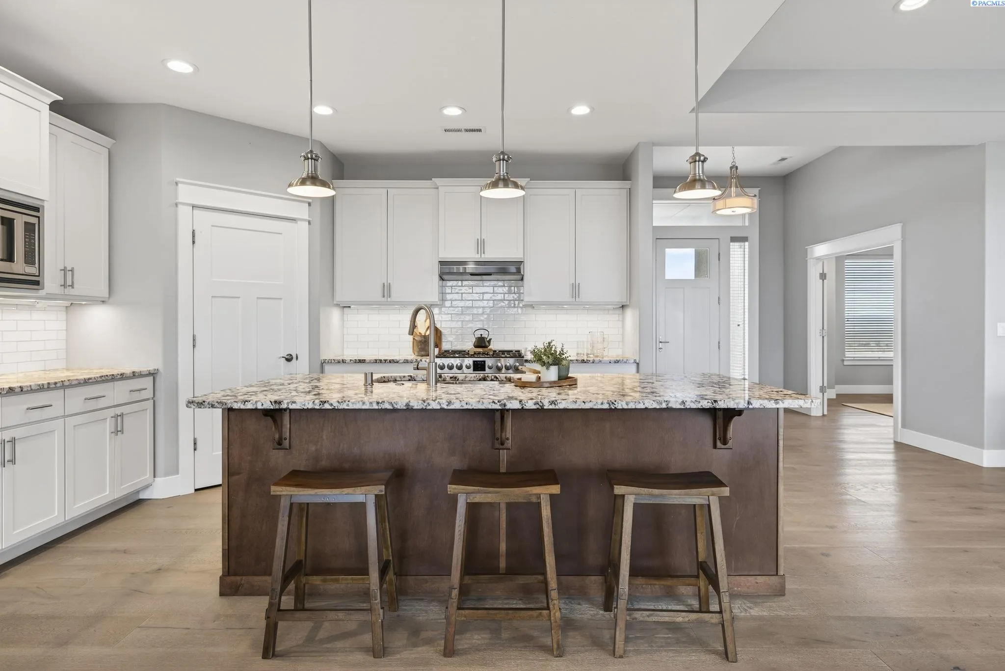 MLS# 291412 Experience the best views in the Tri-Cities from Falconcrest, South Richland, WA’s highest-elevation hilltop community, celebrated for panoramic vistas, breathtaking sunsets, and some of the area’s most limited turnover. This beautifully maintained 3-bedroom + office, single-level home with zero-step living captures sweeping views from every room, creating a rare combination of comfort, convenience, and elevated scenery. Inside, natural light fills the open-concept living spaces. A striking floor-to-ceiling tiled gas fireplace anchors the living room, complementing the raised ceilings and creating a warm architectural focal point. The space flows seamlessly into a well-appointed kitchen featuring quartz countertops, a center island with seating, pantry, stainless steel appliances, and a dining area. The split-bedroom layout provides meaningful privacy throughout, with a large dedicated office ideal for remote work, a second living space, or an optional fourth bedroom. The private, generously sized primary suite offers a true retreat, complete with double vanities, soaking tub, step-in tiled shower, walk-in closet, and direct access to the covered patio for quiet mornings or golden evenings. Two additional well-appointed bedrooms occupy their own separate quarters and share an updated full bathroom with double sinks and a tiled walk-in shower plus tub. Step outside to an expansive custom covered patio designed for year-round entertaining and relaxation, complete with an integrated hot tub overlooking the Tri-Cities. The low-maintenance yard is intentionally designed to maximize enjoyment while minimizing upkeep, leaving more time to take in the spectacular sunrises, sunsets, and front-row views of the annual fireworks and air show. Quality upgrades include Andersen windows for enhanced energy efficiency, a tankless water heater, and a gas range. The large laundry and mud room connects to an oversized three-car finished garage with built-in storage racks for vehicles, recreational equipment, and projects. Falconcrest has earned a prestigious reputation among Tri-Cities neighborhoods, and it’s easy to see why. Located in South Richland, just 7 minutes to the Badger Mountain Trailhead and 11 minutes to Costco and Target, this single story home offers convenient access to dining, professional services, and outdoor recreation, while maintaining the peaceful atmosphere of one of the area’s most coveted communities.