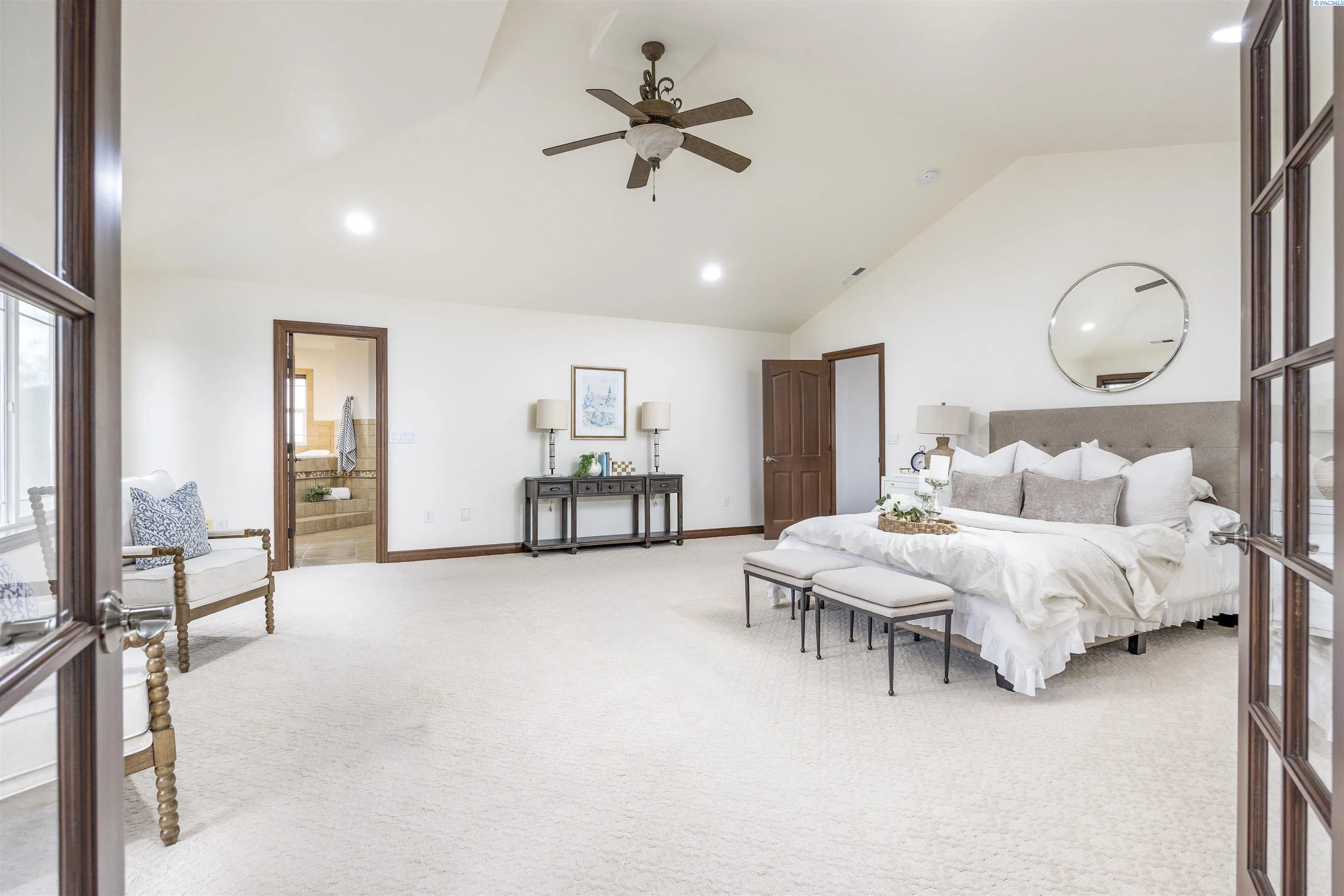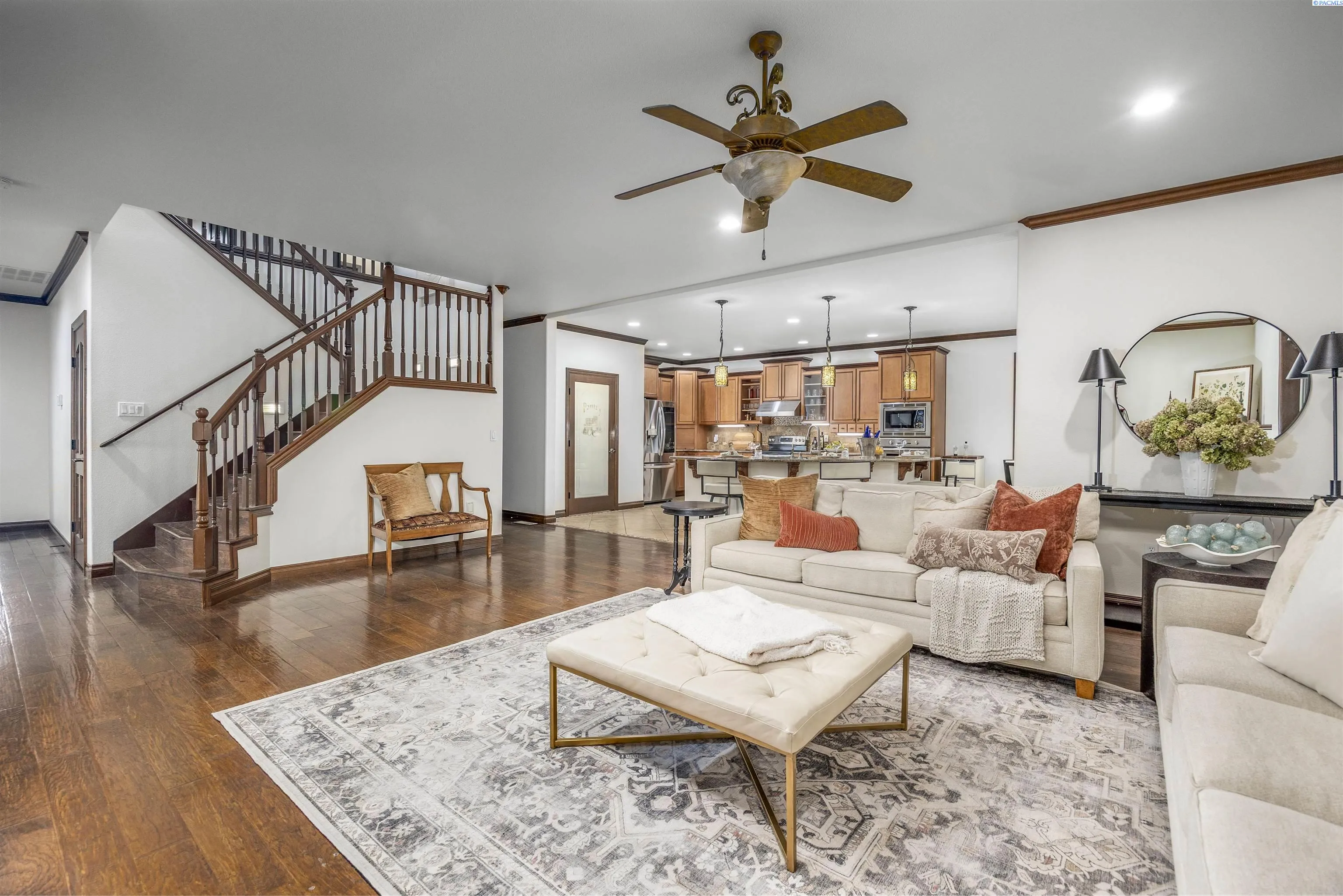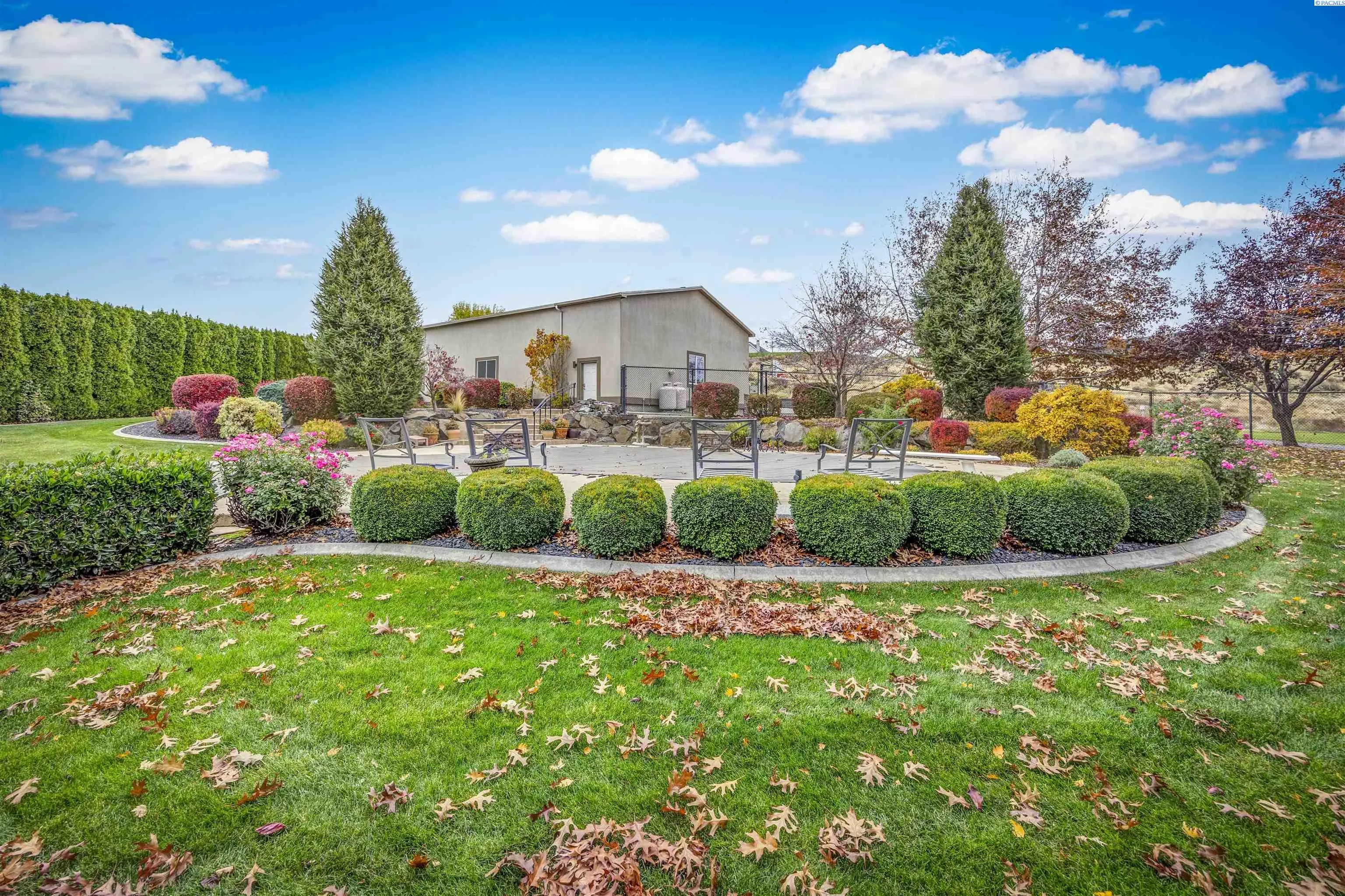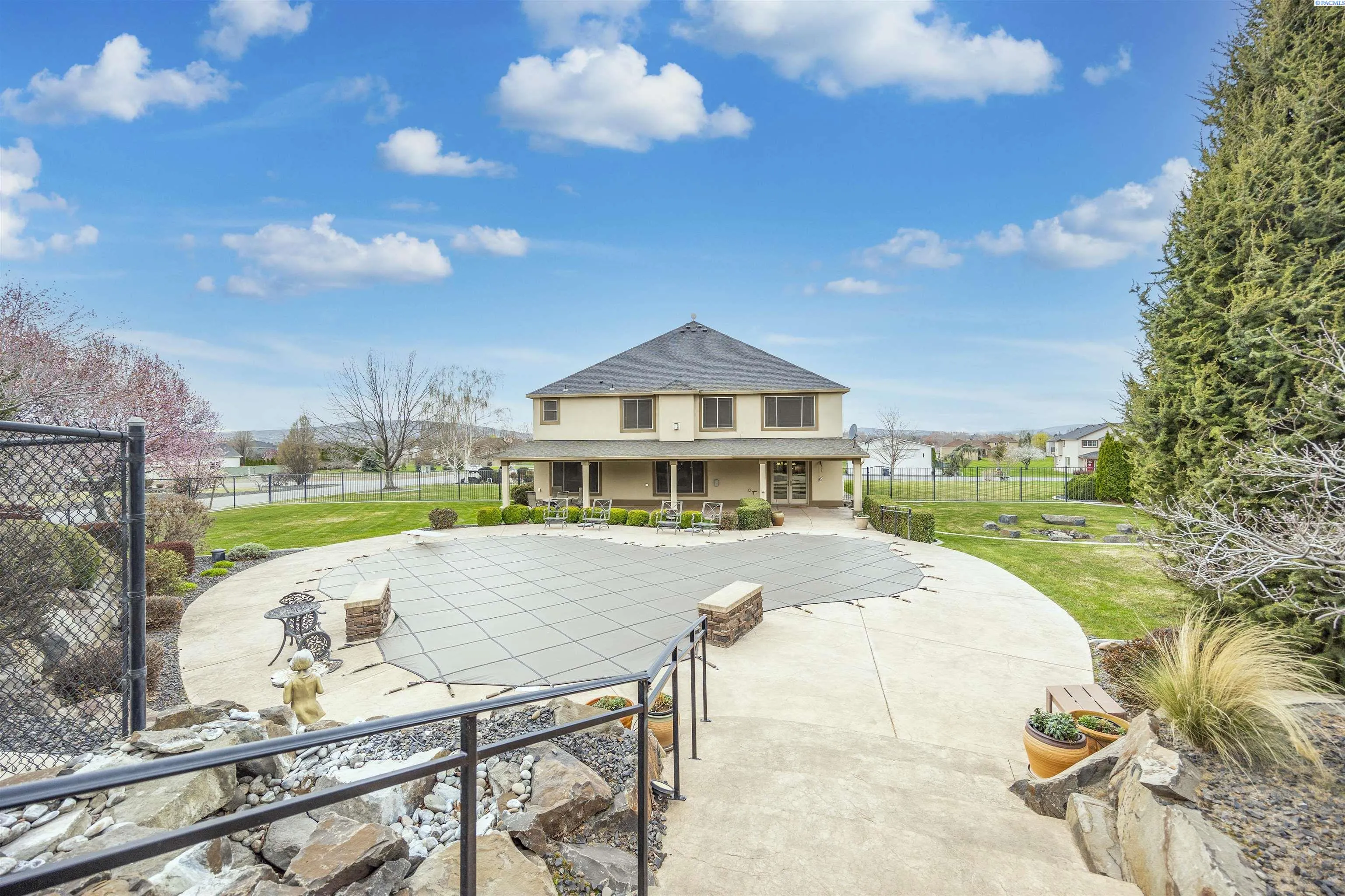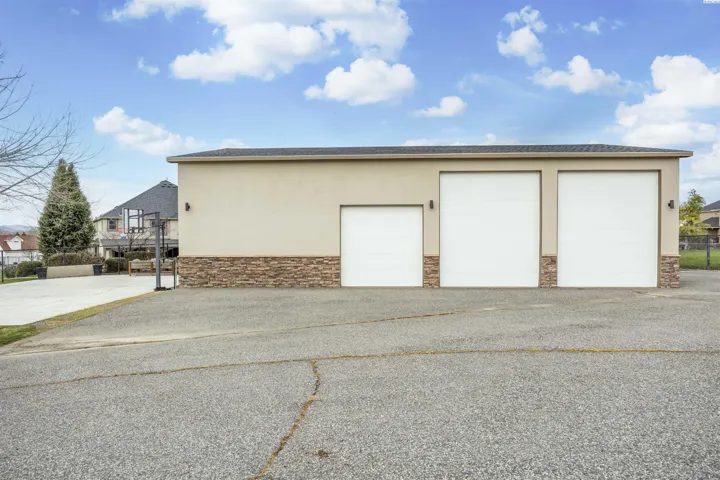 MLS# 291420 Exceptional home and 40×60 shop nestled on a private, park-like 1-acre lot just moments from the Columbia River—offering the perfect balance of luxury, comfort, and functionality. From the moment you arrive, the pristine landscaping and tranquil water features set the tone for this impressive property. The outdoor living spaces are designed for both relaxation and entertaining. Spend warm days lounging by the inviting pool, gathering around the fire pit in the evenings, or hosting guests under the spacious covered patio. The yard is already prepped for your future hot tub, and a basketball half court provides plenty of space for recreation and outdoor fun. Inside, the home features an inviting open-concept layout with warm hardwood floors and abundant natural light. The gourmet kitchen is a standout, offering granite countertops, custom oak cabinetry, a spacious pantry, double ovens, and both casual and formal dining areas—perfect for everyday living and special gatherings. The living room is anchored by a beautiful double-sided fireplace that is shared with the office, which also includes custom built-ins for a functional and inspiring workspace. The primary suite offers a private retreat with vaulted ceilings, a cozy sitting area, an expansive ensuite bathroom, and a large walk-in closet designed for excellent organization. In addition to the attached 3-car garage, the property includes a fully insulated and heated 40×60 shop—ideal for hobbies, projects, or extra storage. The shop features high ceilings, RV doors, built-in shelving, and a convenient cul-de-sac-style driveway that provides easy access and ample parking. Set in a peaceful location with convenient access to schools and the many amenities of West Pasco, this remarkable property offers space, privacy, and exceptional living both indoors and out. Don’t miss the opportunity to make this dream property your own.